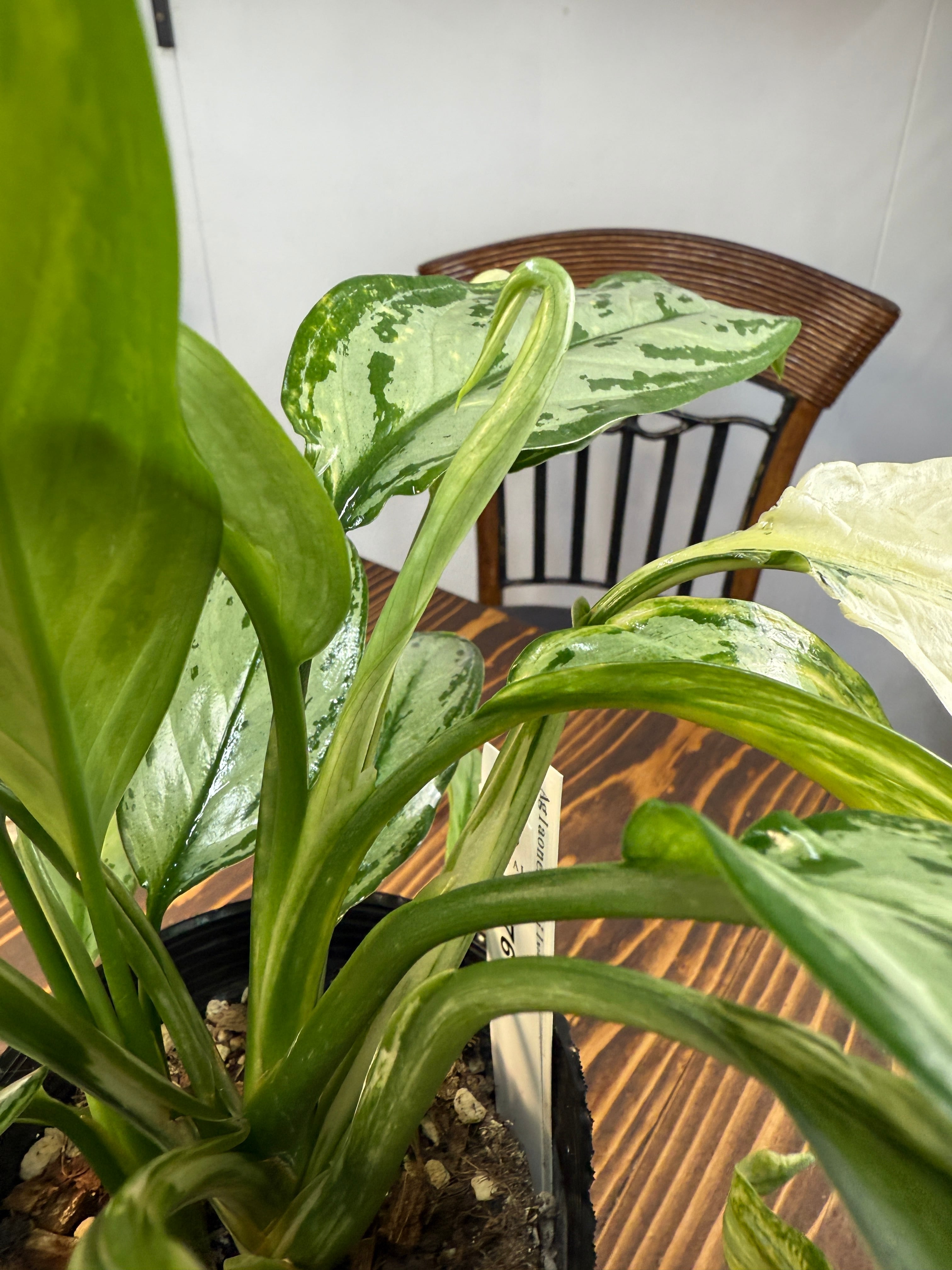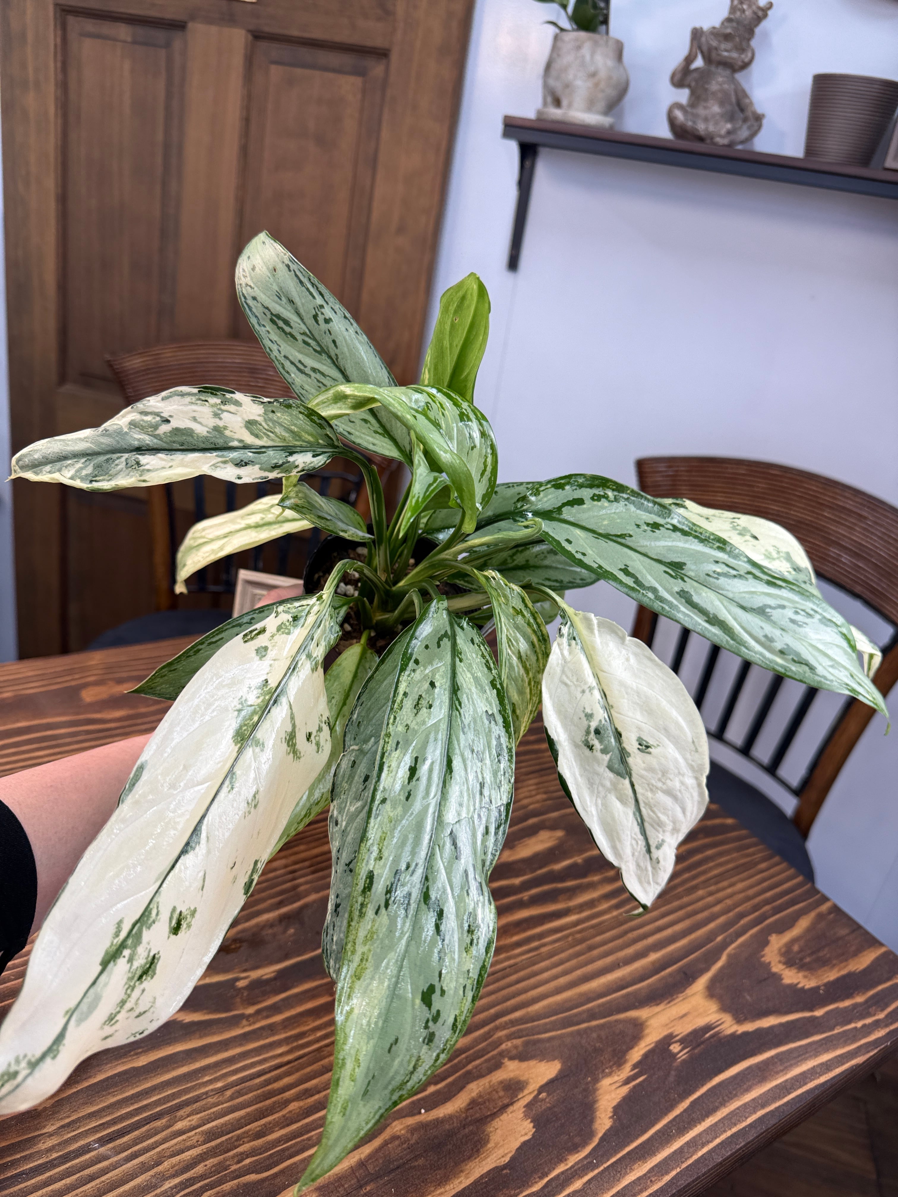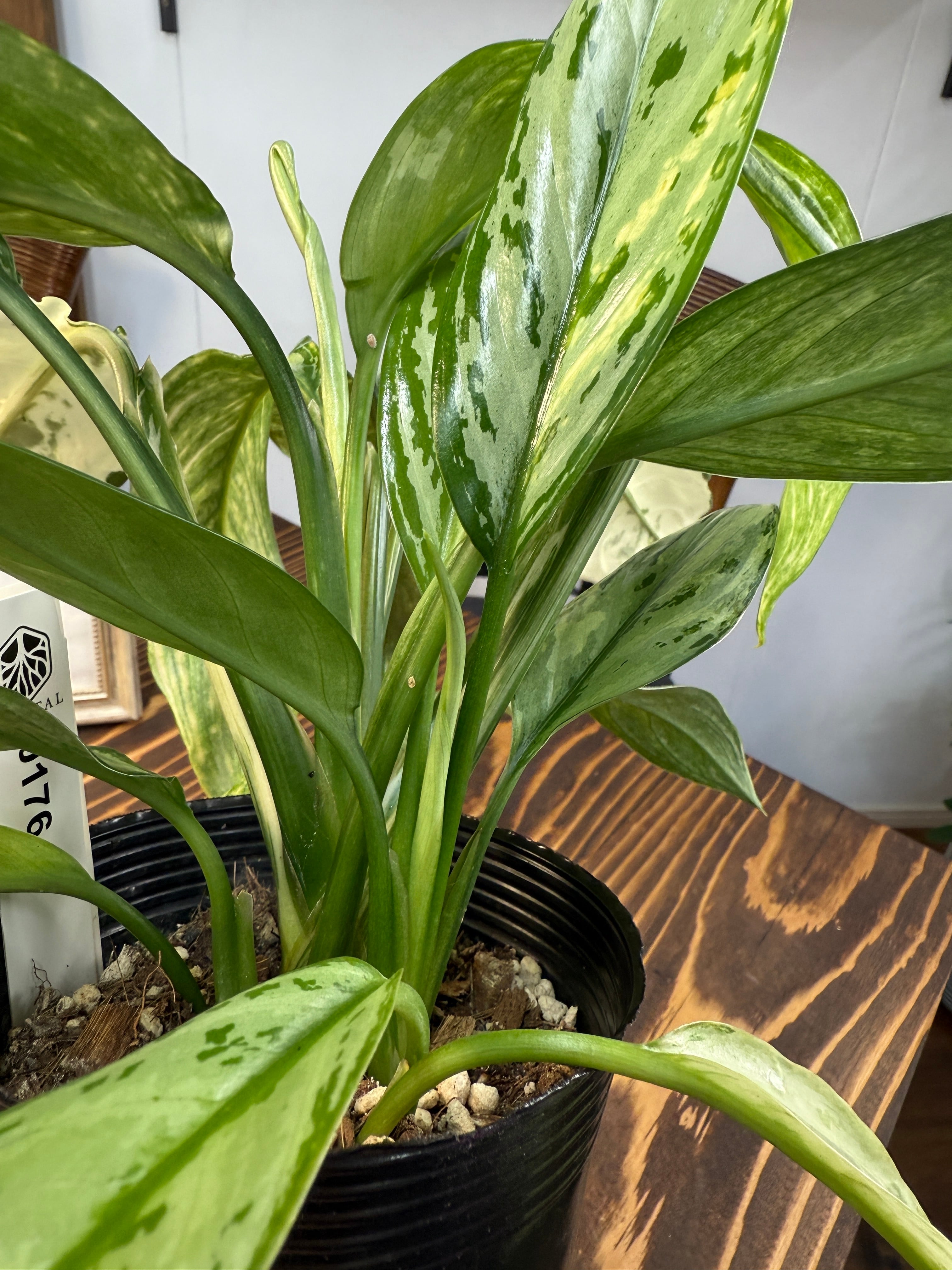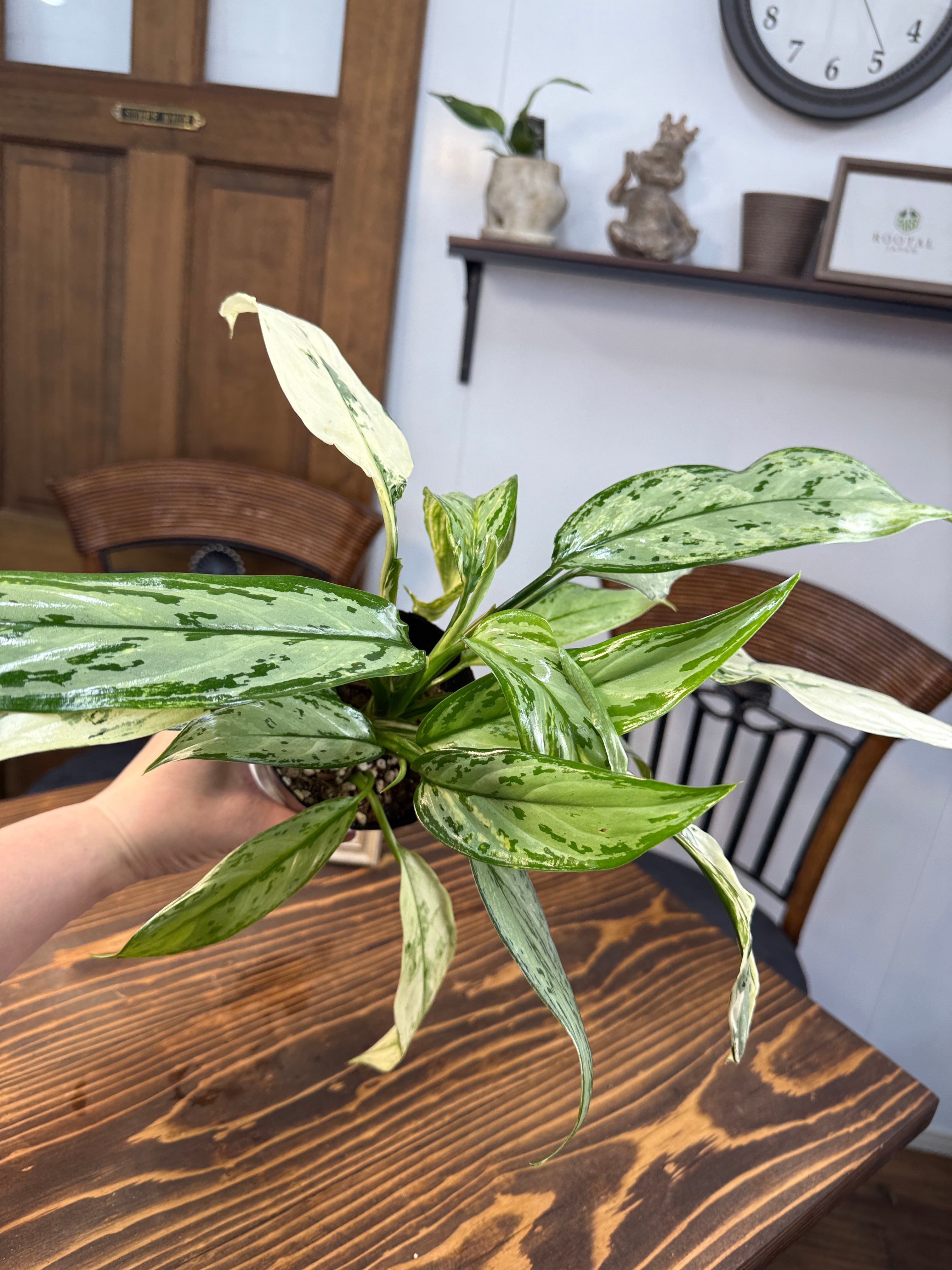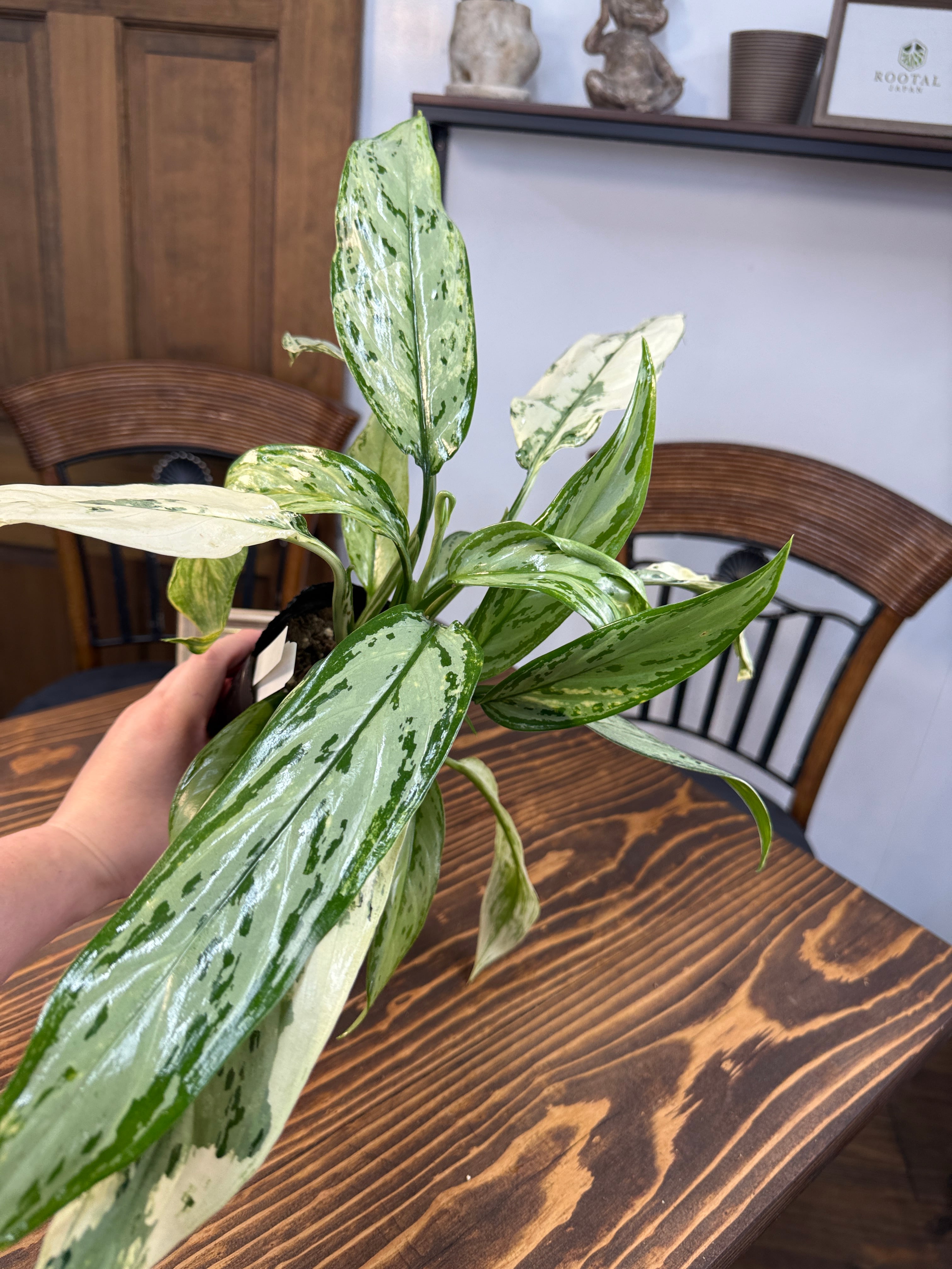 アグラオネマ シルバークィーン バリエガータ No.176は、斑入りの美しい葉が特徴の観葉植物です。この植物は、お部屋に洗練された雰囲気を演出し、リラックスできる空間を提供します!観葉植物を育てるのが初めての方にも優れた手入れのしやすさがあり、この機会にぜひお迎えください。