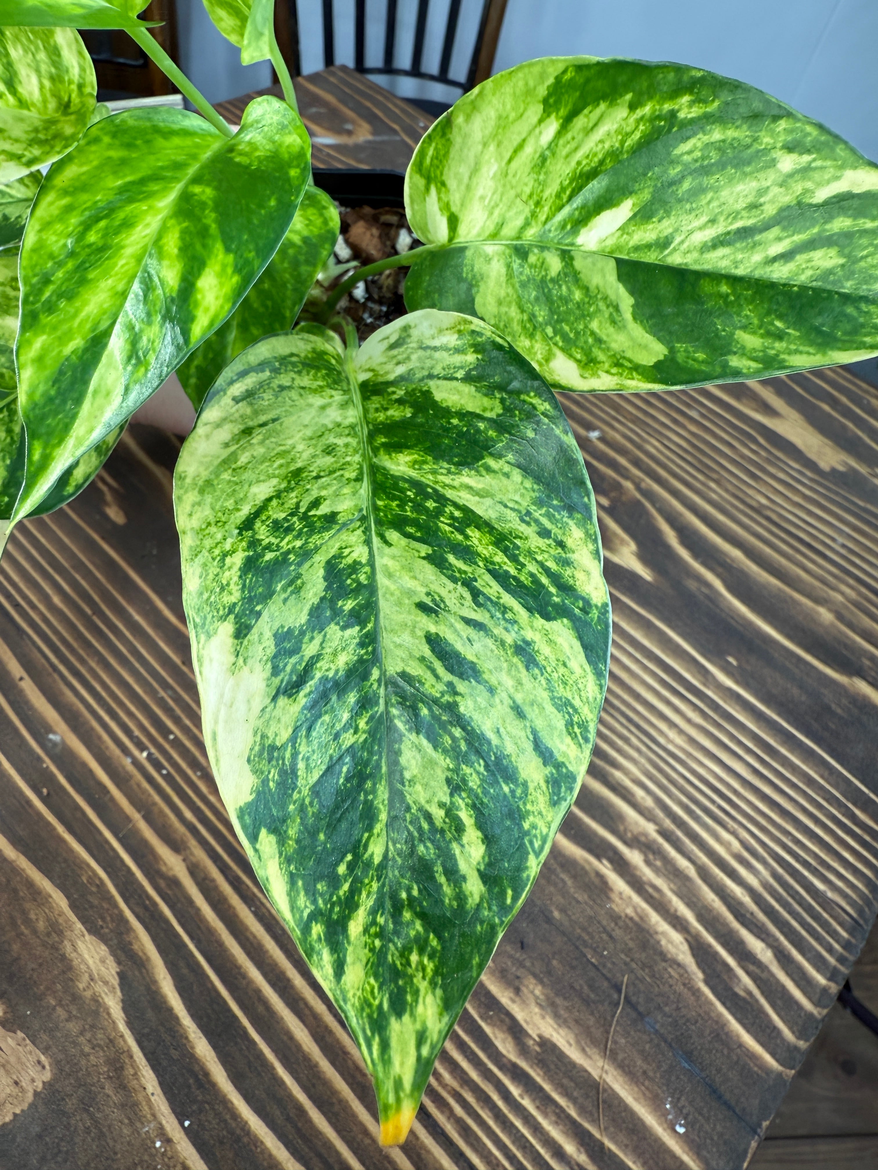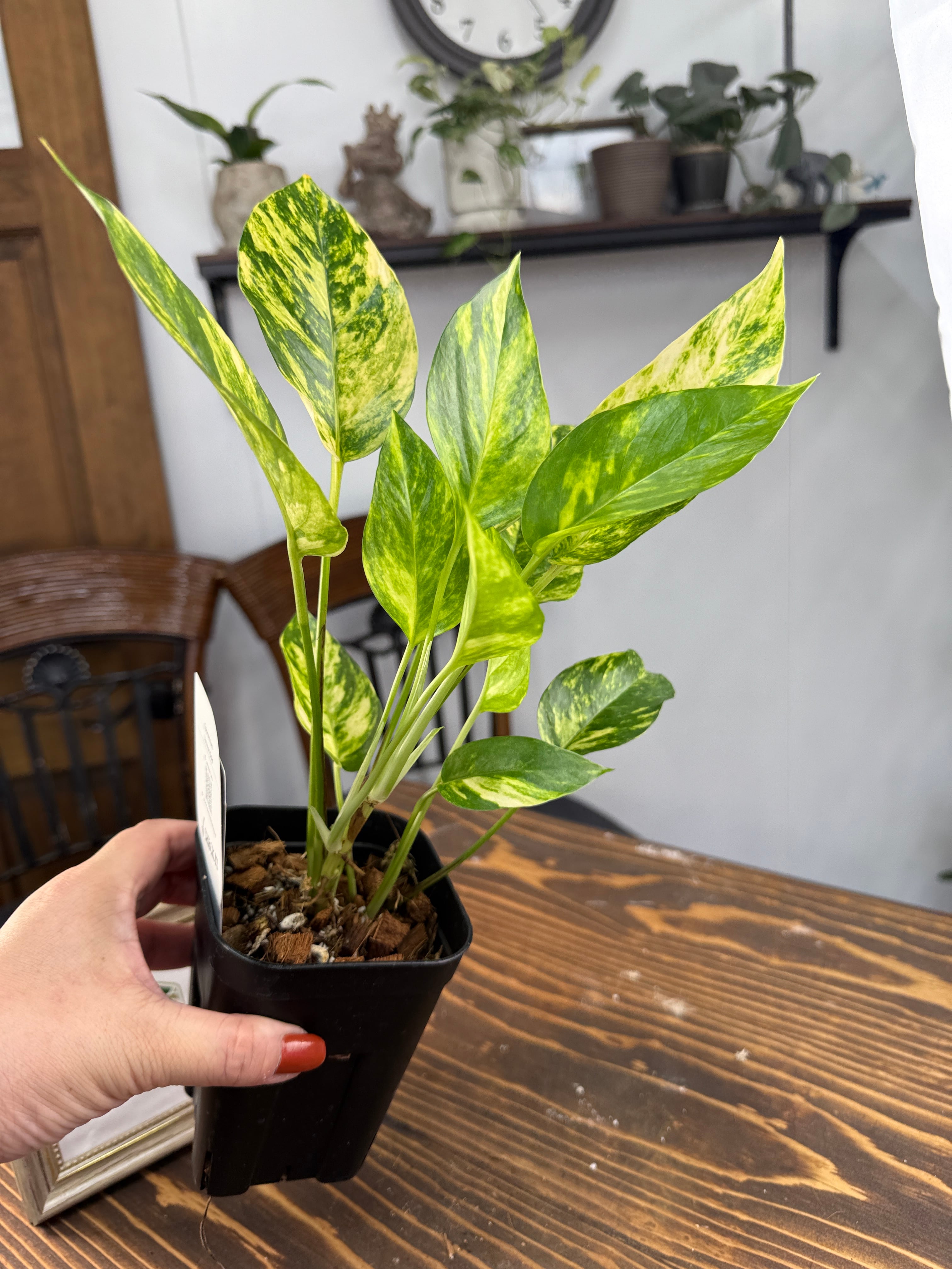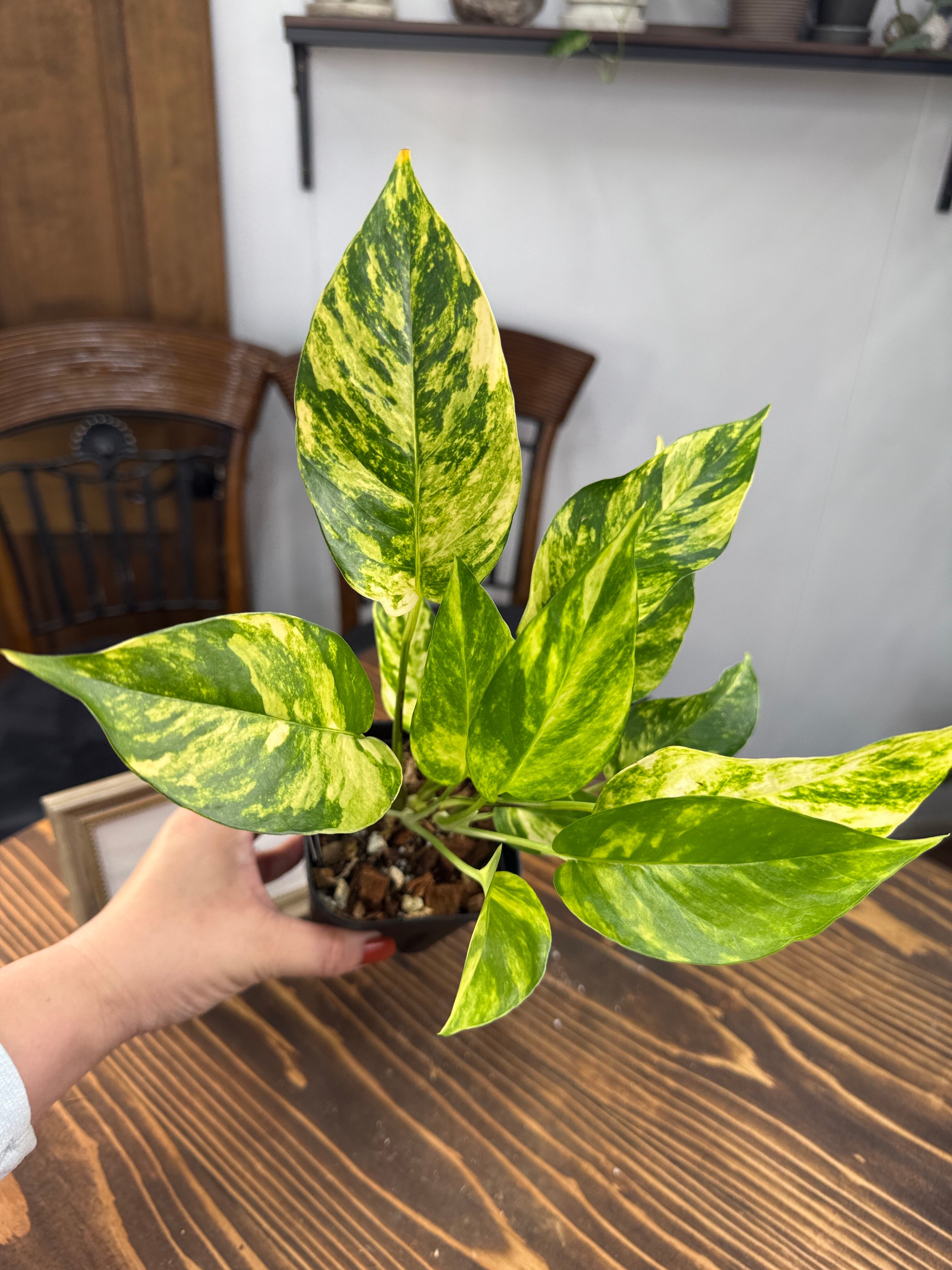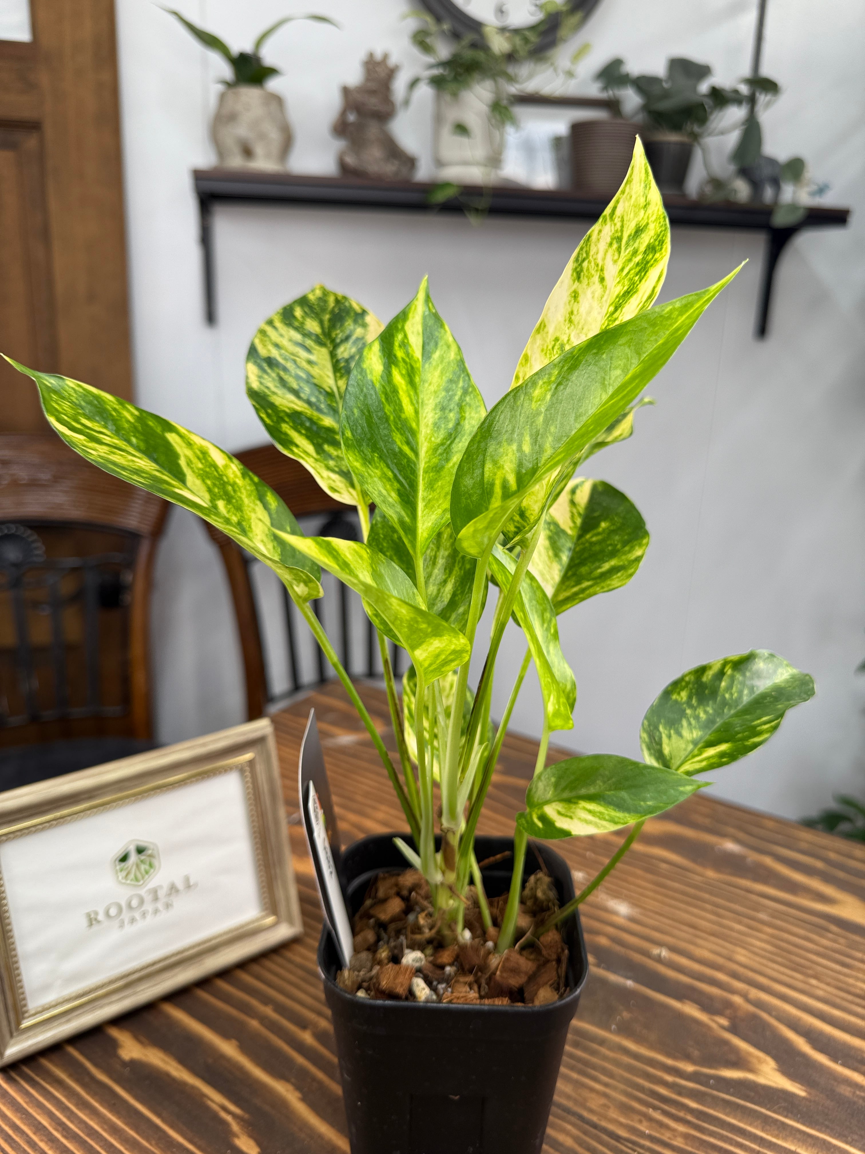 エピプレムナム アマゾンゴールドの葉は、特徴的な金色のグラデーションが美しく、成長するにつれてその魅力が増します。出荷時のサイズはおおよそ9㎝のロング硬質ポットで、元気な状態でお届けいたします。