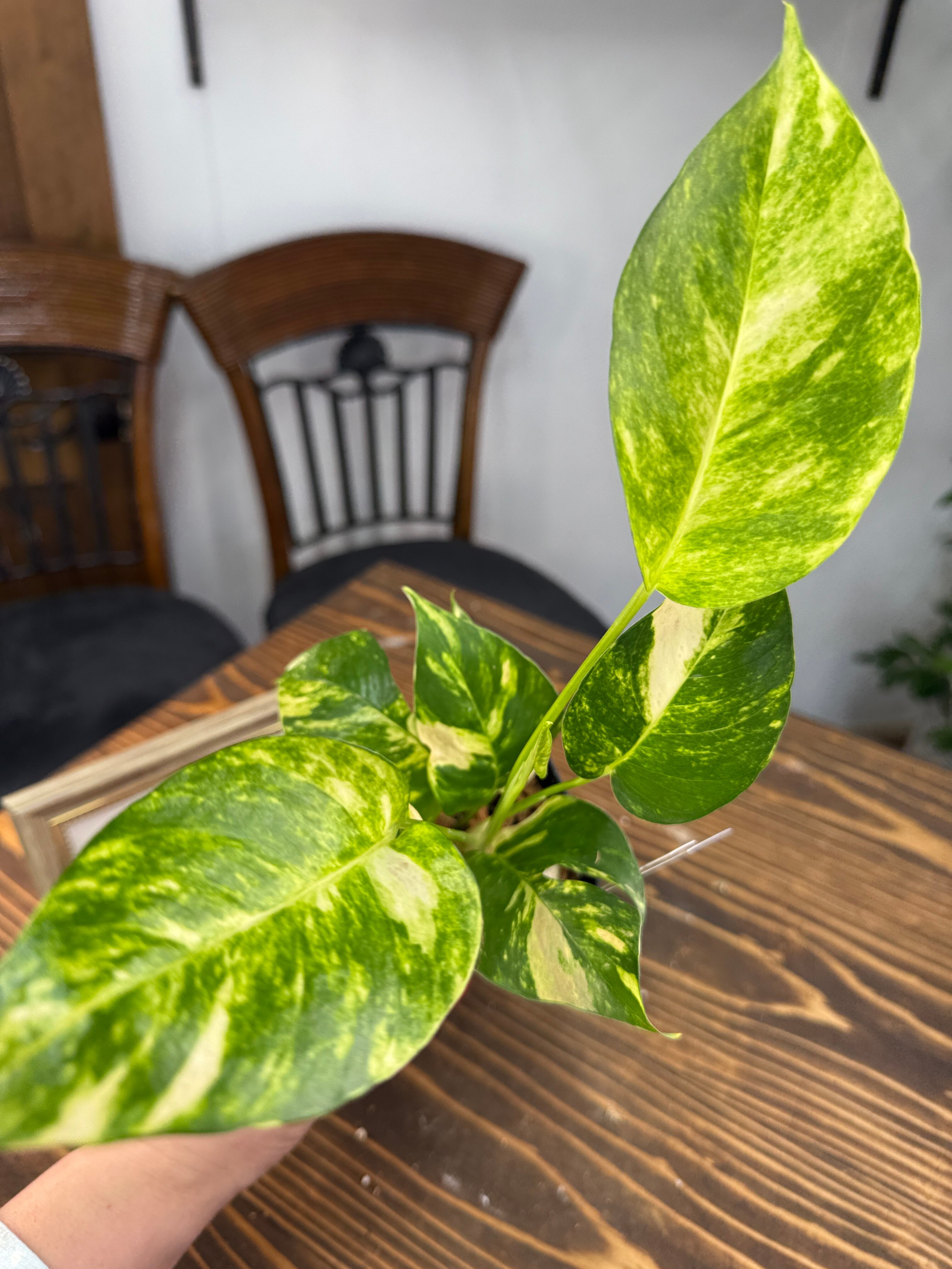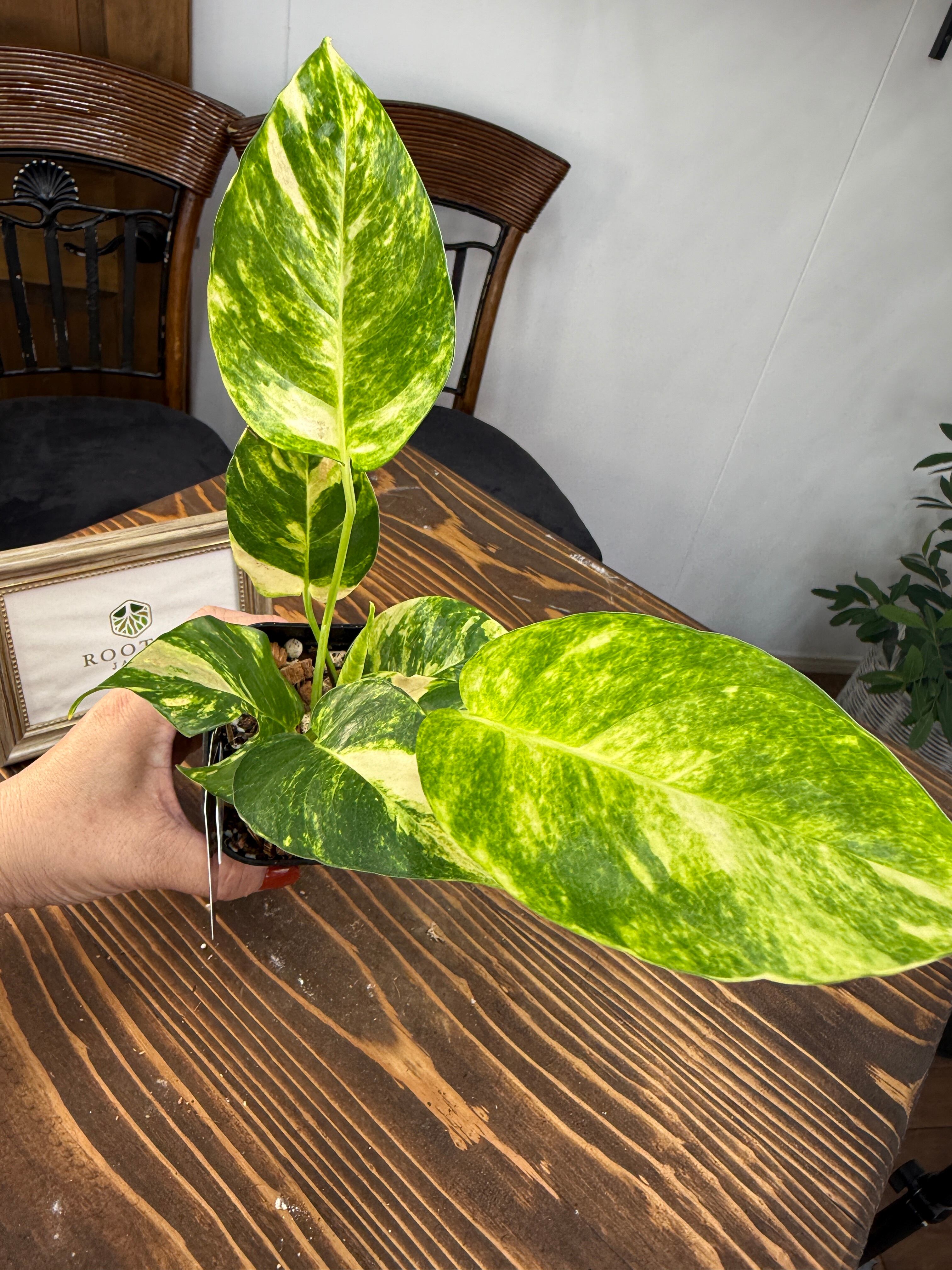 エピプレムナム アマゾンゴールドの葉は、独自の金色のグラデーションが美しく、成長するにつれてさらにその魅力が増します。出荷時のサイズはおおよそ9㎝のロング硬質ポットに入っており、健康な状態でお届けいたします。