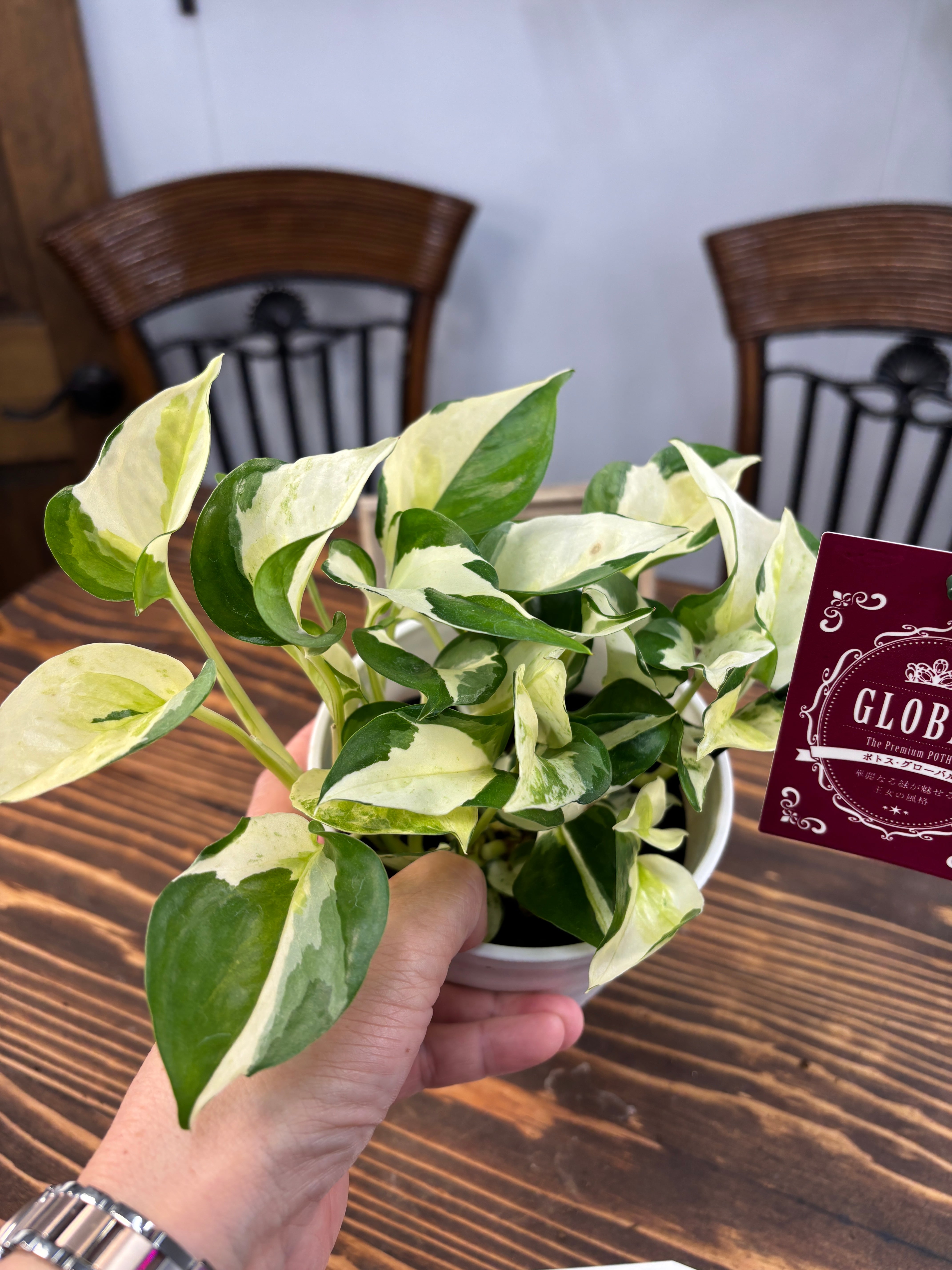 グローバルの葉は、鮮やかな緑色で、光を受けることでより一層魅力を引き立てます。出荷時のサイズは4号鉢、健康で力強い個体をお届けします。