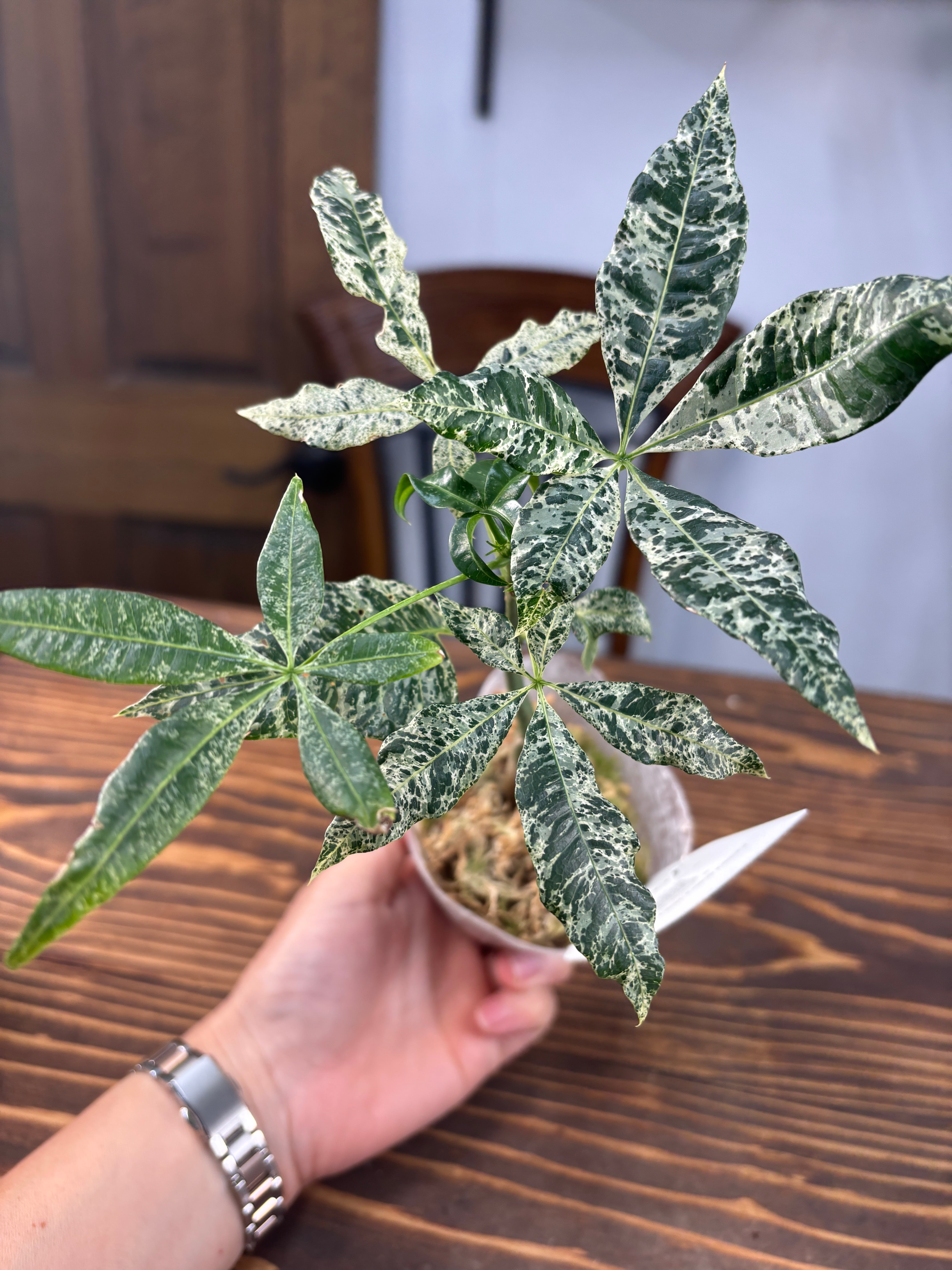 パキラミルキーウェイは、白斑が美しい葉が特徴です。お届けは8cmポットにて、しっかりとした苗を厳選しておりますので、成長する度にその美しさをお楽しみいただけます。
