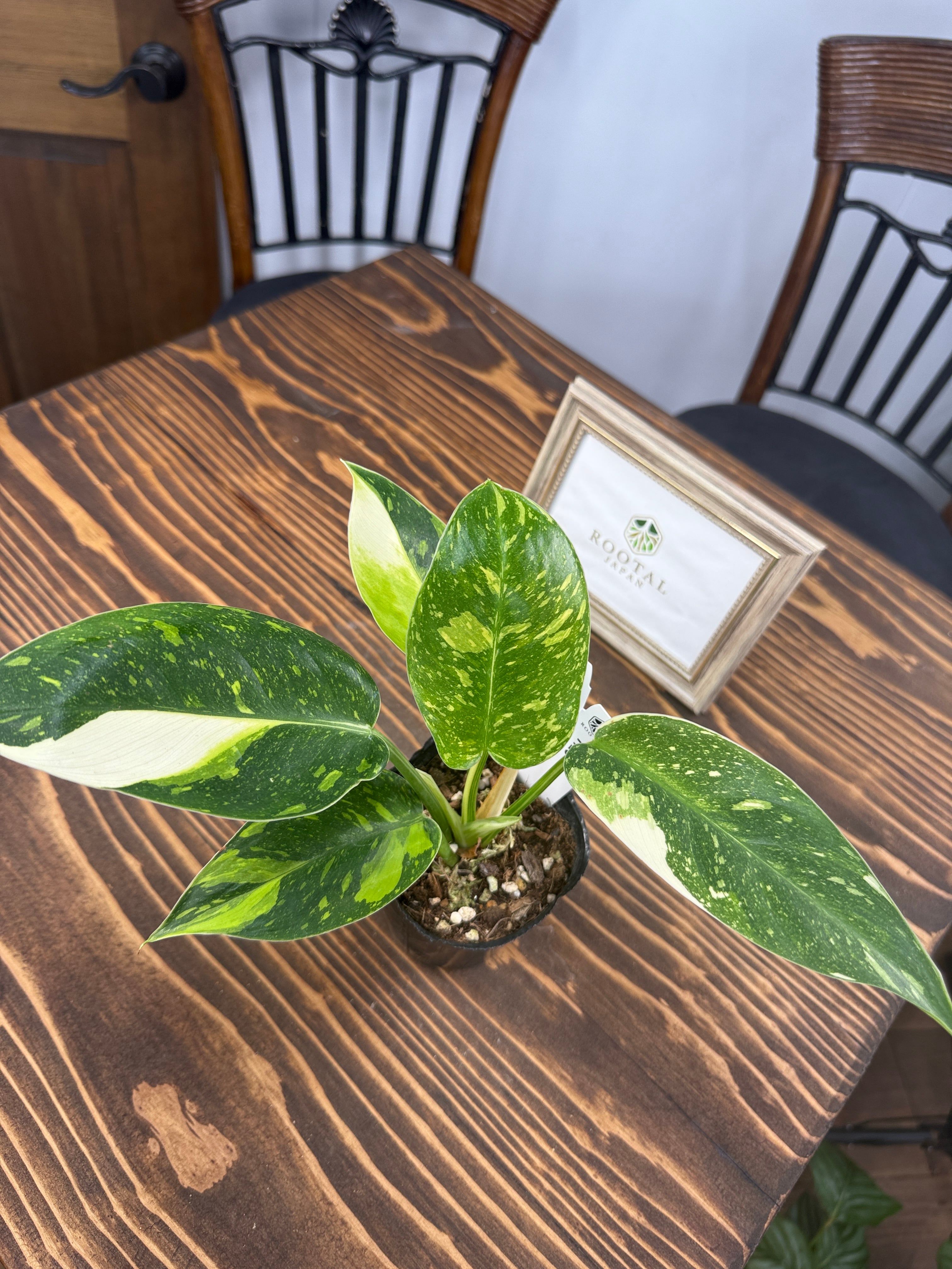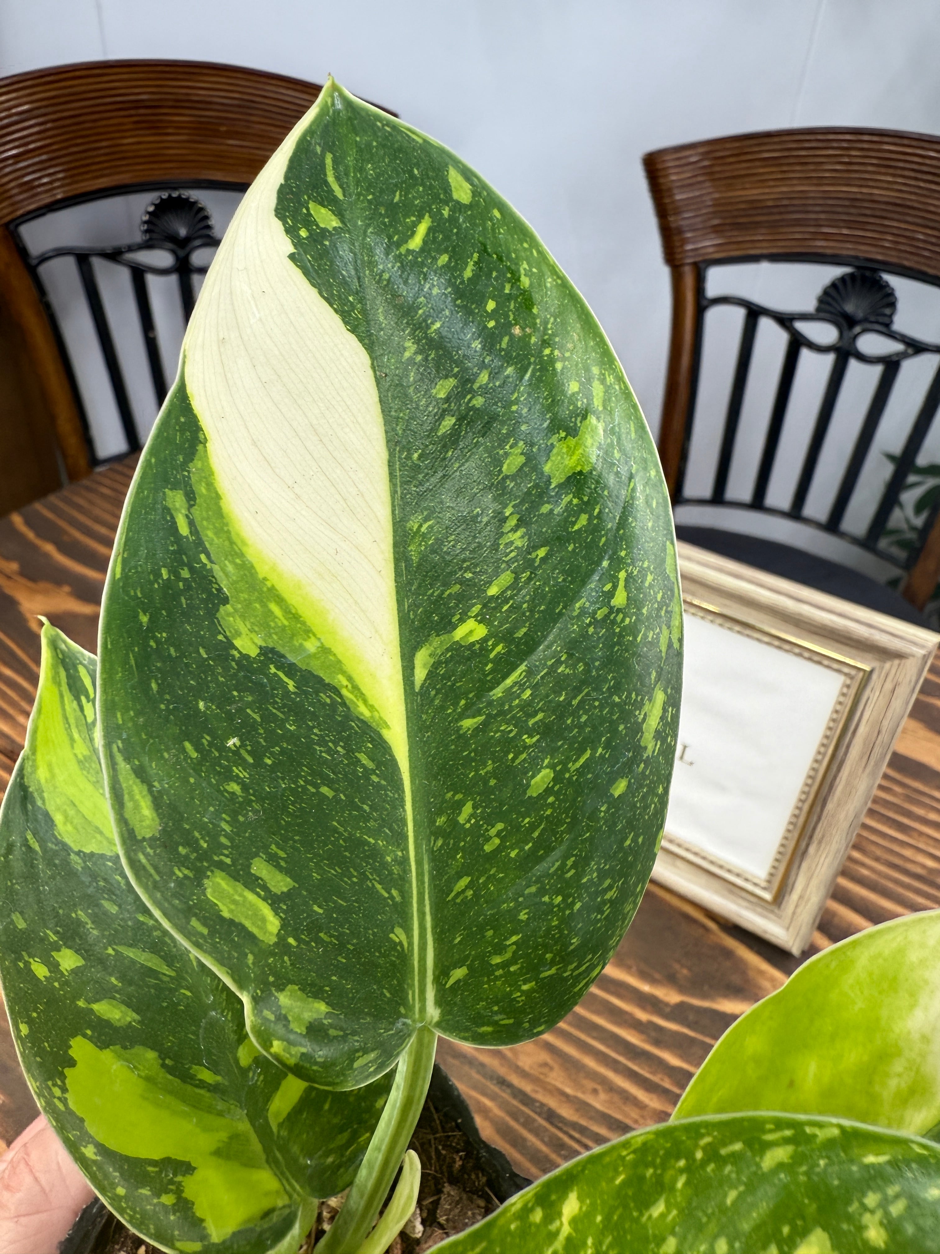 美しい斑入りの葉が特徴のフィロデンドロン グリーンコンゴバリエガータ!その独特な色合いと魅力的なフォルムが、お部屋のインテリアに新たな息吹を吹き込んでくれる一品です。育てやすい特性を持ち、玄関やリビングにぴったりな存在となることでしょう!