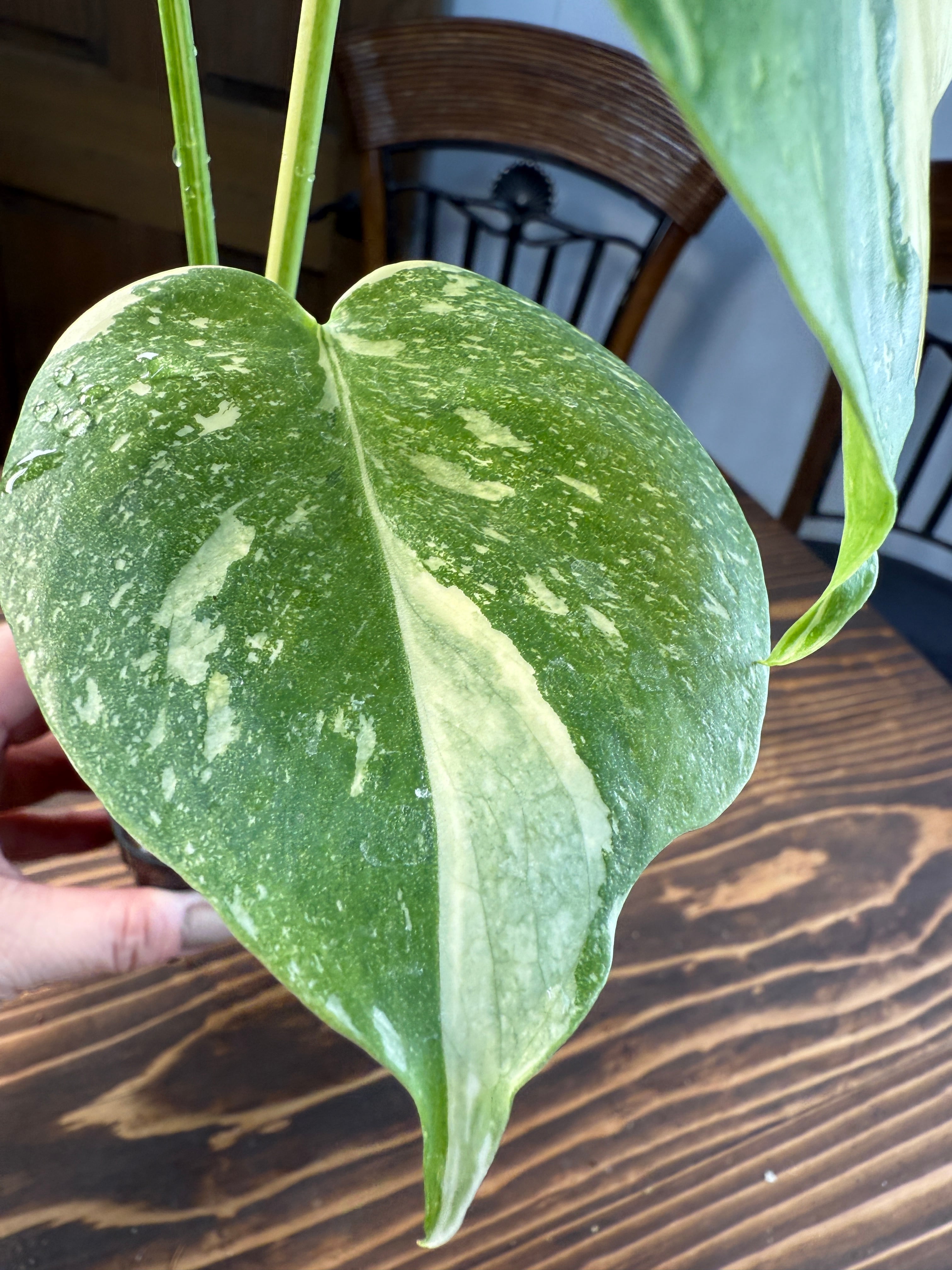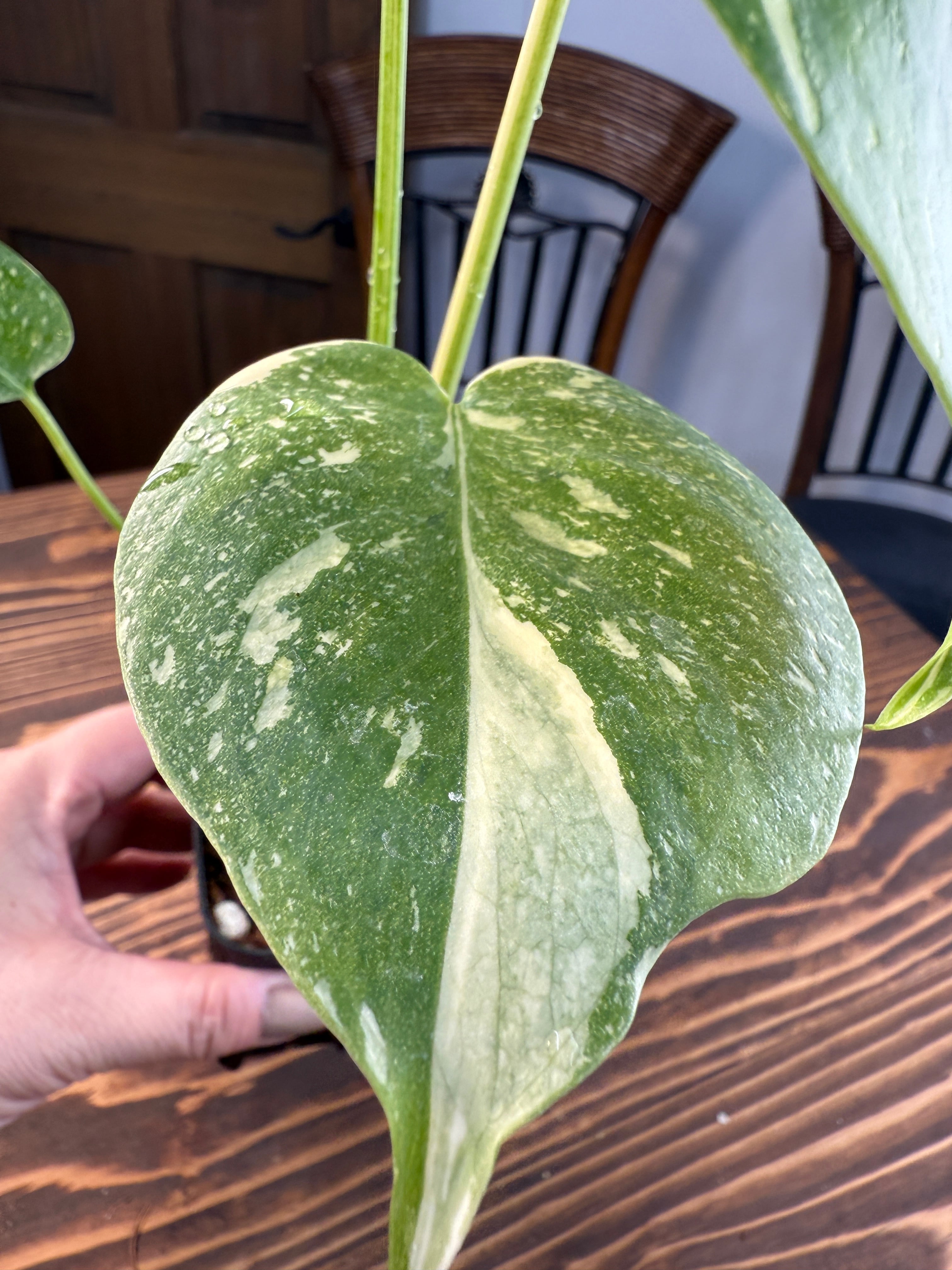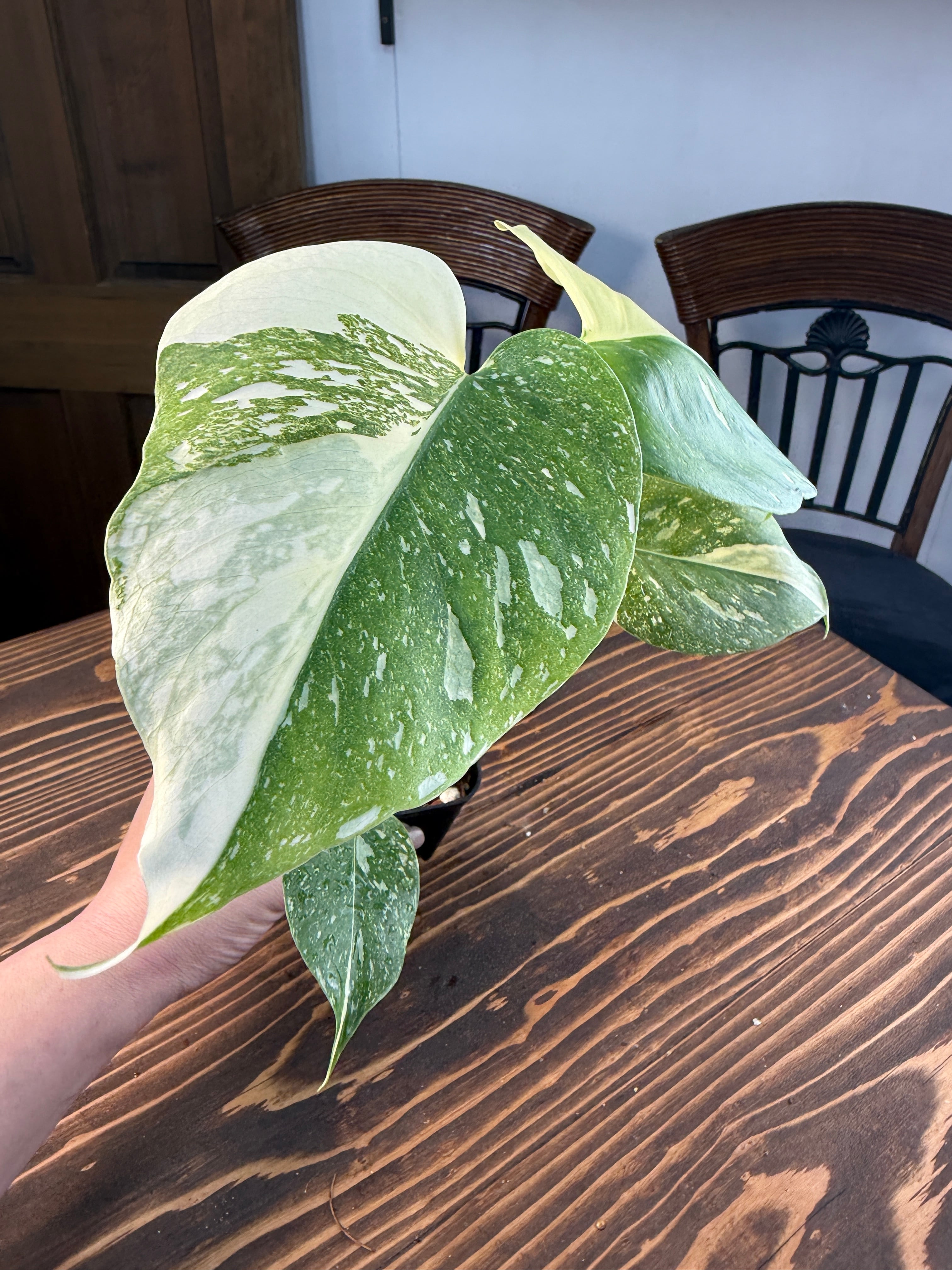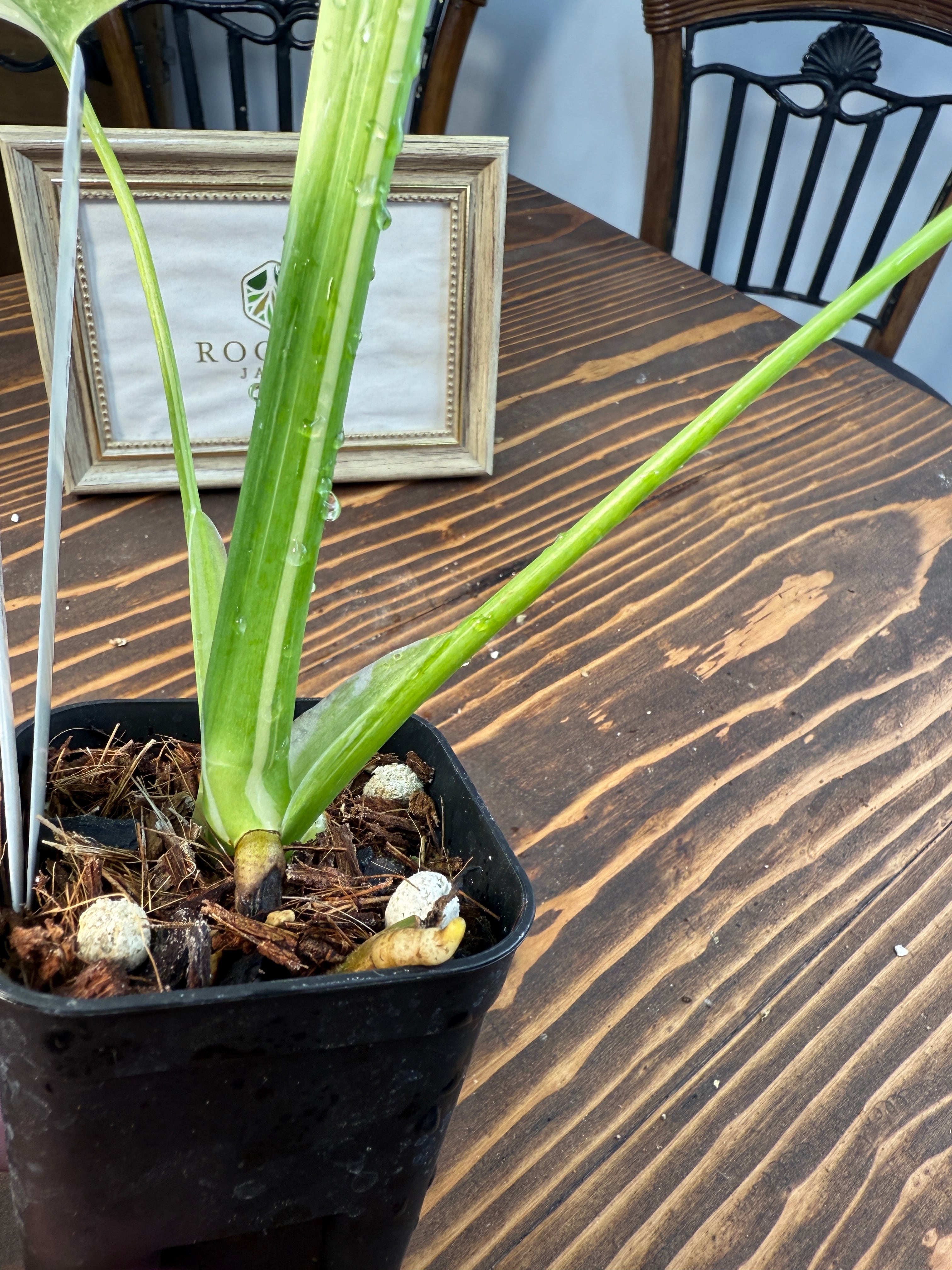 モンステラ デリシオーサ タイコンステレーションの葉は、ユニークなバリエガータが印象的で、成長段階によってその美しさが変わります。出荷時のサイズはおおよそ20㎝程度で、かわいらしいベビー苗をお届けいたします。
