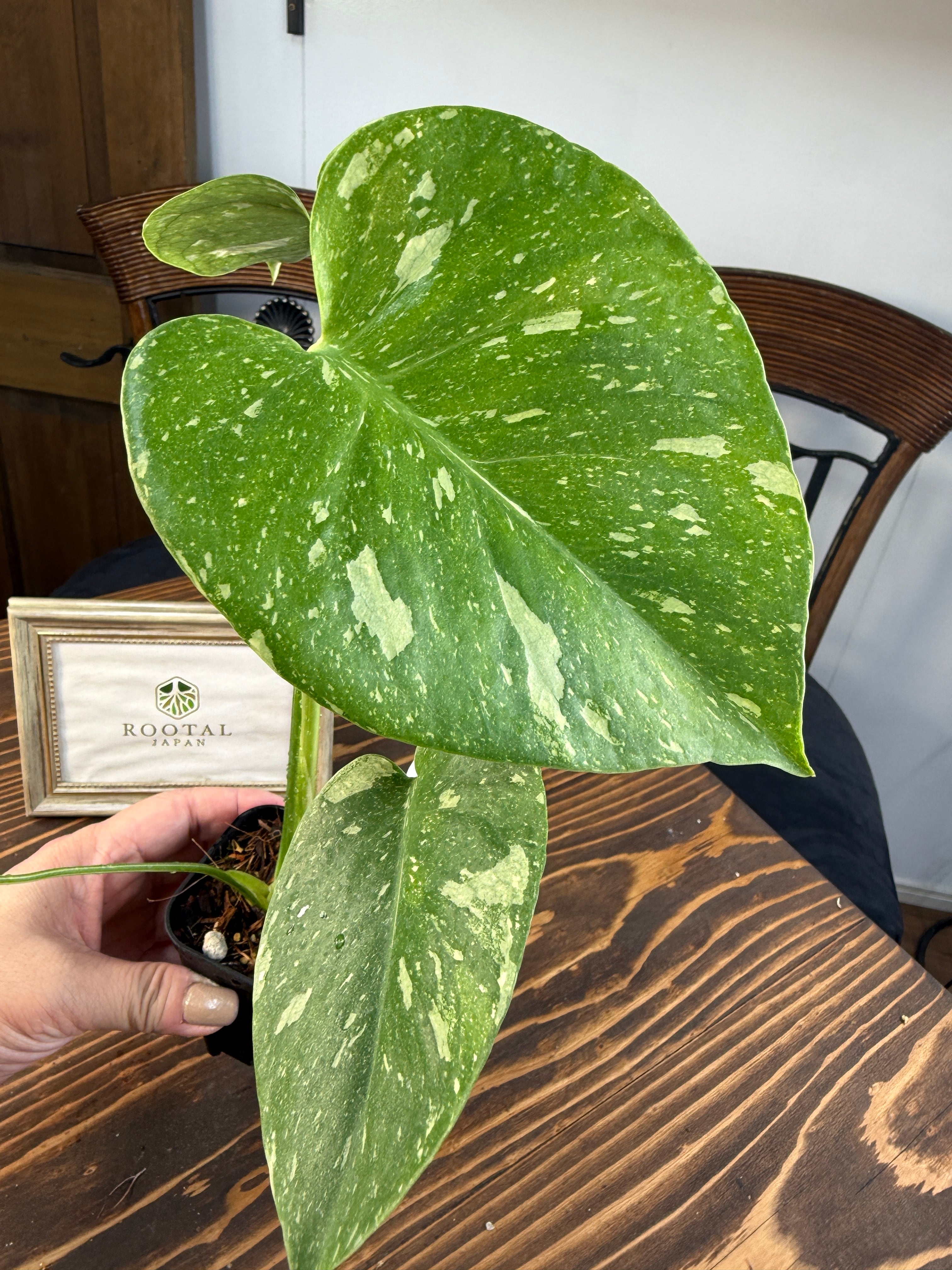 モンステラ デリシオーサ タイコンステレーションの葉は、ユニークなバリエガータが印象的で、成長段階によってその美しさが変わります。出荷時のサイズはおおよそ20㎝程度で、かわいらしいベビー苗をお届けいたします。