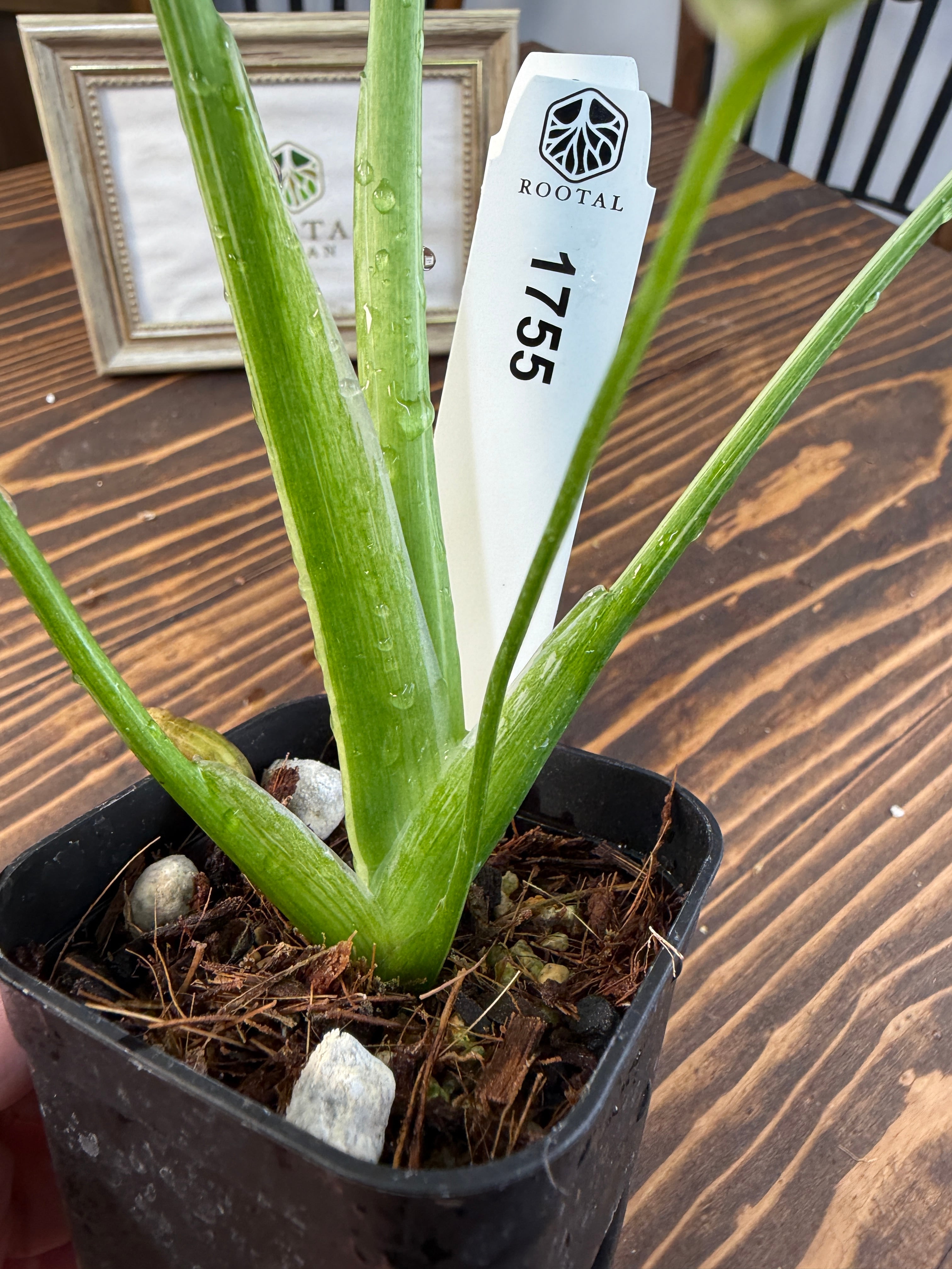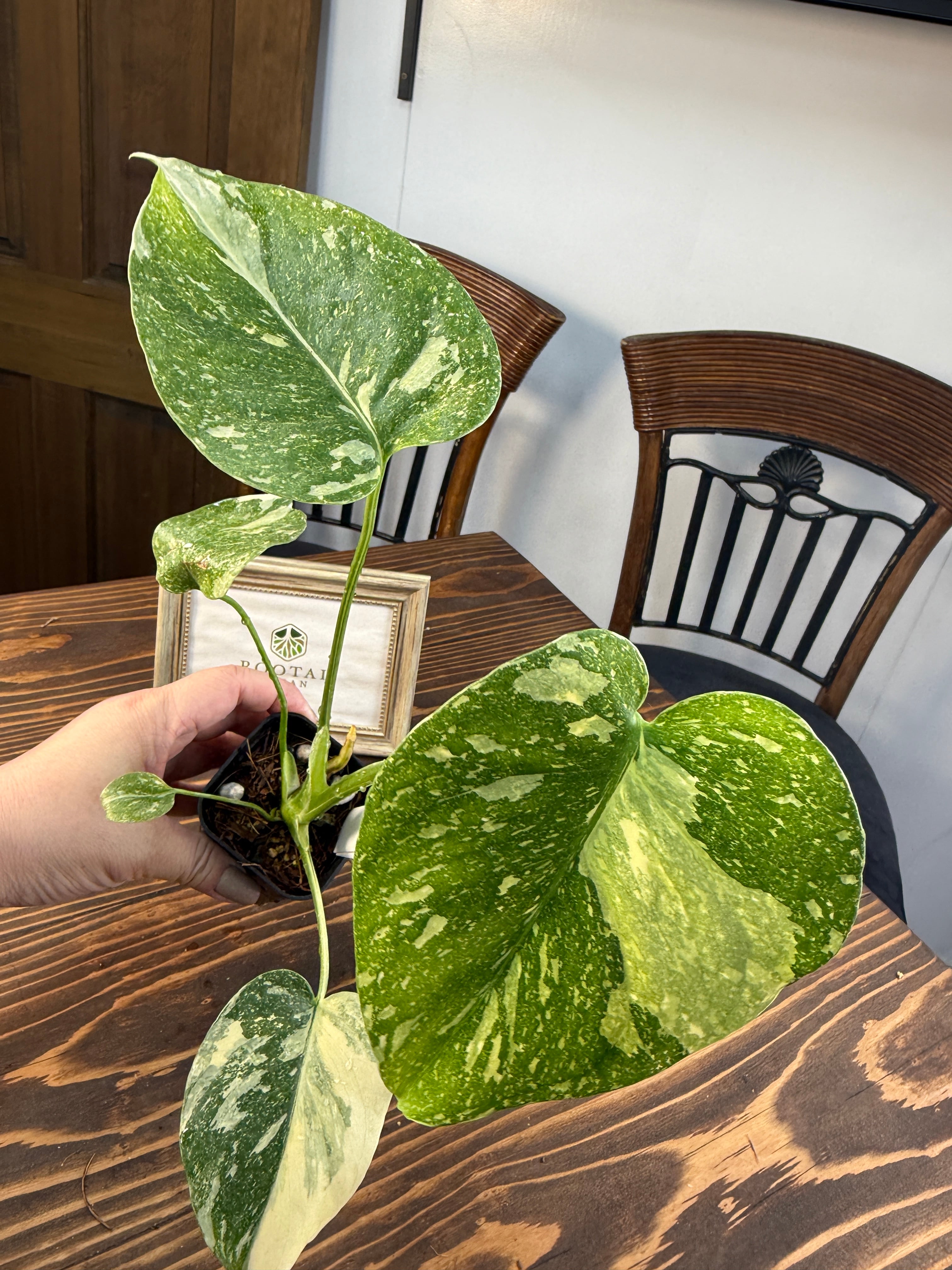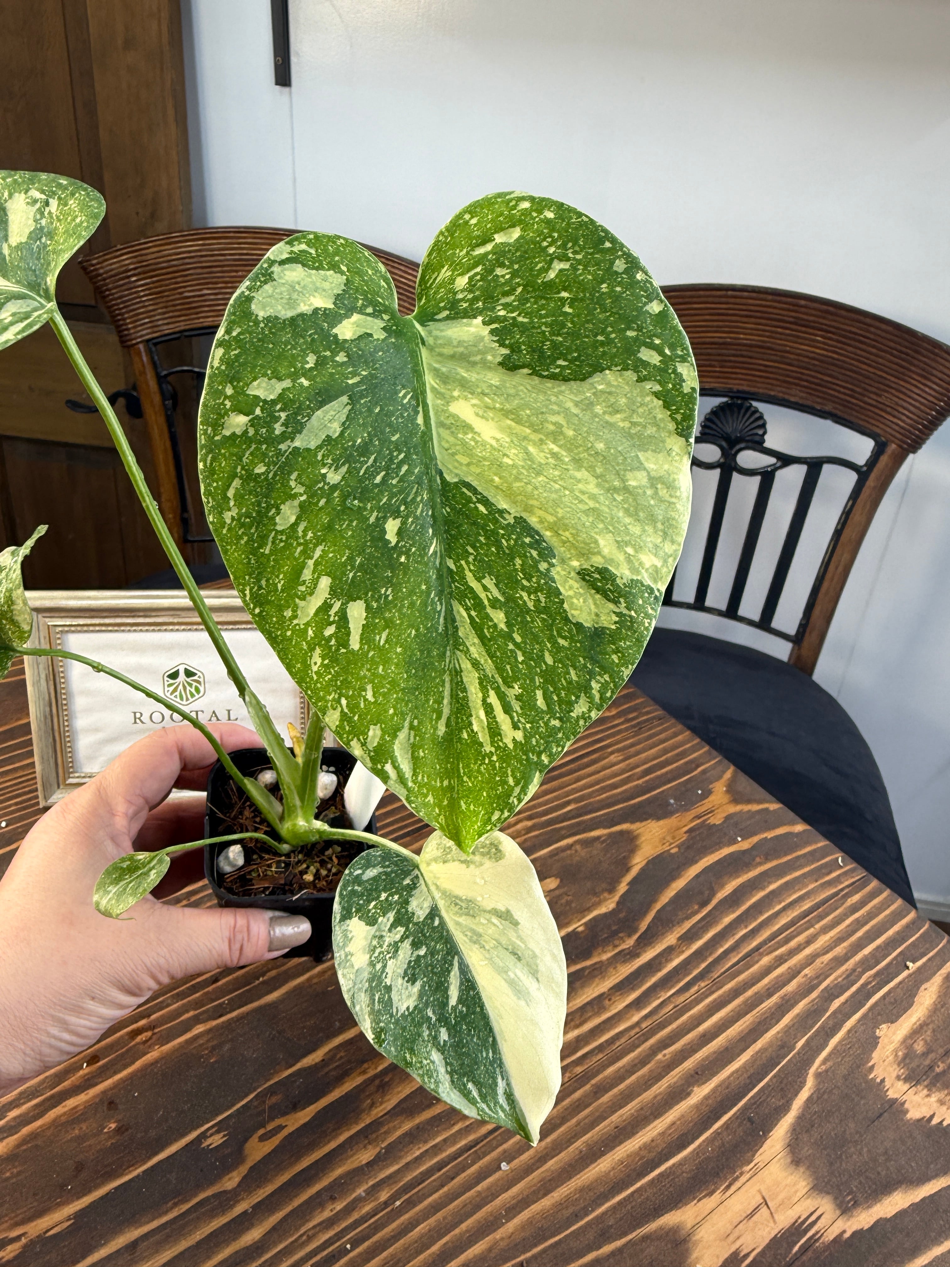 モンステラ デリシオーサ タイコンステレーションの葉は、ユニークなバリエガータが印象的で、成長段階によってその美しさが変わります。出荷時のサイズはおおよそ20㎝程度で、かわいらしいベビー苗をお届けいたします。