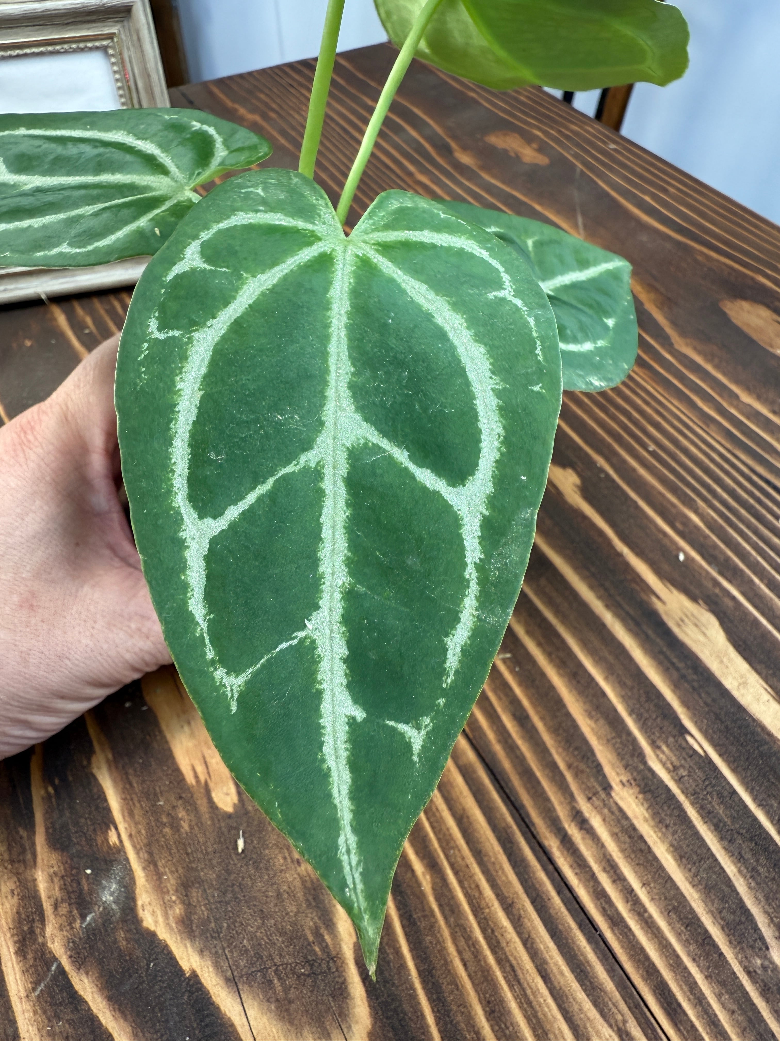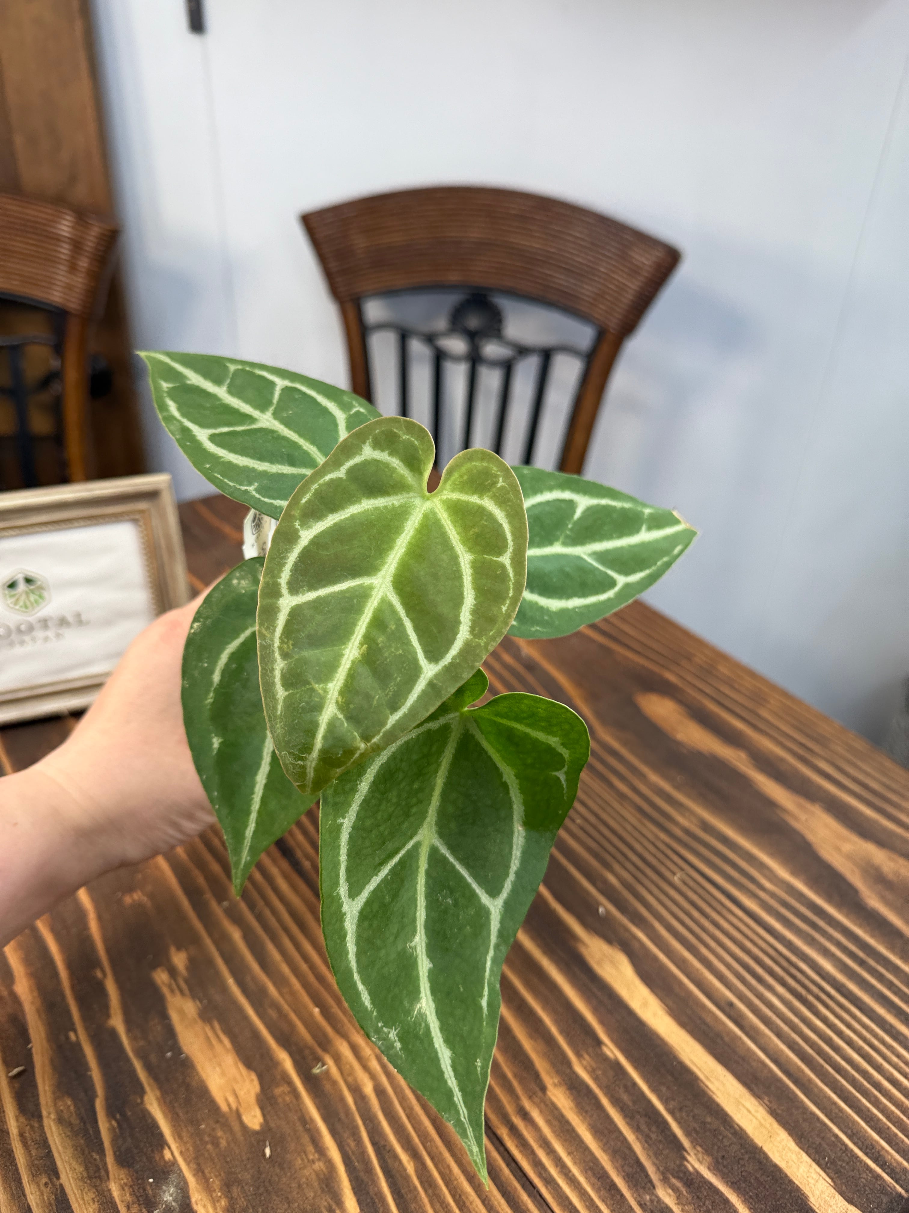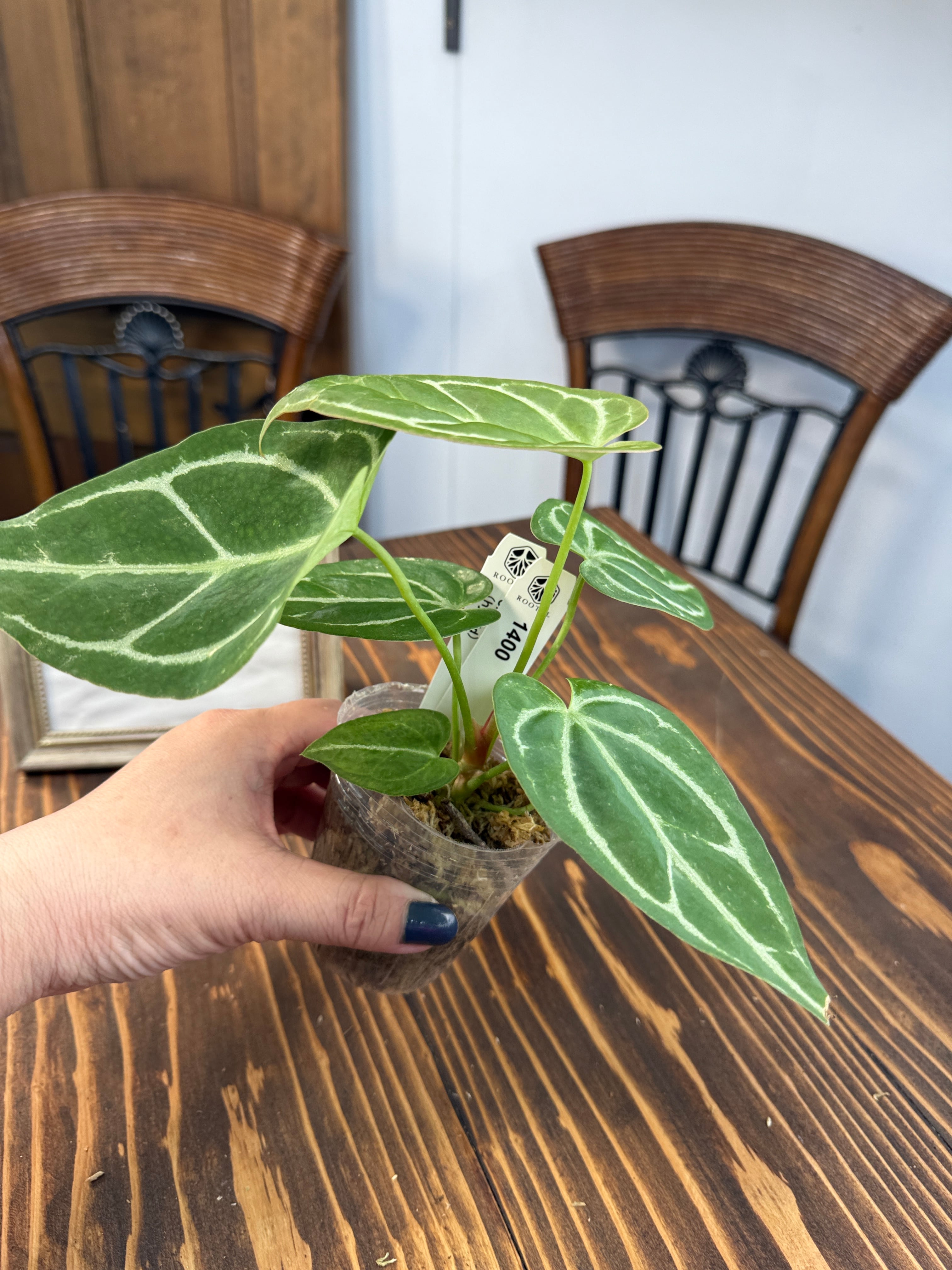 アンスリウム クリスタリナムダークフォームの出荷時サイズ高さ約5㎝です。成長と共に葉が広がり、その美しさも増していきます。独自の葉の形状は、どんなインテリアスタイルにもぴったりと溶け込み、魅力的なスポットを演出します。