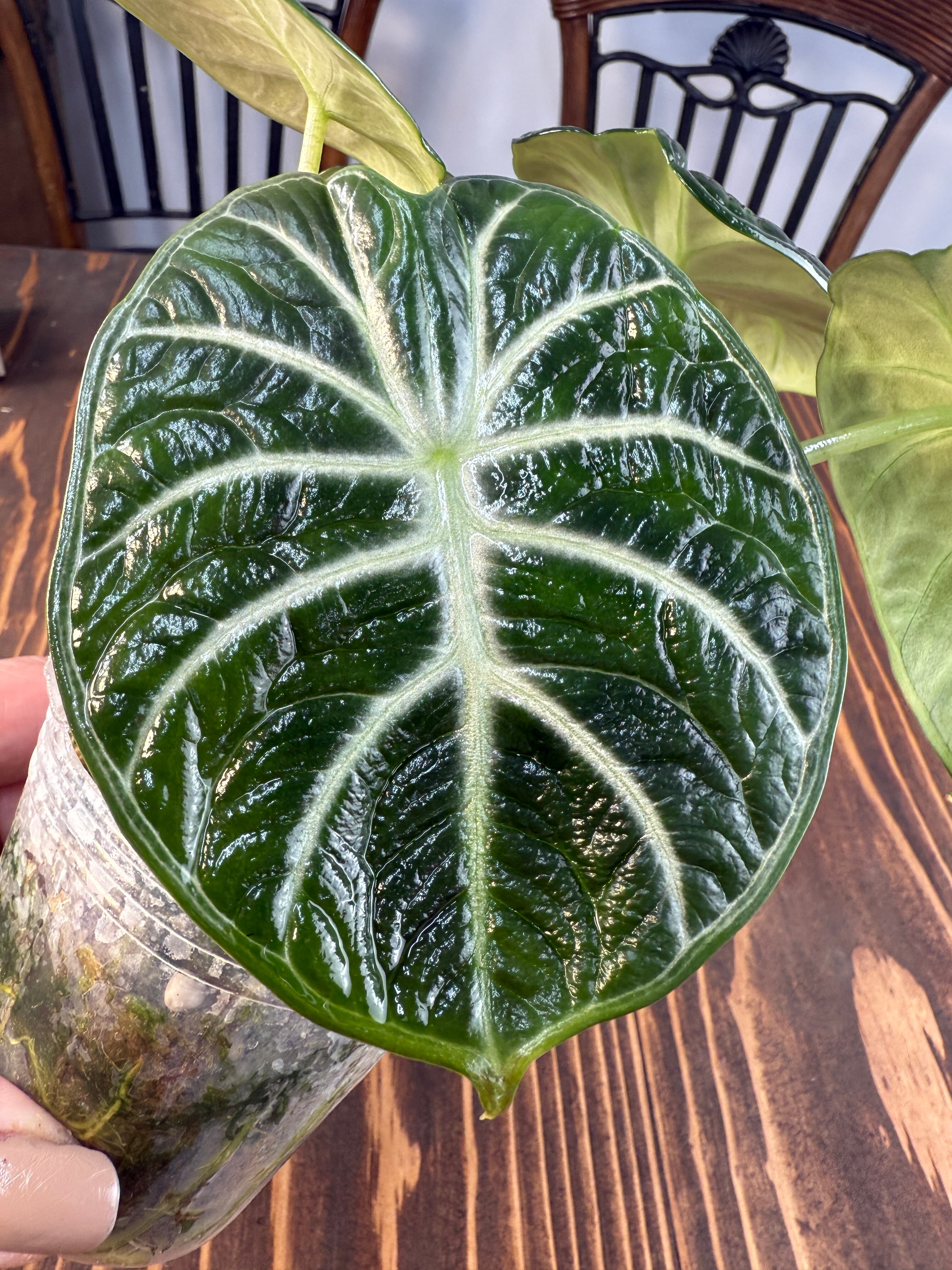 アロカシア レギヌラ ニンジャは、独自のディープグリーンの葉と、エキゾチックな形状が特徴の観葉植物です。このユニークなデザインは、見る人をひきつけ、空間にエレガントな雰囲気をもたらします!明るい間接光のもとで育成することで、その美しさがより一層際立ち、インテリアに鮮やかなアクセントを与えます。