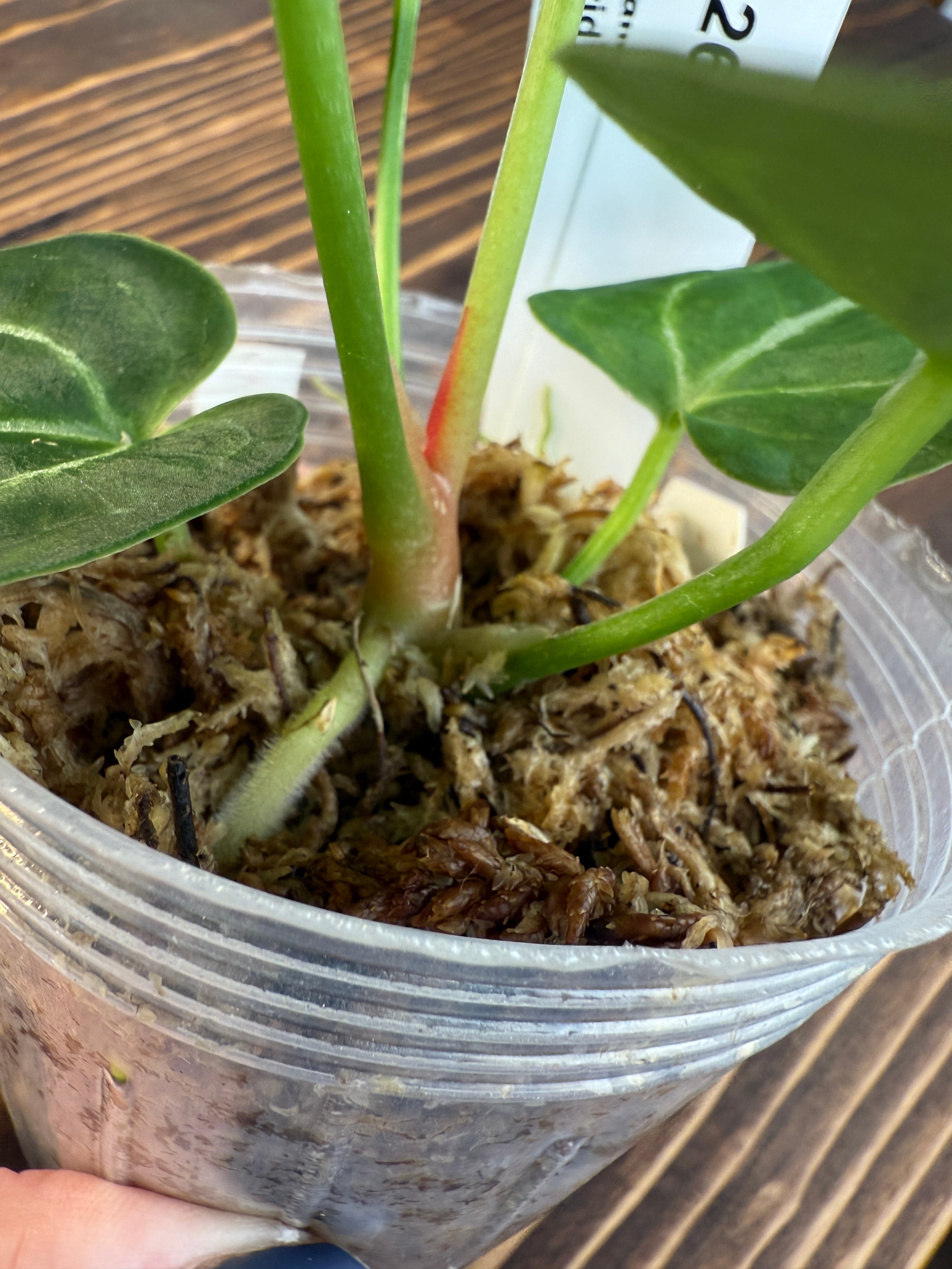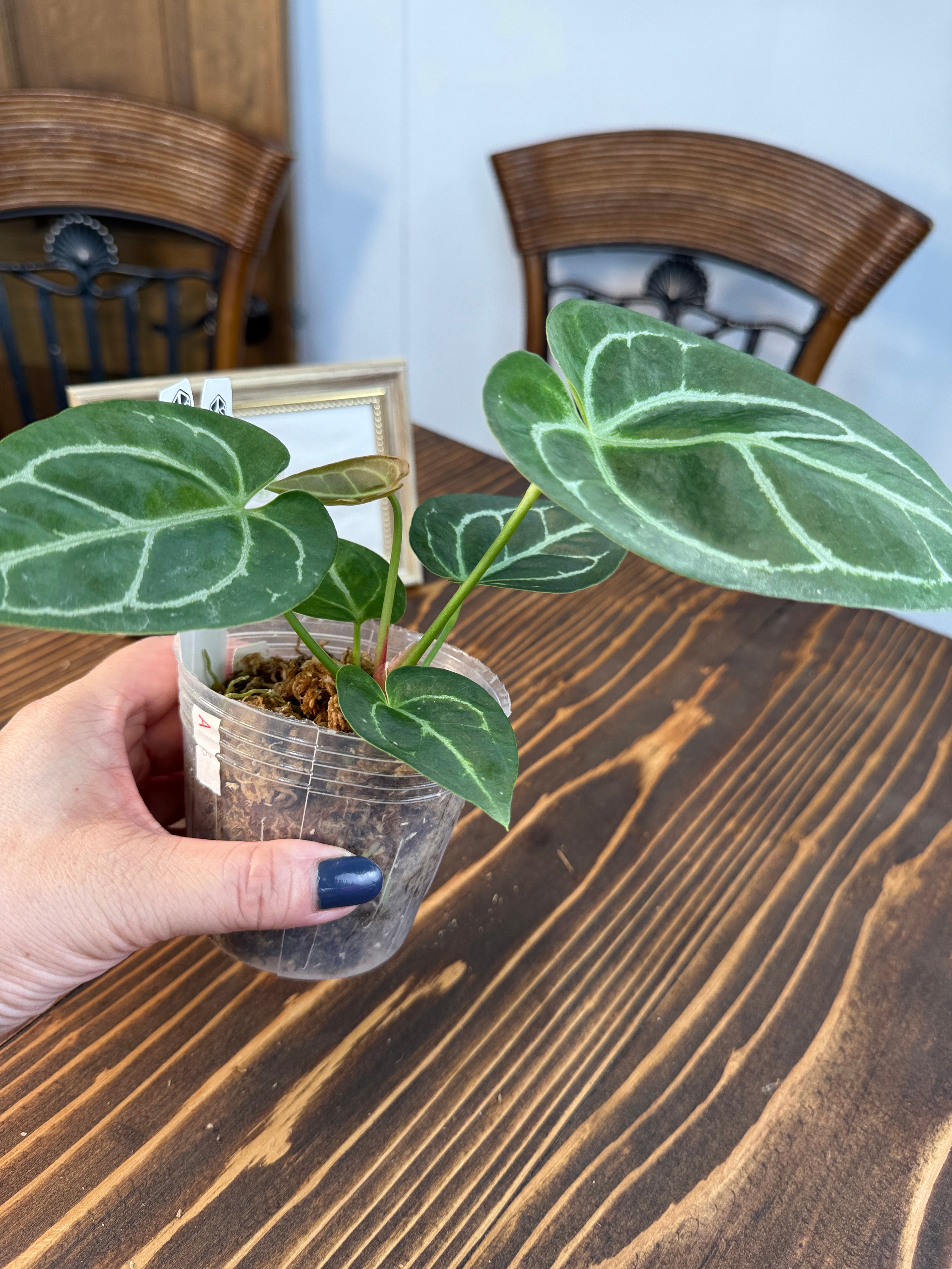 アンスリウム クリスタリナムダークフォームの出荷時サイズ高さ約5㎝です。成長と共に葉が広がり、その美しさも増していきます。独自の葉の形状は、どんなインテリアスタイルにもぴったりと溶け込み、魅力的なスポットを演出します。