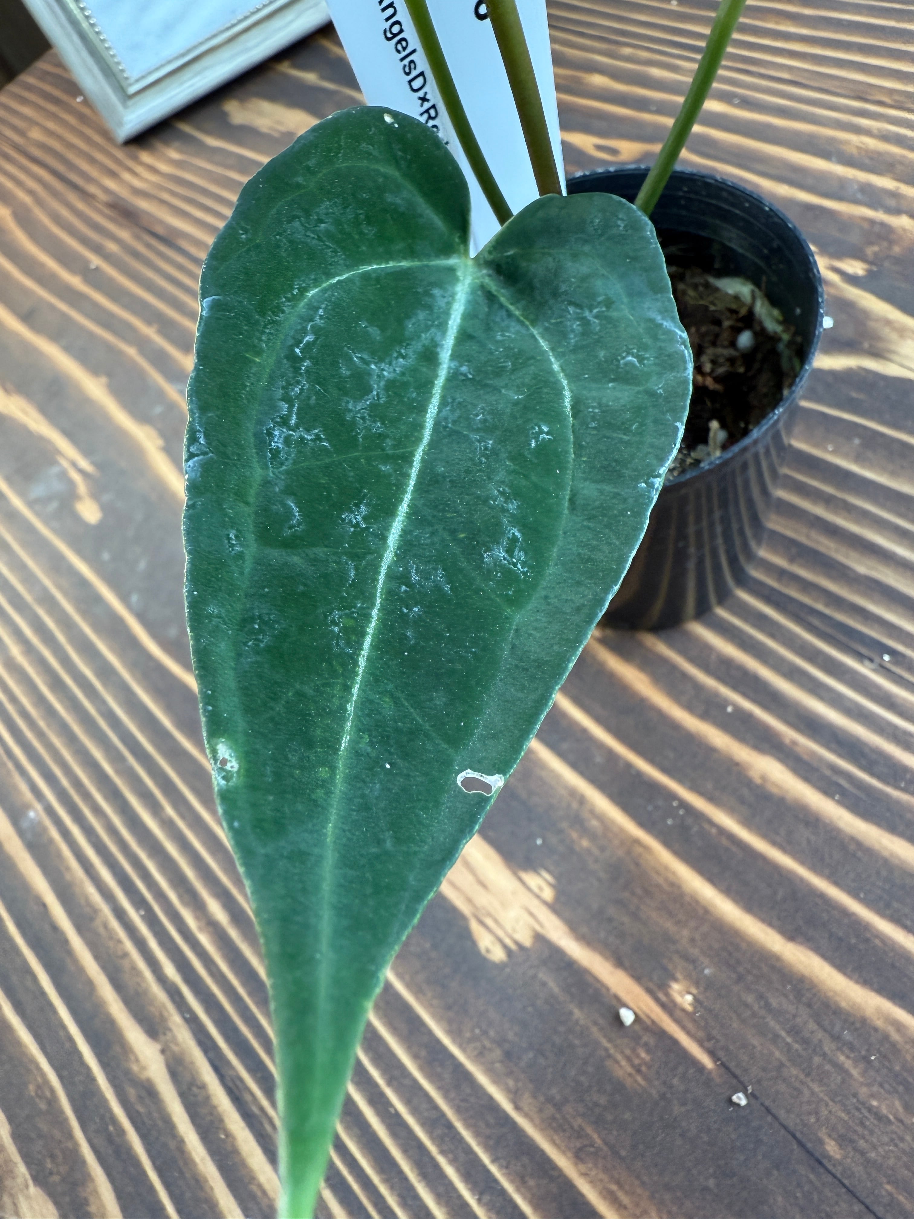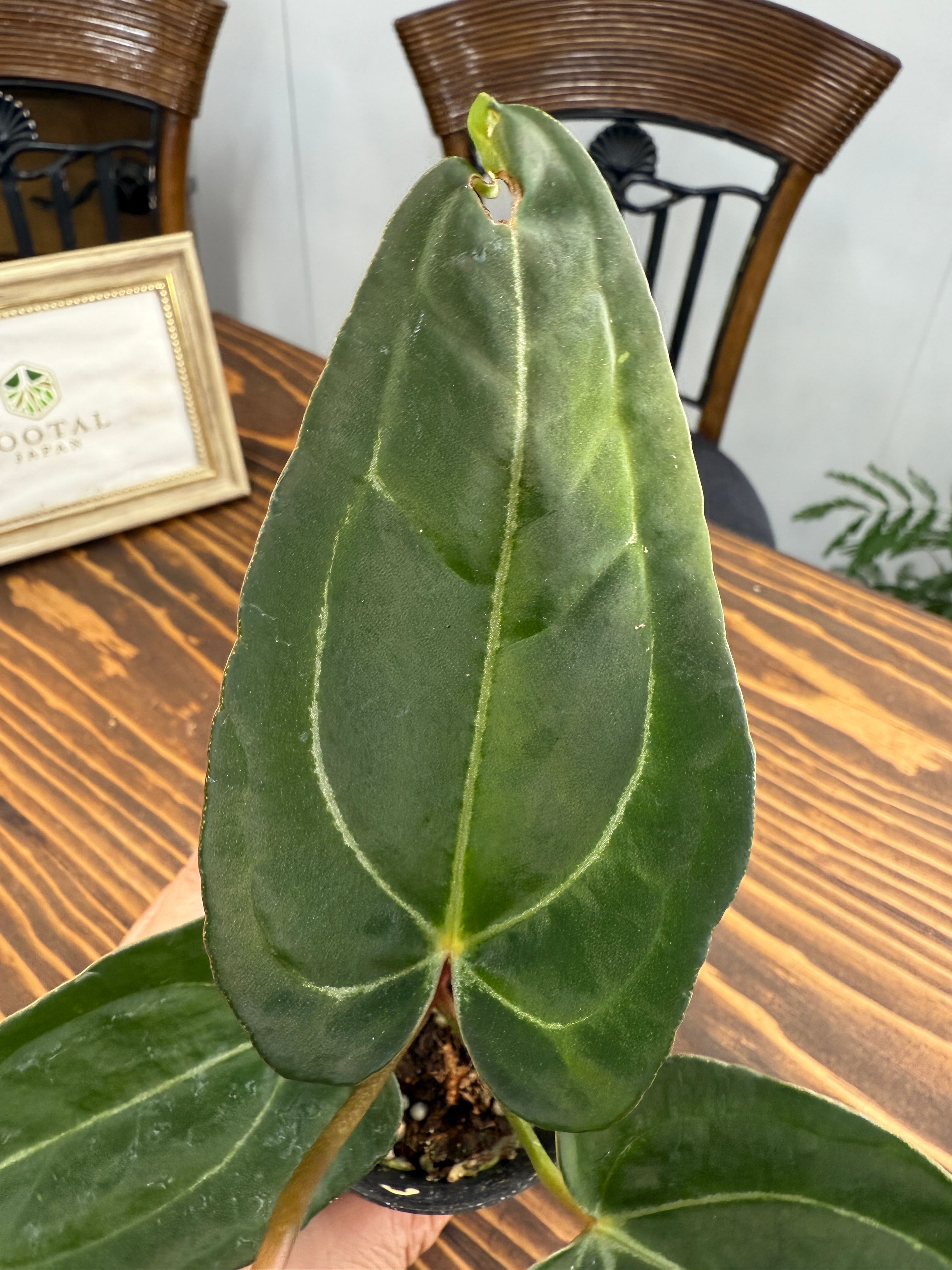 アンスリウム エンジェルスD×レッドスパイダーの葉は、深い緑色に光沢を持ち、独特なフォルムが存在感を引き立てます。出荷時のサイズは2.5号プラ鉢で、コンパクトながら健康的に育った美しい個体をお届けいたします。