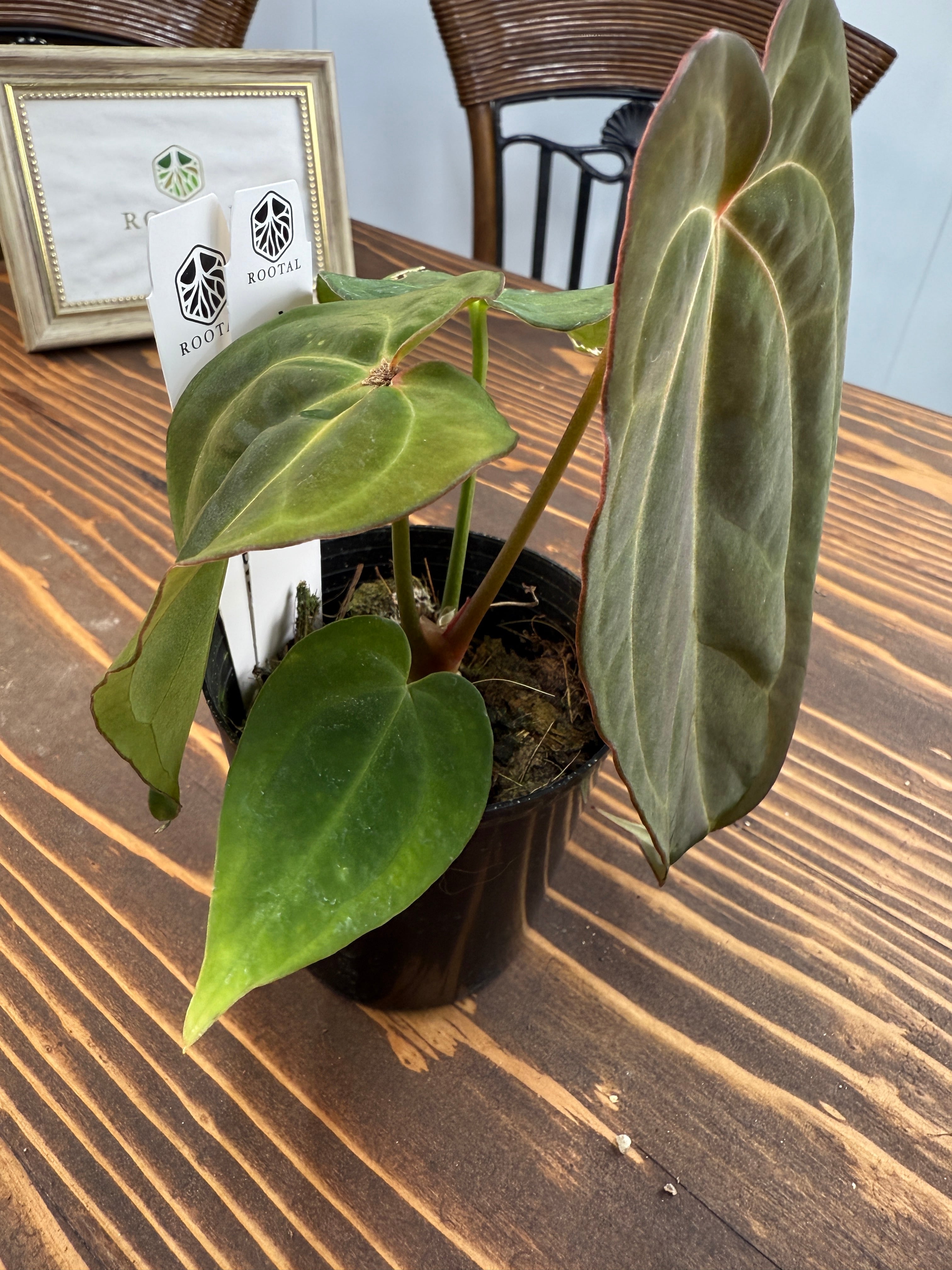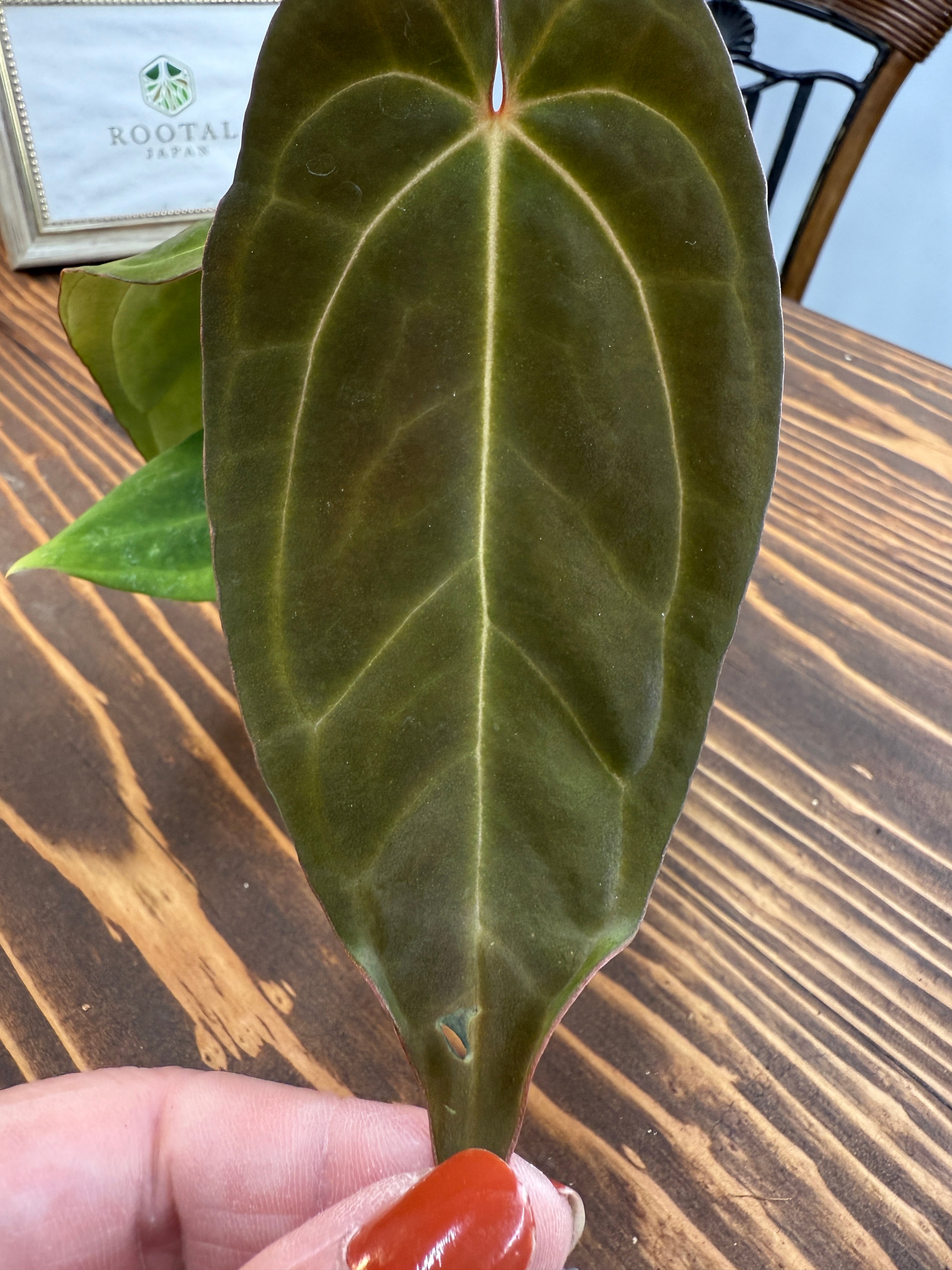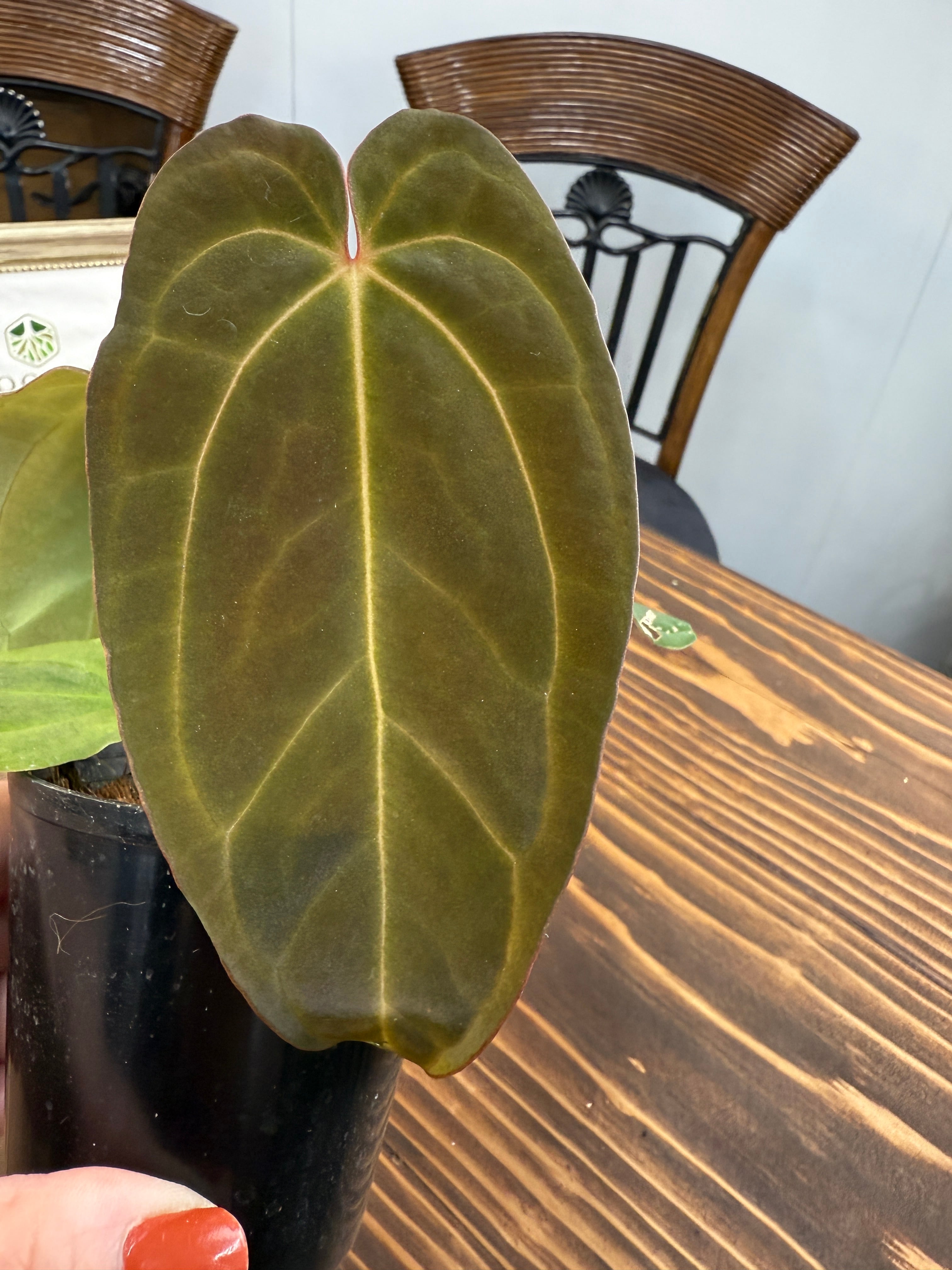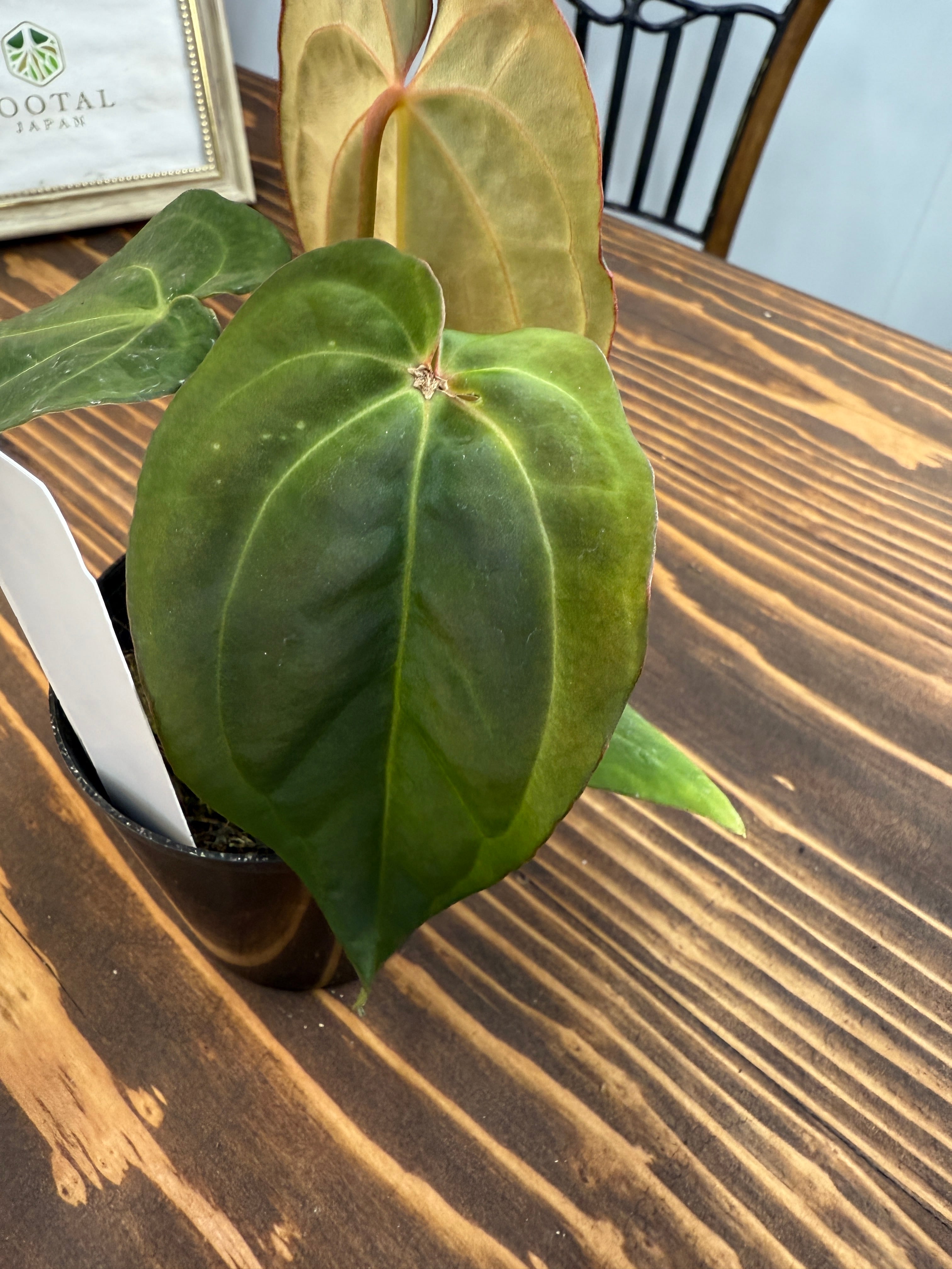 アンスリウム ミッシェル×ザラ×BVEPの葉は深い緑色に艶やかな光沢を持ち、圧倒的な存在感を放ちます。出荷時のサイズは2.5号プラ鉢で、コンパクトですが健康的に成長した個体をお届けいたします。