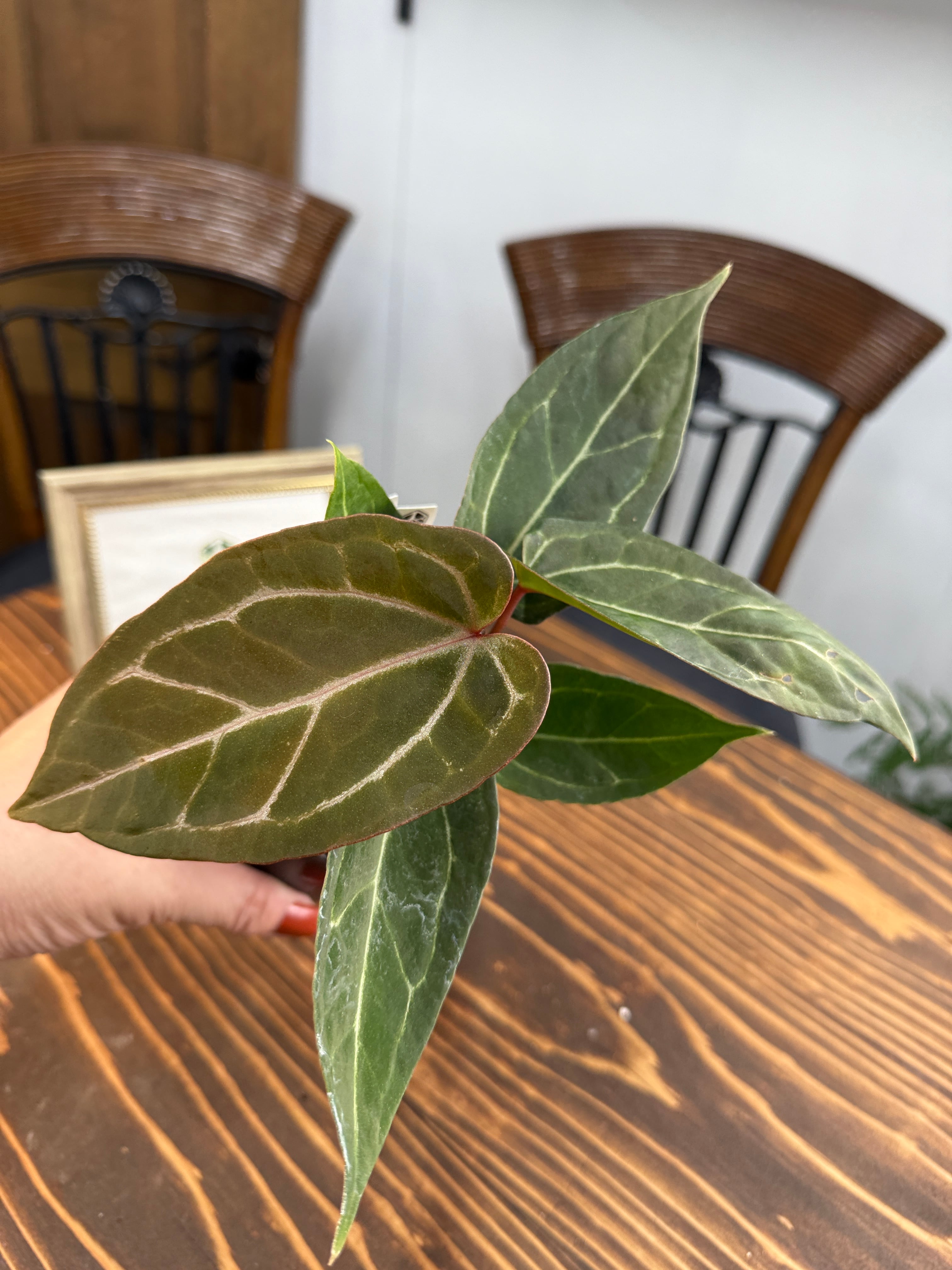 アンスリウム エンジェルスD×レッドスパイダーの葉は、深い緑色に光沢を持ち、独特なフォルムが存在感を引き立てます。出荷時のサイズは2.5号プラ鉢で、コンパクトながら健康的に育った美しい個体をお届けいたします。