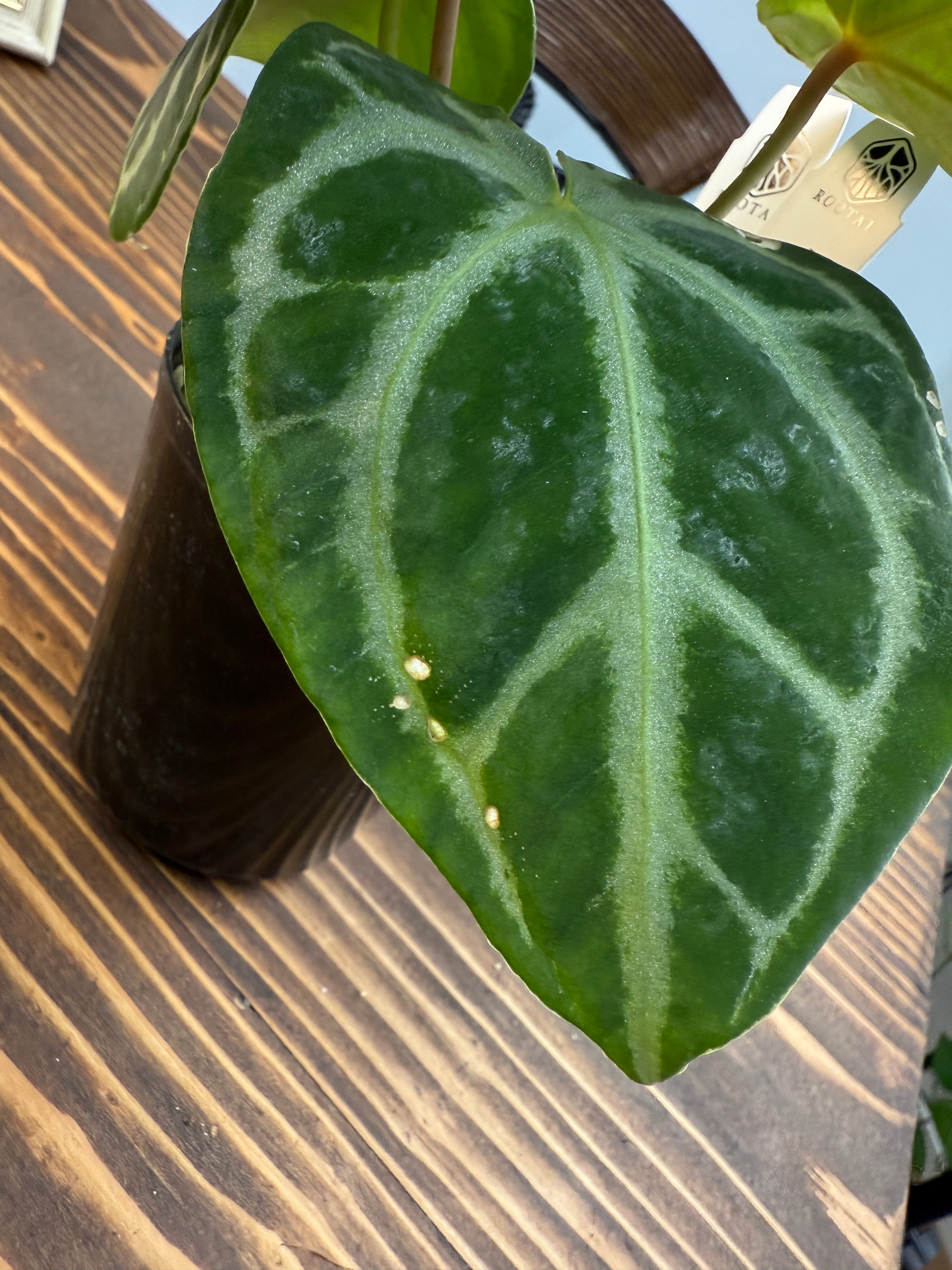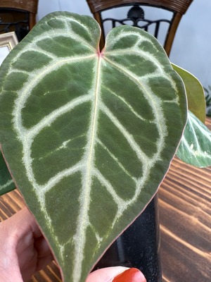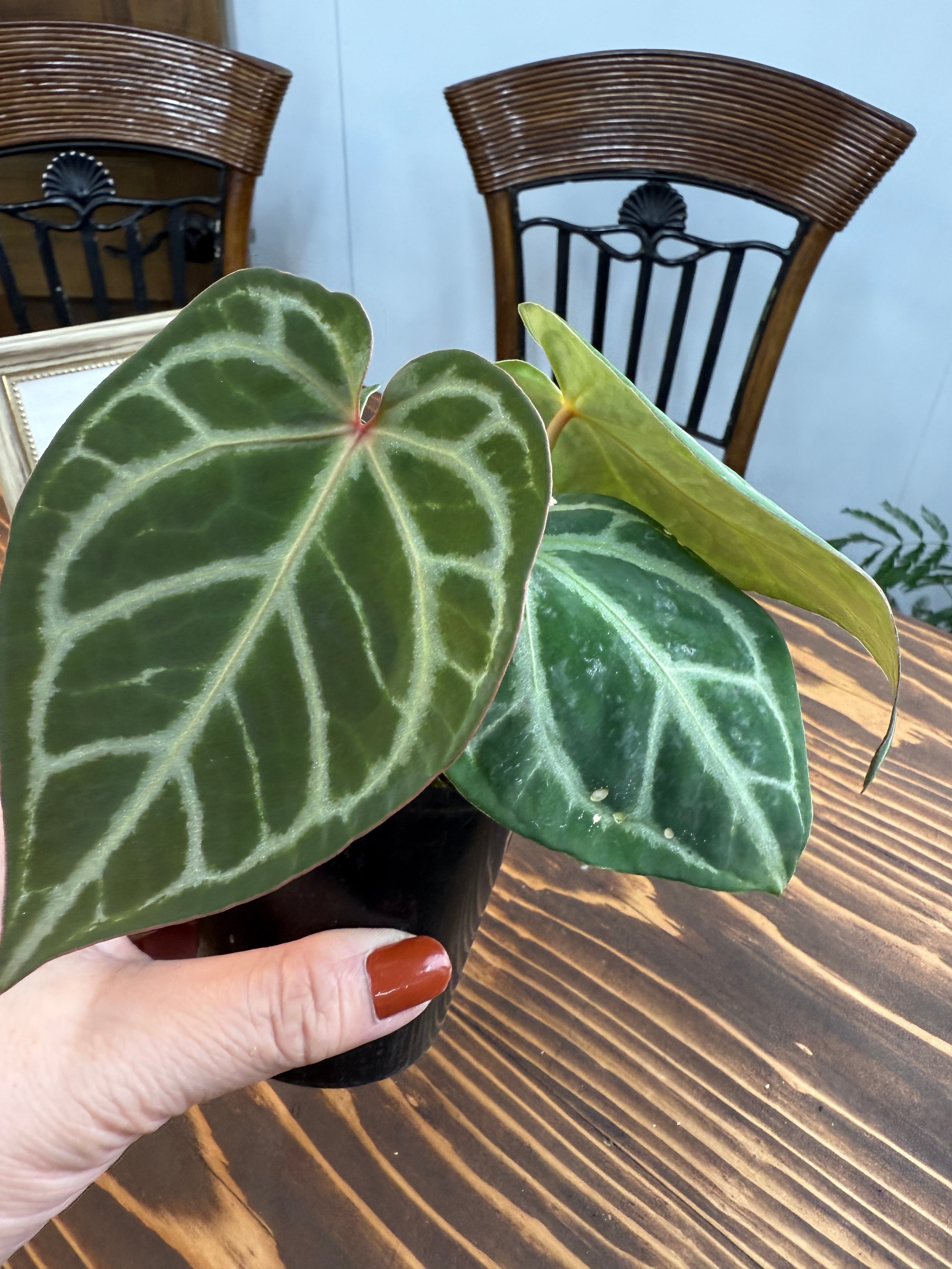 アンスリウム ピンクレモネード×レッドクリスタリナムの葉は、深い緑色に、愛らしいピンクが華やかさを添え、存在感を高めます。出荷時のサイズは2.5号プラ鉢で、コンパクトながら健康的に育った美しい個体をお届けいたします。