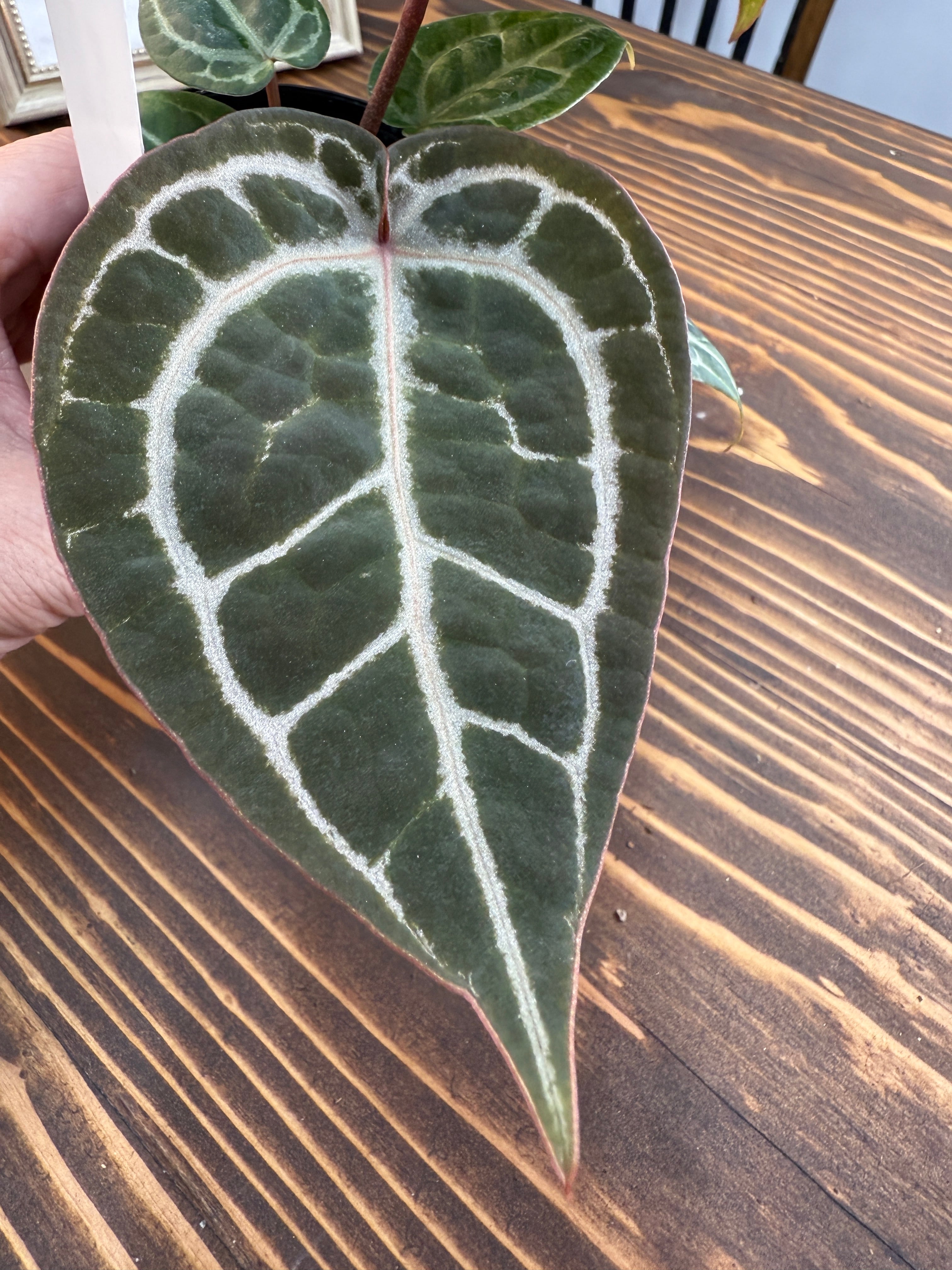 アンスリウム レッドクリスタリナム♯1×♯2の葉は、深緑色の艶やかさが魅力を引き立てます。出荷時のサイズは2.5号プラ鉢で、コンパクトながらも健康的に育った美しい個体をお届けいたします。