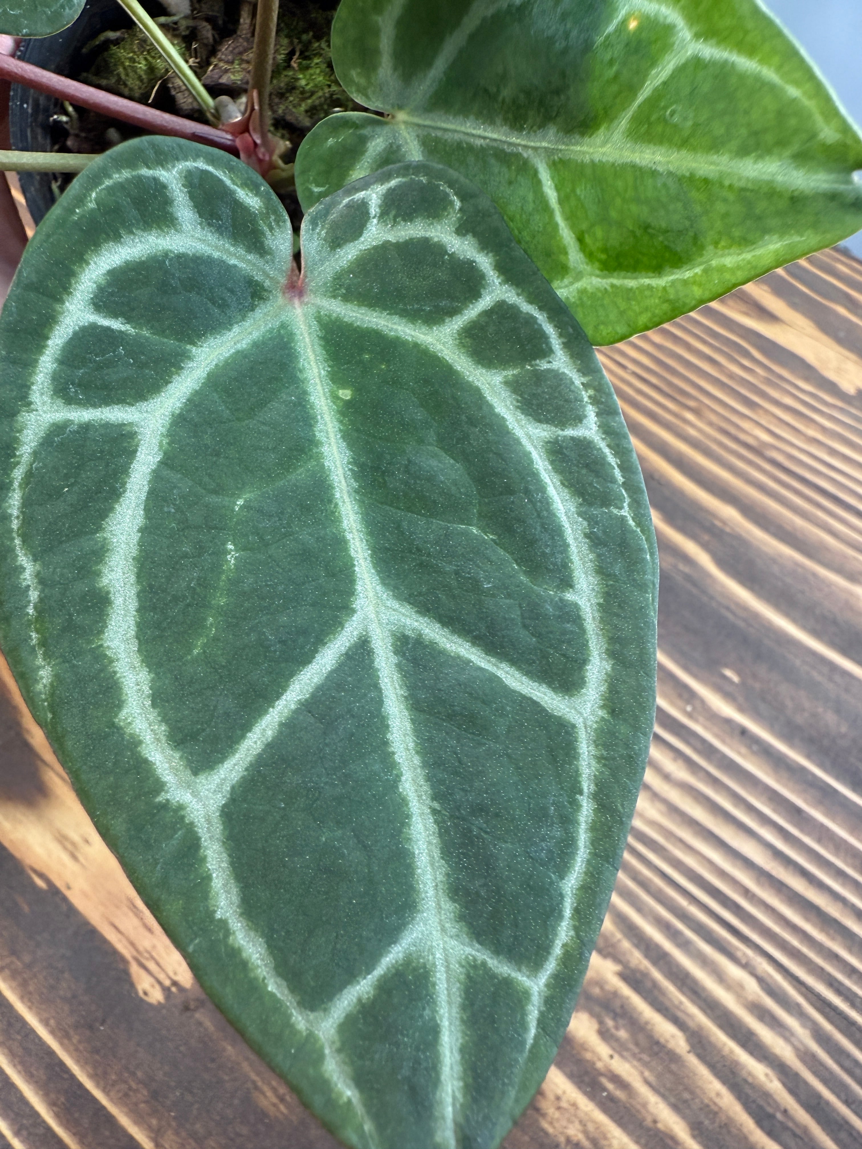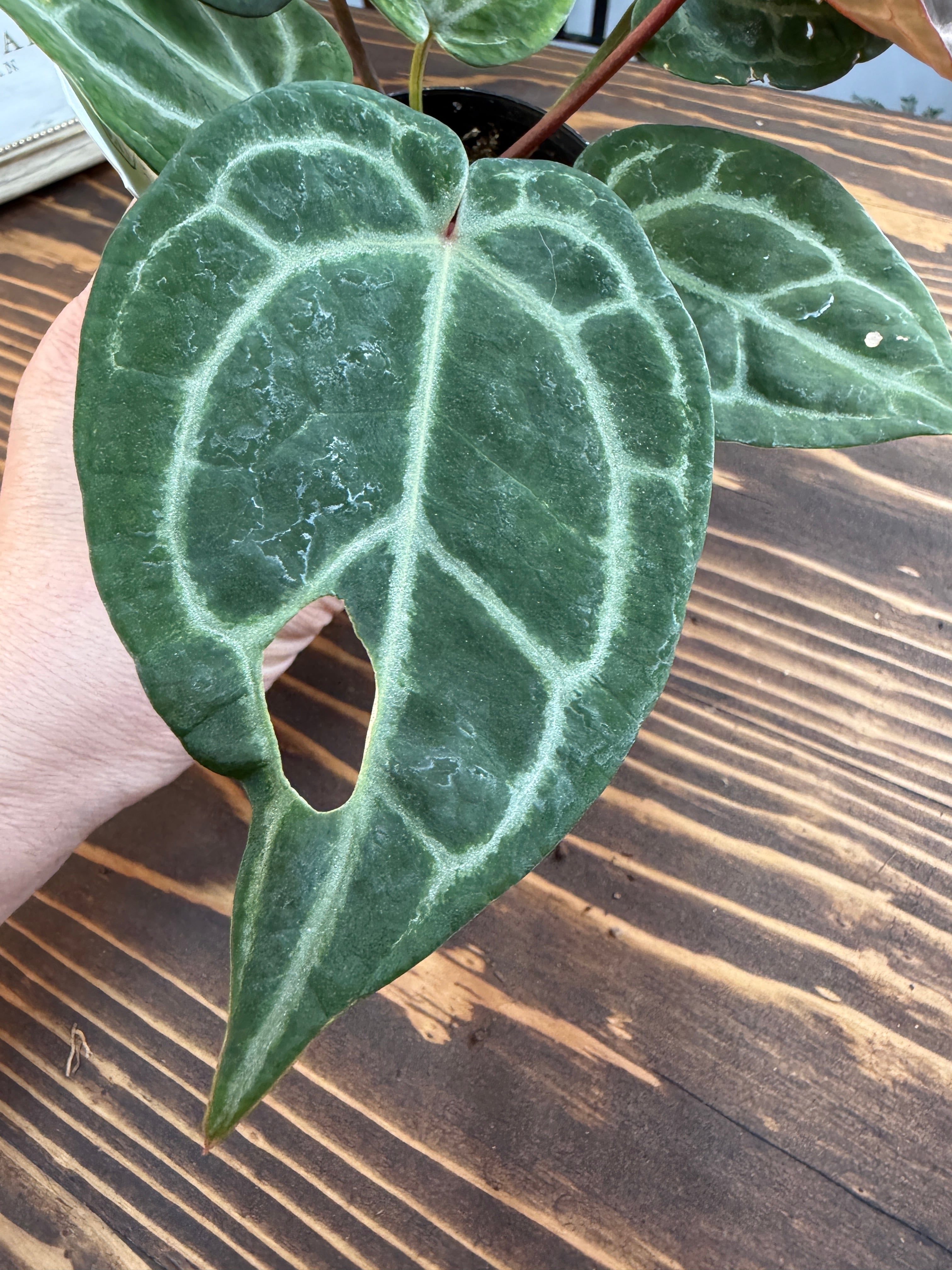 アンスリウム レッドクリスタリナム♯1×♯2の葉は、深緑色の艶やかさが魅力を引き立てます。出荷時のサイズは2.5号プラ鉢で、コンパクトながらも健康的に育った美しい個体をお届けいたします。