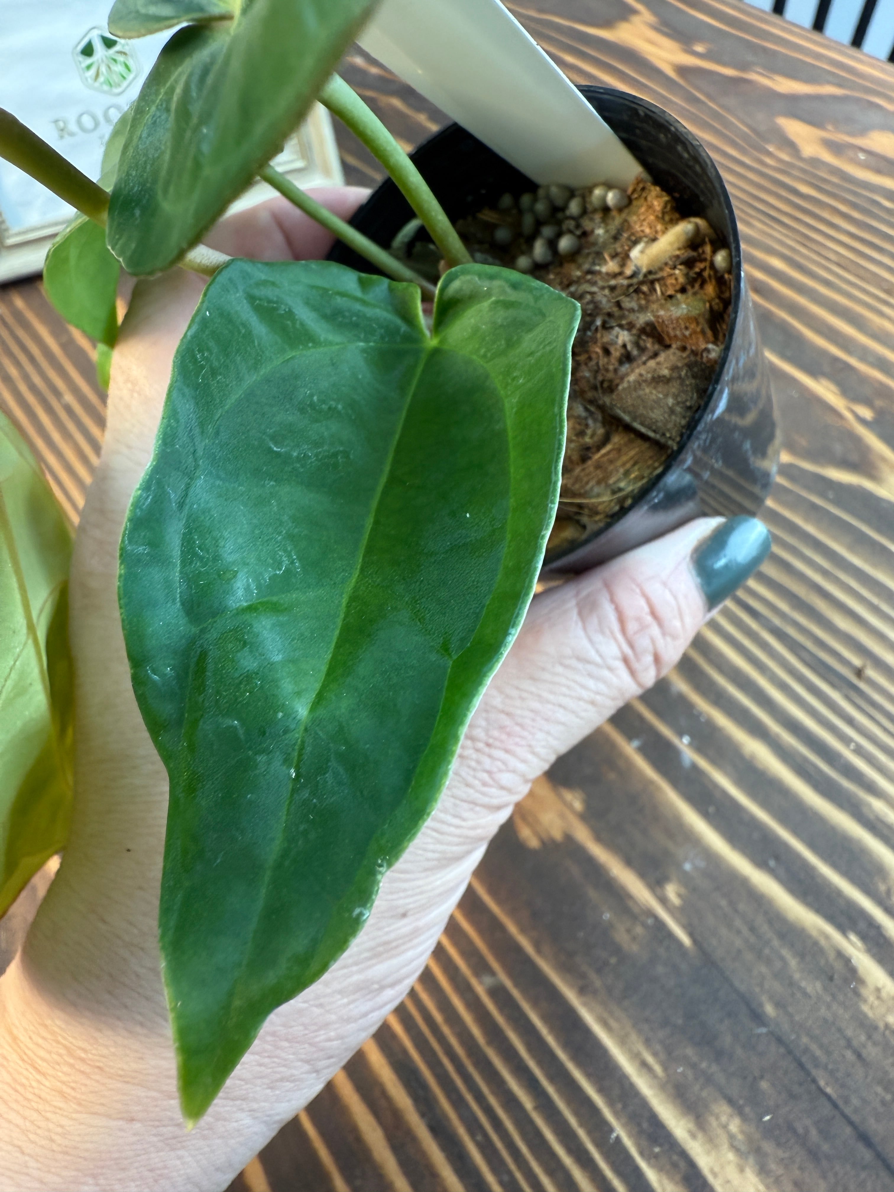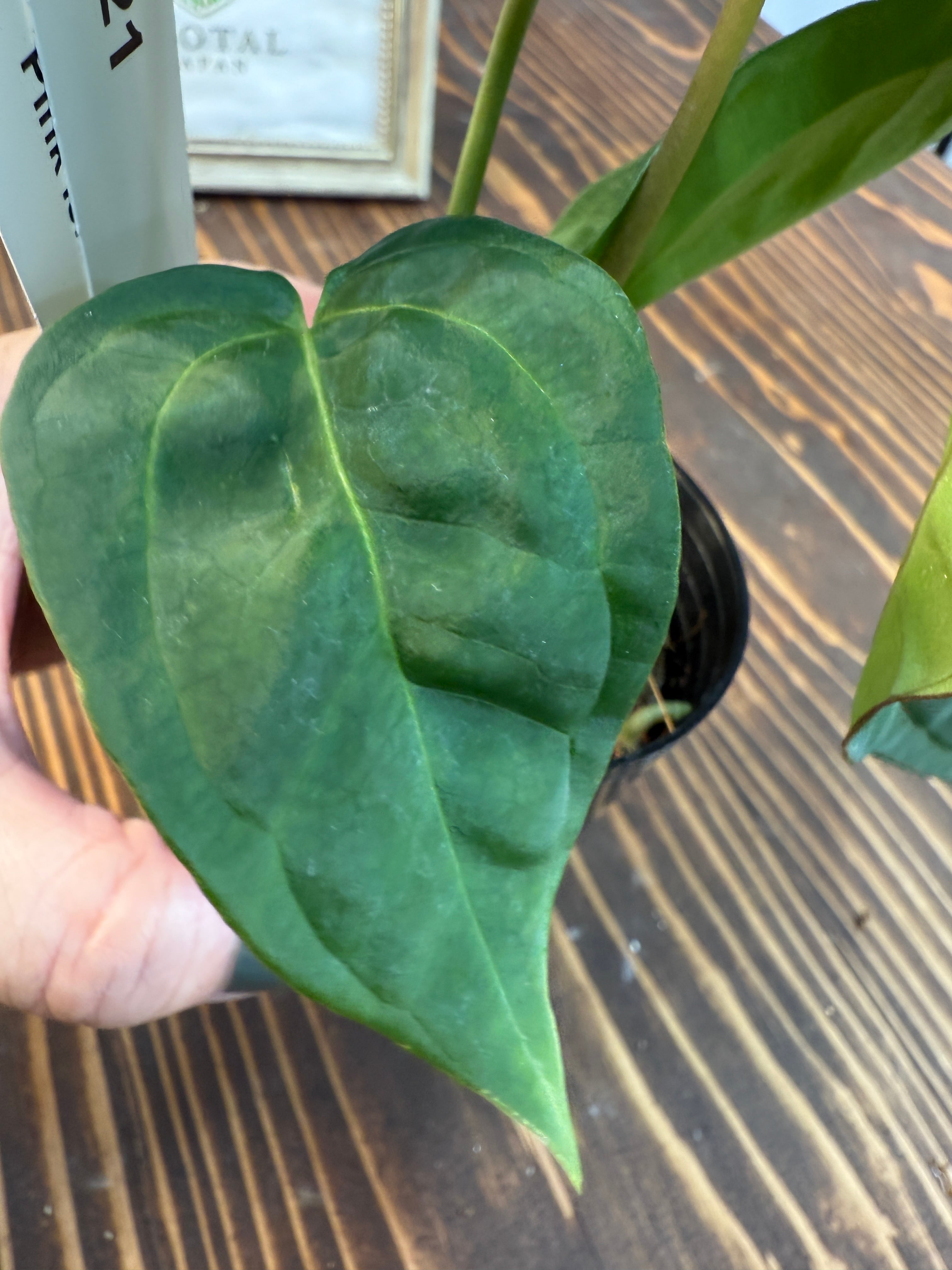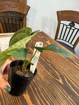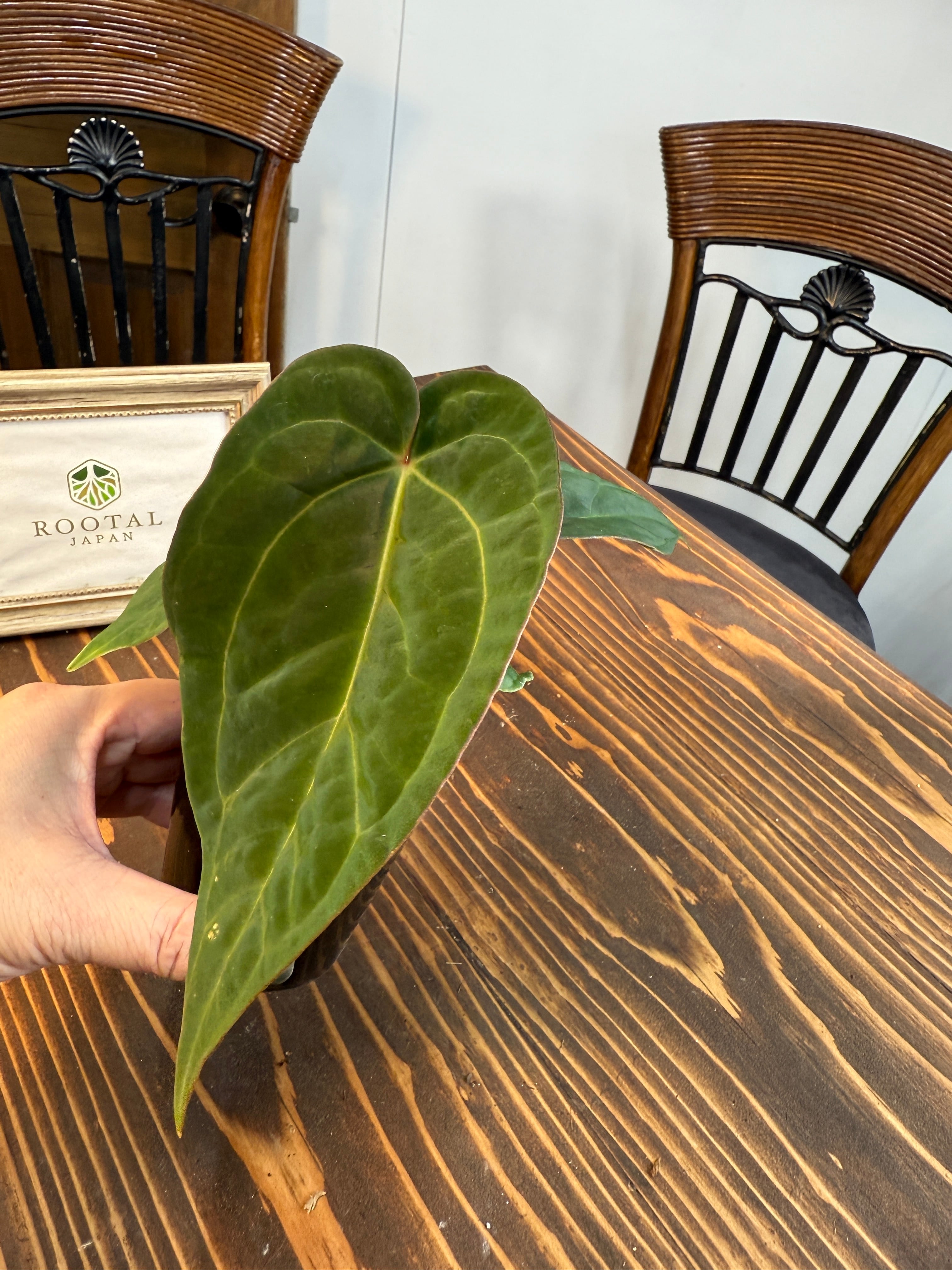 アンスリウム ピンクレモネード×アントラキーの葉は、深い緑色の中に妖艶な光沢を帯び、存在感を引き立てます。出荷時のサイズは2.5号プラ鉢で、コンパクトながらも健康的に成長した個体をお届けいたします。