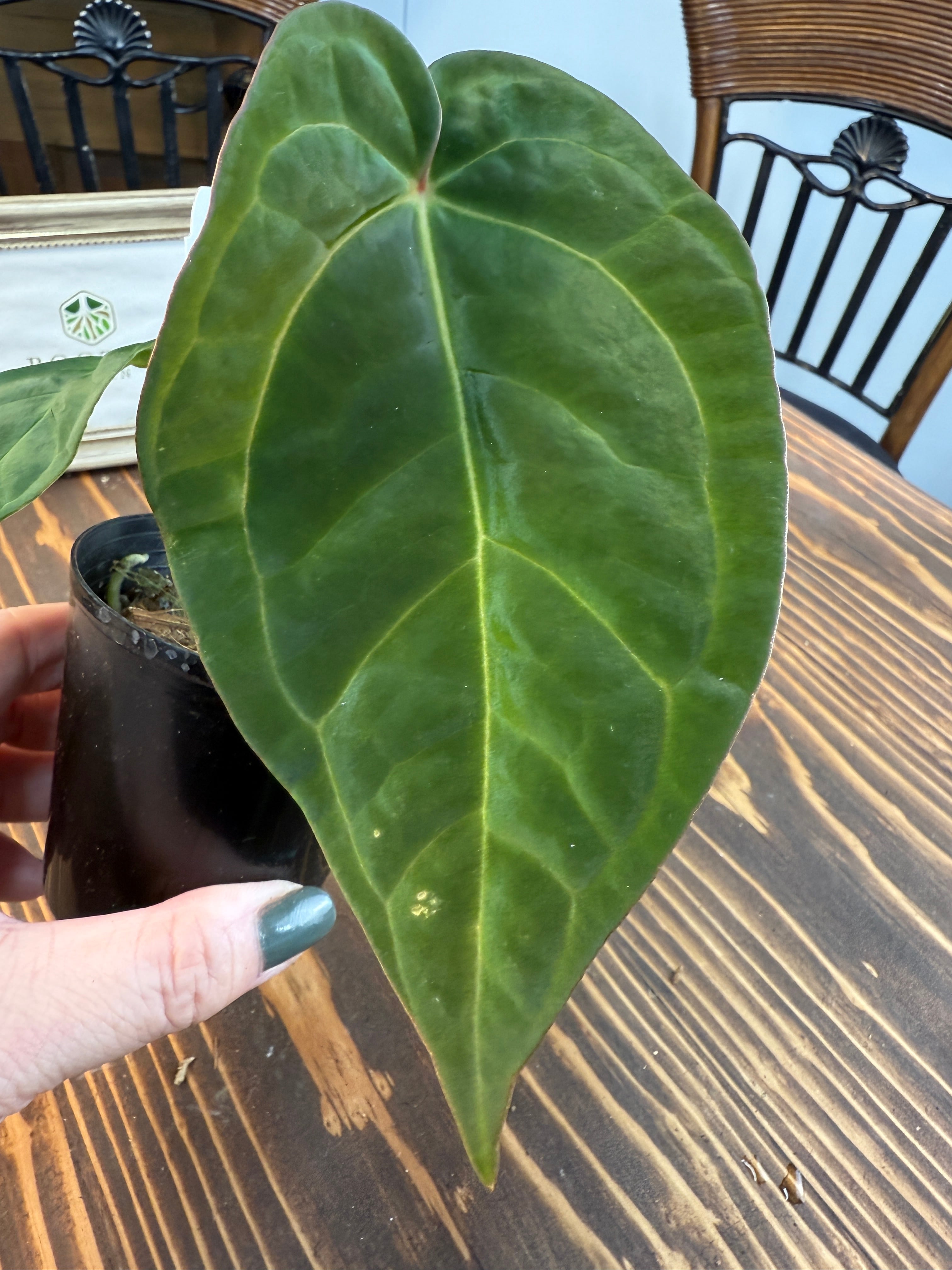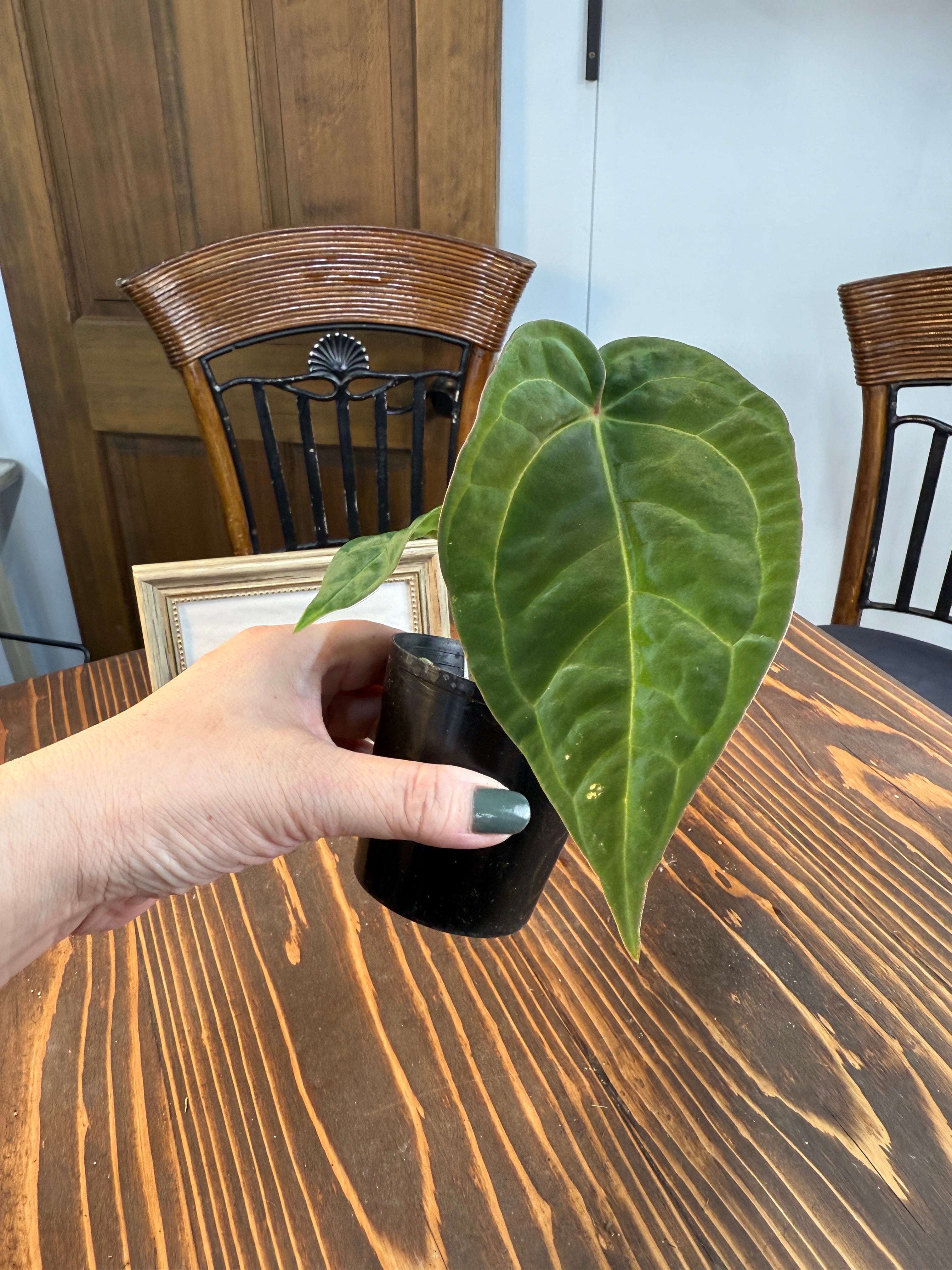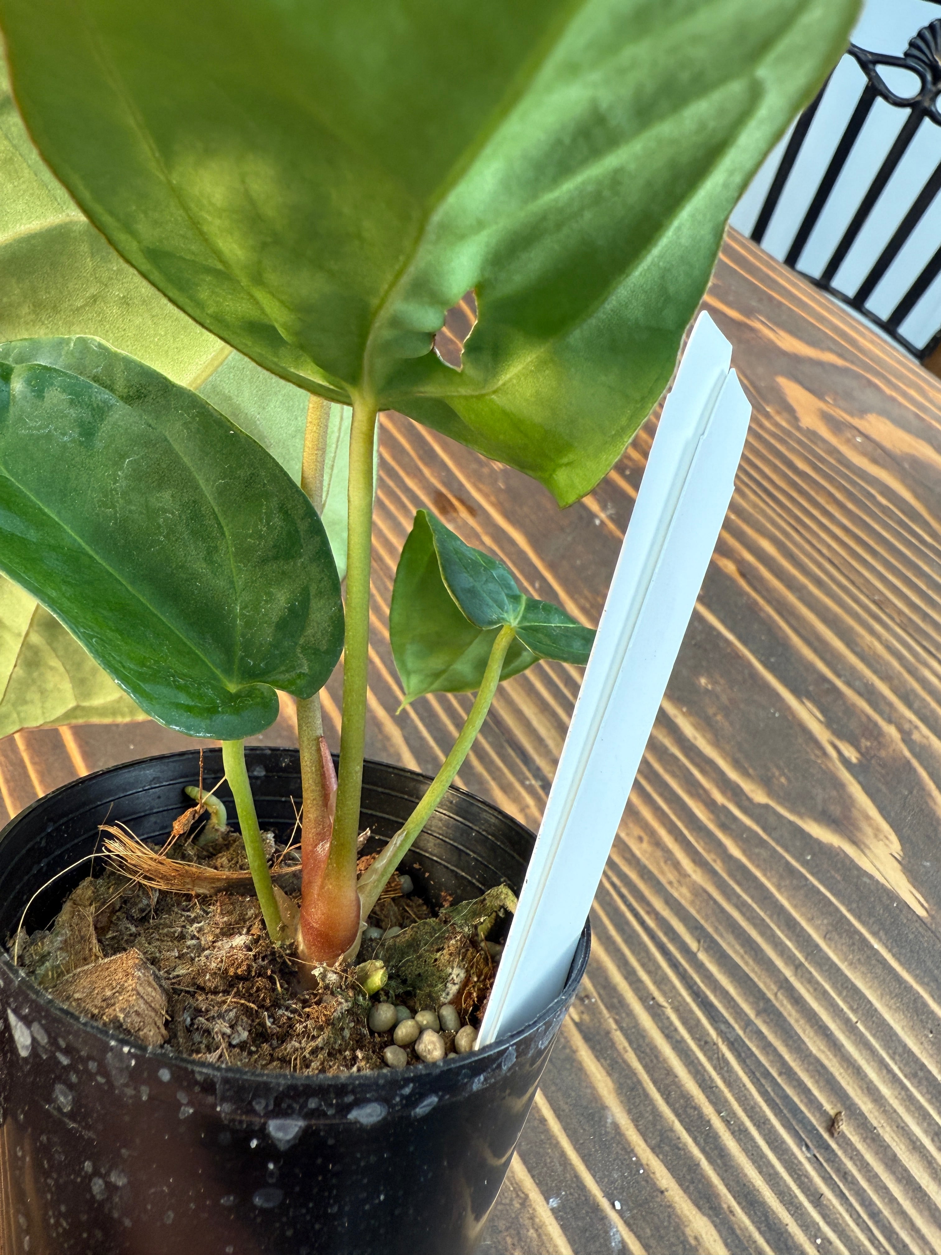 アンスリウム ピンクレモネード×アントラキーの葉は、深い緑色の中に妖艶な光沢を帯び、存在感を引き立てます。出荷時のサイズは2.5号プラ鉢で、コンパクトながらも健康的に成長した個体をお届けいたします。
