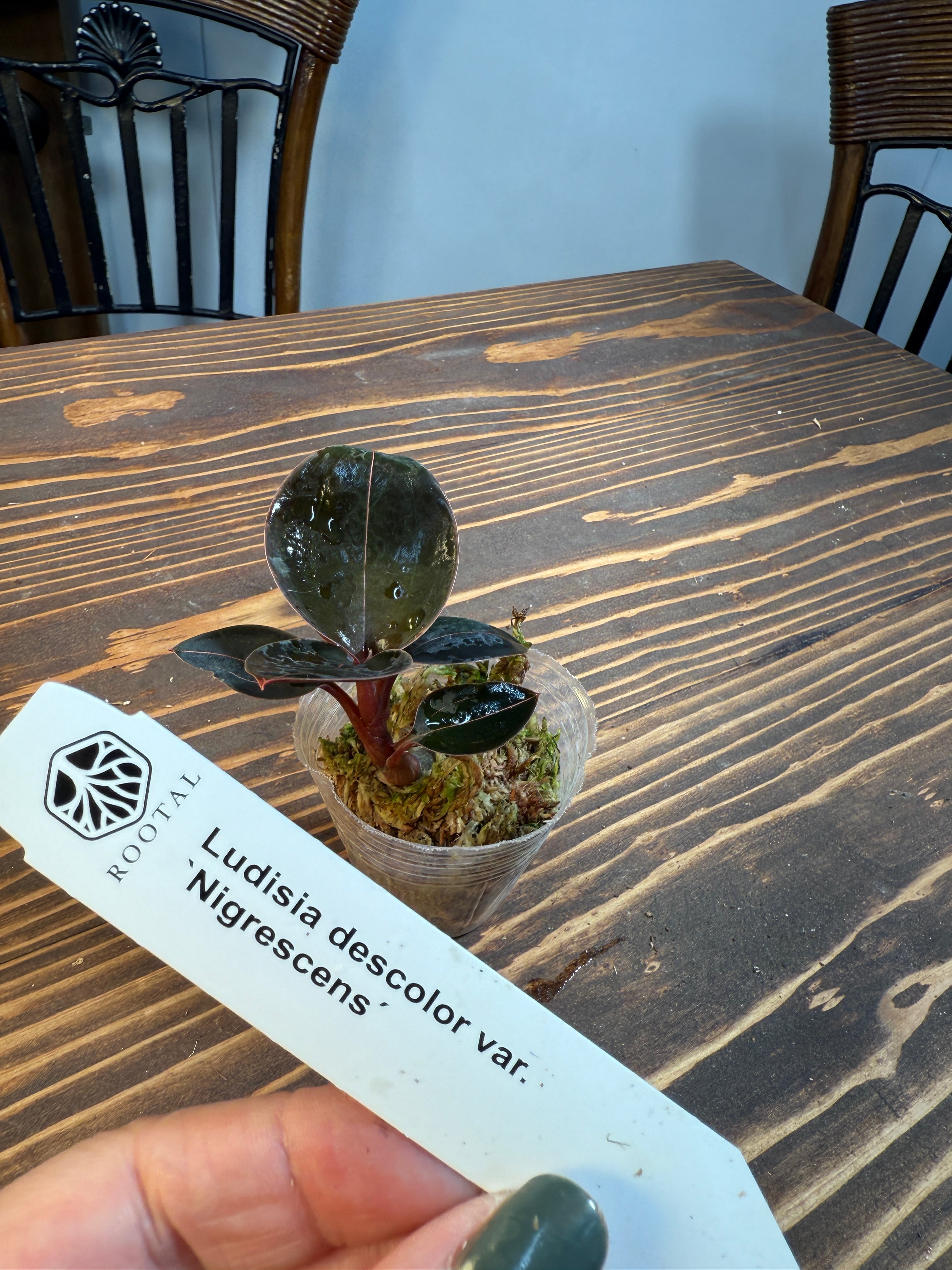 ルディシア ディスカラー バリエガータ ニグレッセンスの葉は、独自のバリエーションが魅力的で、見る者を惹きつける存在感があります。出荷時のサイズは口径5㎝ポットで、健康的に育った美しい個体をお届けしますので、お任せでの選定となります。
