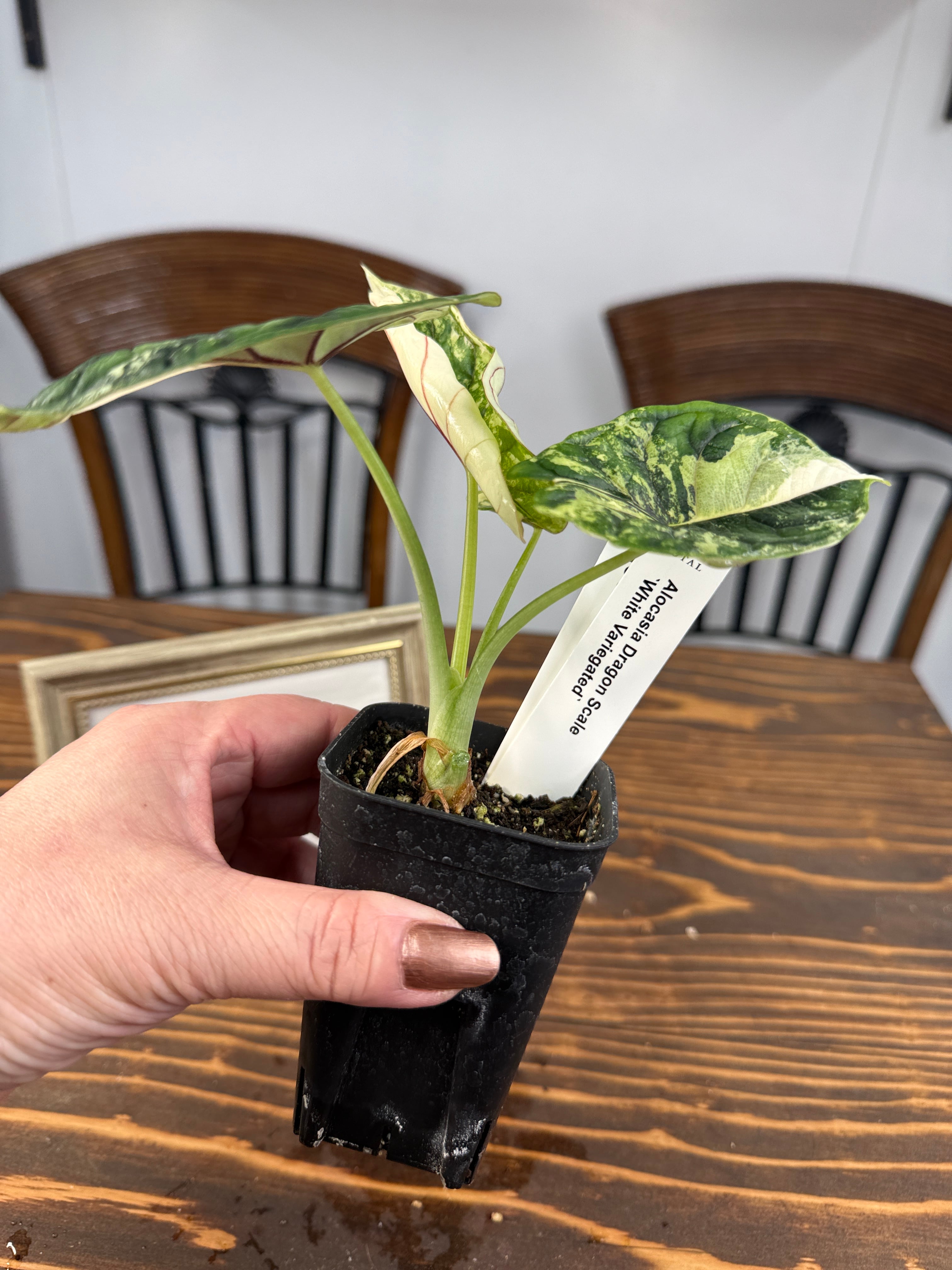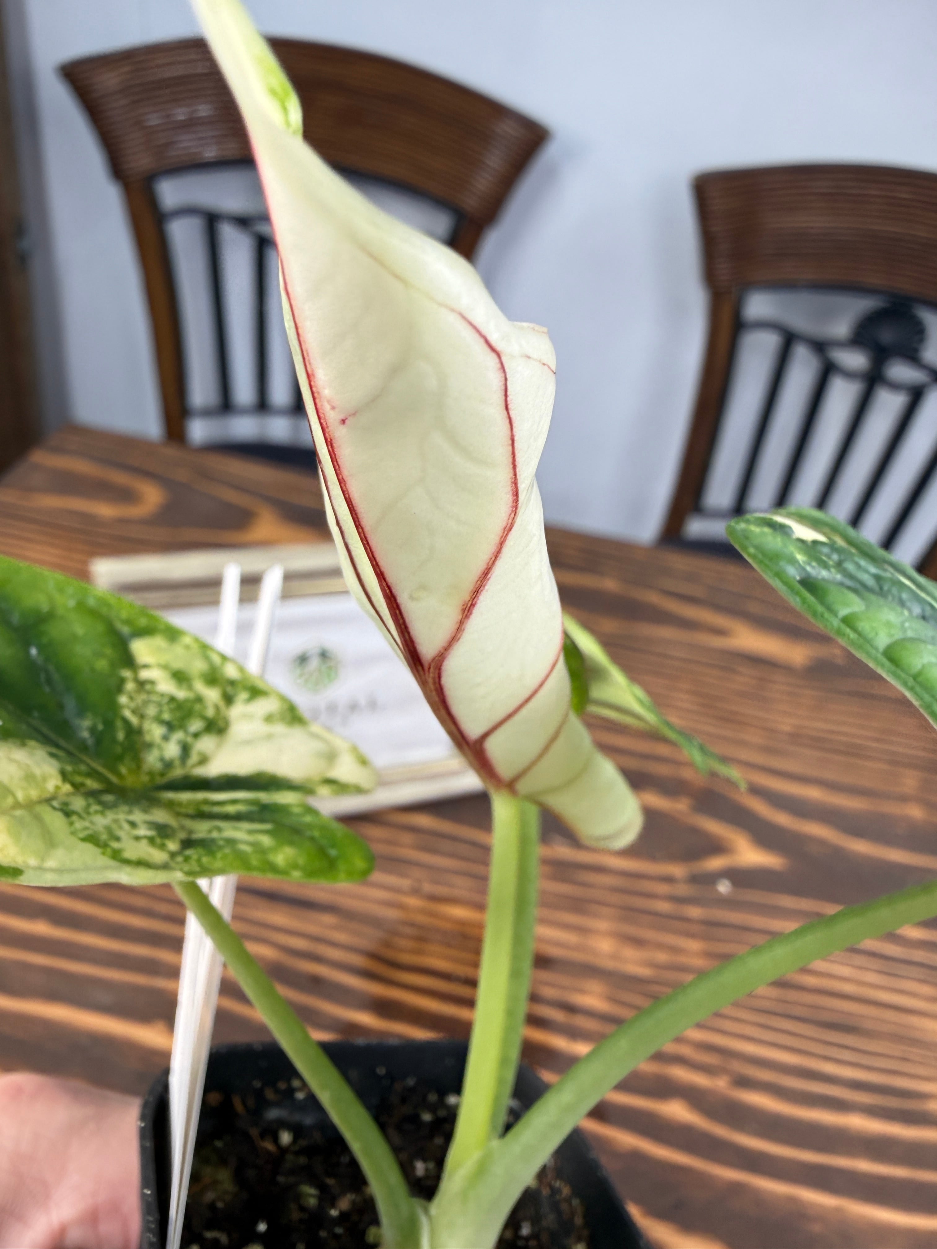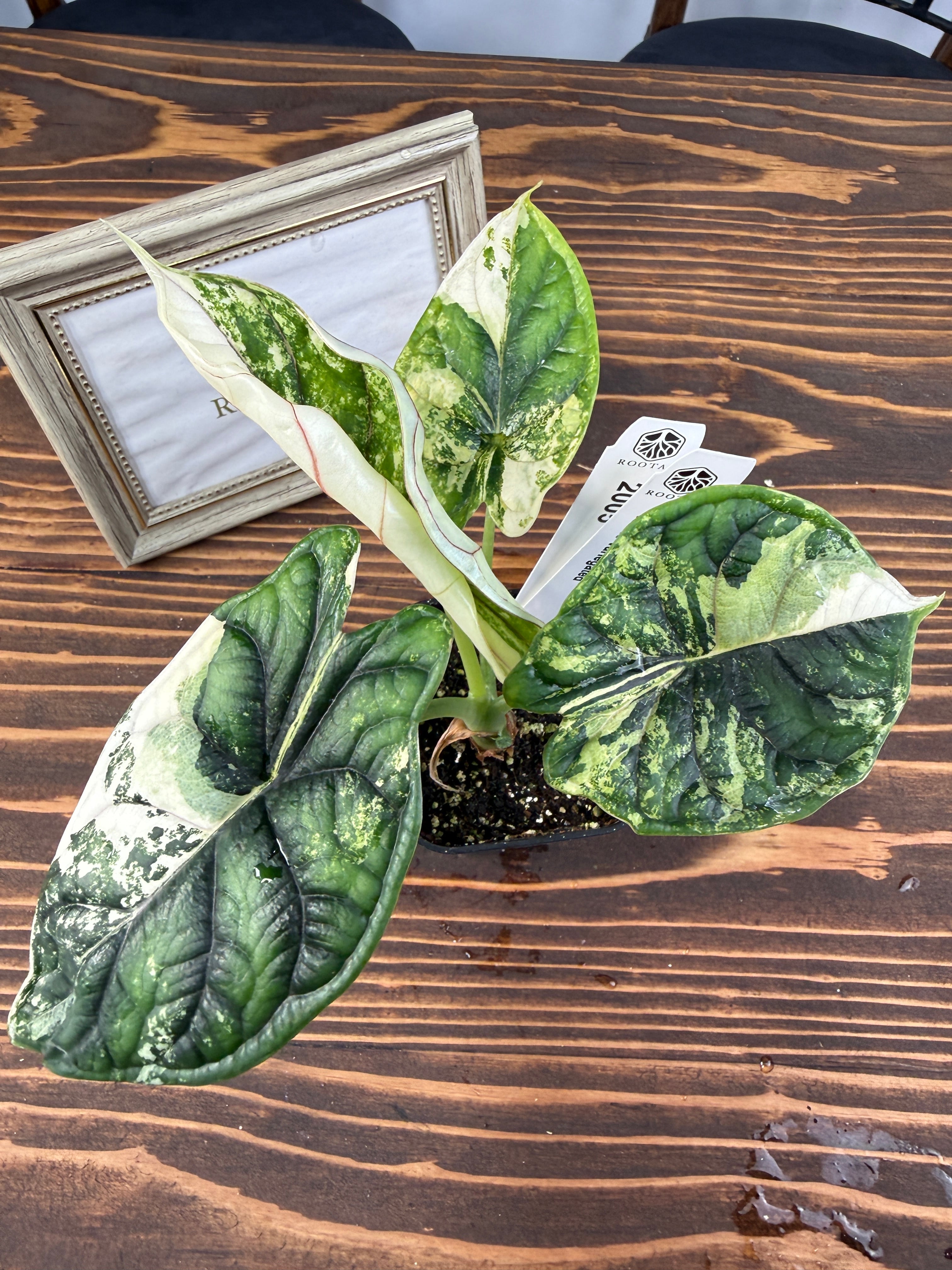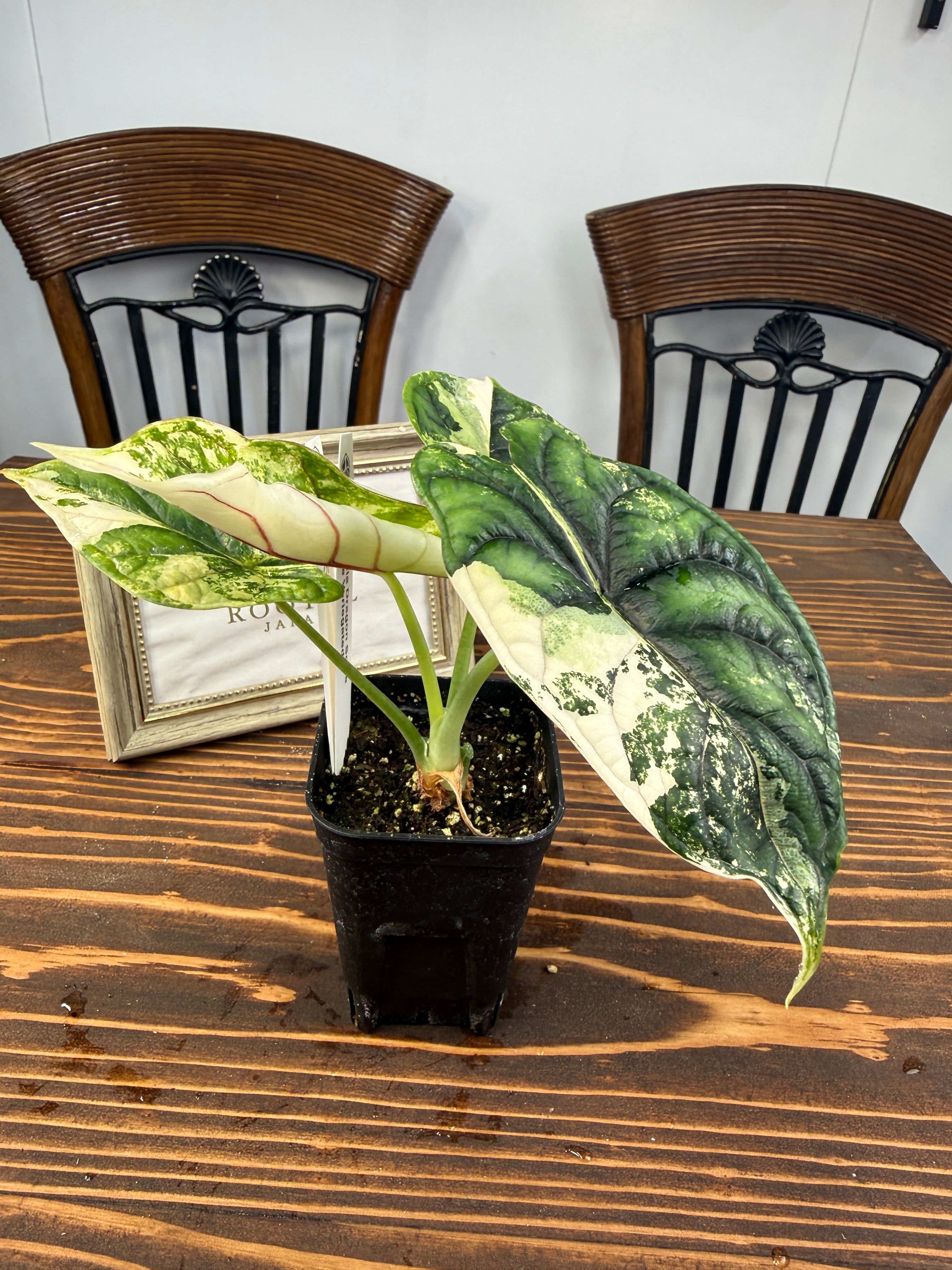 【超レア】アロカシア ドラゴンスケール ホワイトバリエガータは、そのユニークなドラゴンのような模様が特徴の観葉植物です!お部屋にエキゾチックな雰囲気を与え、心を豊かにすること間違いなしです。初心者の方でも育てやすい特性を持つので、ぜひこの貴重な植物をお迎えください。