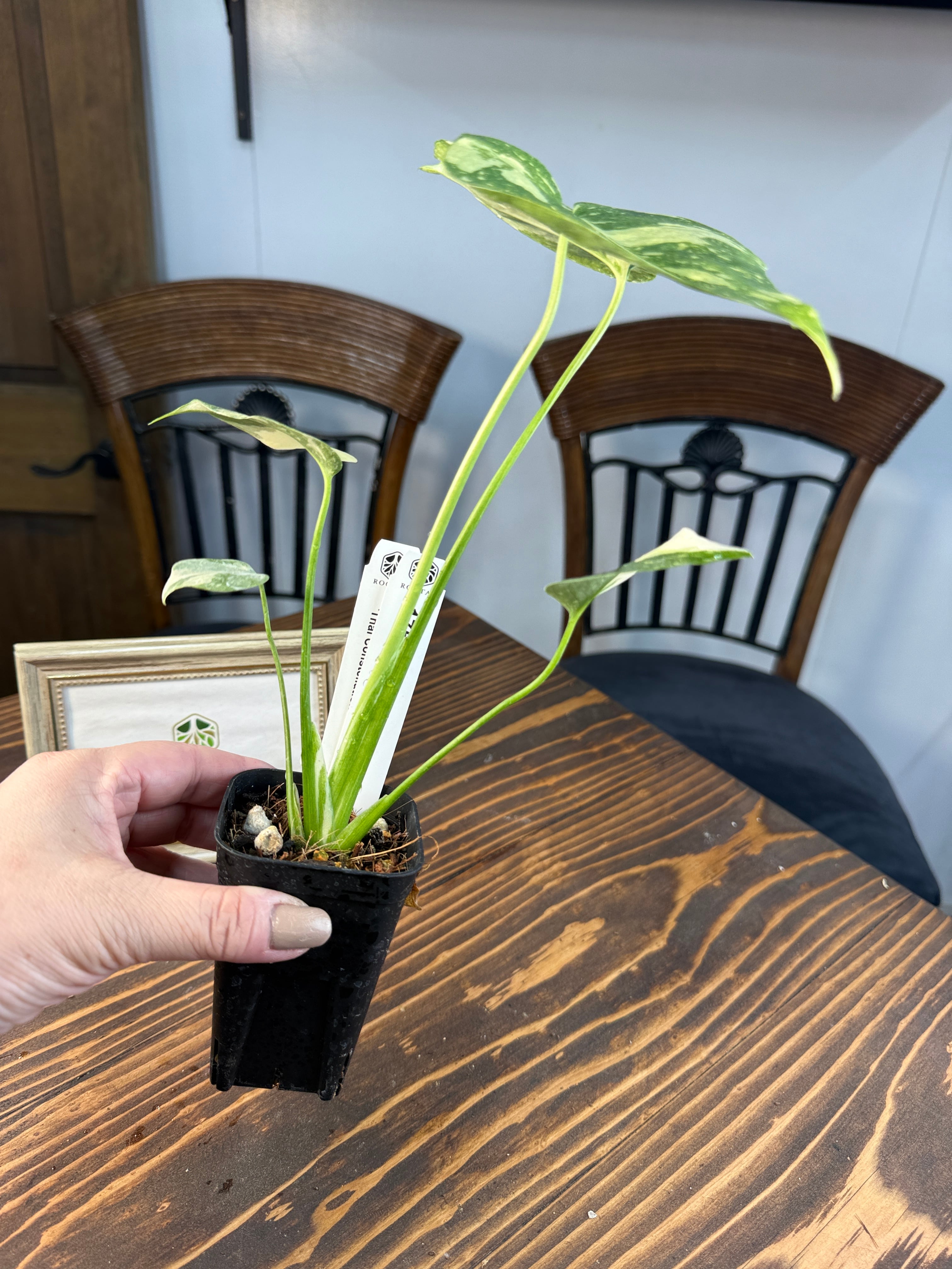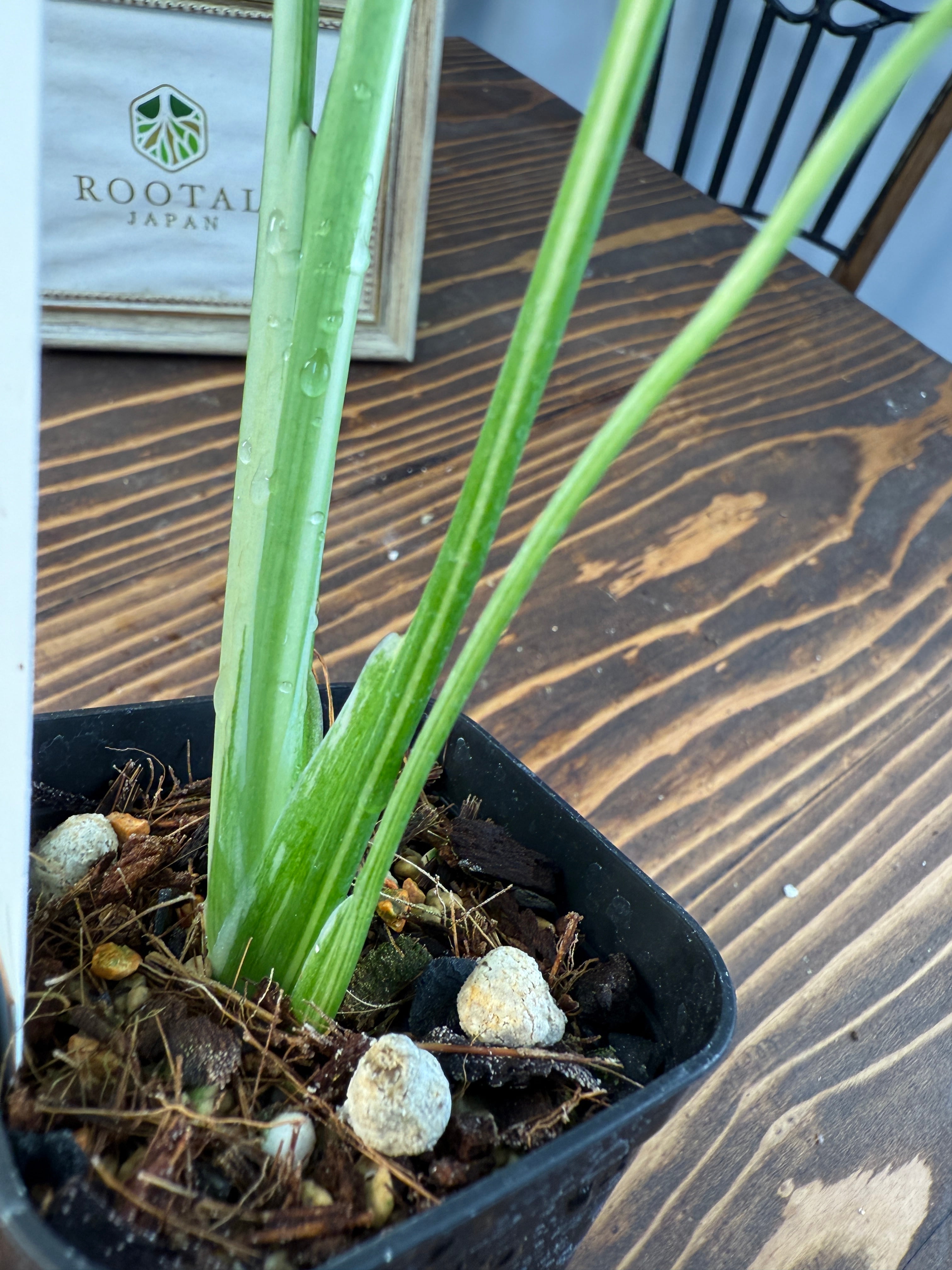 モンステラ デリシオーサ タイコンステレーションの葉は、ユニークなバリエガータが印象的で、成長段階によってその美しさが変わります。出荷時のサイズはおおよそ20㎝程度で、かわいらしいベビー苗をお届けいたします。