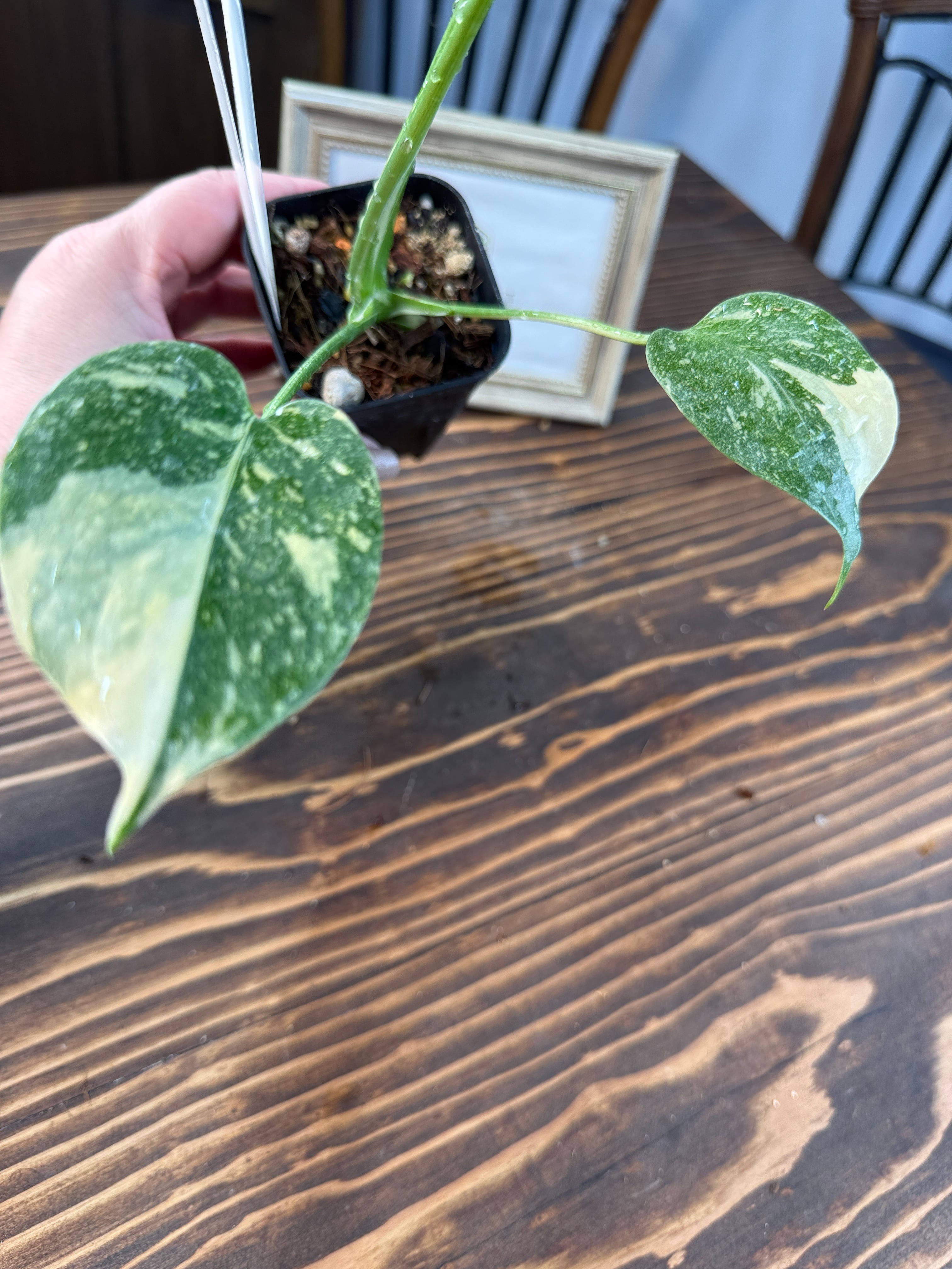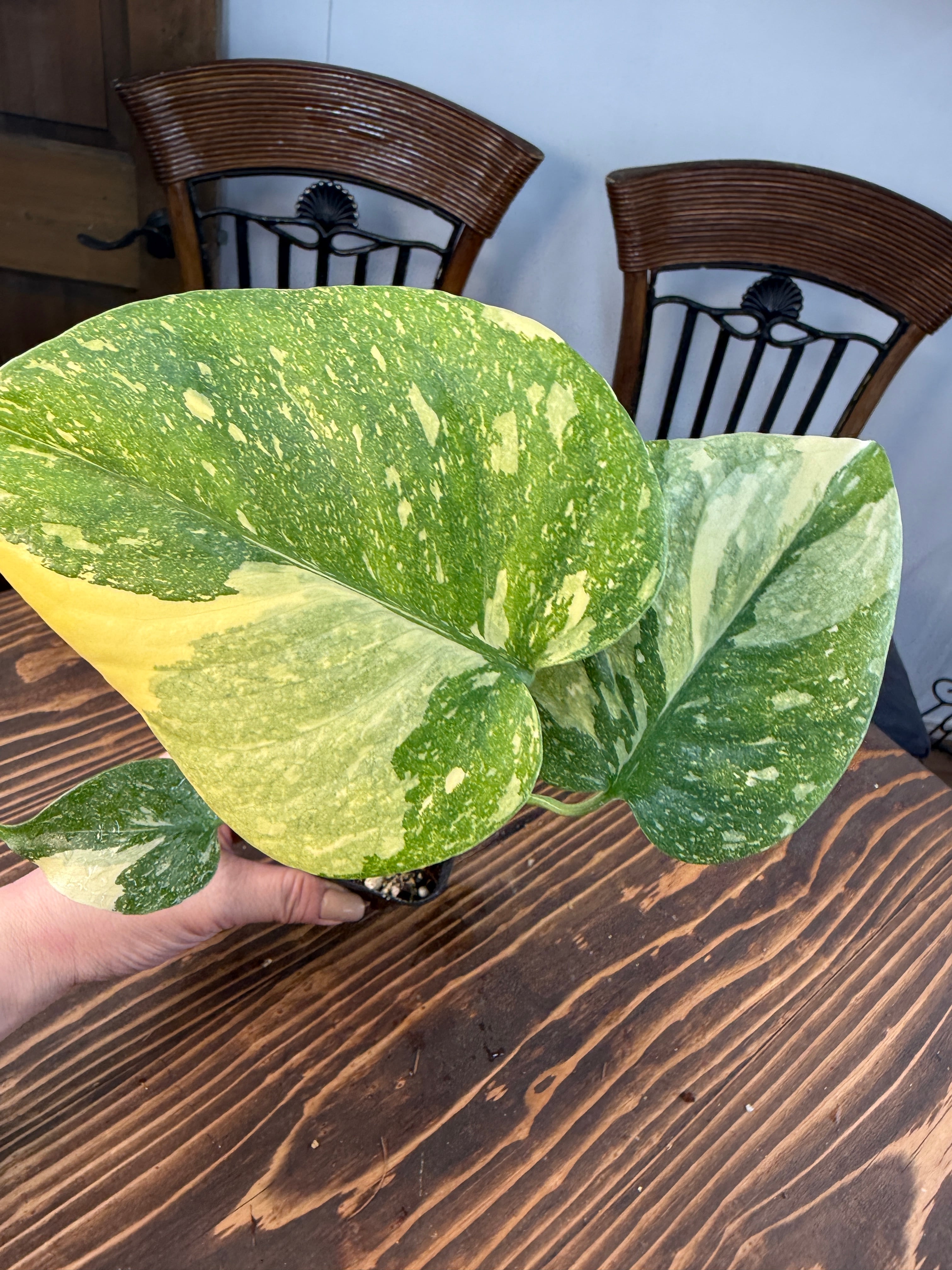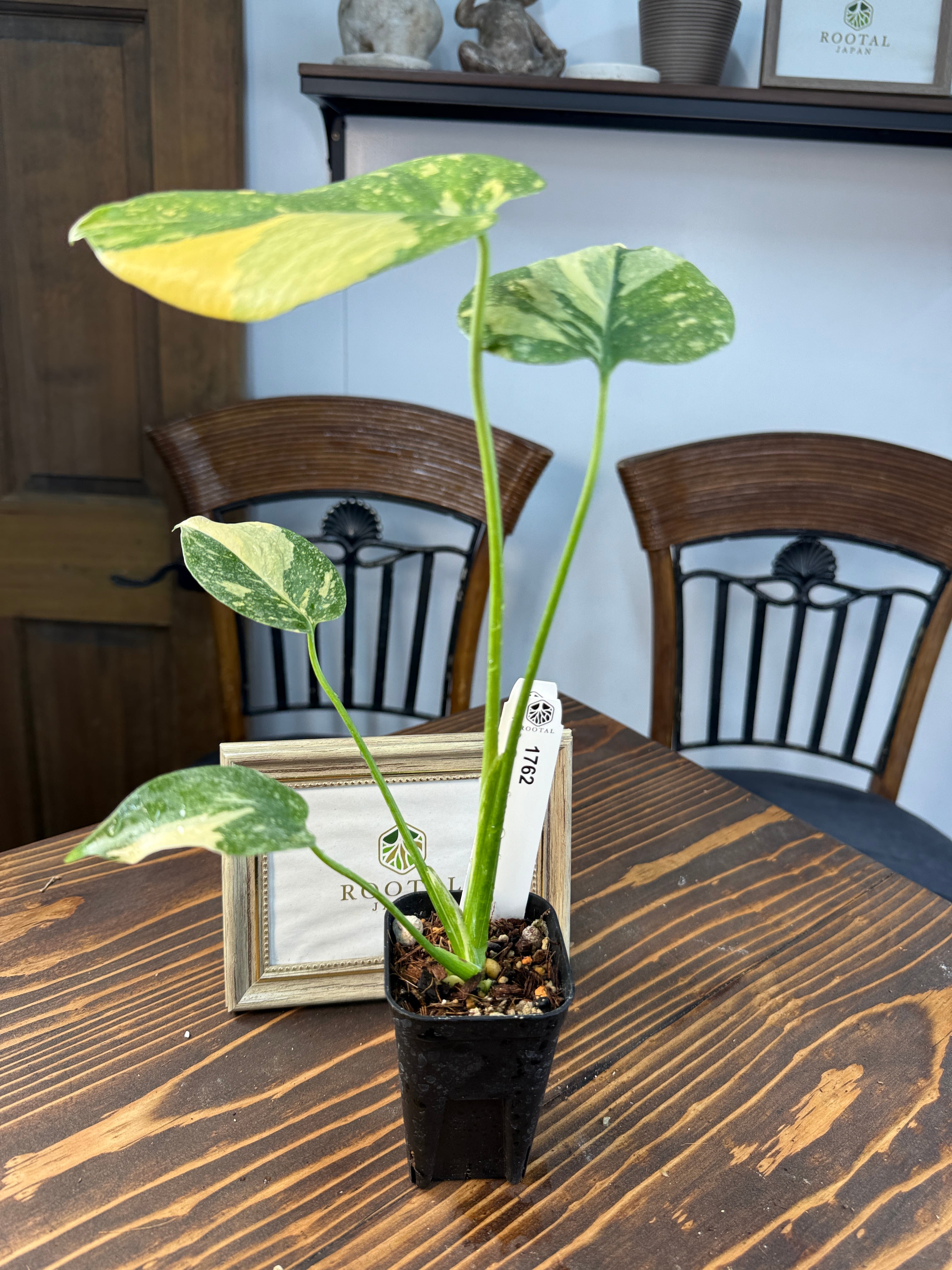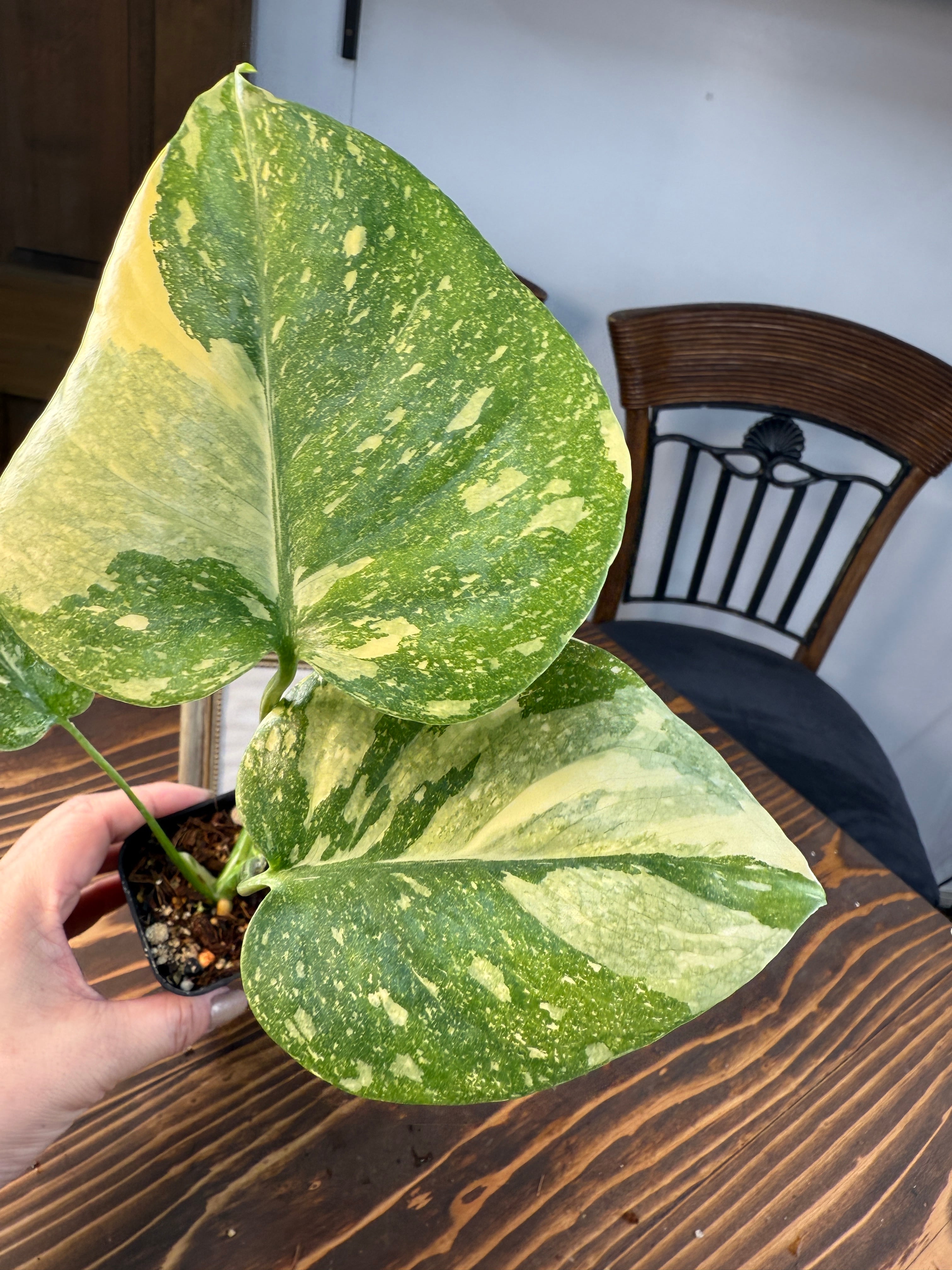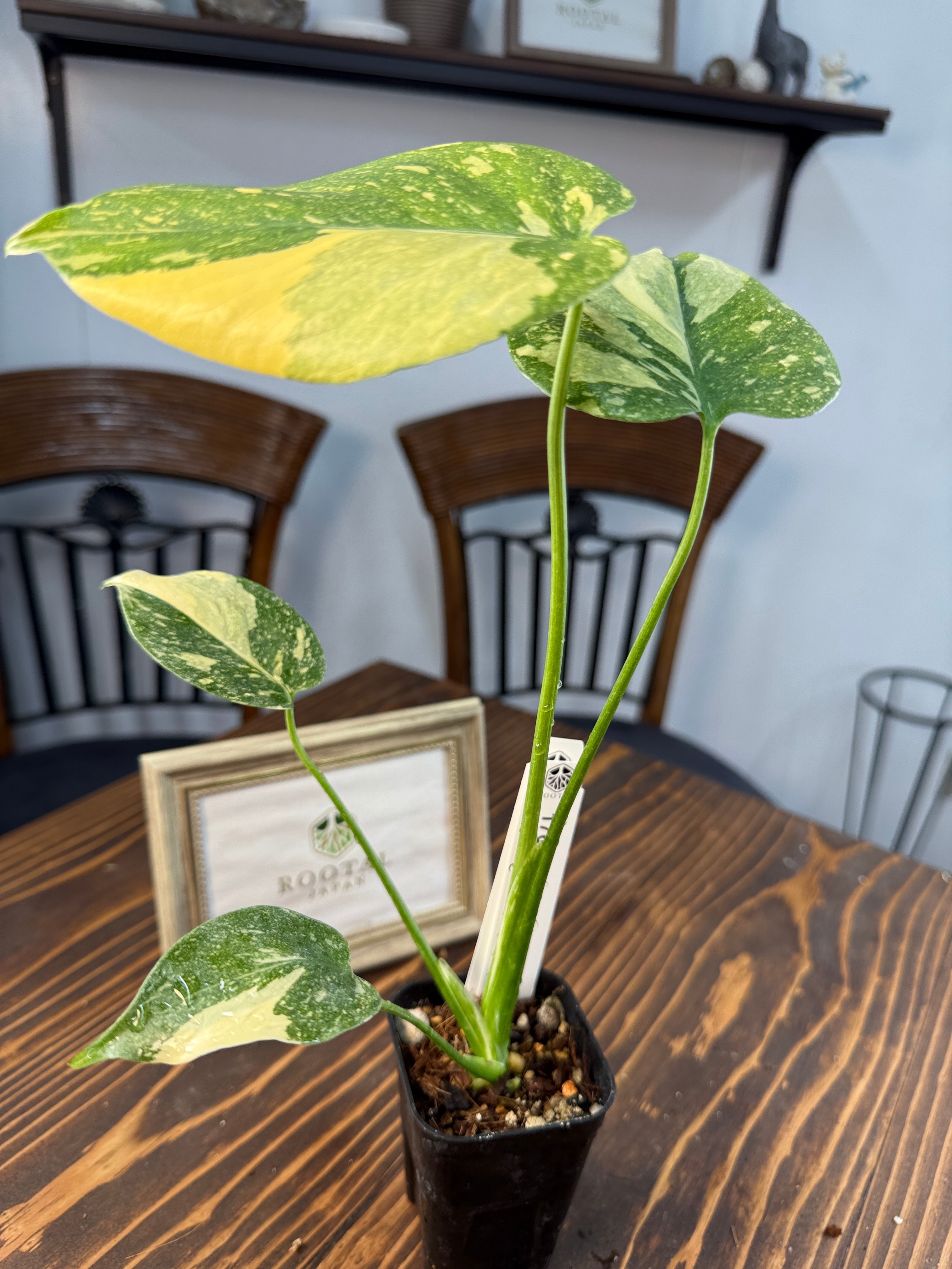 モンステラ デリシオーサ タイコンステレーションの葉は、ユニークなバリエガータが印象的で、成長段階によってその美しさが変わります。出荷時のサイズはおおよそ20㎝程度で、かわいらしいベビー苗をお届けいたします。