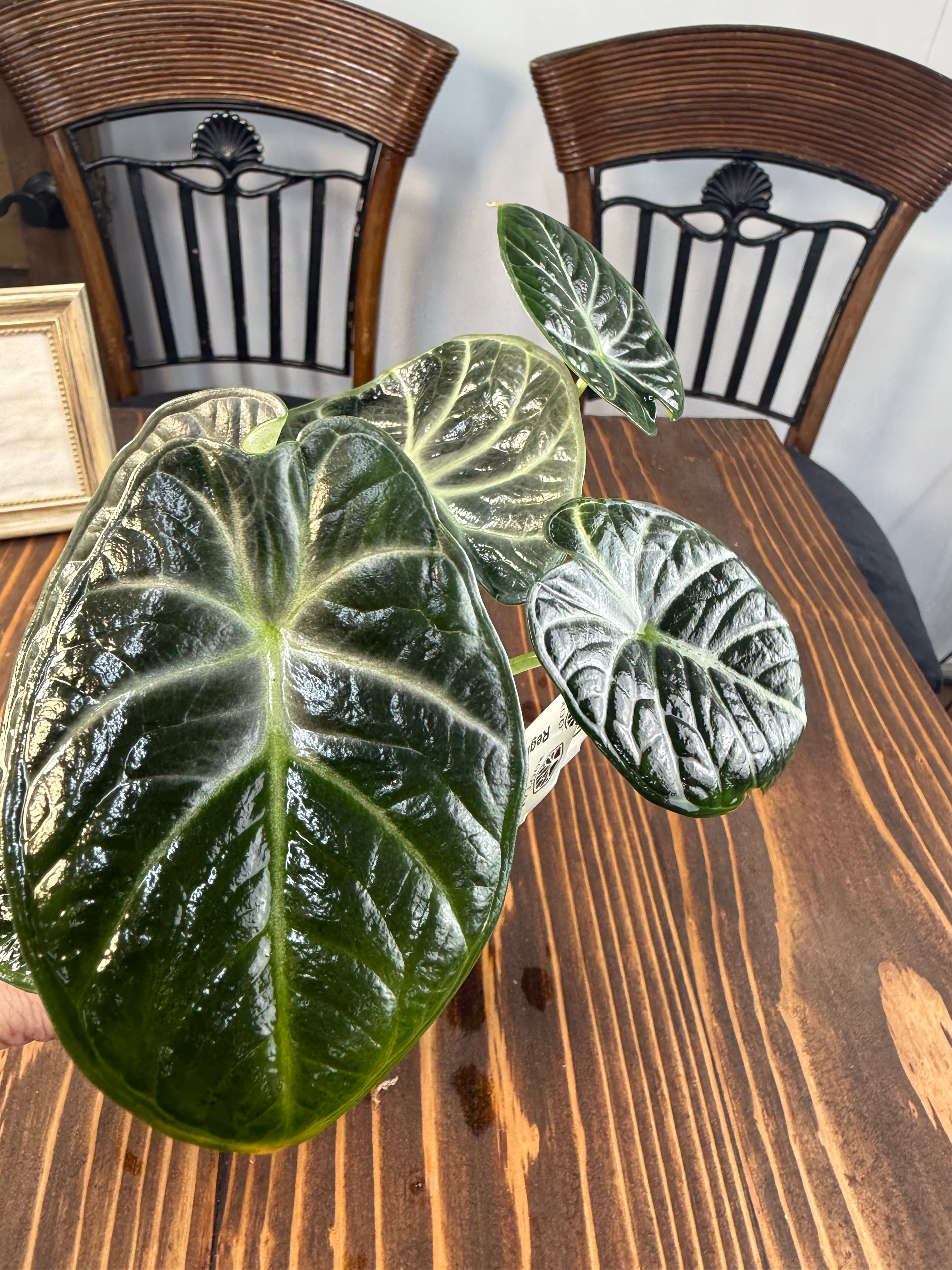 アロカシア レギヌラ ニンジャは、独自のディープグリーンの葉と、エキゾチックな形状が特徴の観葉植物です。このユニークなデザインは、見る人をひきつけ、空間にエレガントな雰囲気をもたらします!明るい間接光のもとで育成することで、その美しさがより一層際立ち、インテリアに鮮やかなアクセントを与えます。