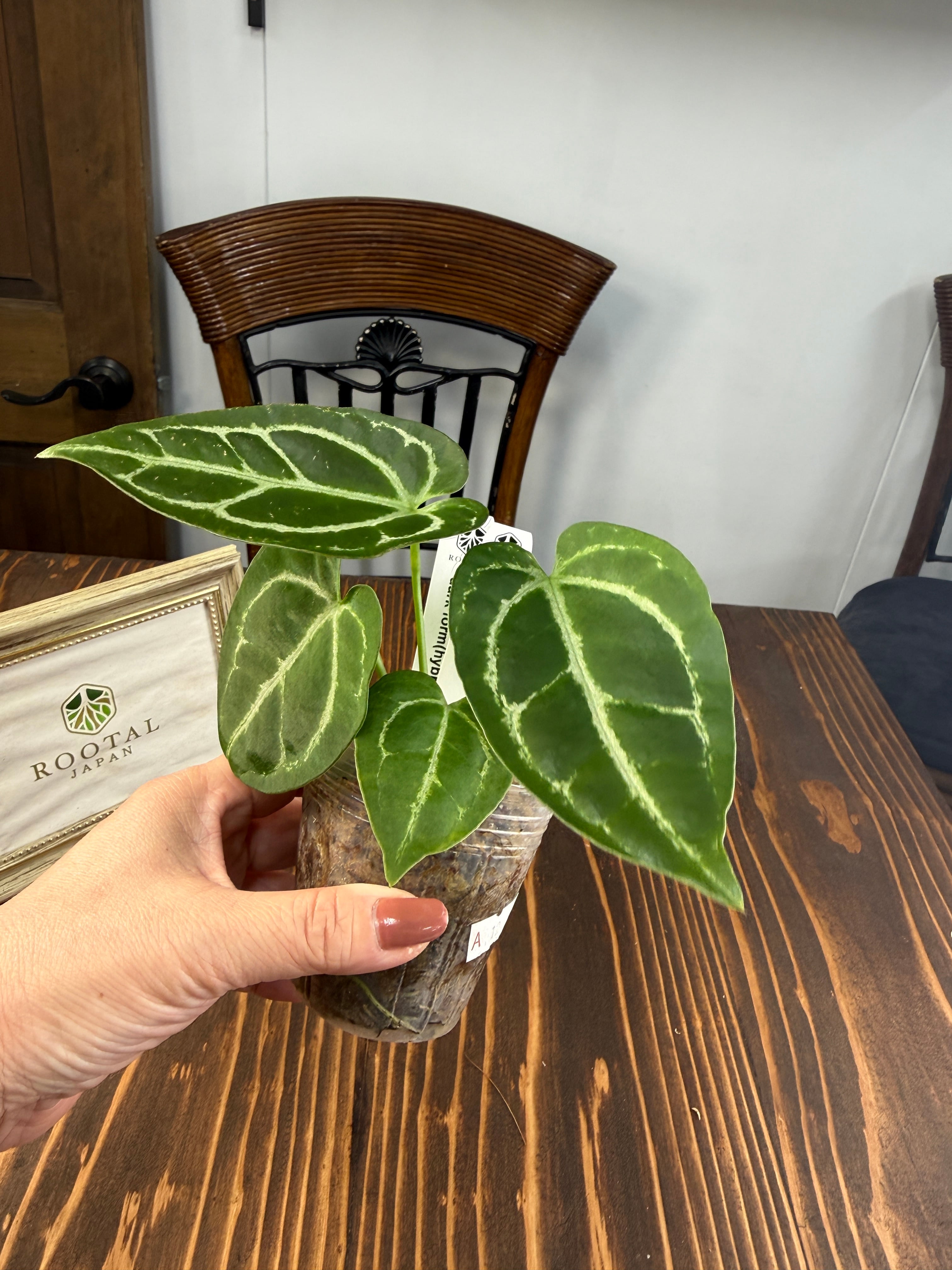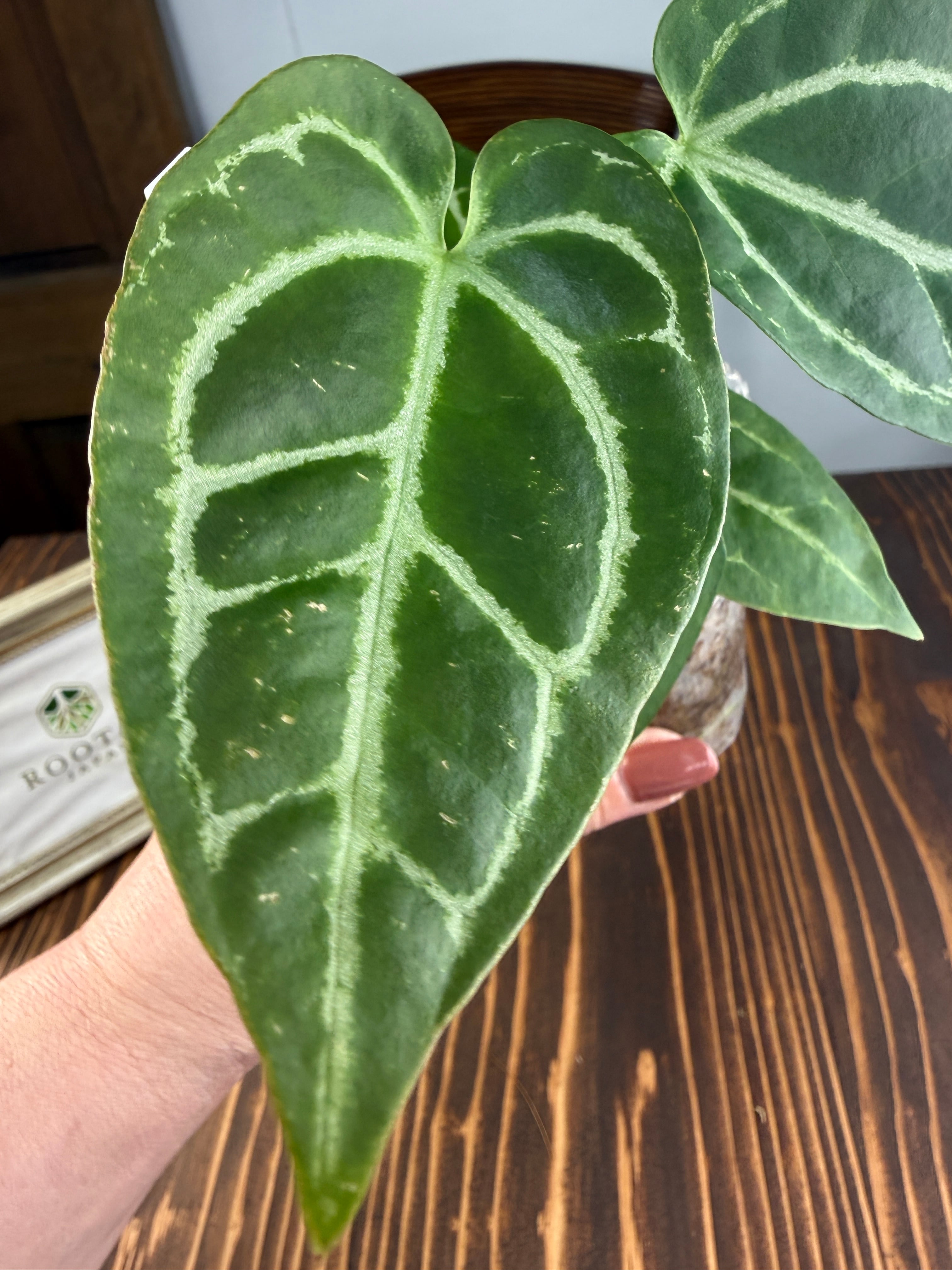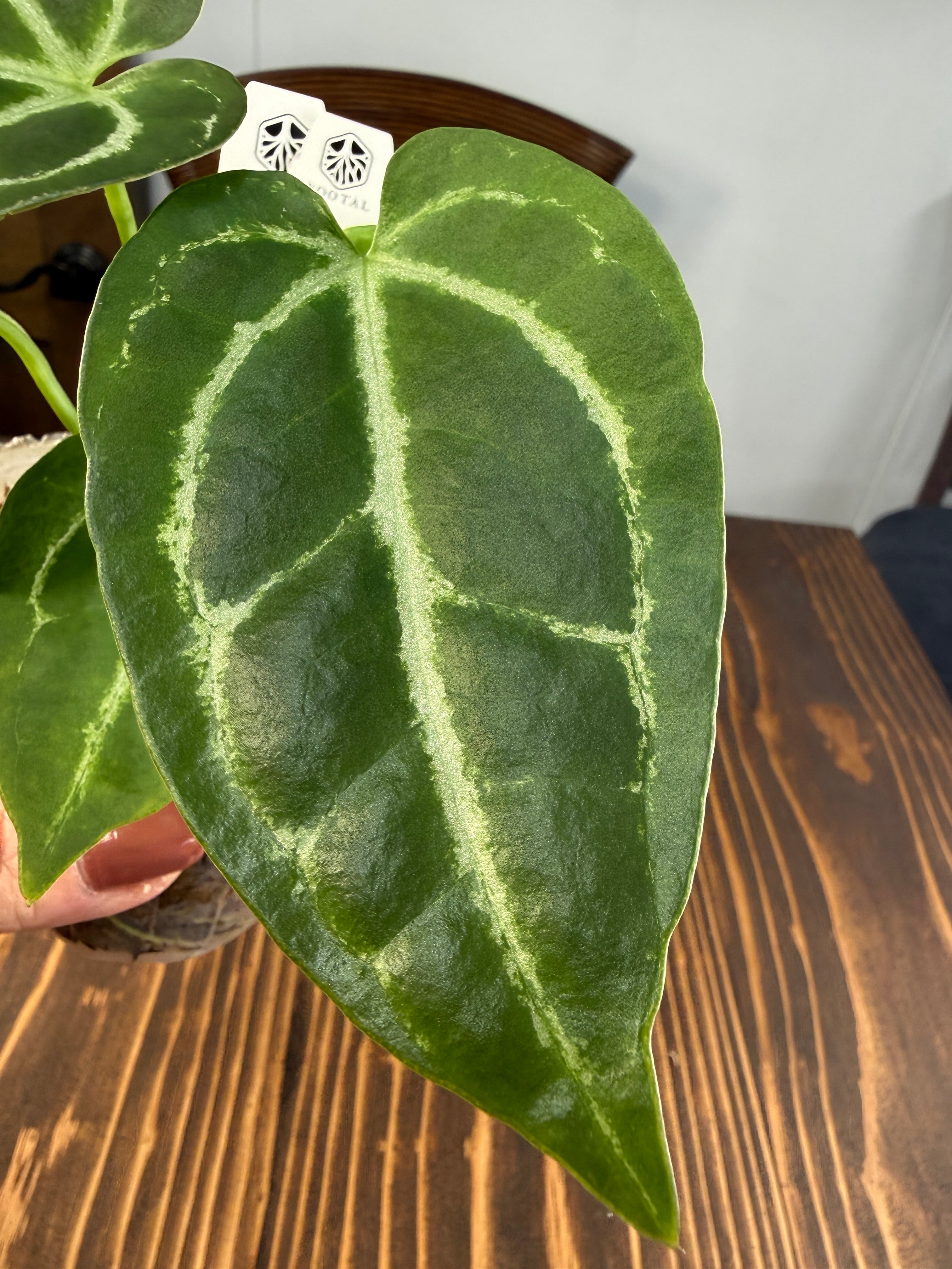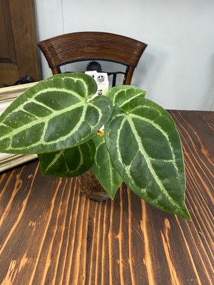 アンスリウム クリスタリナムダークフォームは、深い黒緑の葉と見事な葉脈が特徴で、どんなインテリアにも洗練された雰囲気をもたらします。見るほどにその美しさに引き込まれることでしょう。手入れを行うことで、より一層その魅力が引き立ち、成長を楽しむことができる植物です!