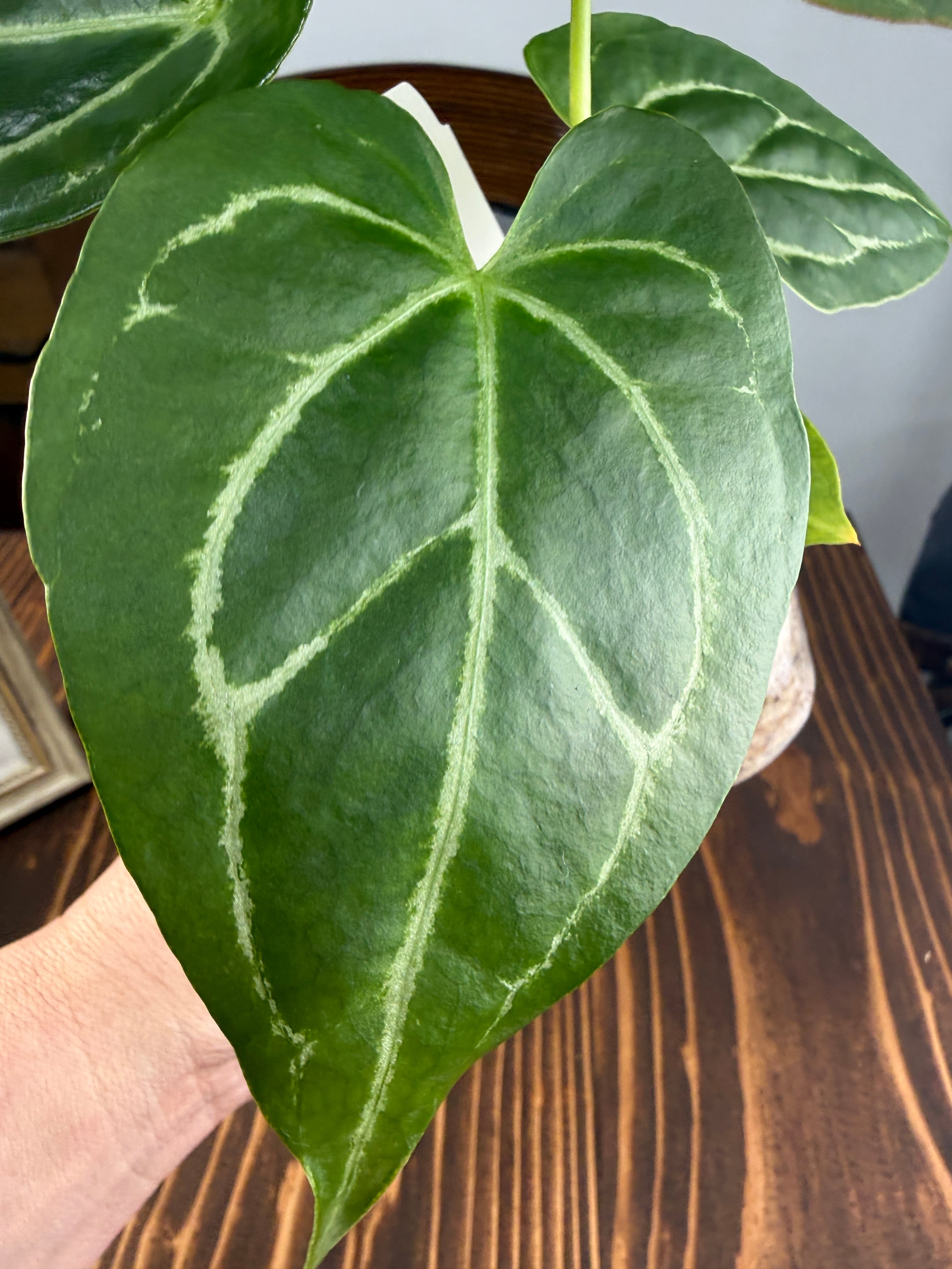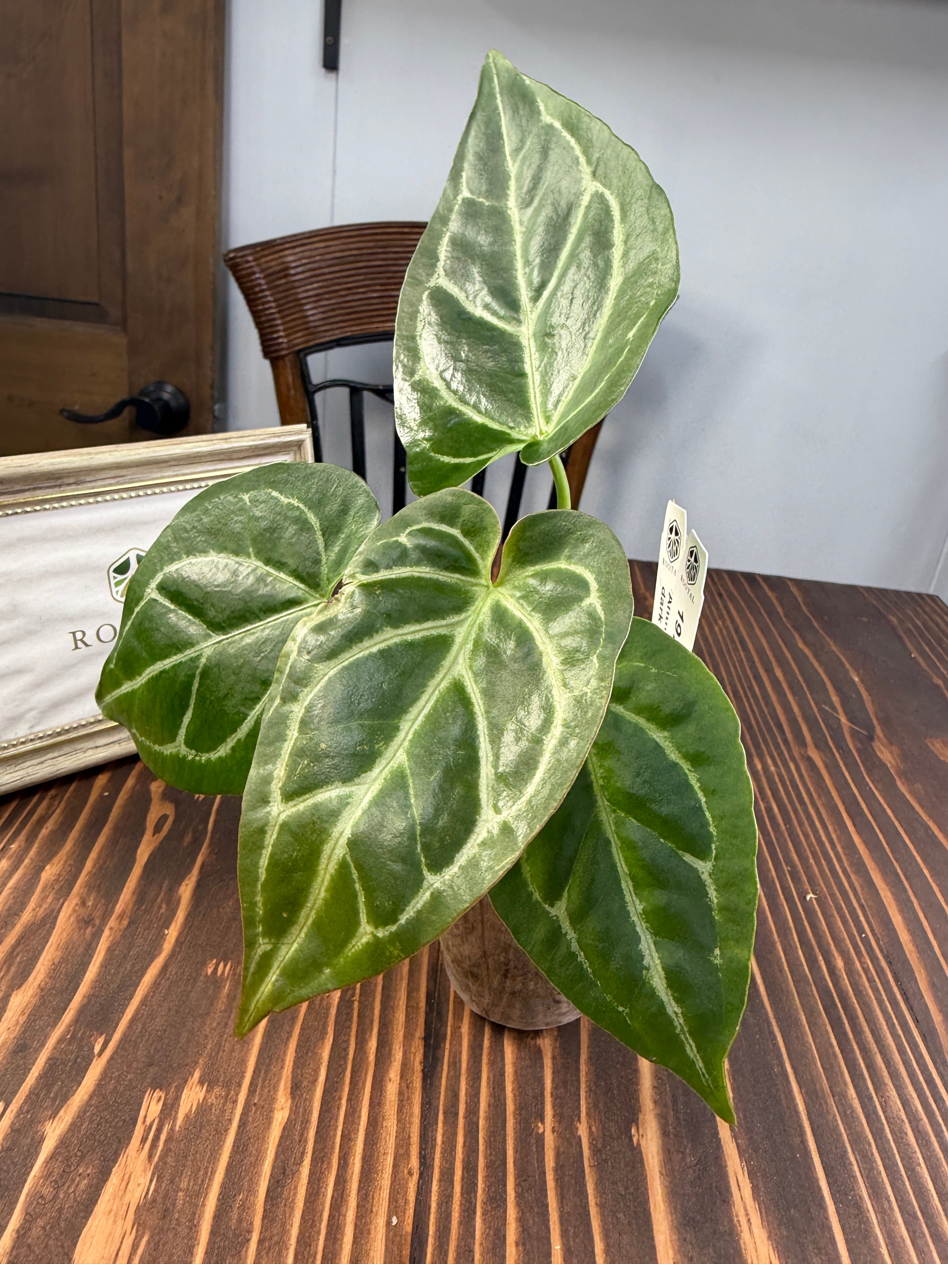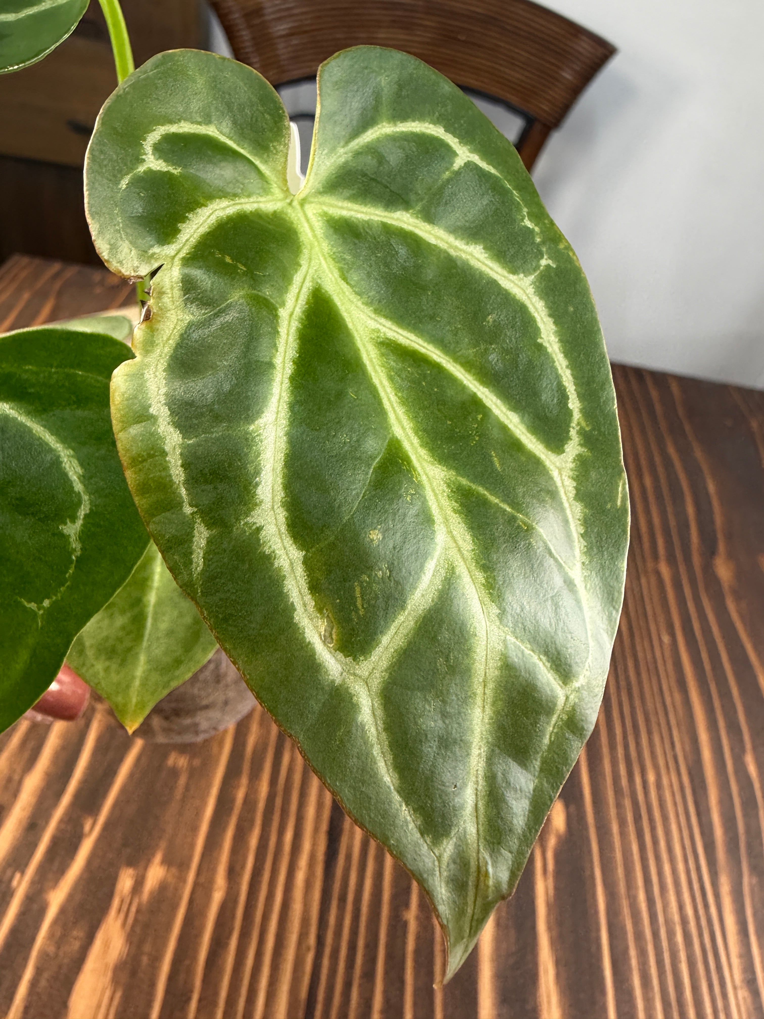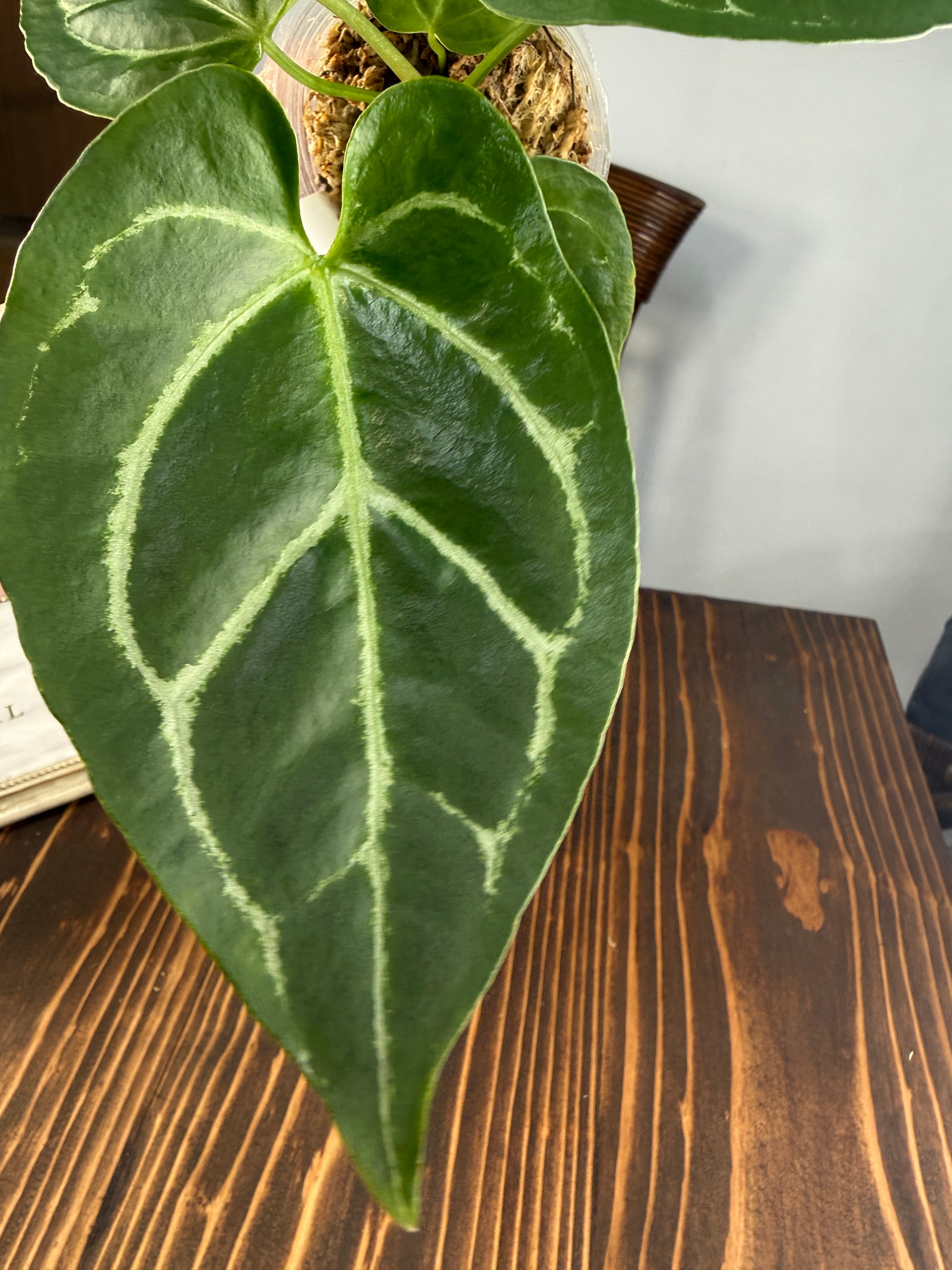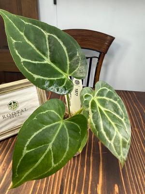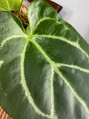 アンスリウム クリスタリナムダークフォームは、深い黒緑の葉と見事な葉脈が特徴で、どんなインテリアにも洗練された雰囲気をもたらします。見るほどにその美しさに引き込まれることでしょう。手入れを行うことで、より一層その魅力が引き立ち、成長を楽しむことができる植物です!
