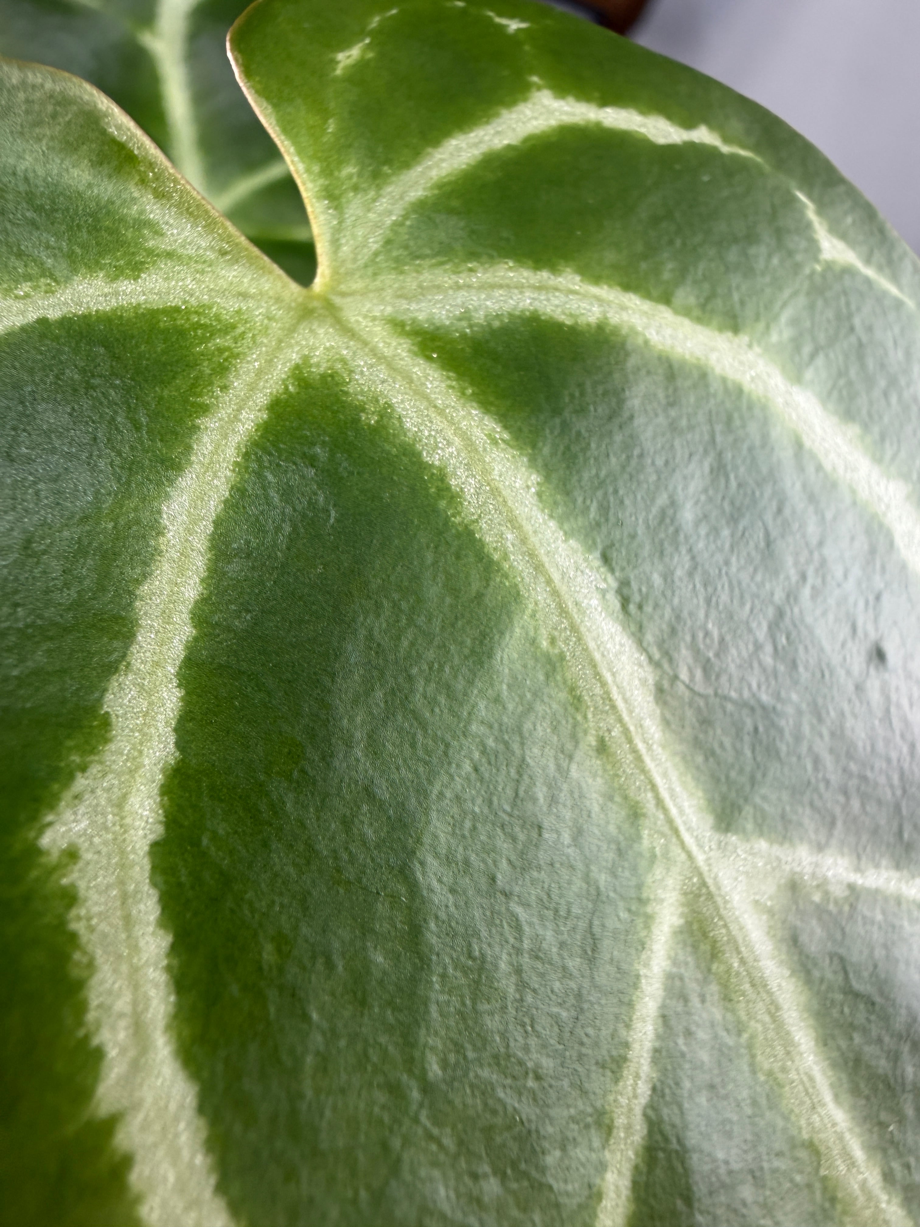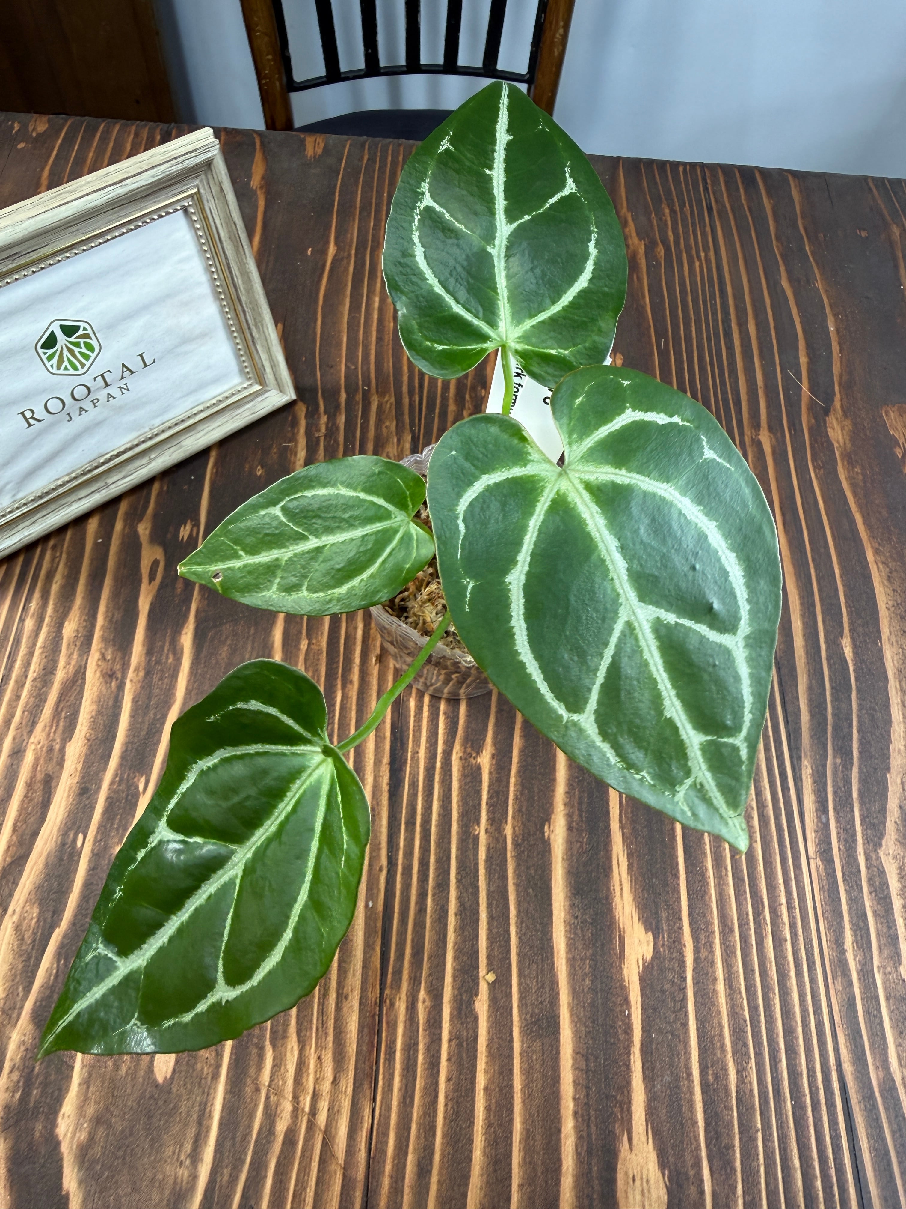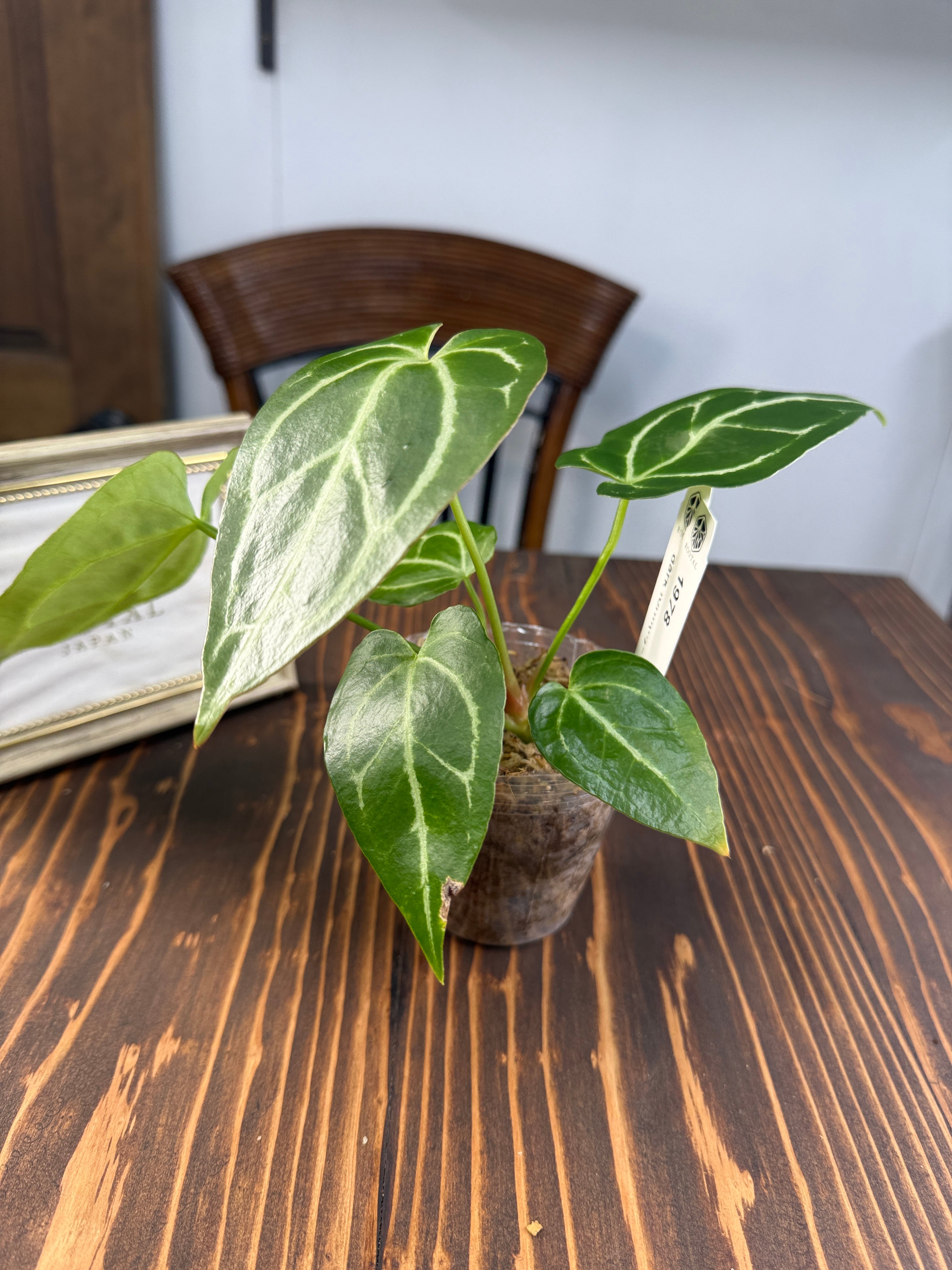 アンスリウム クリスタリナムダークフォームは、深い黒緑の葉と見事な葉脈が特徴で、どんなインテリアにも洗練された雰囲気をもたらします。見るほどにその美しさに引き込まれることでしょう。手入れを行うことで、より一層その魅力が引き立ち、成長を楽しむことができる植物です!