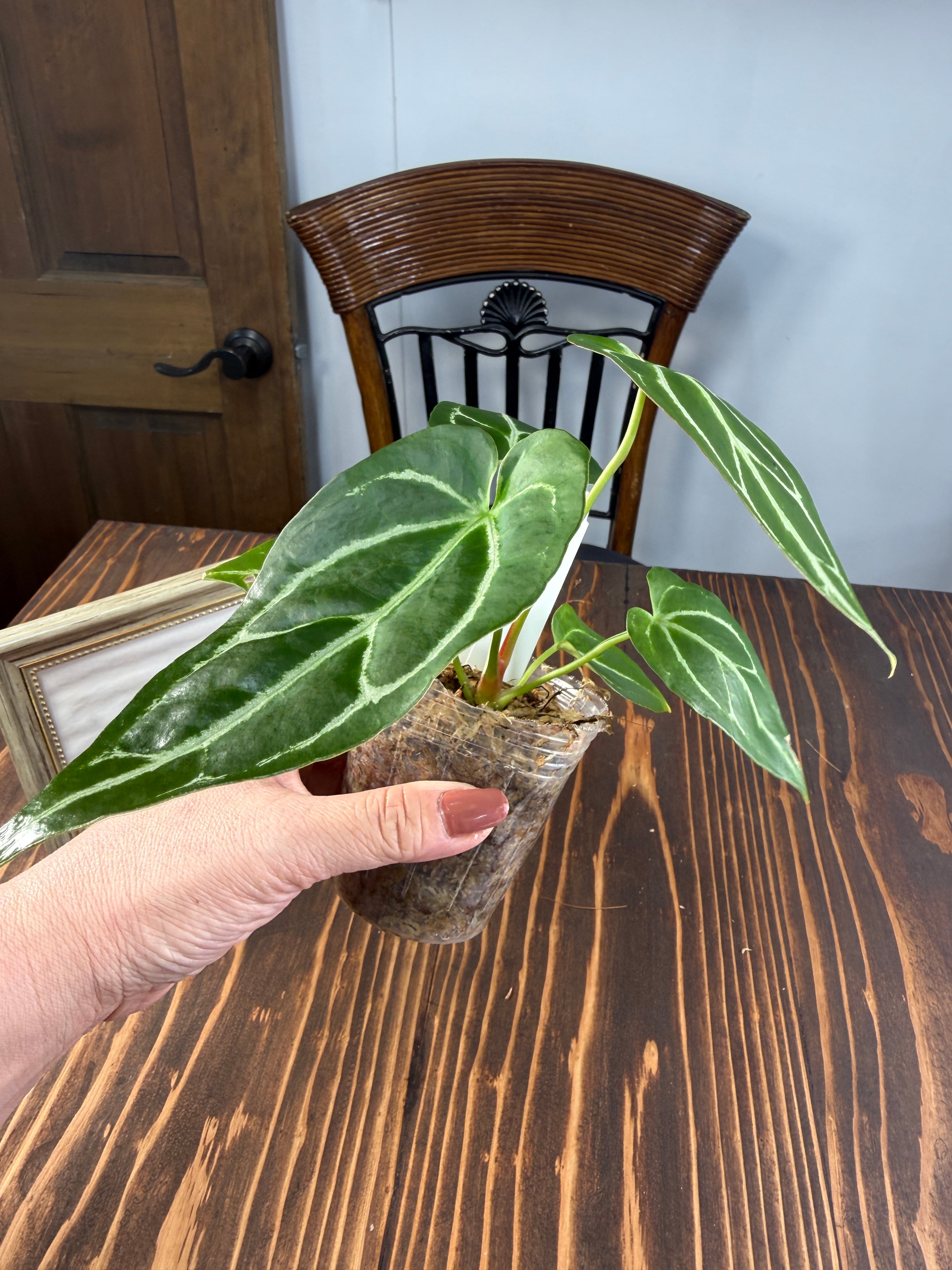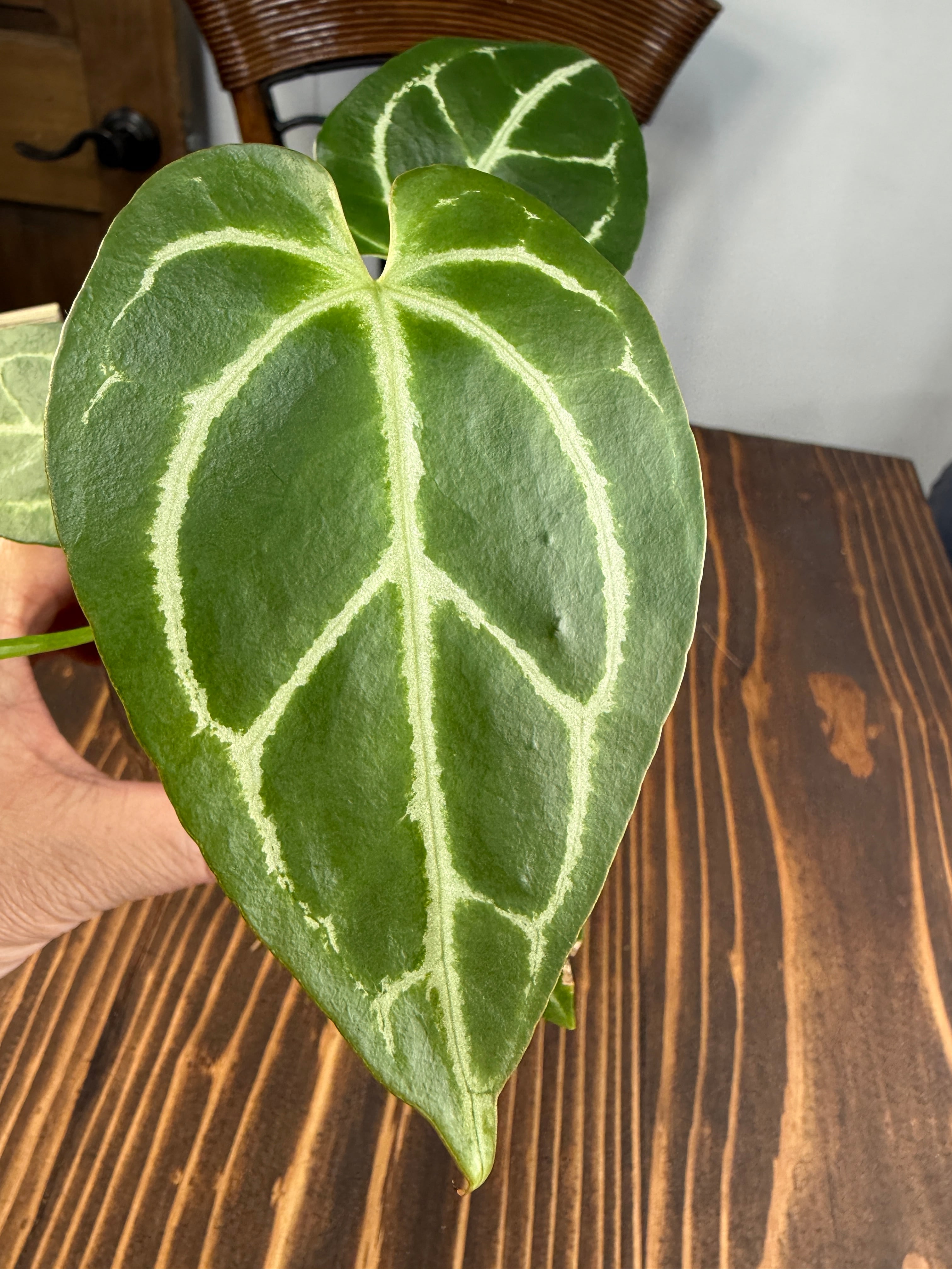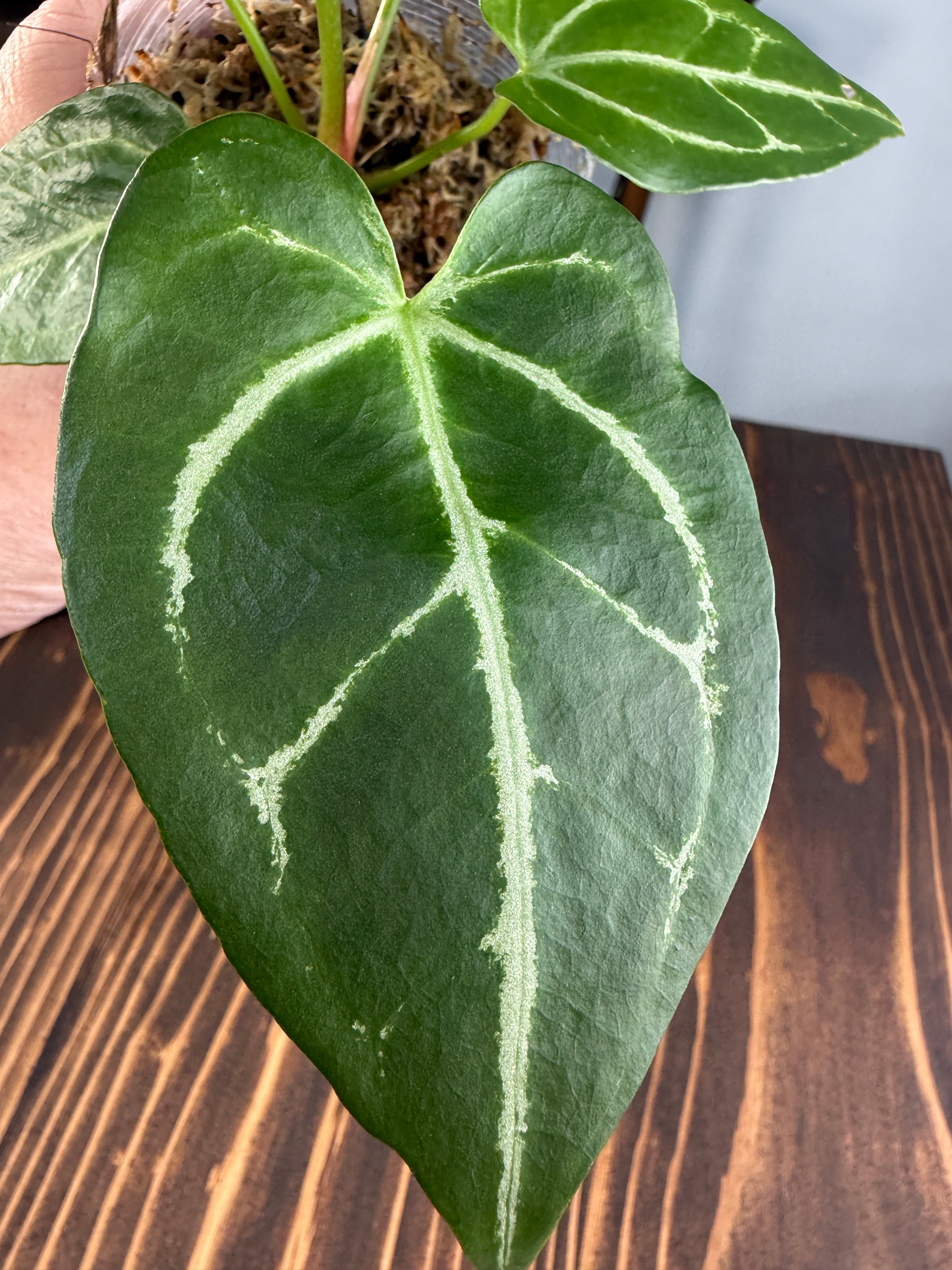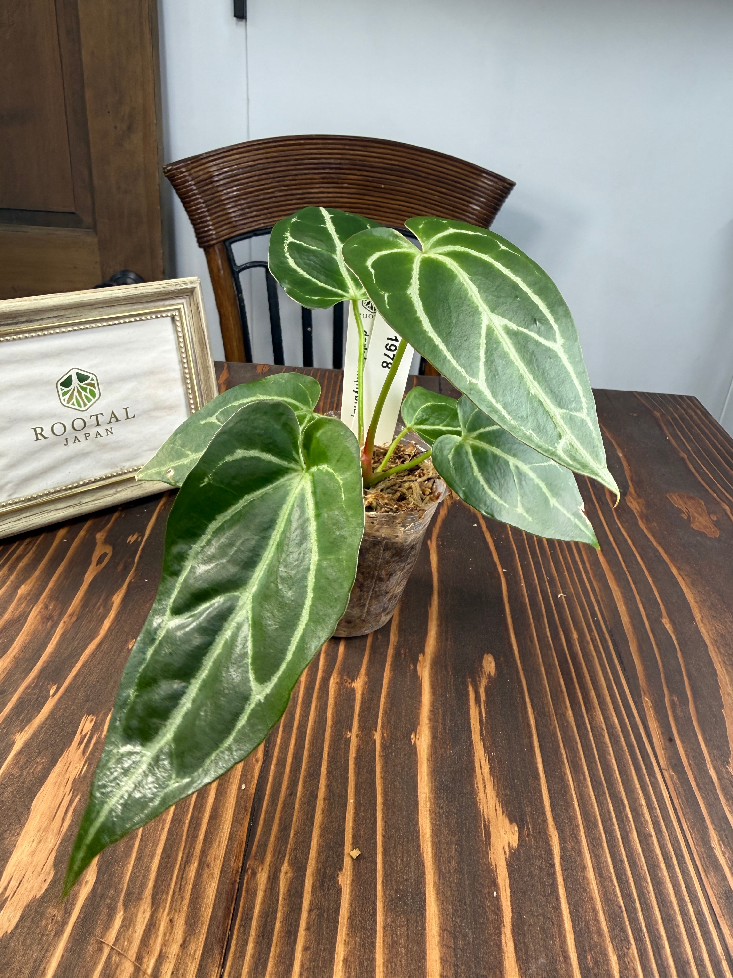 アンスリウム クリスタリナムダークフォームは、深い黒緑の葉と見事な葉脈が特徴で、どんなインテリアにも洗練された雰囲気をもたらします。見るほどにその美しさに引き込まれることでしょう。手入れを行うことで、より一層その魅力が引き立ち、成長を楽しむことができる植物です!