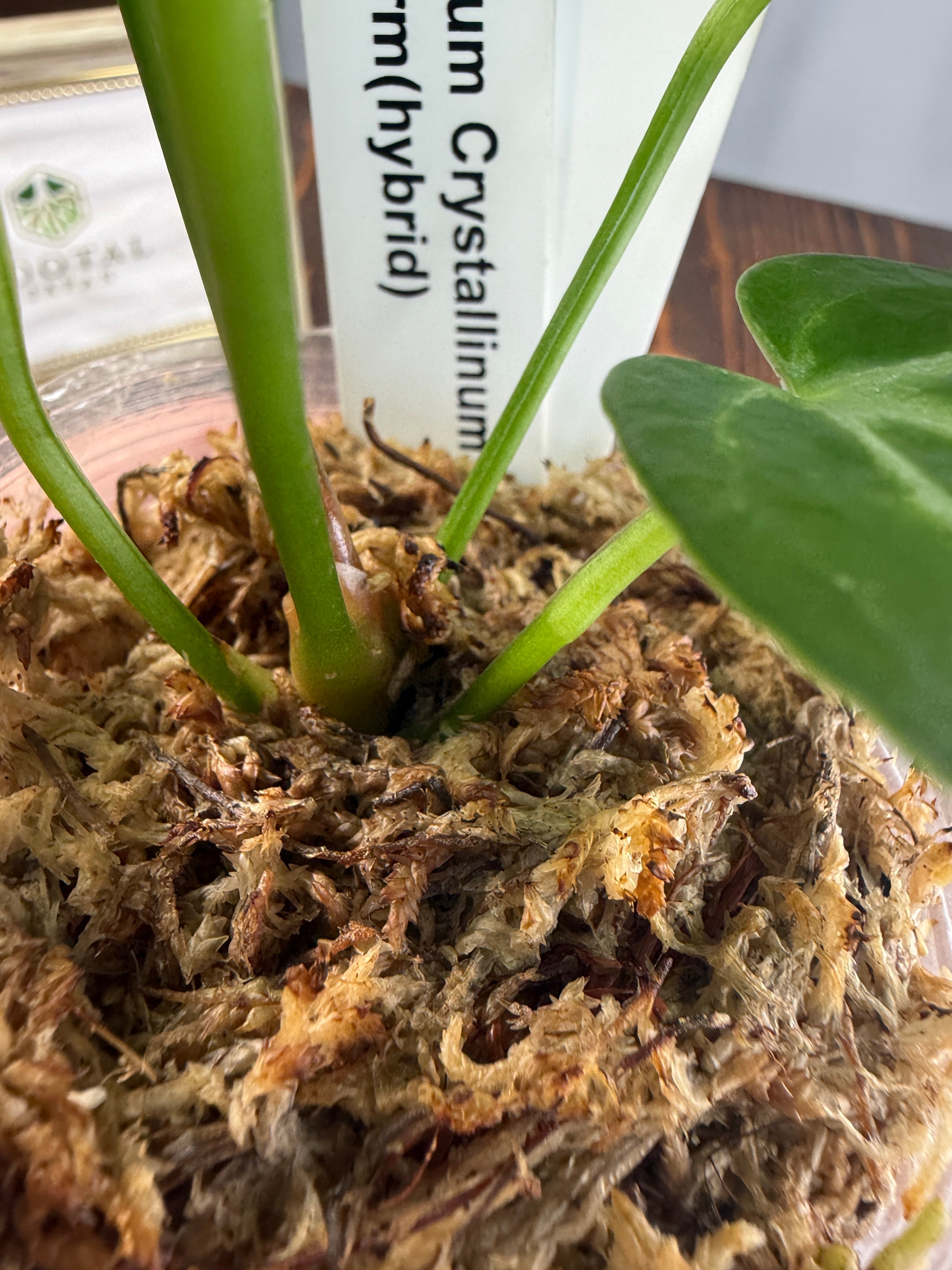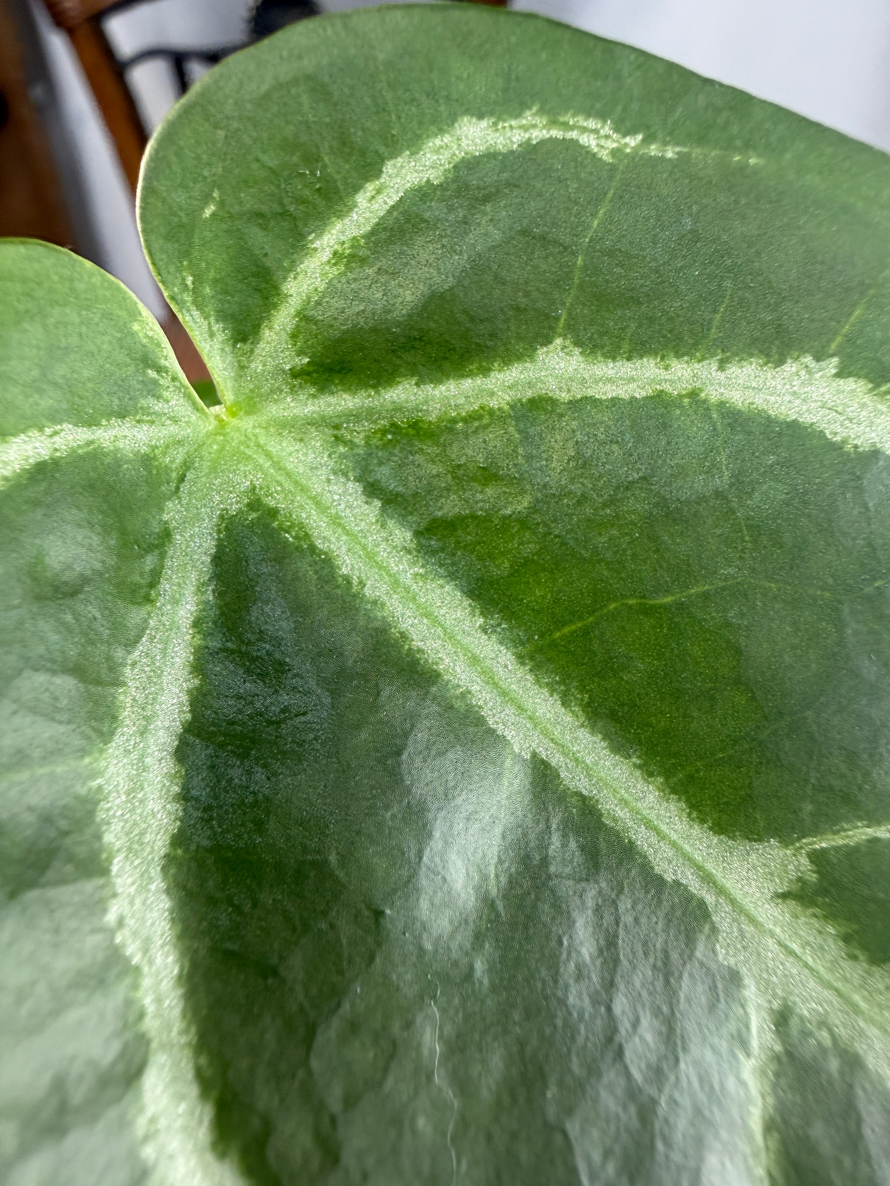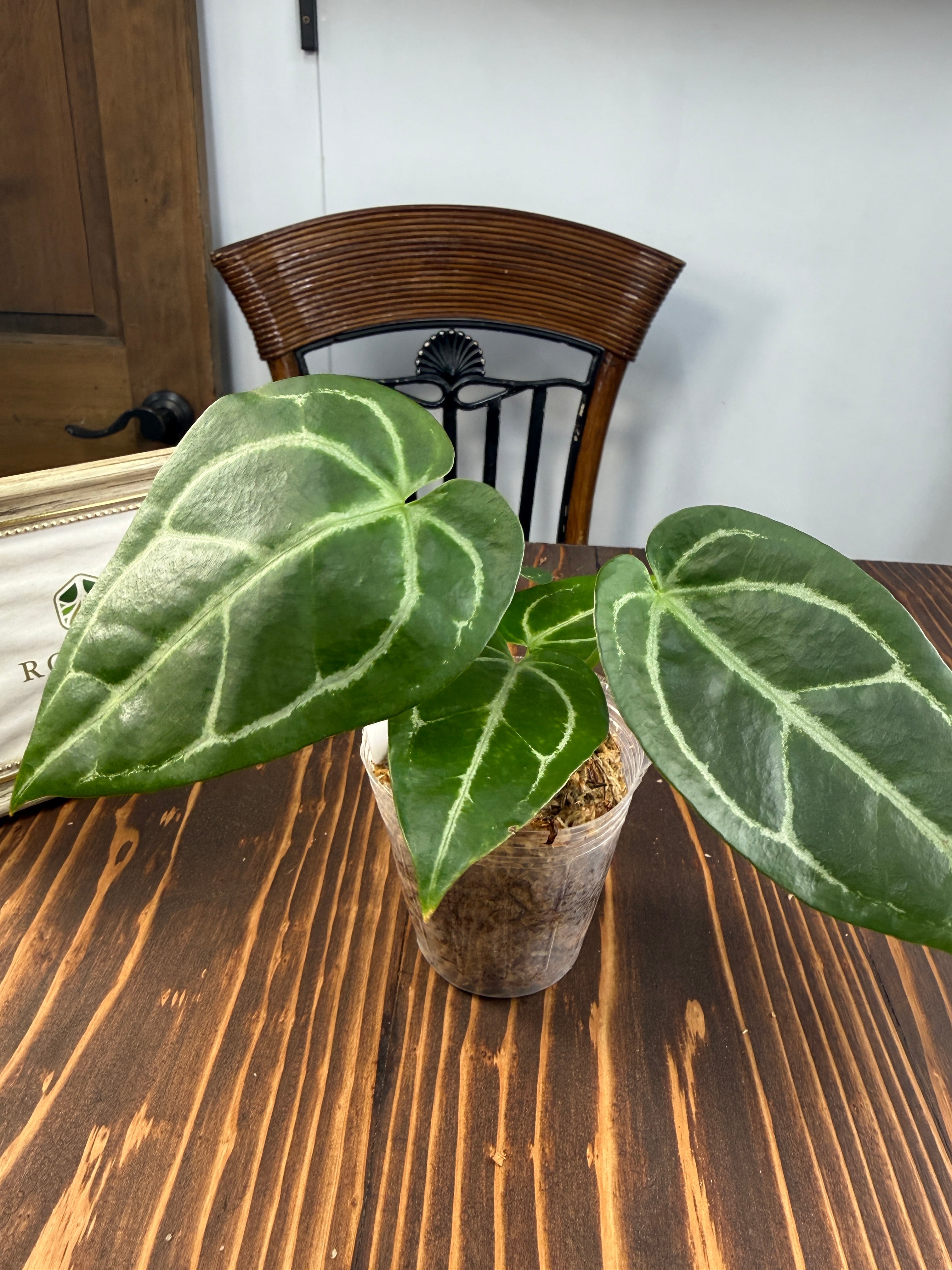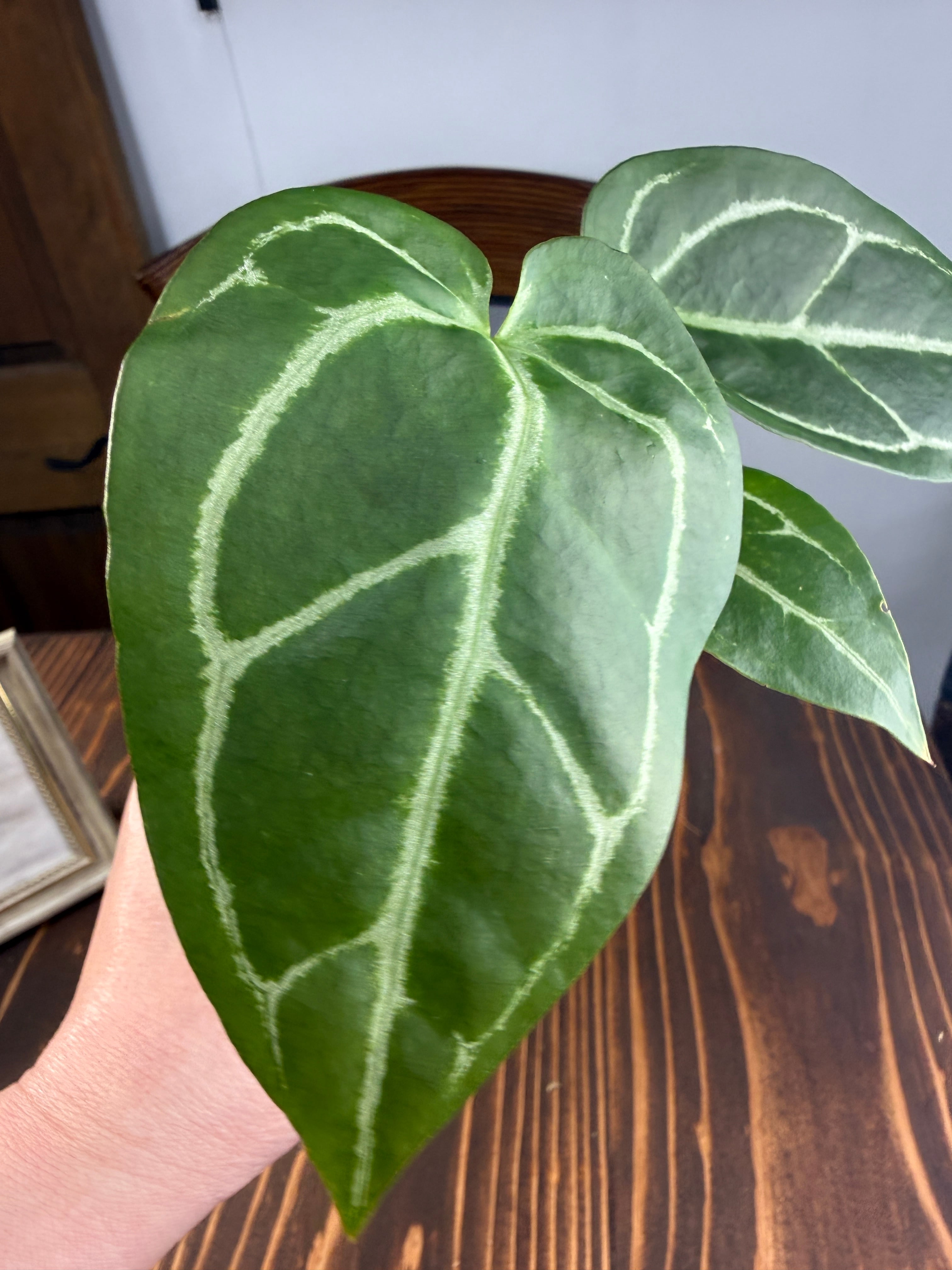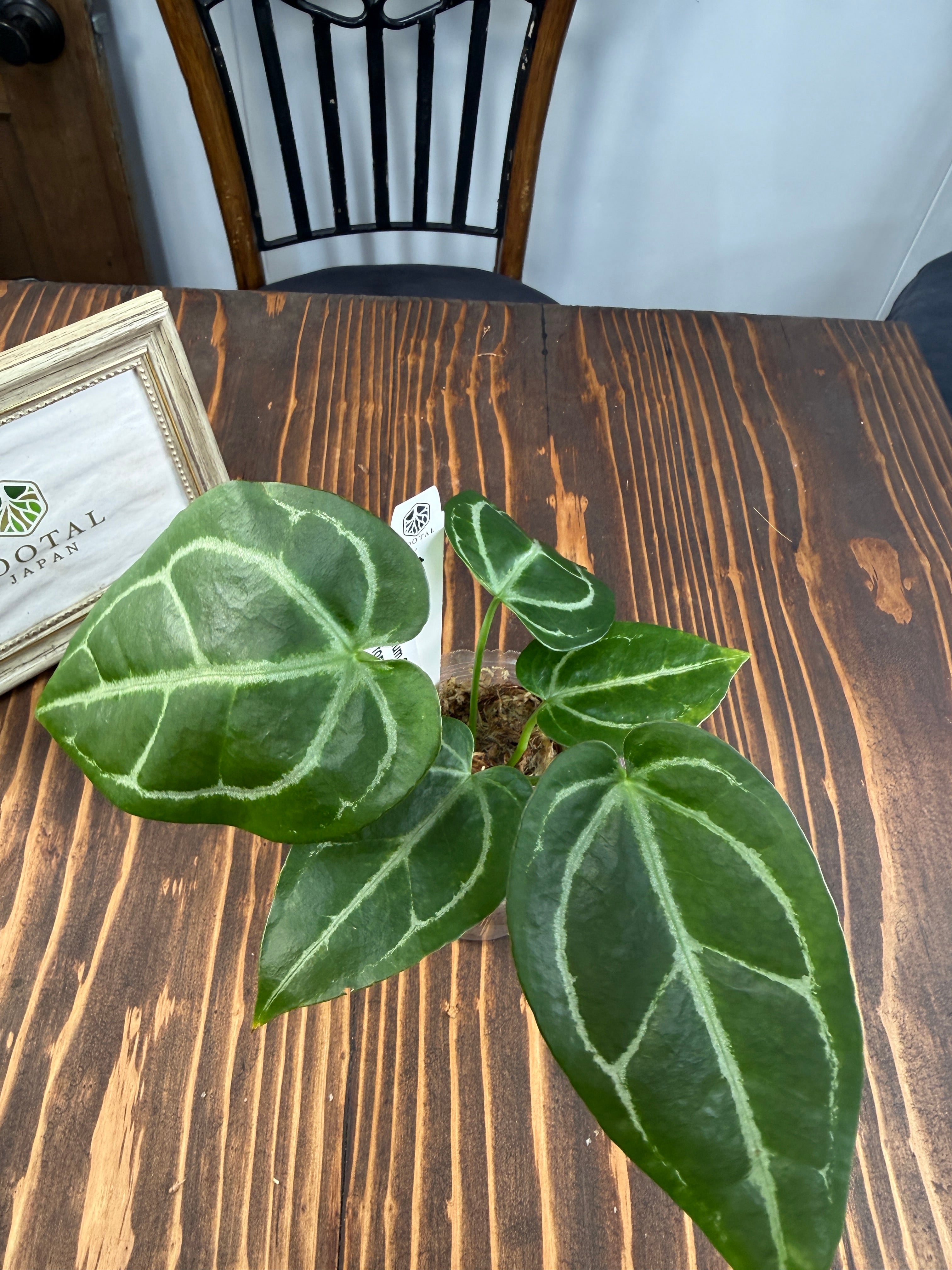 アンスリウム クリスタリナムダークフォームは、深い黒緑の葉と見事な葉脈が特徴で、どんなインテリアにも洗練された雰囲気をもたらします。見るほどにその美しさに引き込まれることでしょう。手入れを行うことで、より一層その魅力が引き立ち、成長を楽しむことができる植物です!