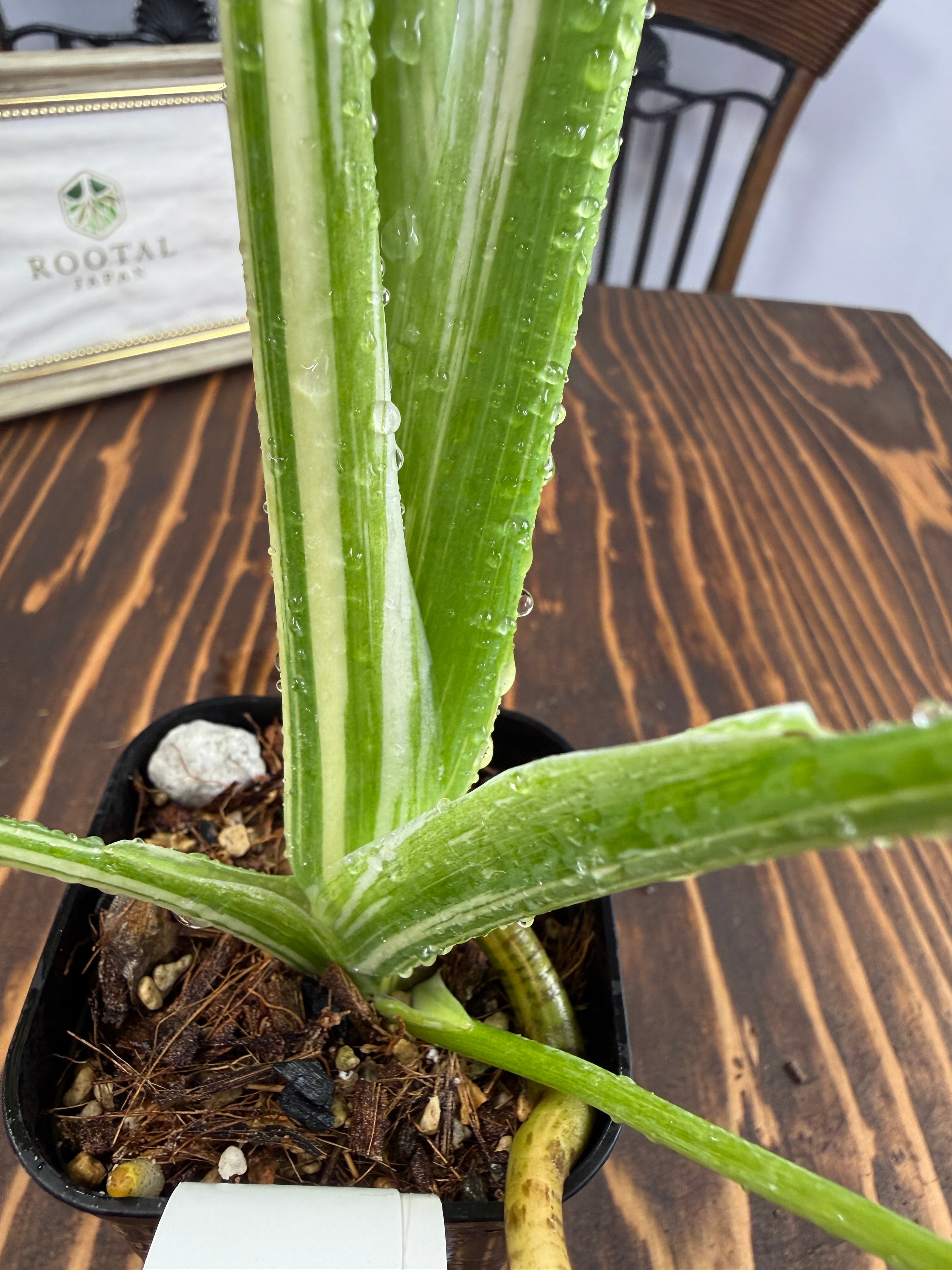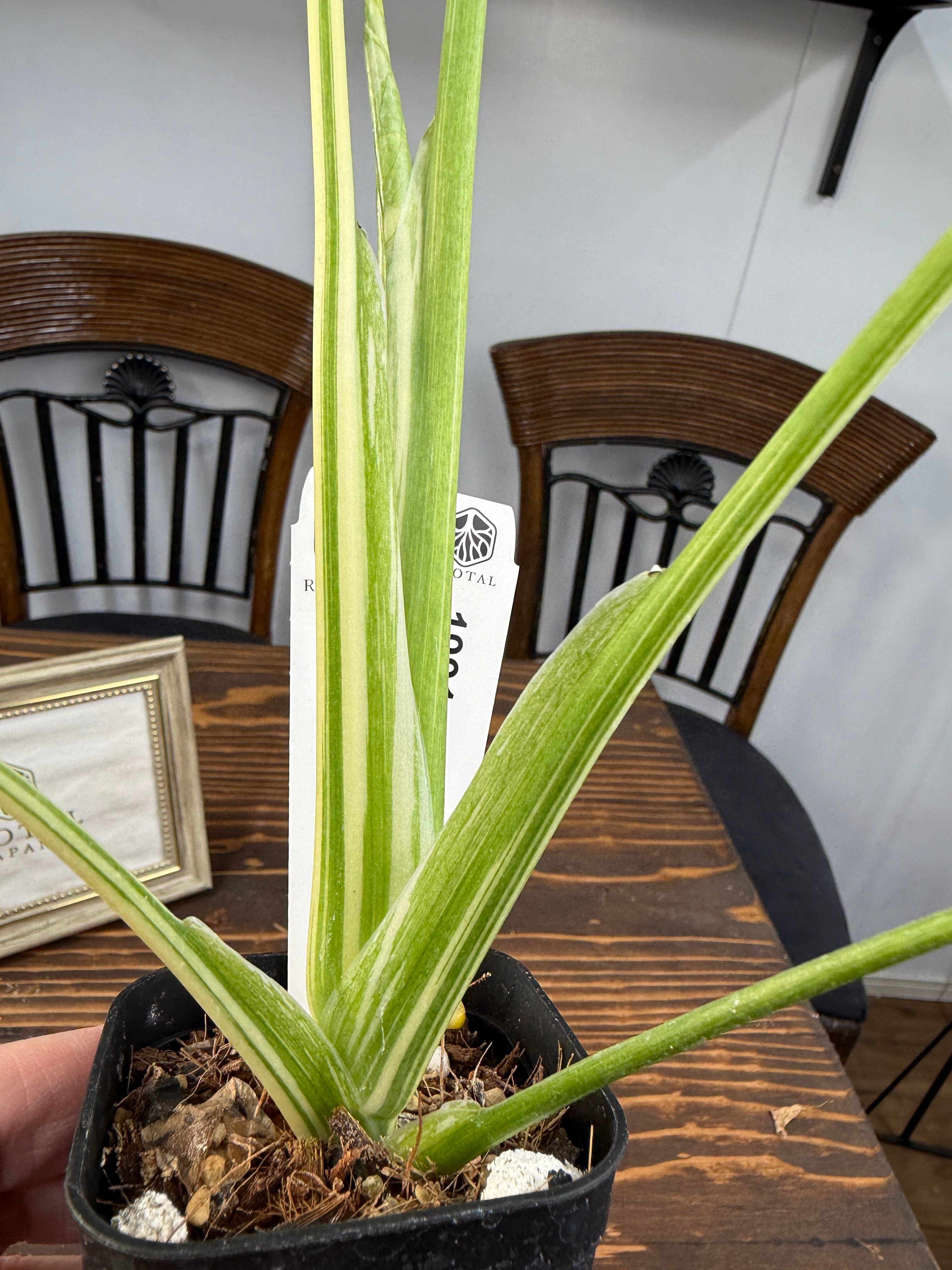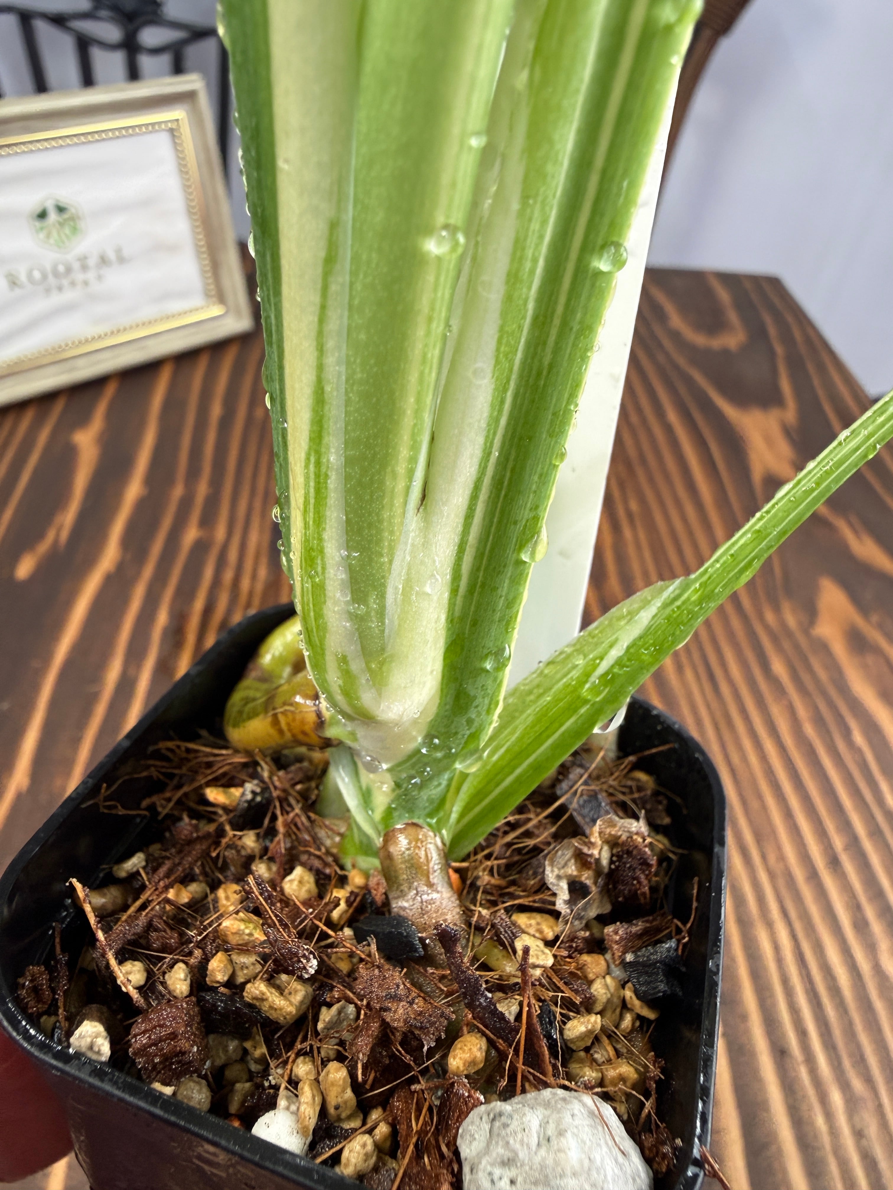 モンステラ デリシオーサ タイコンステレーションの葉は、ユニークなバリエガータが印象的で、成長段階によってその美しさが変わります。出荷時のサイズはおおよそ20㎝程度で、かわいらしいベビー苗をお届けいたします。