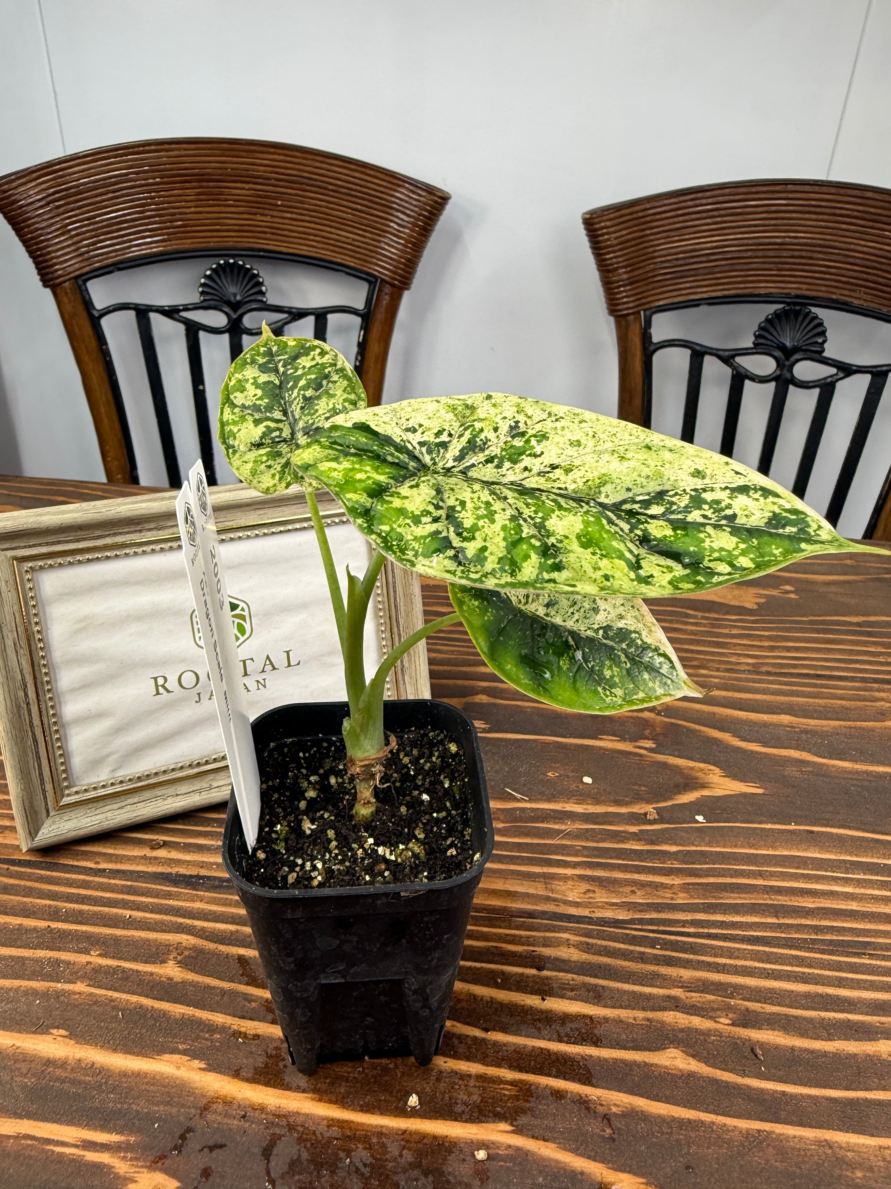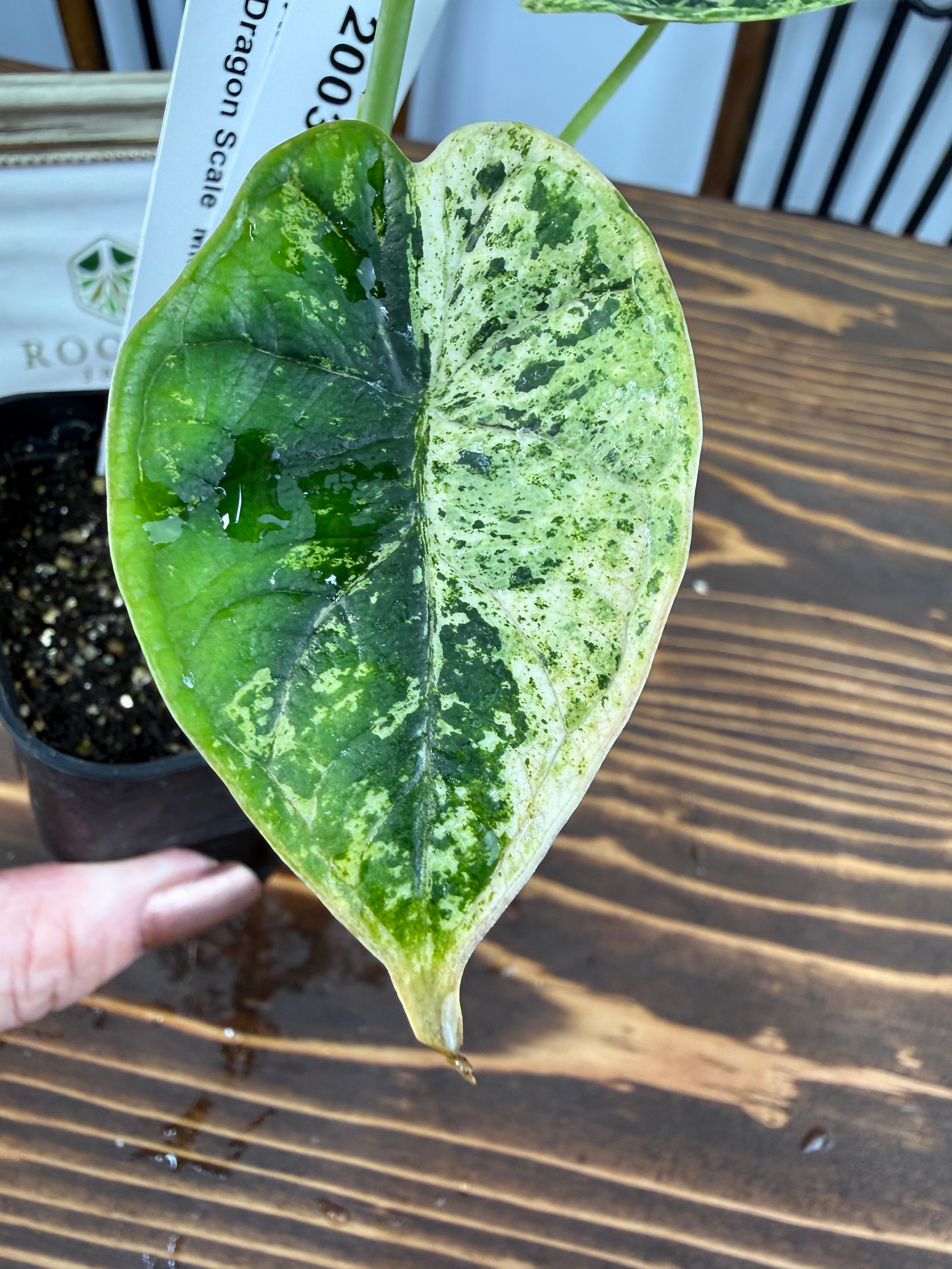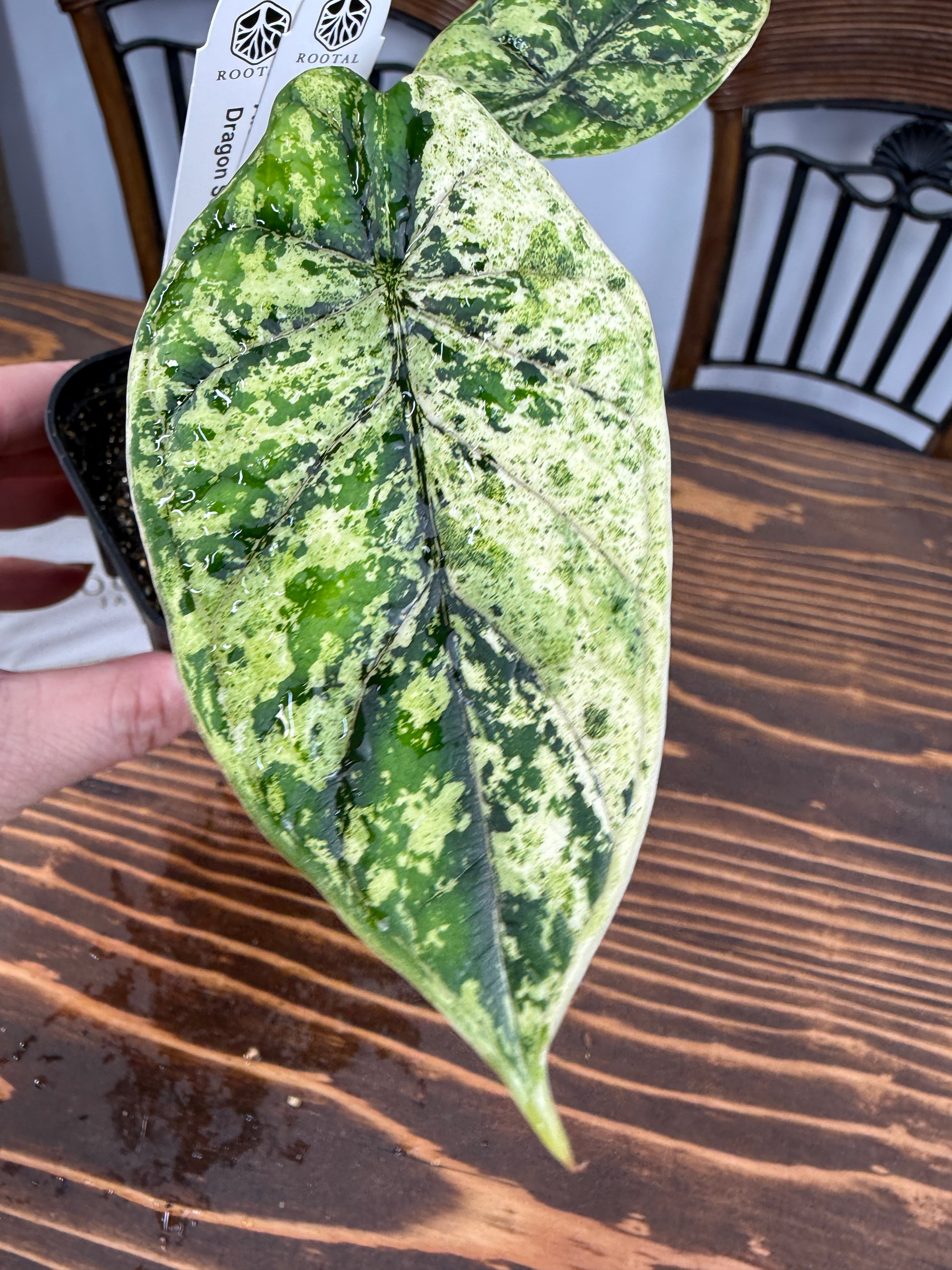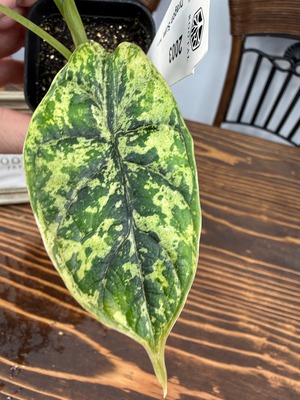 アロカシア ドラゴンスケール ミントの葉は、青緑色が美しく、模様の変化が楽しめます。出荷時のサイズはおおよそ20㎝程度で、魅力的なベビー苗をお届けいたします。