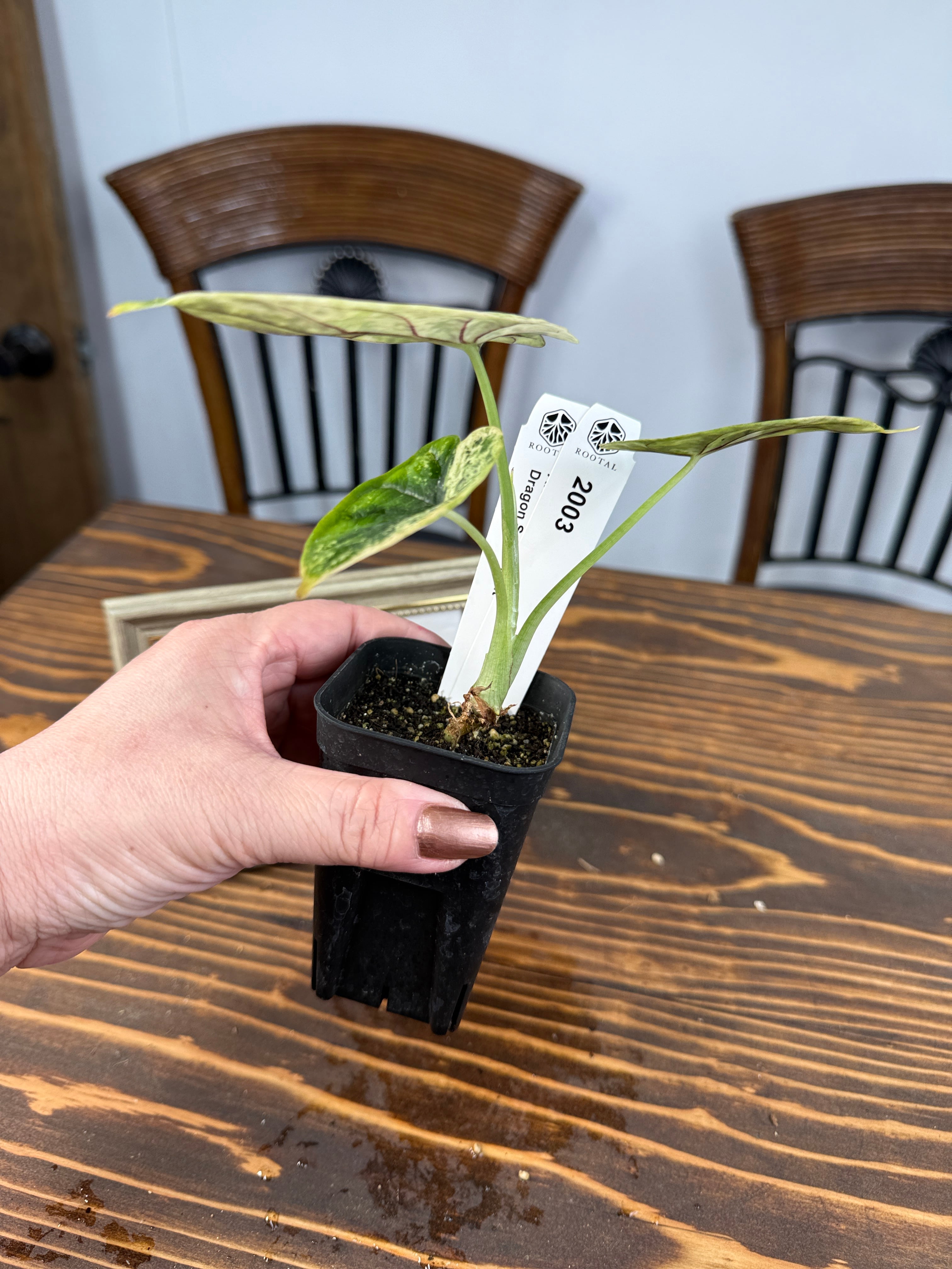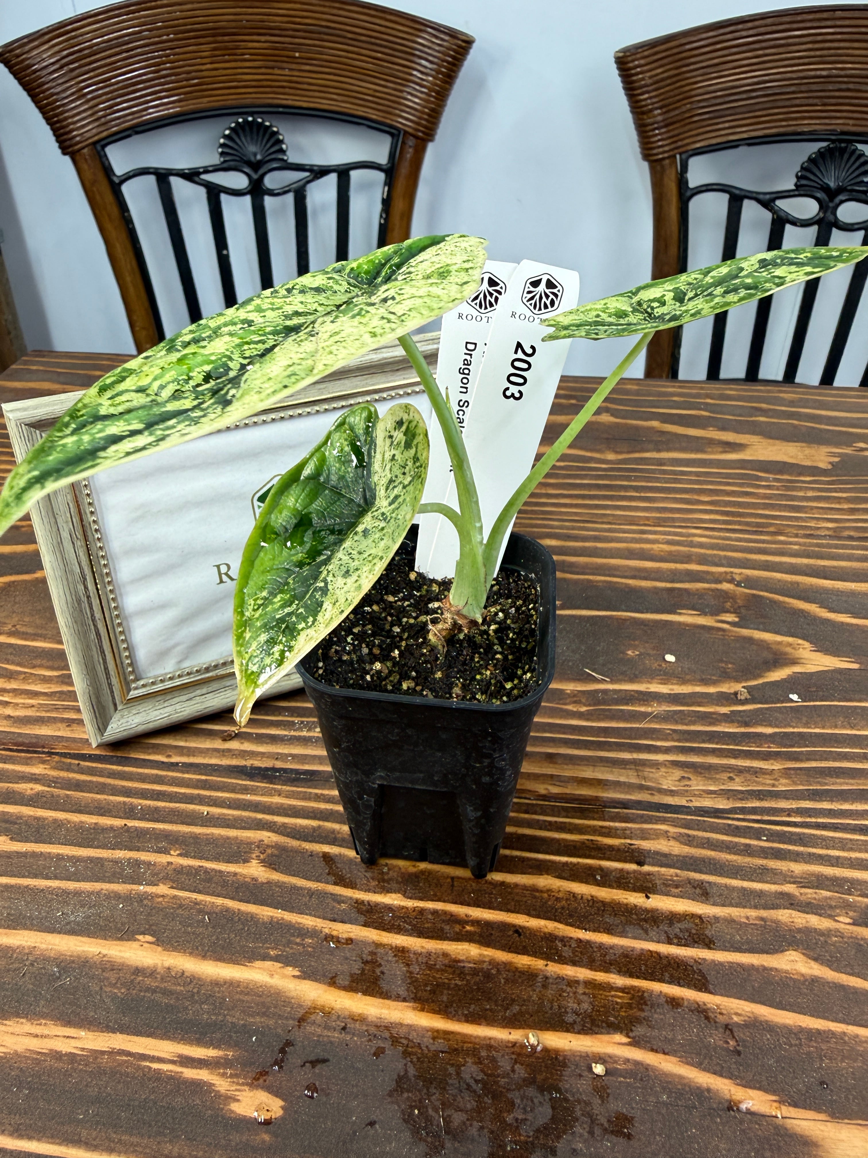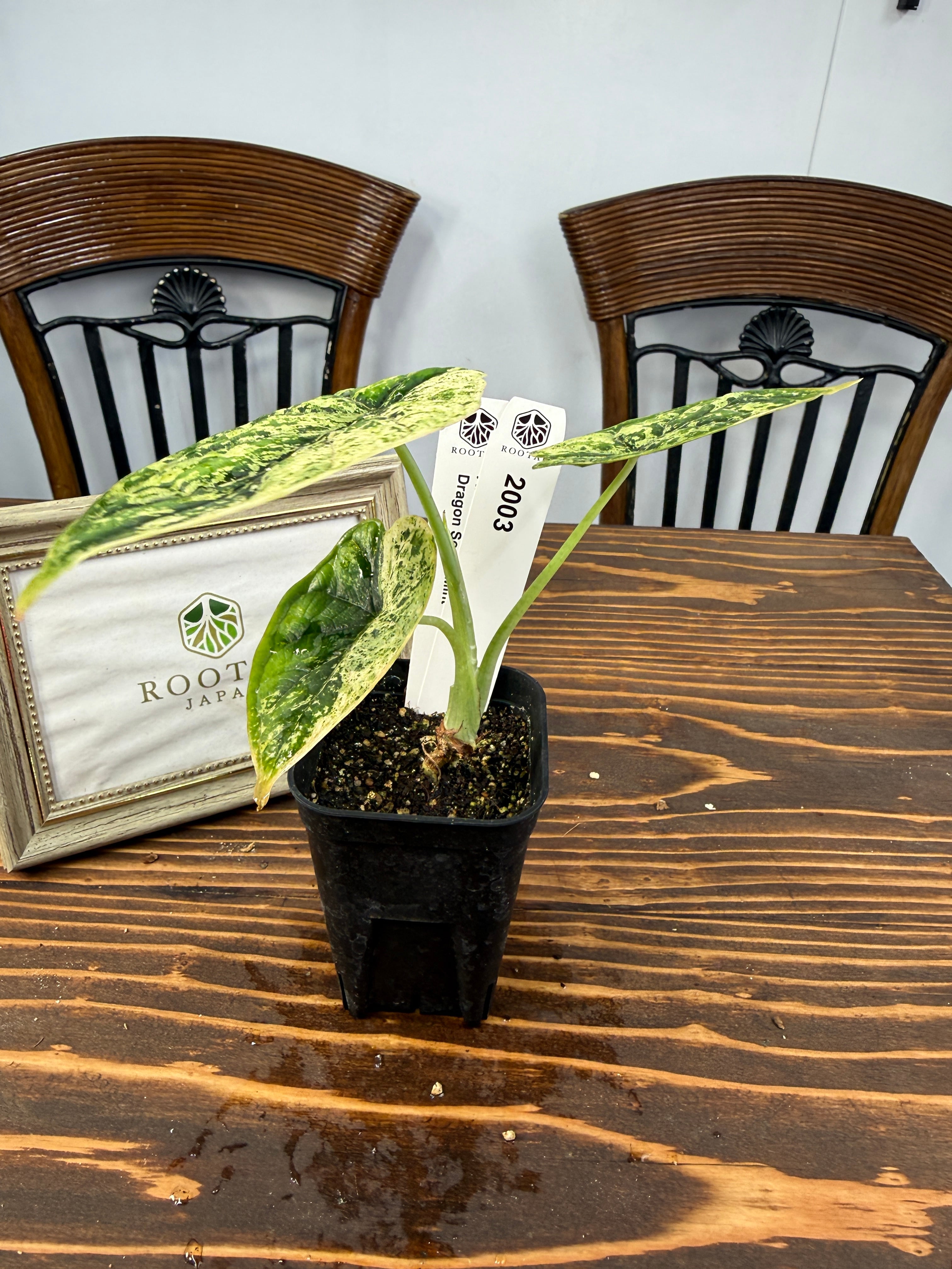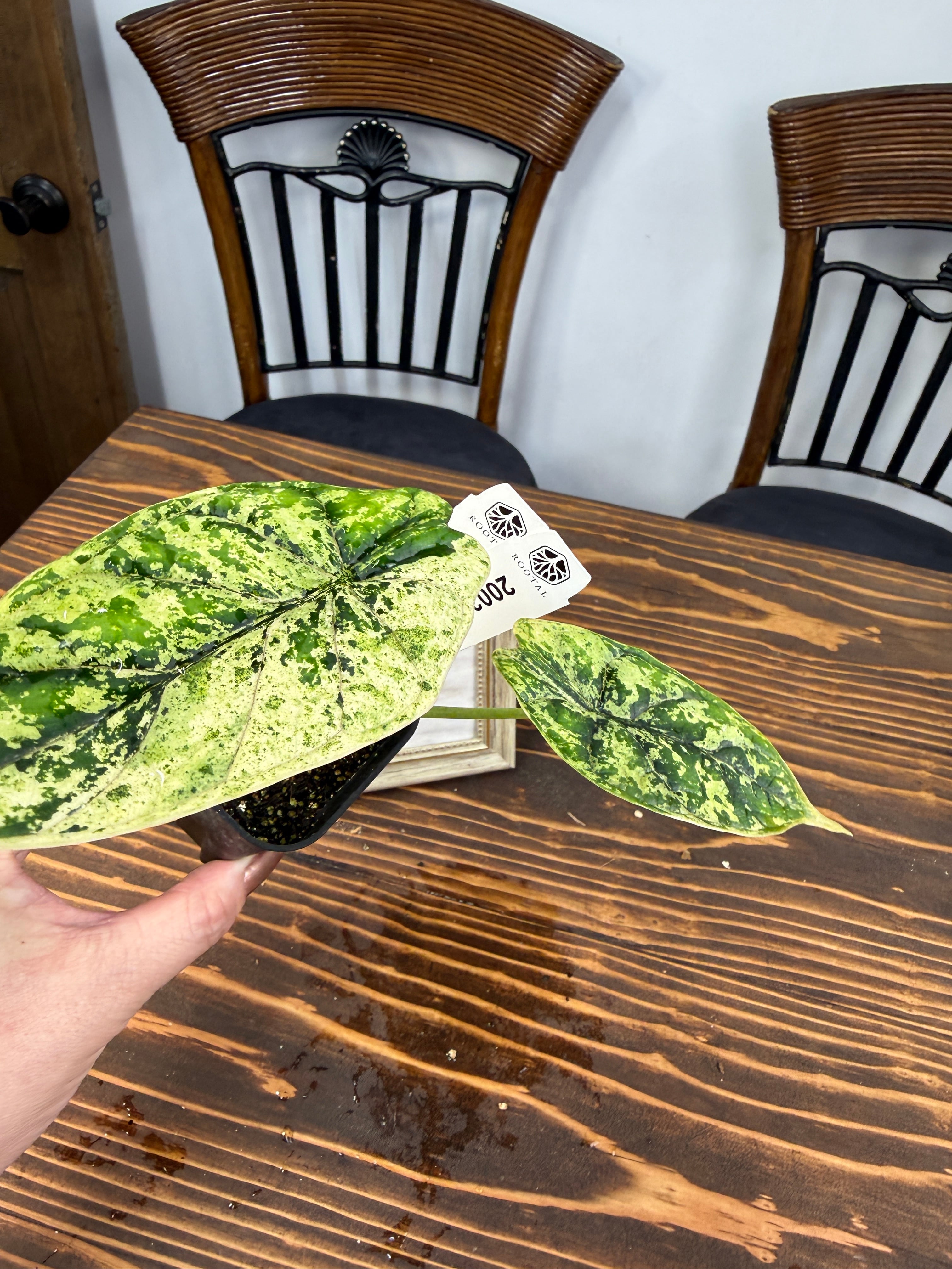 アロカシア ドラゴンスケール ミントの葉は、青緑色が美しく、模様の変化が楽しめます。出荷時のサイズはおおよそ20㎝程度で、魅力的なベビー苗をお届けいたします。