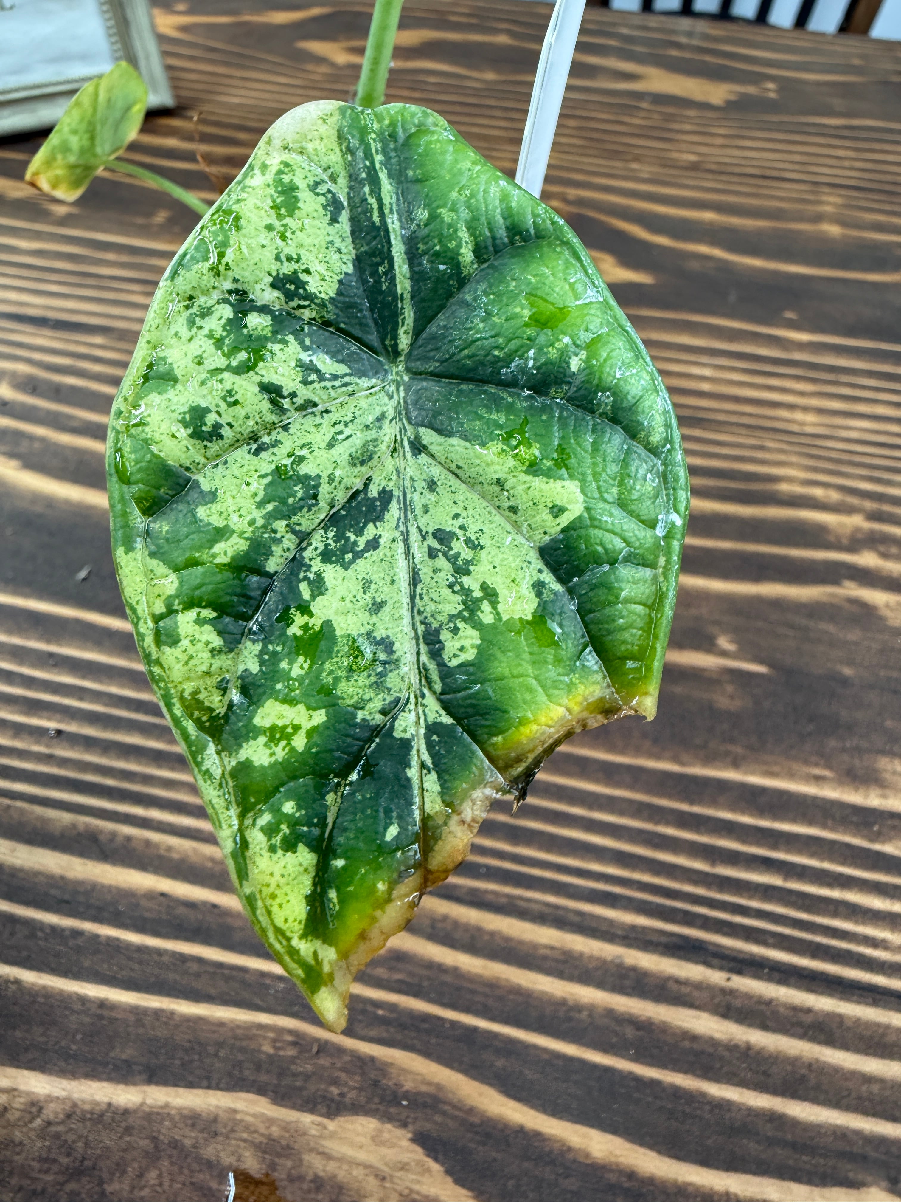 アロカシア ドラゴンスケール ミントの葉は、青緑色が美しく、模様の変化が楽しめます。出荷時のサイズはおおよそ20㎝程度で、魅力的なベビー苗をお届けいたします。