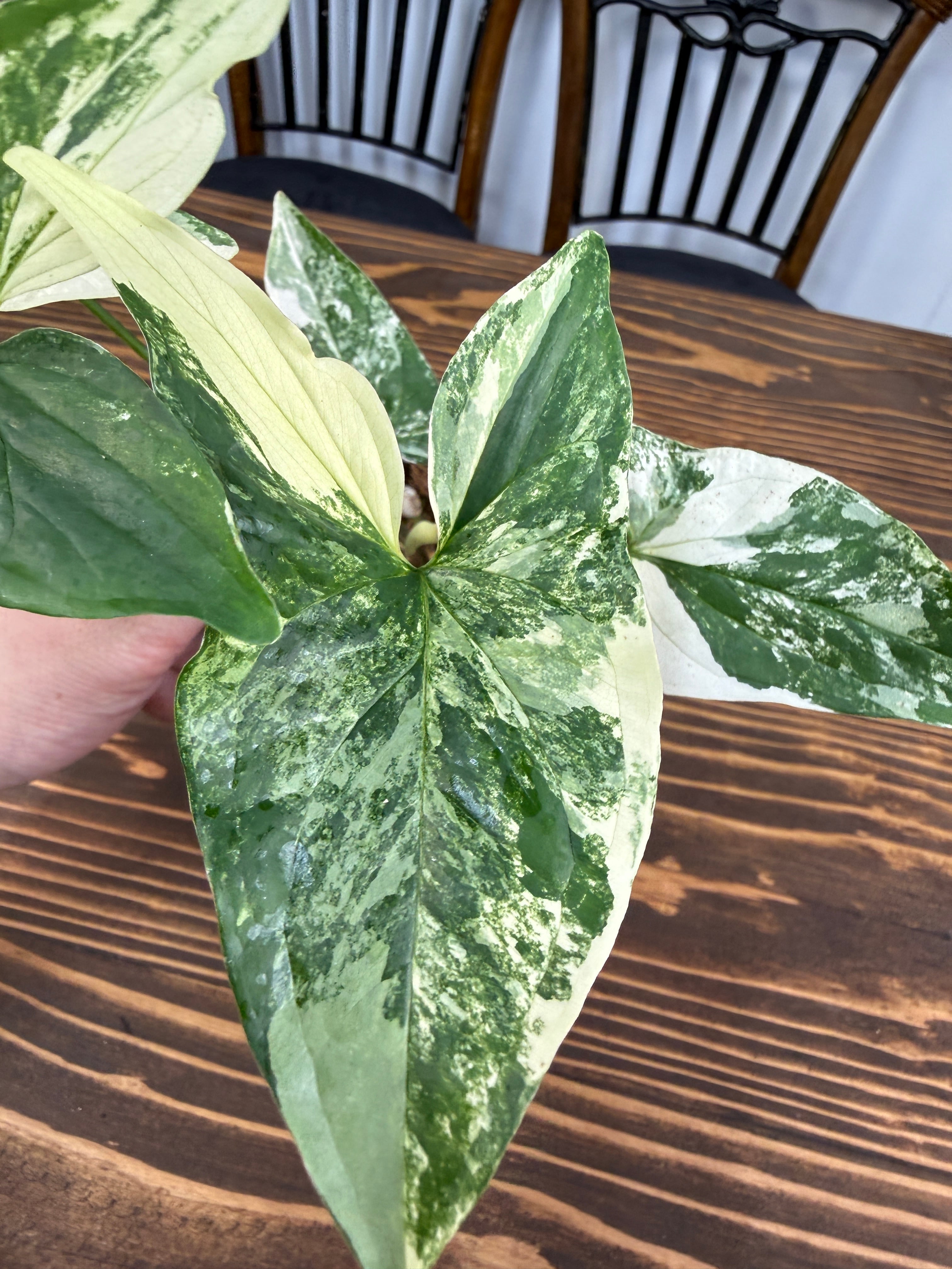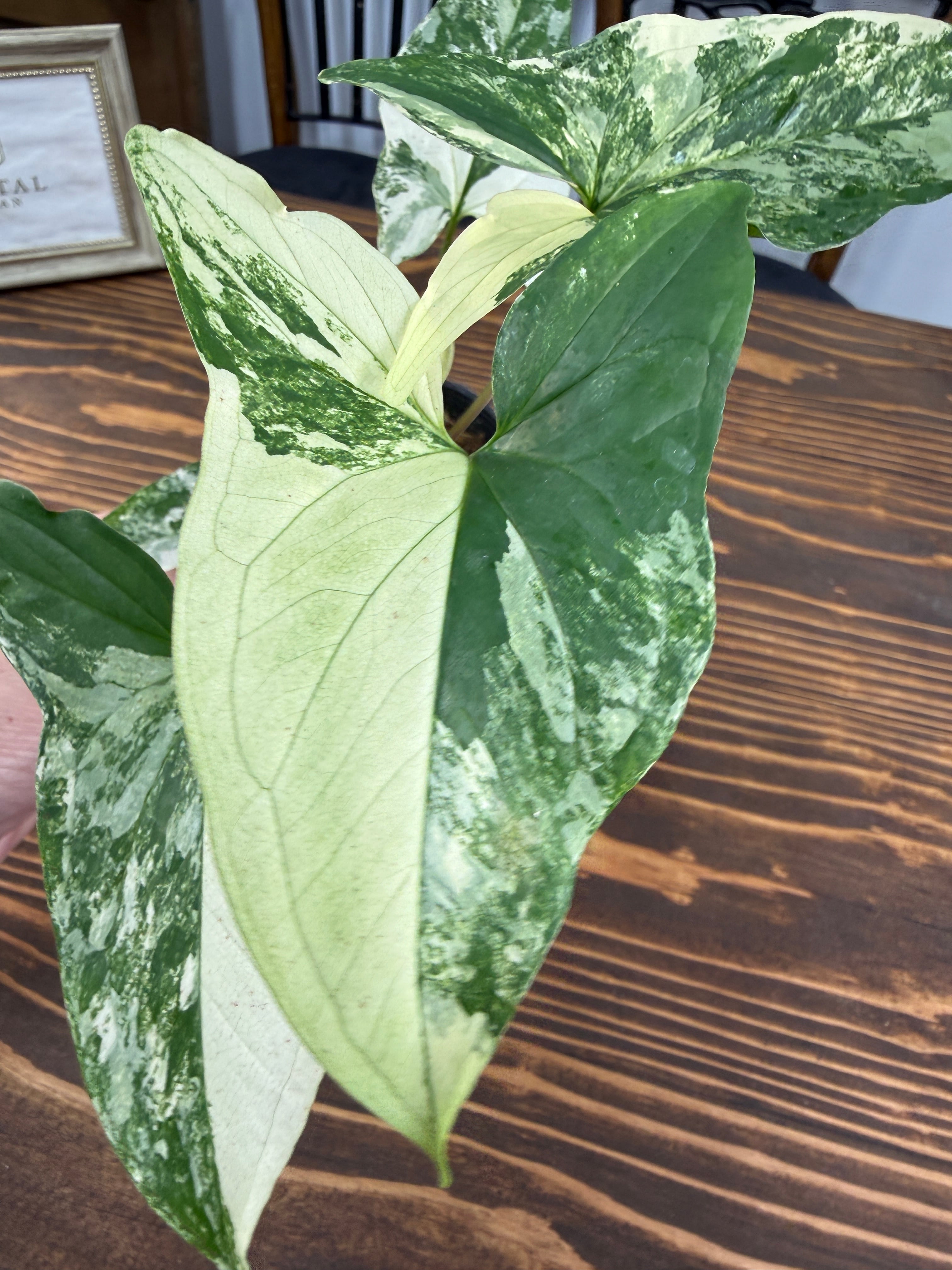 シンゴニウム フレンチマーブルの葉は、深い緑とクリーミーな白が見事に交わり、どんなインテリアにも品のある魅力を加えます。出荷は3.5号ポットで、コンパクトながらも存在感のある健康的な苗をお届けいたします。