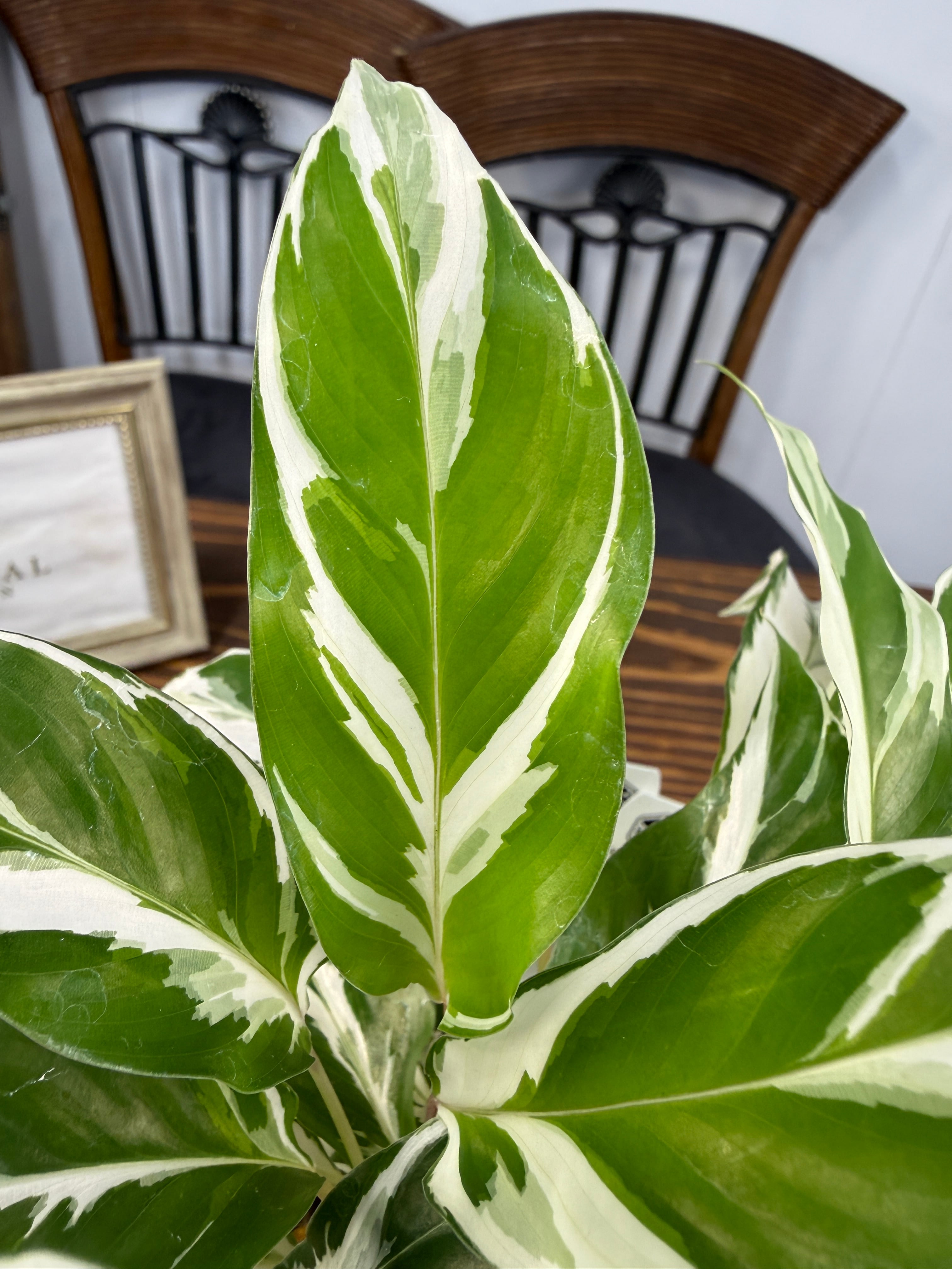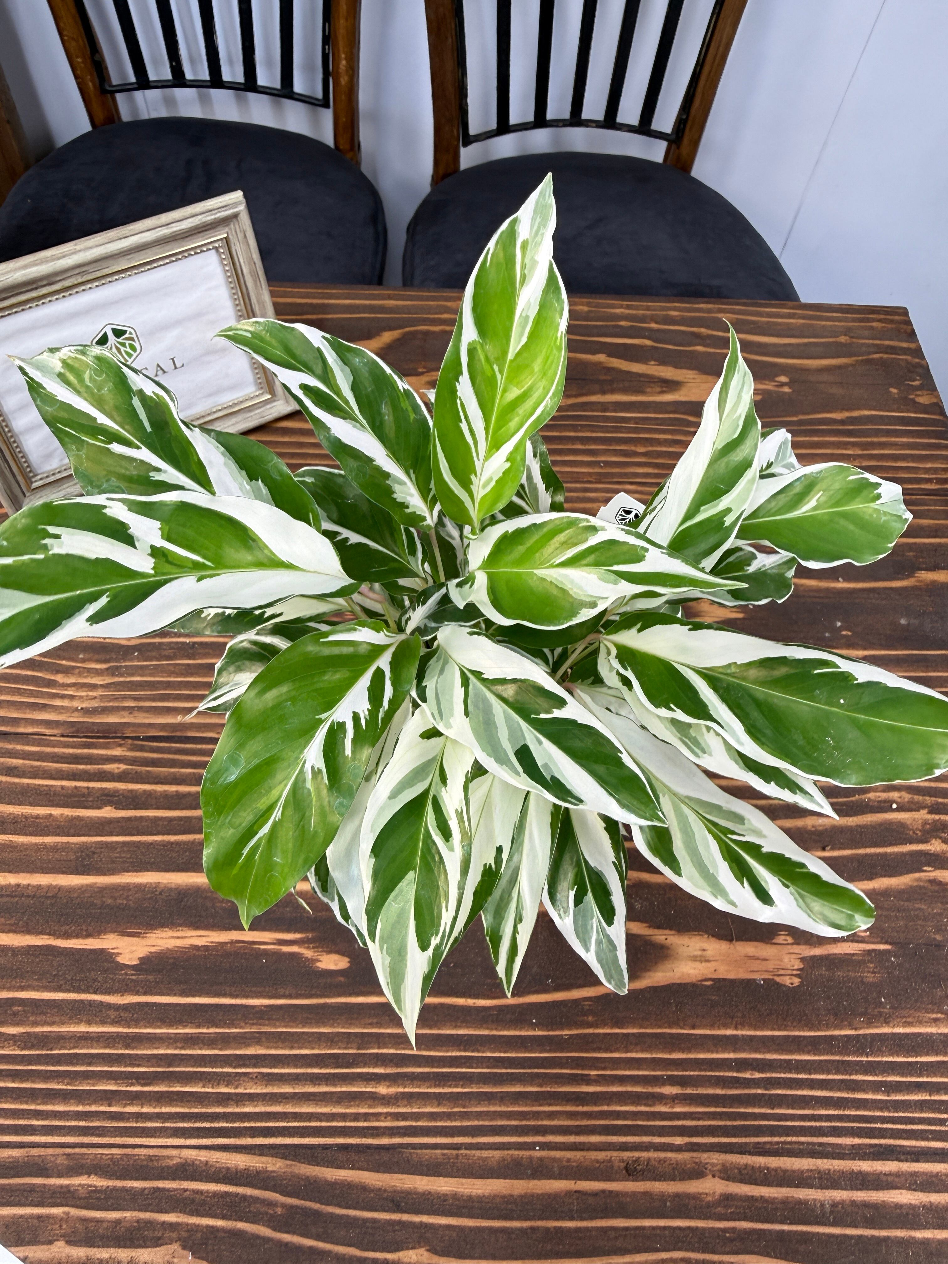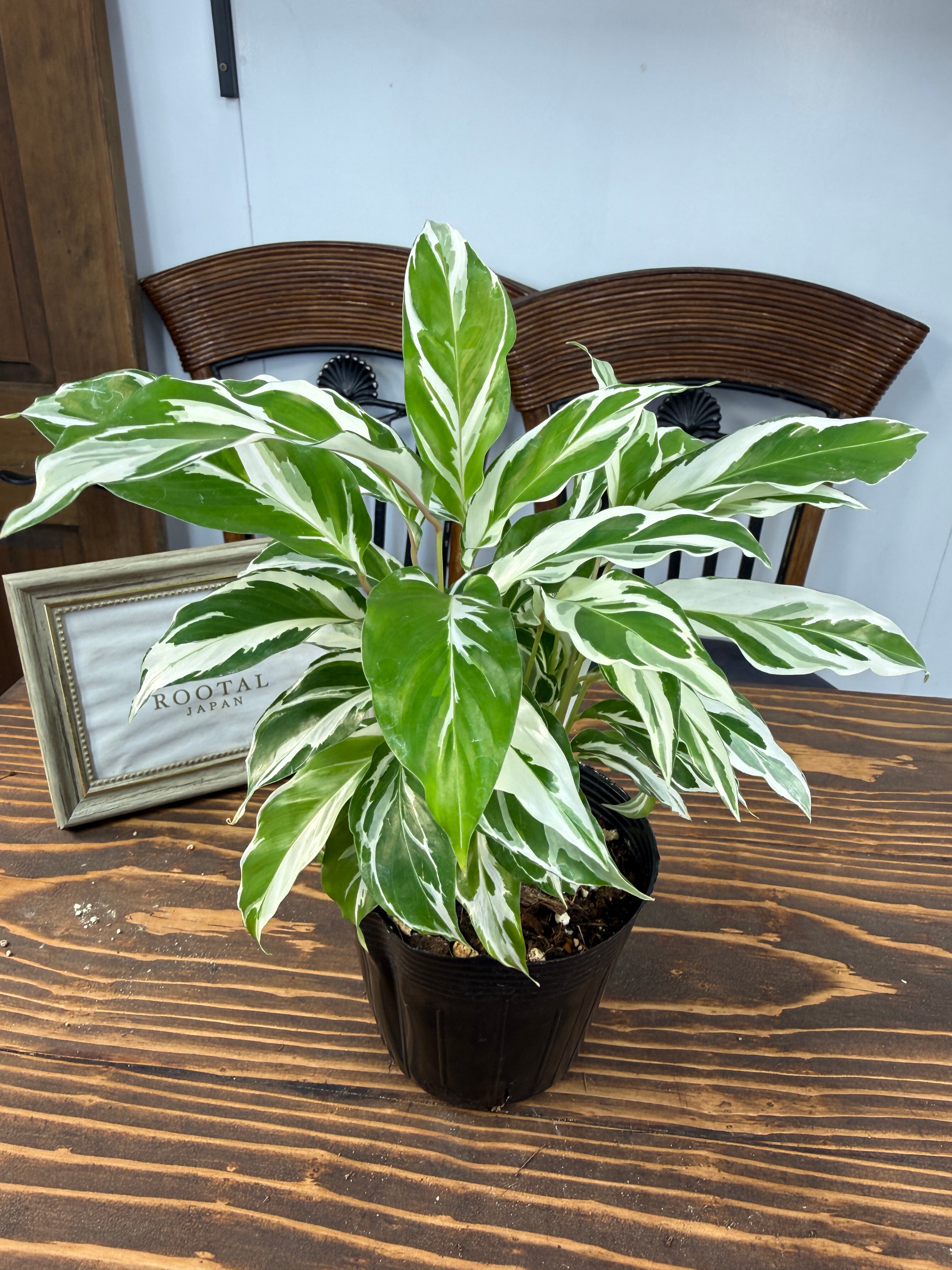 カラテア ホワイトフュージョンの葉は、明るい緑に美しい白の模様が施され、目を引く一品です。健康的で美しい3.5号ポットの苗をご用意しており、特別なグリーンとして楽しんでいただけます。