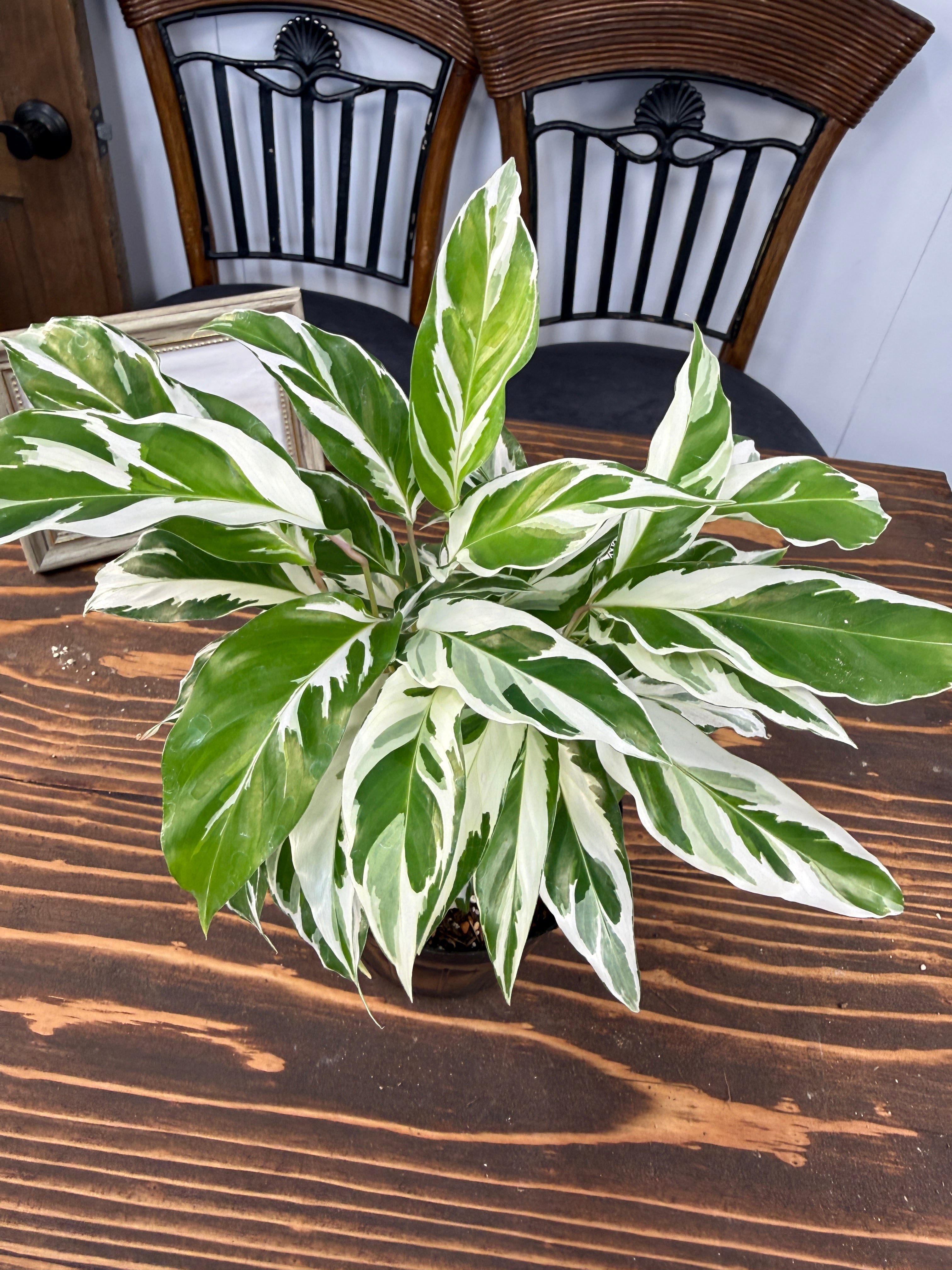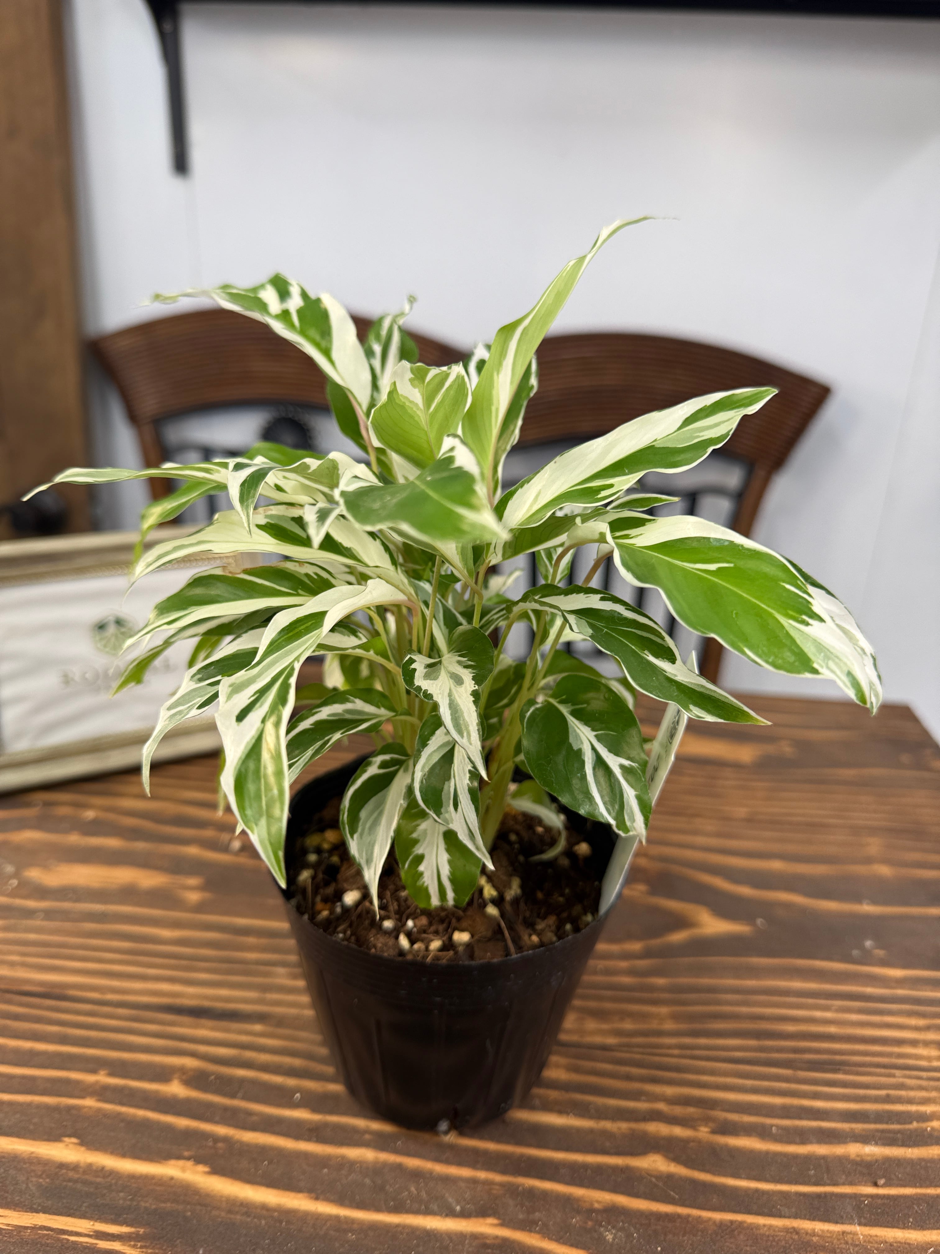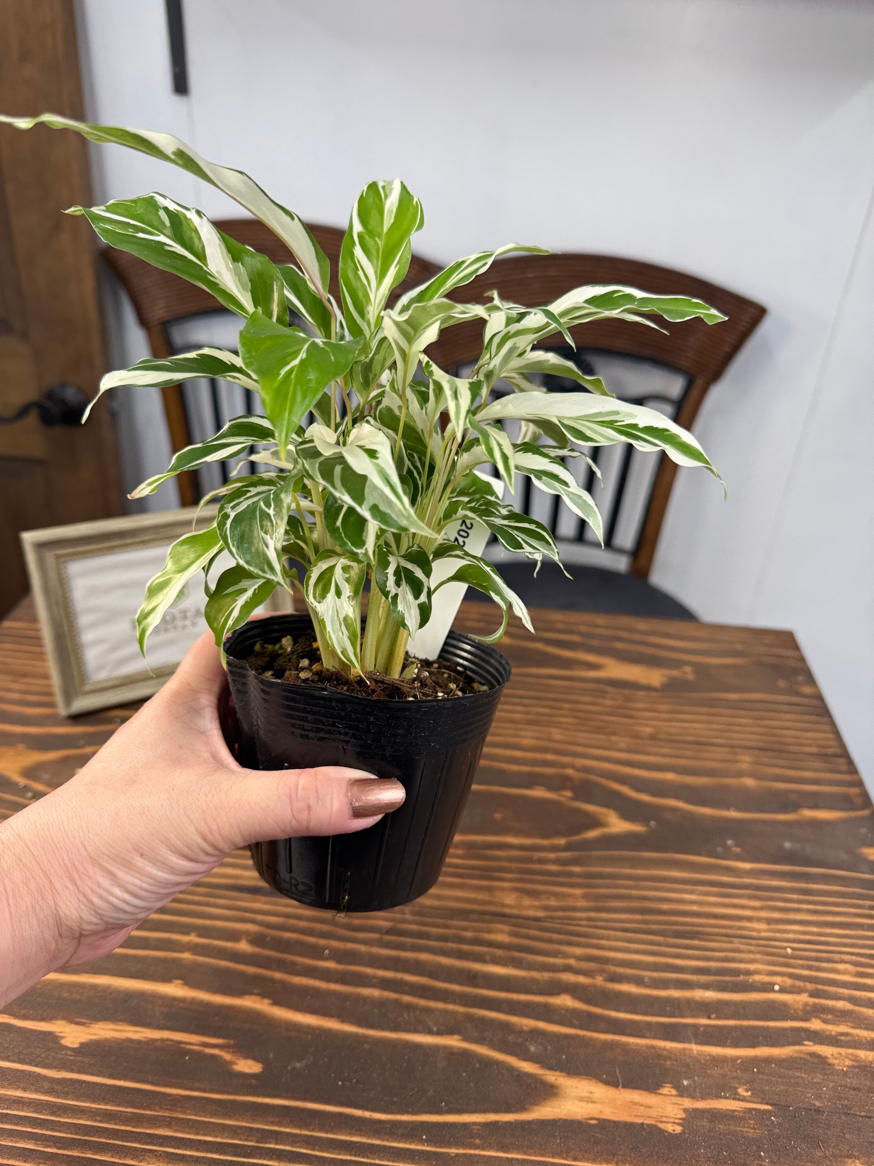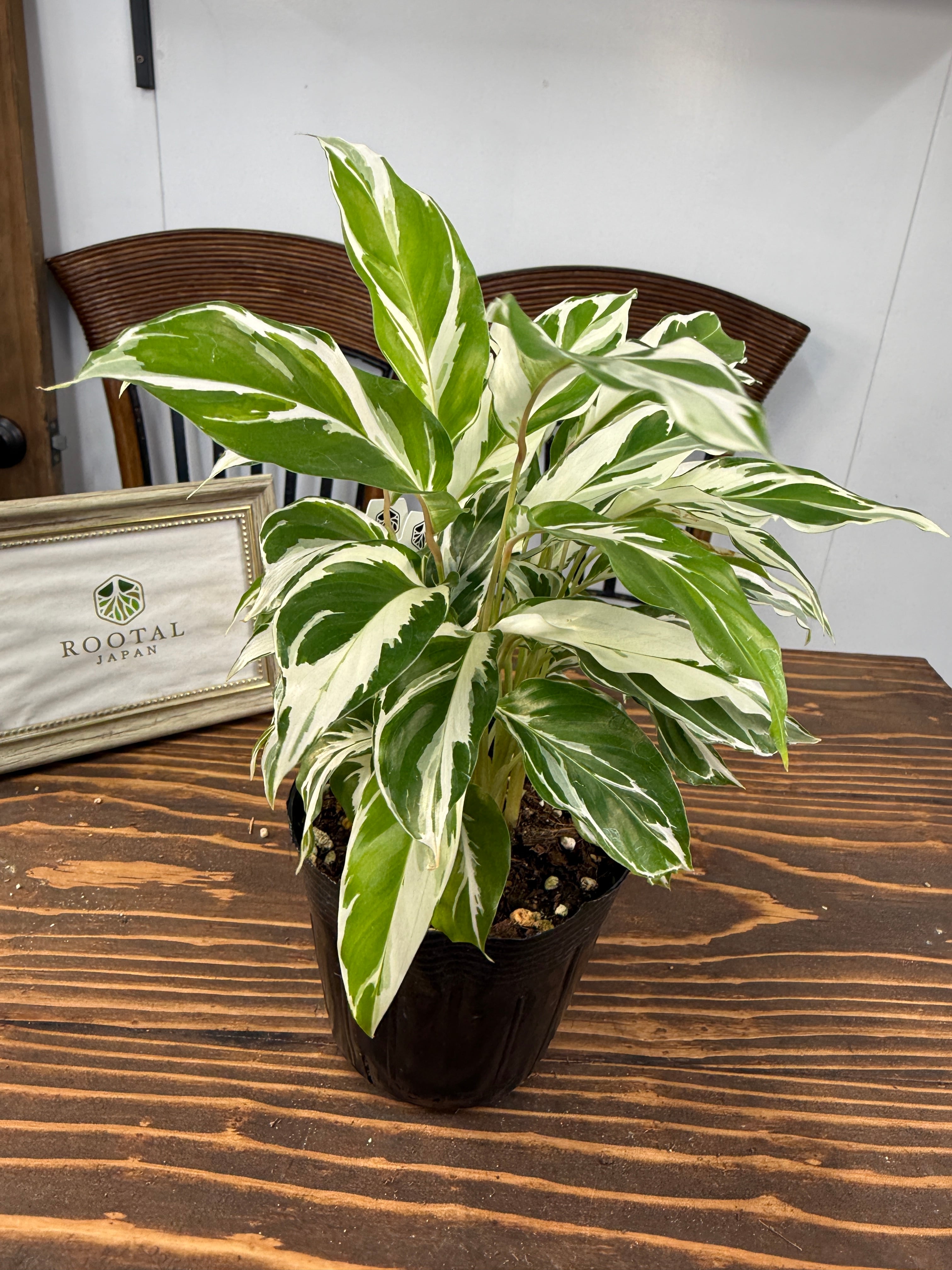 カラテア ホワイトフュージョンの葉は、明るい緑に美しい白の模様が施され、目を引く一品です。健康的で美しい3.5号ポットの苗をご用意しており、特別なグリーンとして楽しんでいただけます。