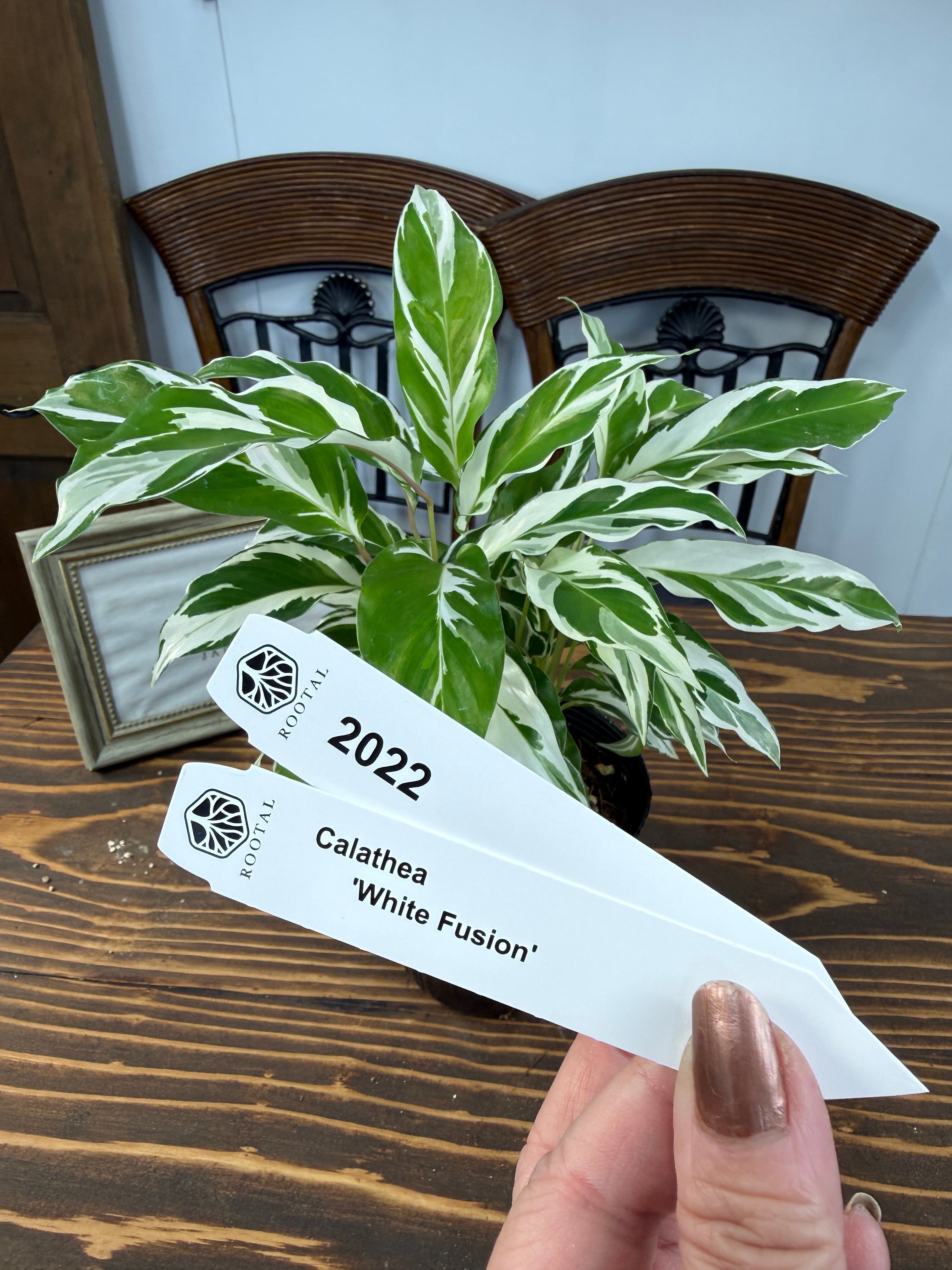 美しい白い斑が特徴のカラテア ホワイトフュージョン!そのユニークな模様と華やかな葉が、お部屋のインテリアに洗練された雰囲気をもたらします。育てやすさを兼ね備え、どの空間でも映える存在感が魅力的です!