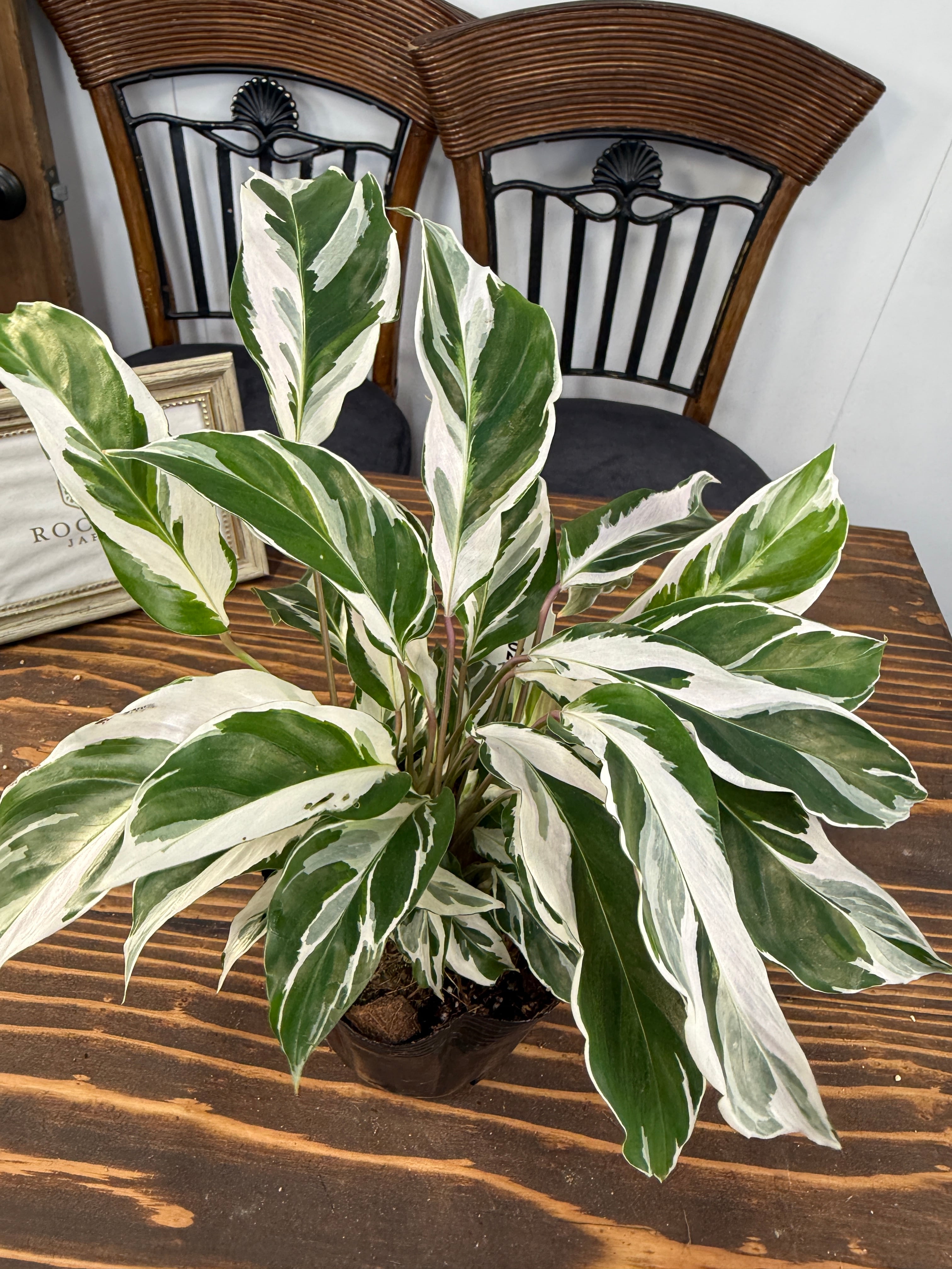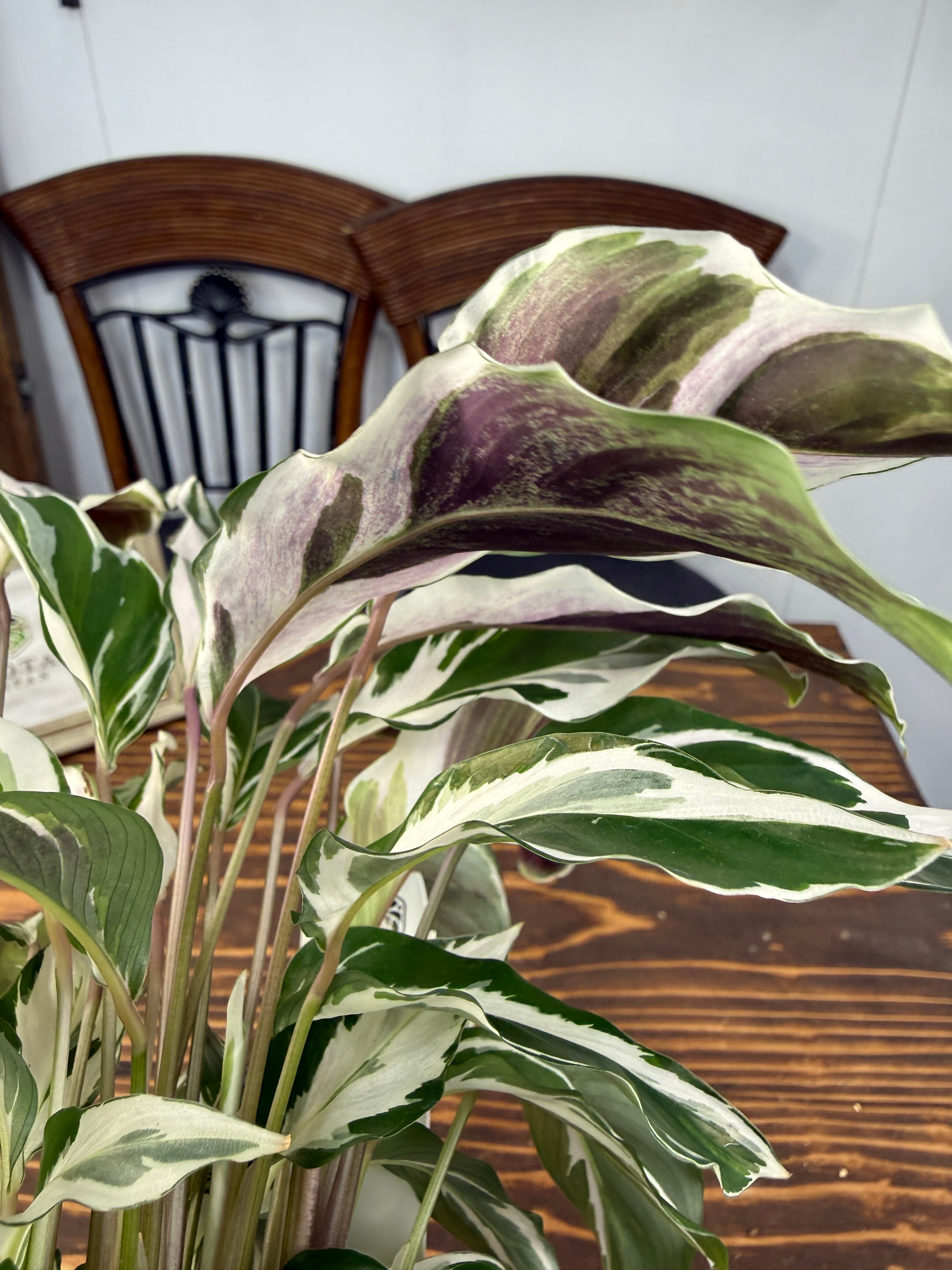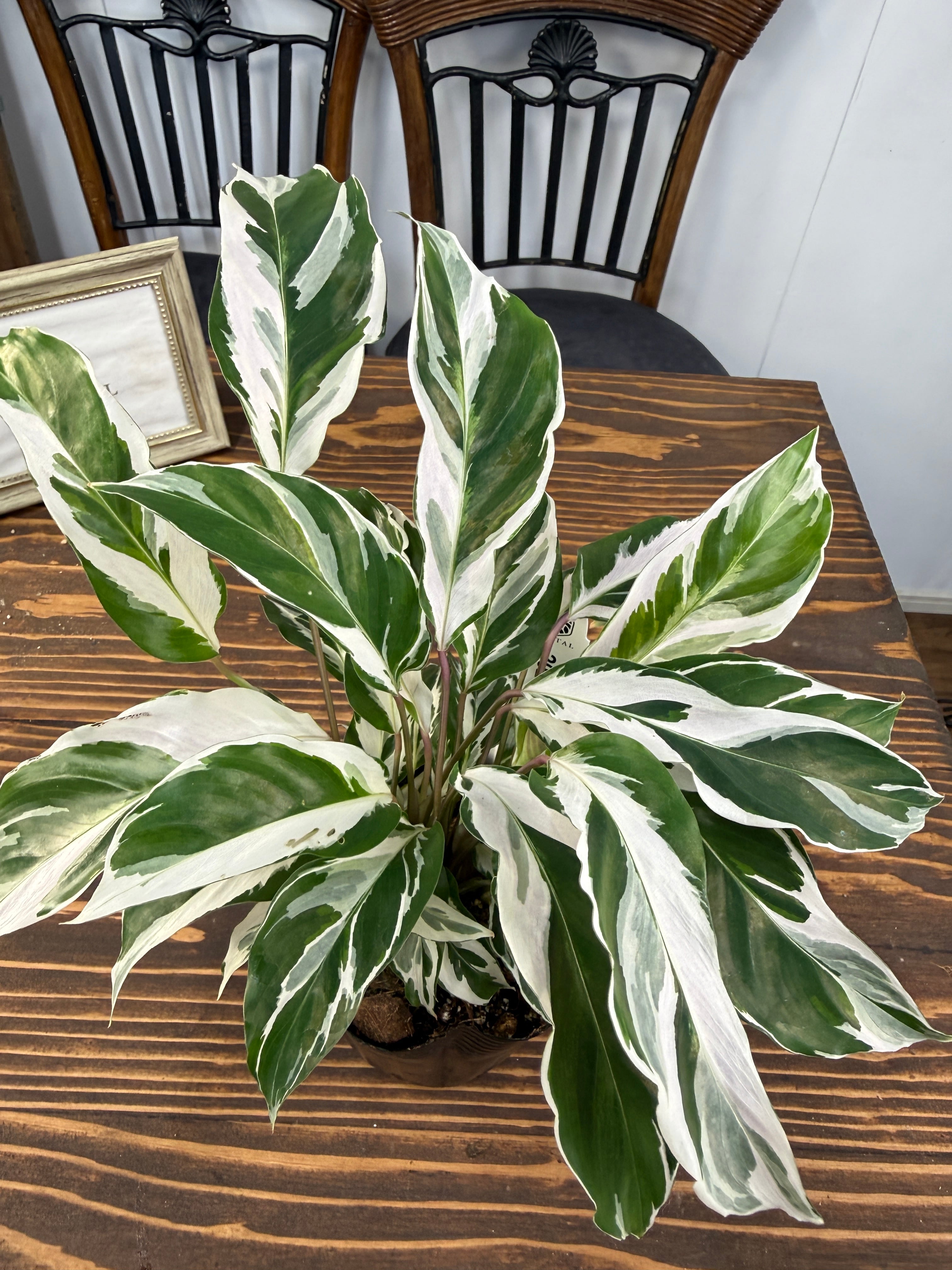 美しい白い斑が特徴のカラテア ホワイトフュージョン!そのユニークな模様と華やかな葉が、お部屋のインテリアに洗練された雰囲気をもたらします。育てやすさを兼ね備え、どの空間でも映える存在感が魅力的です!