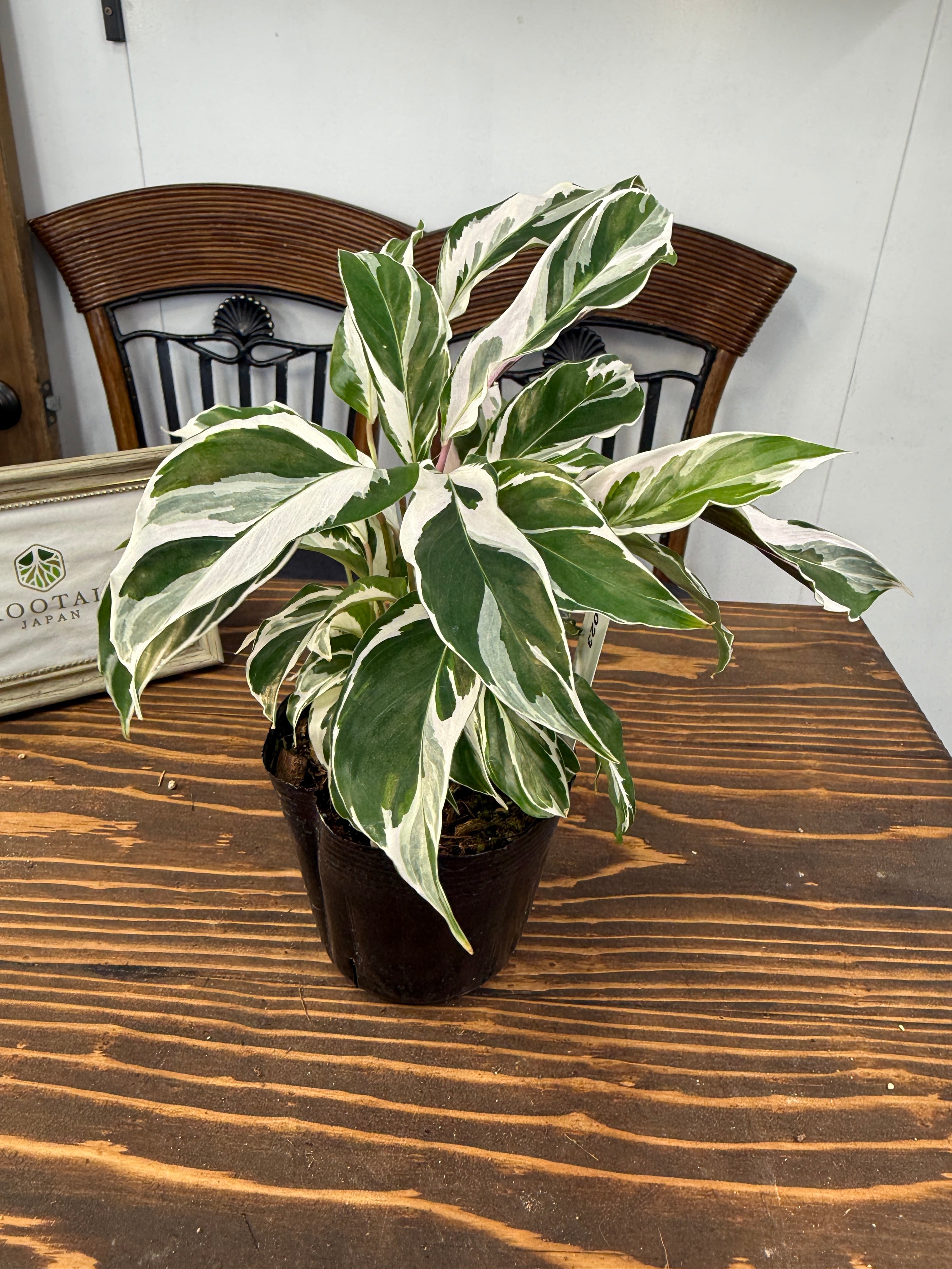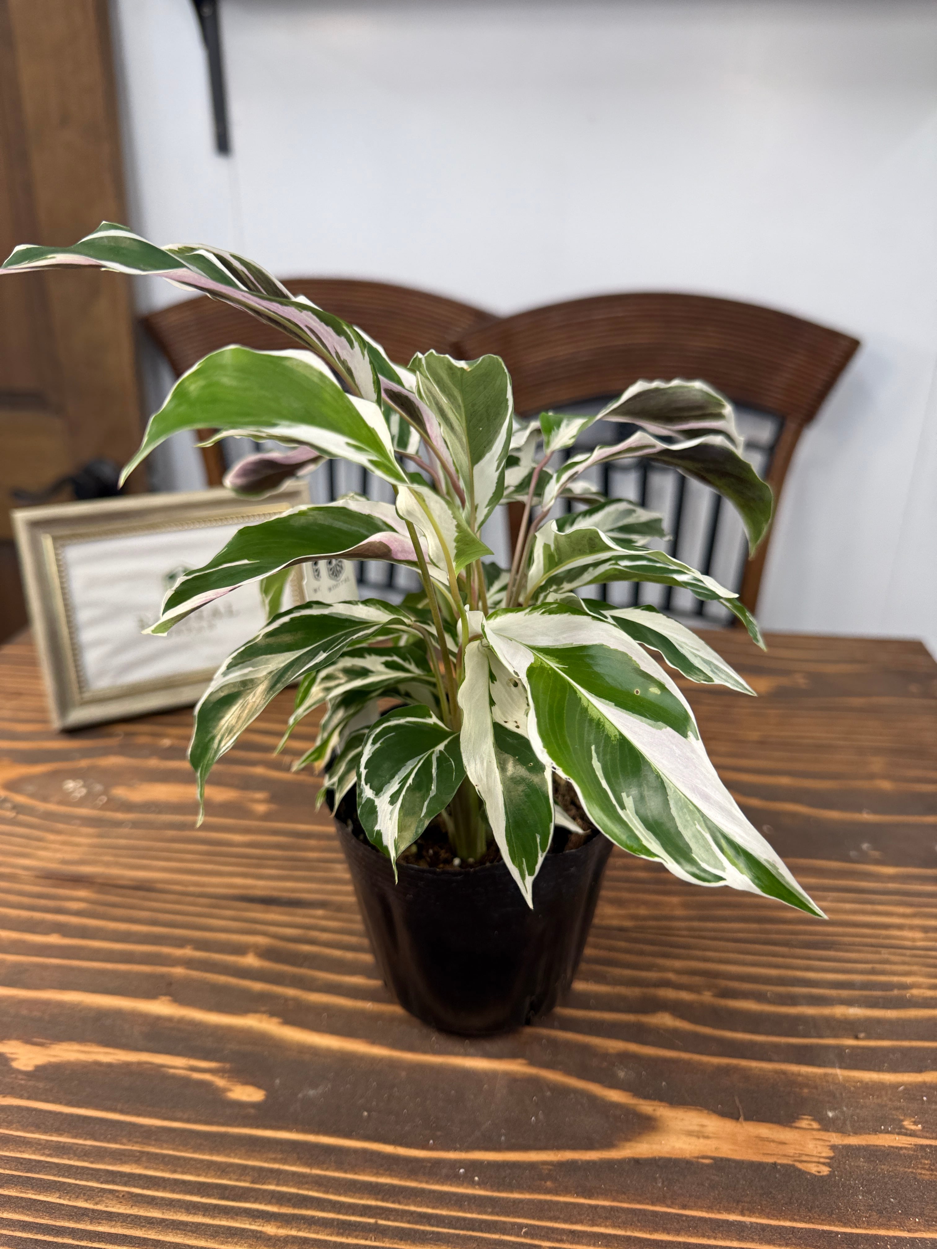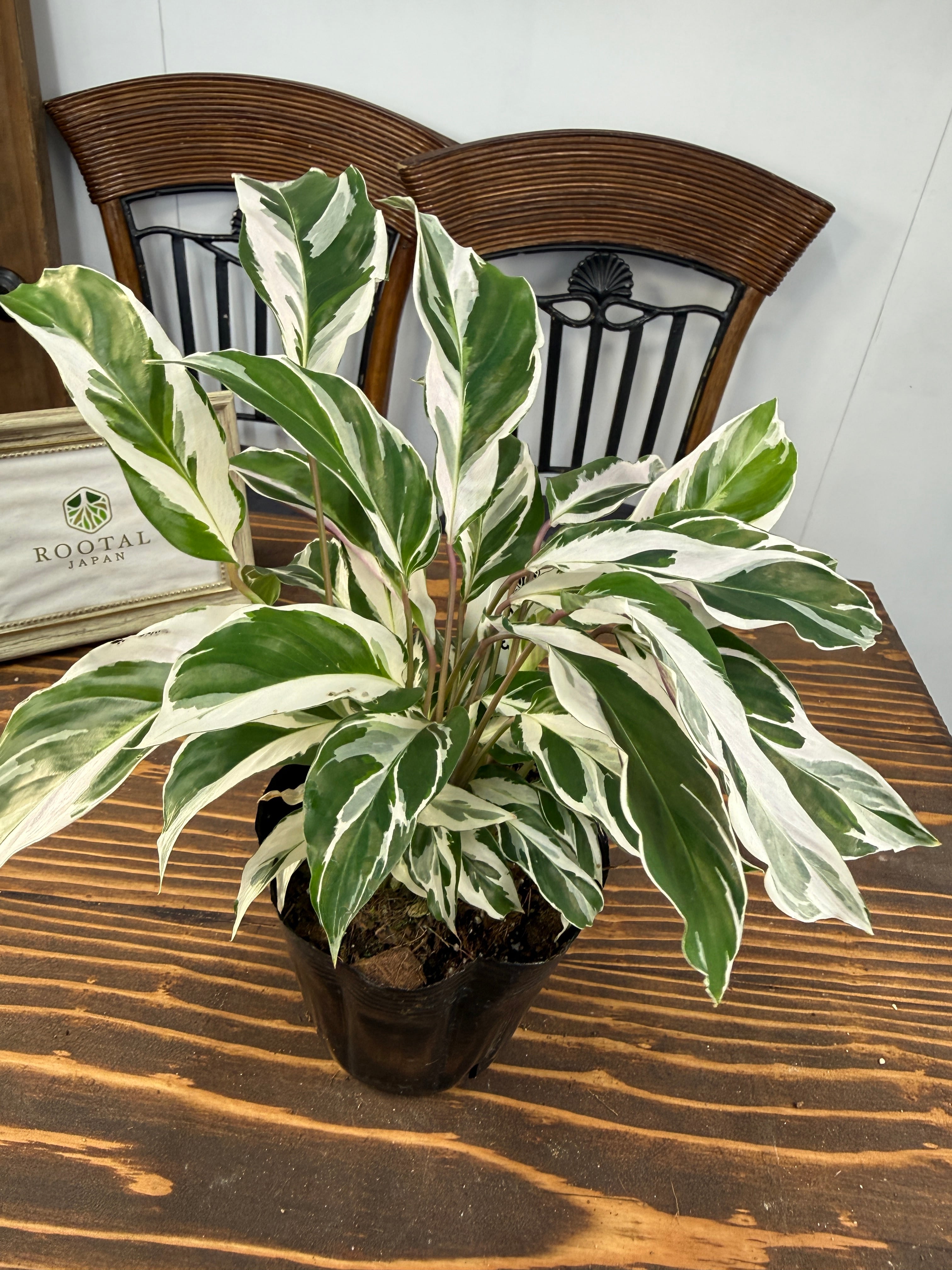カラテア ホワイトフュージョンの葉は、明るい緑に美しい白の模様が施され、目を引く一品です。健康的で美しい3.5号ポットの苗をご用意しており、特別なグリーンとして楽しんでいただけます。