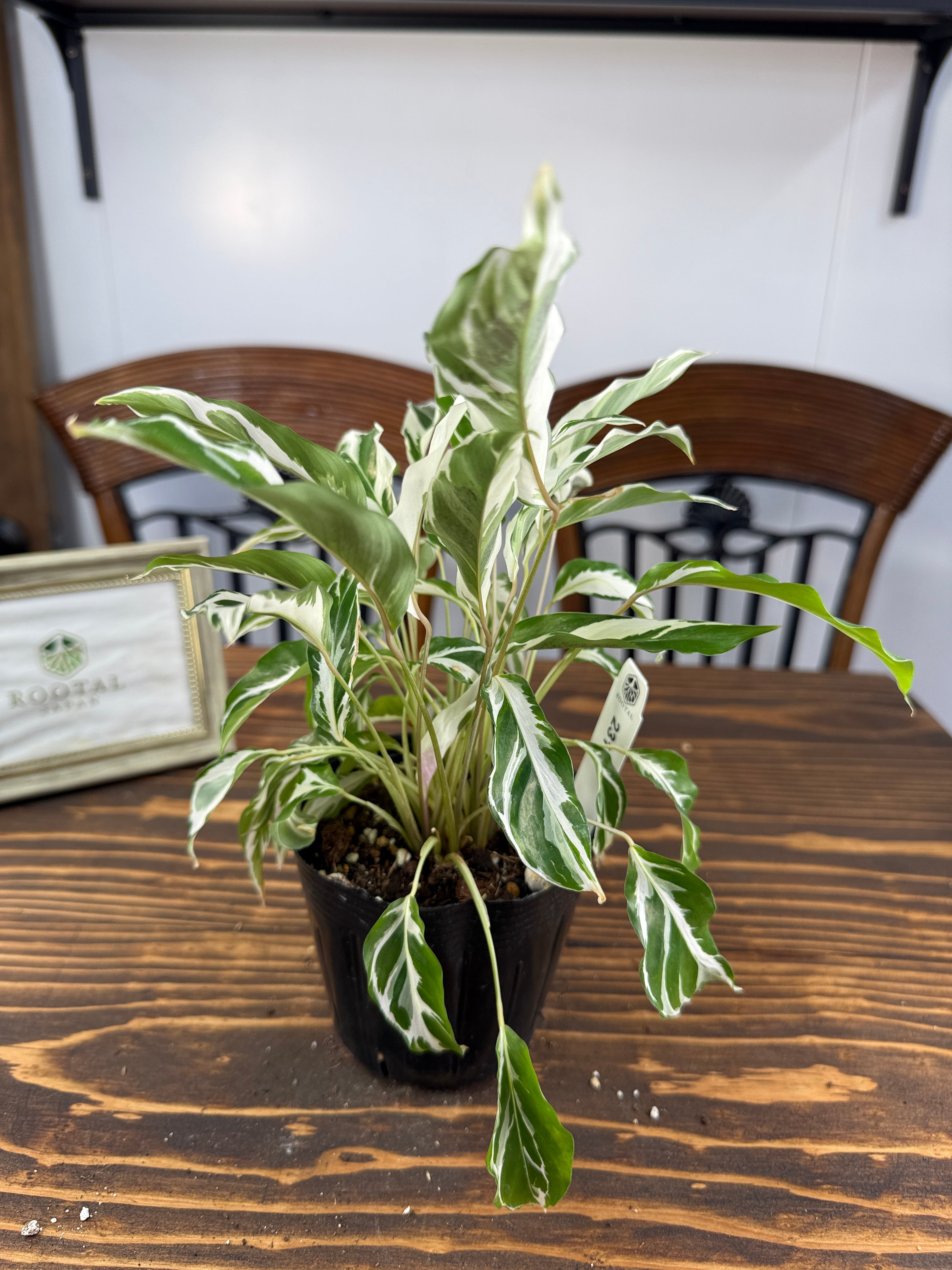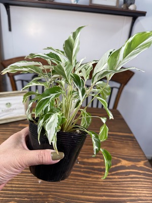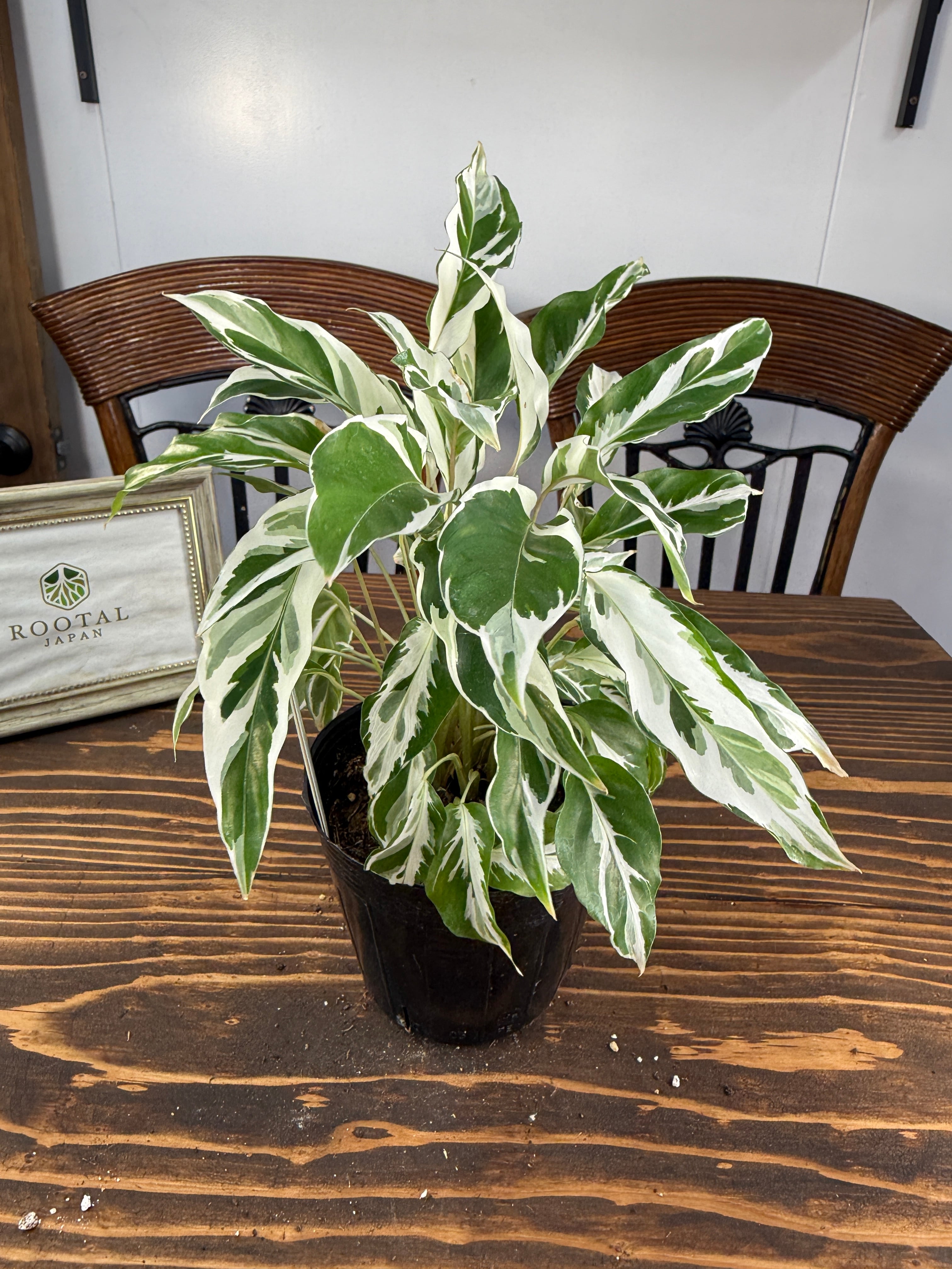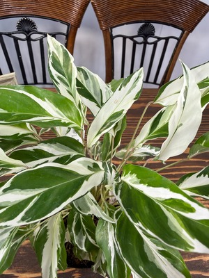 カラテア ホワイトフュージョンの葉は、明るい緑に美しい白の模様が施され、目を引く一品です。健康的で美しい3.5号ポットの苗をご用意しており、特別なグリーンとして楽しんでいただけます。