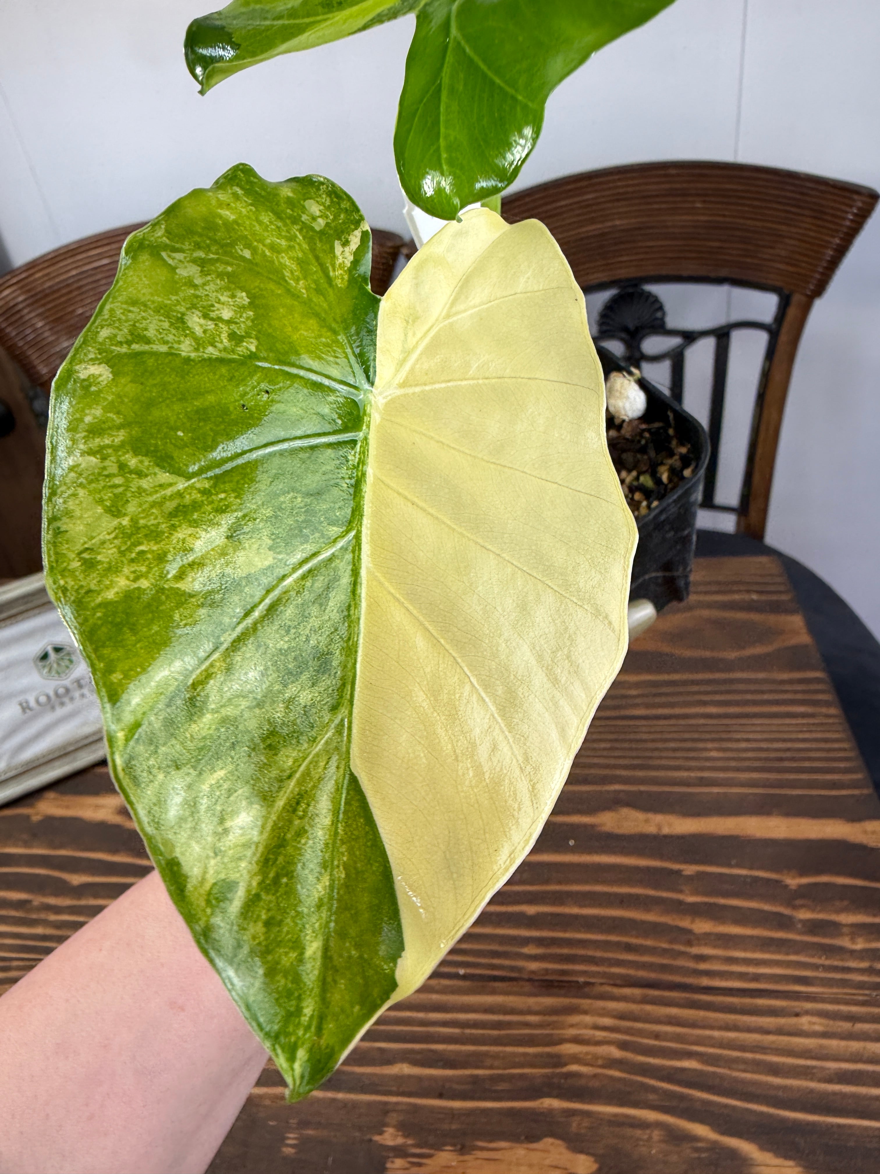 アロカシア ガゲアナオーレア バリエガータは、深い緑と明るいクリーム色の斑が調和した魅力的な葉を持ち、圧倒的な存在感を放つ一品です。健康的で美しい2.5号ロング硬質ポットの苗をお届けし、特別なグリーンとしてお楽しみいただけます。