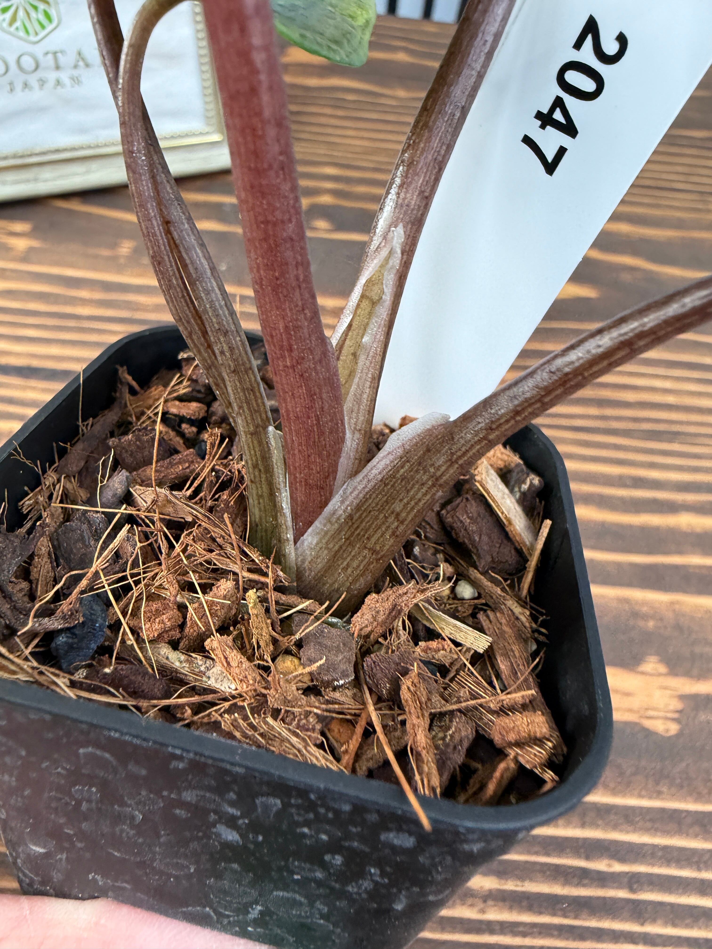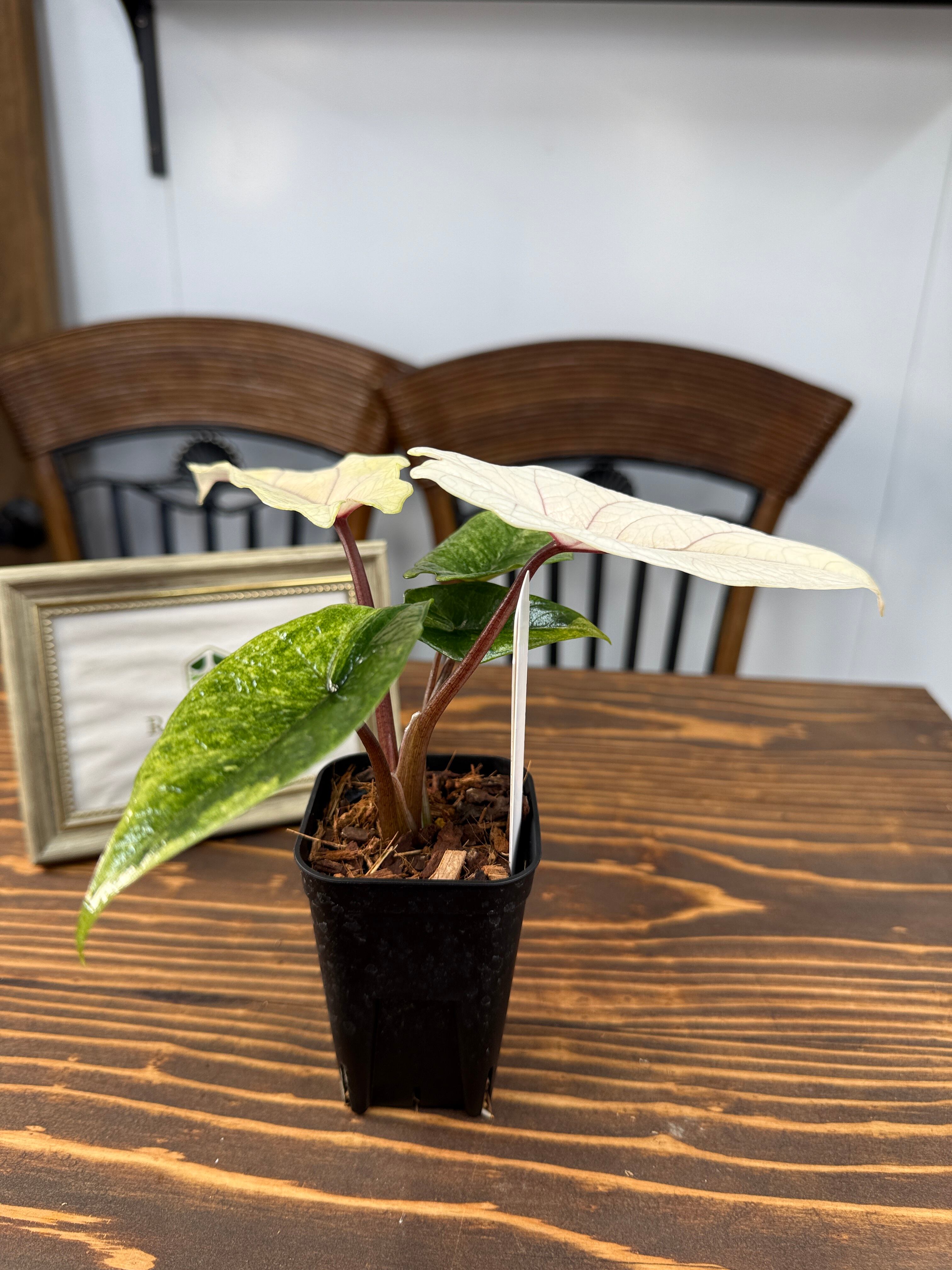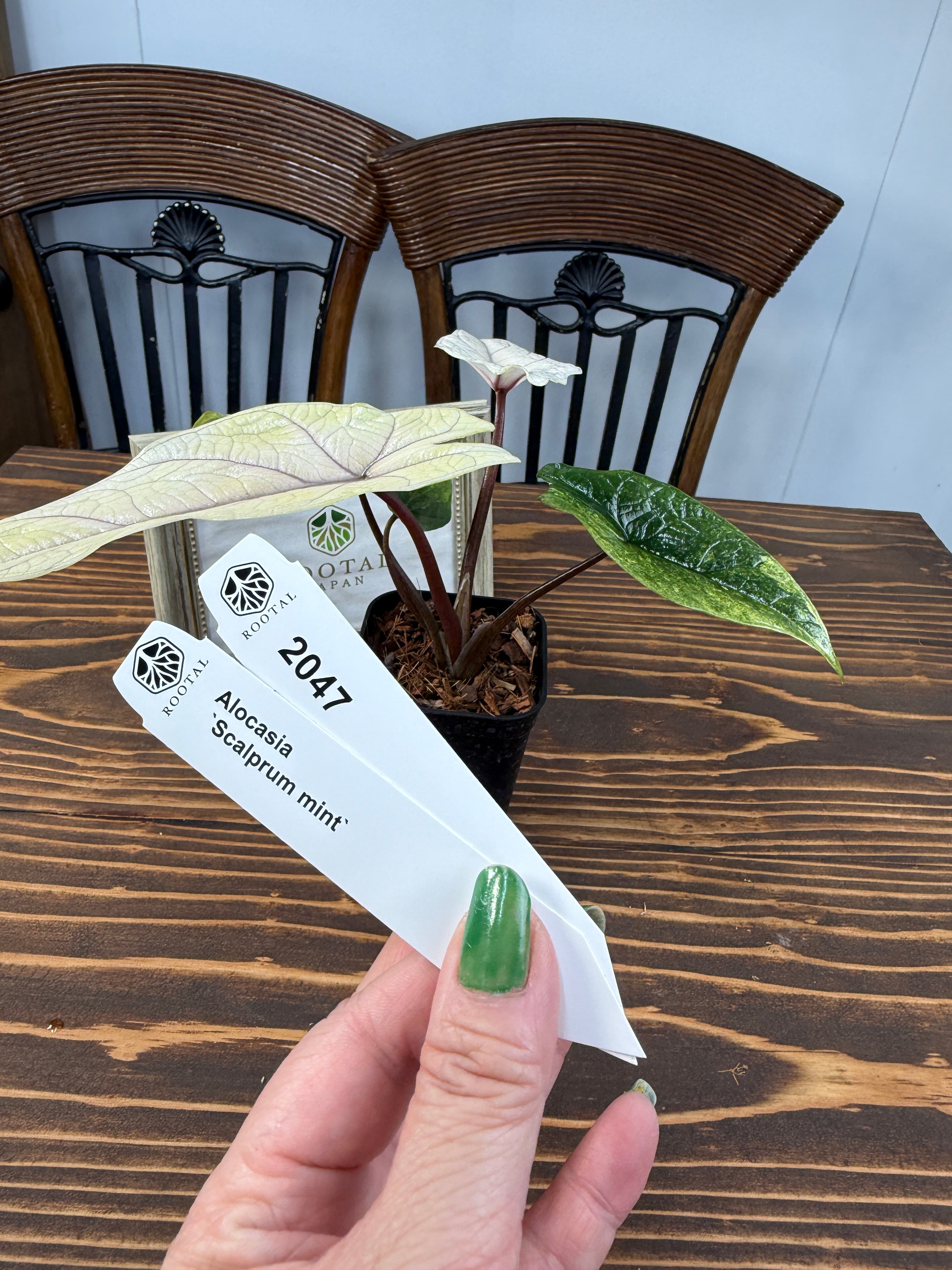 アロカシア スカルプラム ミント、健康的に育てられた苗2.5号ロング硬質ポットでお届けします。各株に個性があり、成長するにつれて魅力を増し、あなたのお部屋に特有の存在感をもたらします。