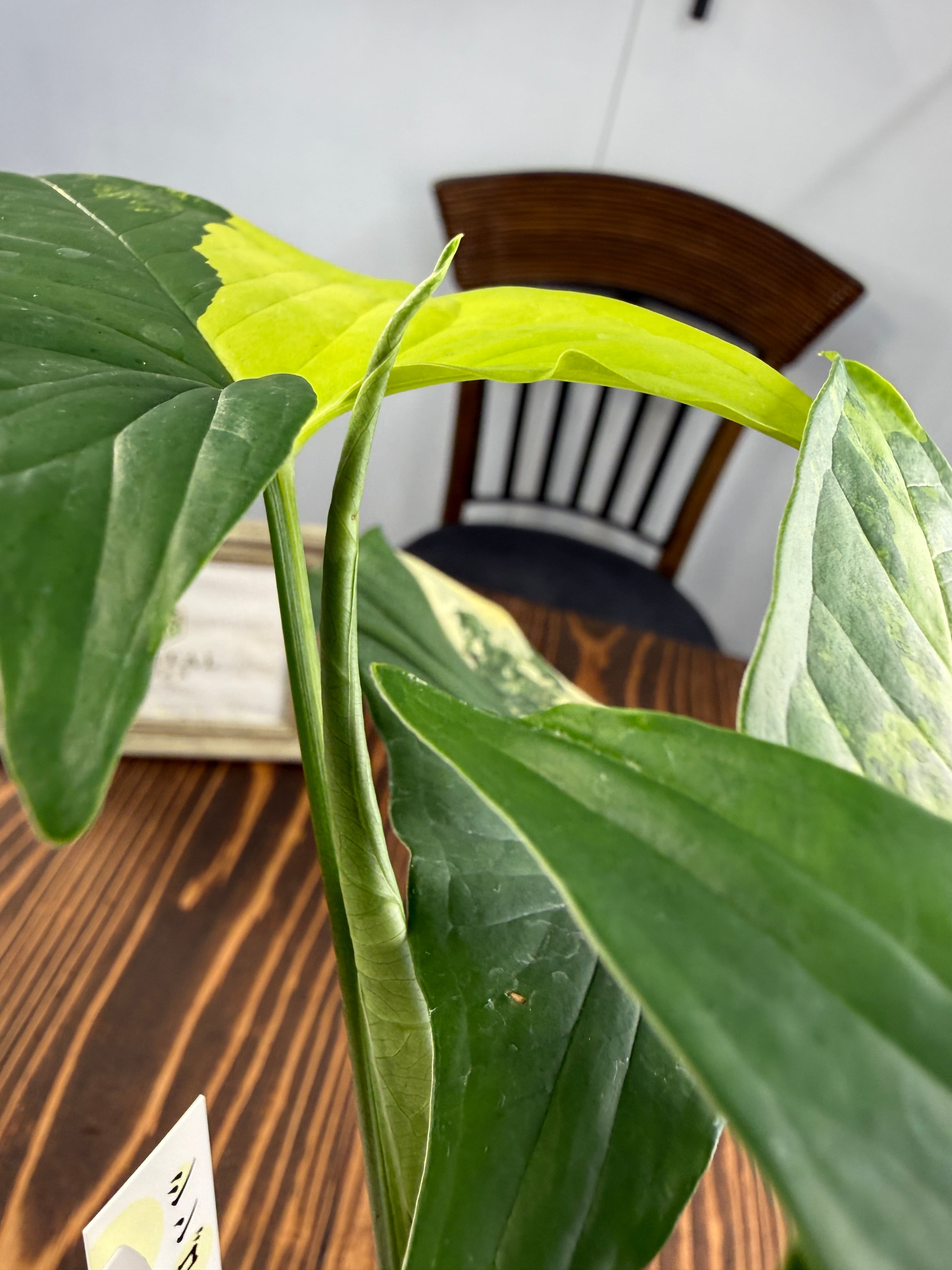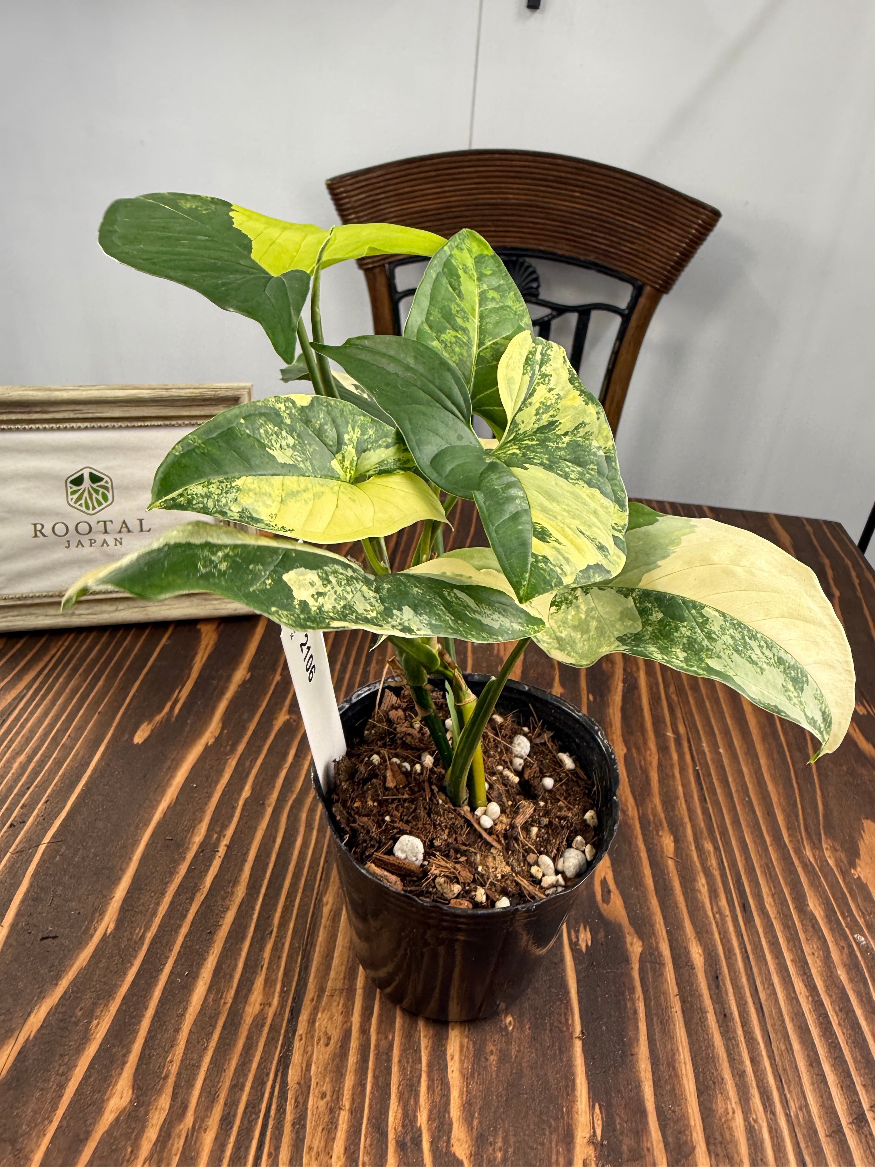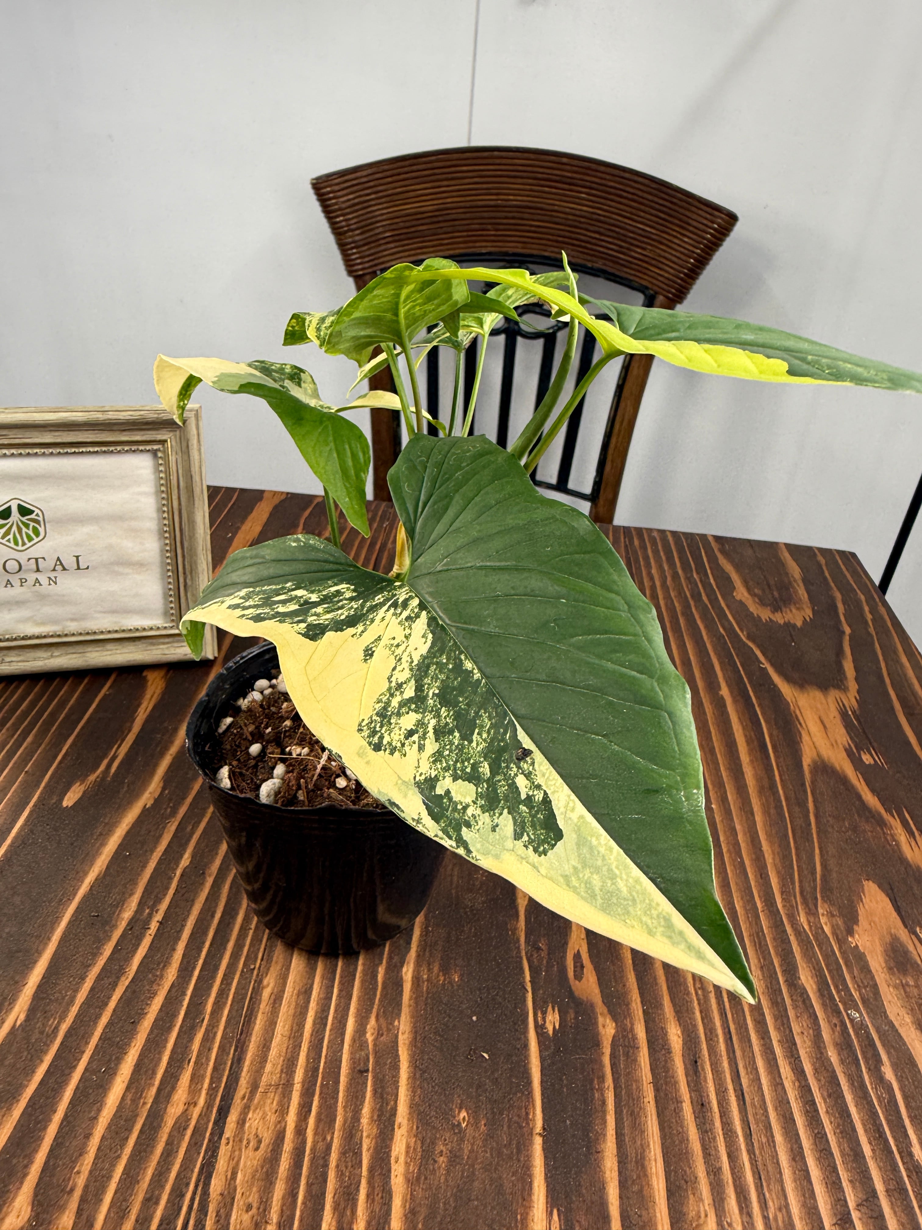 シンゴニウム カリフォルニアゴールドの葉は、深い緑とクリーミーな白が見事に交わり、どんなインテリアにも品のある魅力を加えます。出荷は3号ポットで、コンパクトながらも存在感のある健康的な苗をお届けいたします。