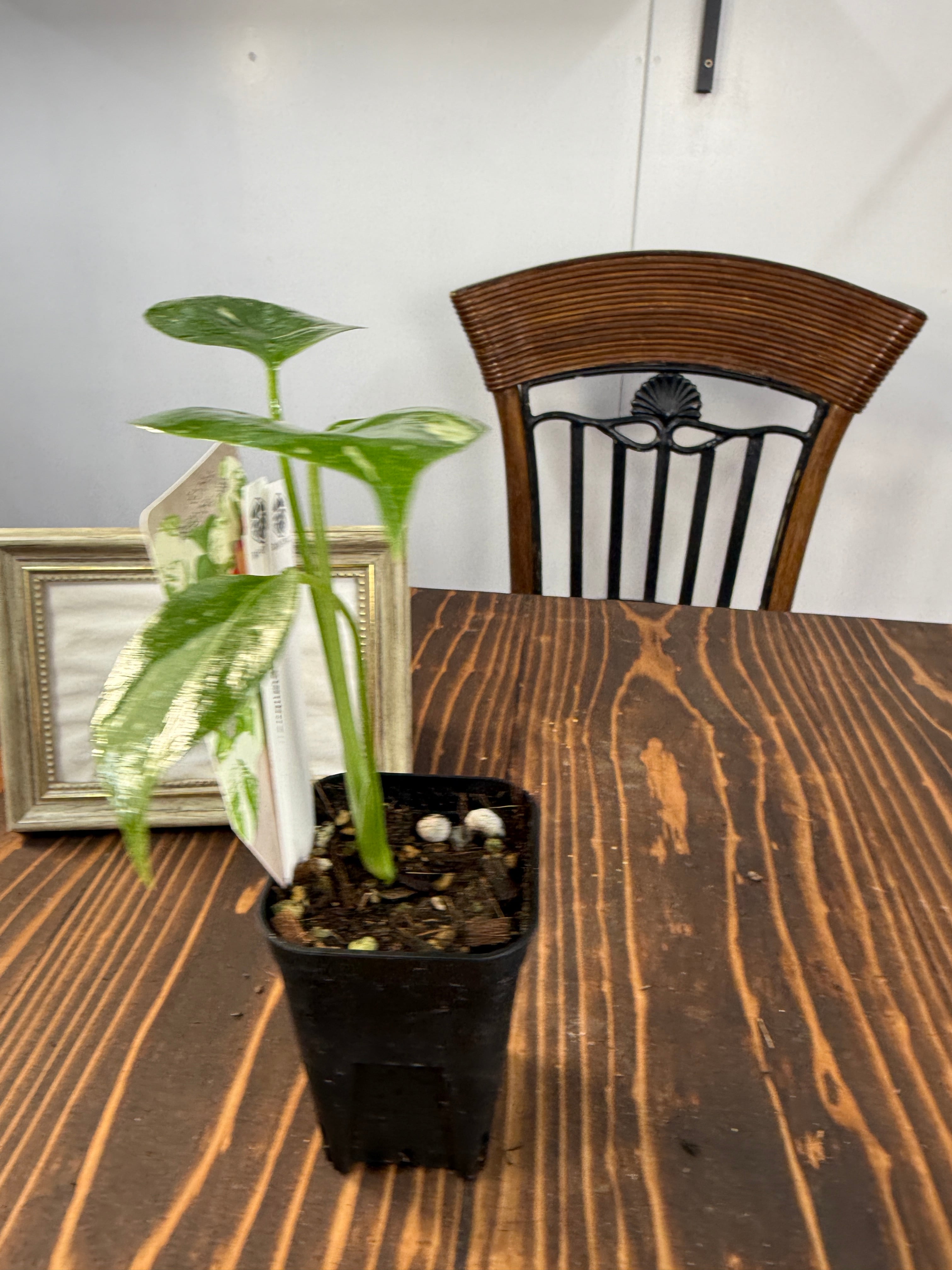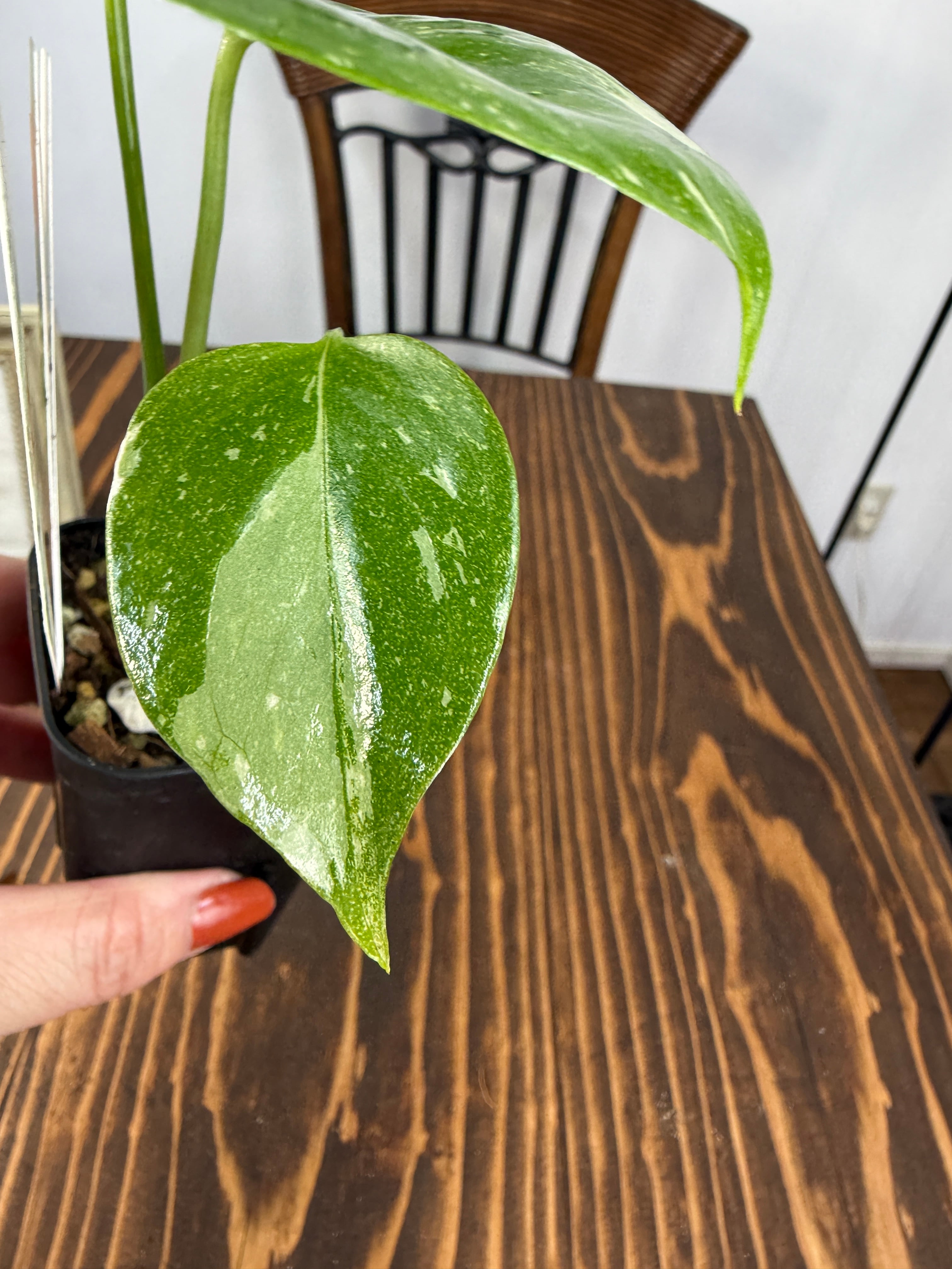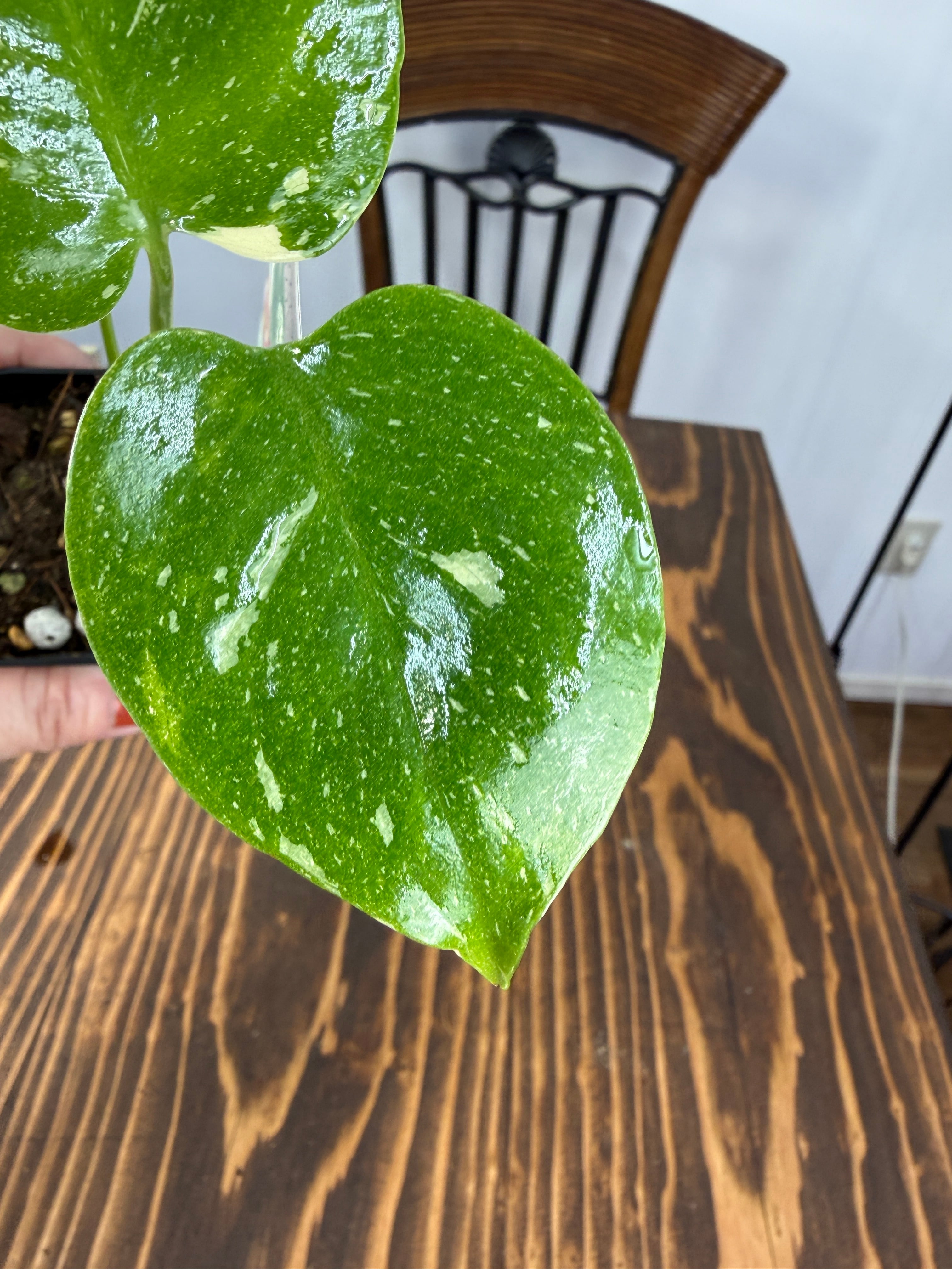 モンステラ タイコンステレーション コンパクタの葉は、ユニークなバリエガータが印象的で、成長段階によってその美しさが変わります。出荷時のサイズはおおよそ20㎝程度で、かわいらしいベビー苗をお届けいたします。