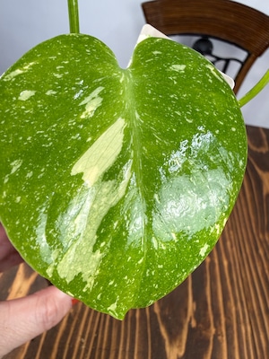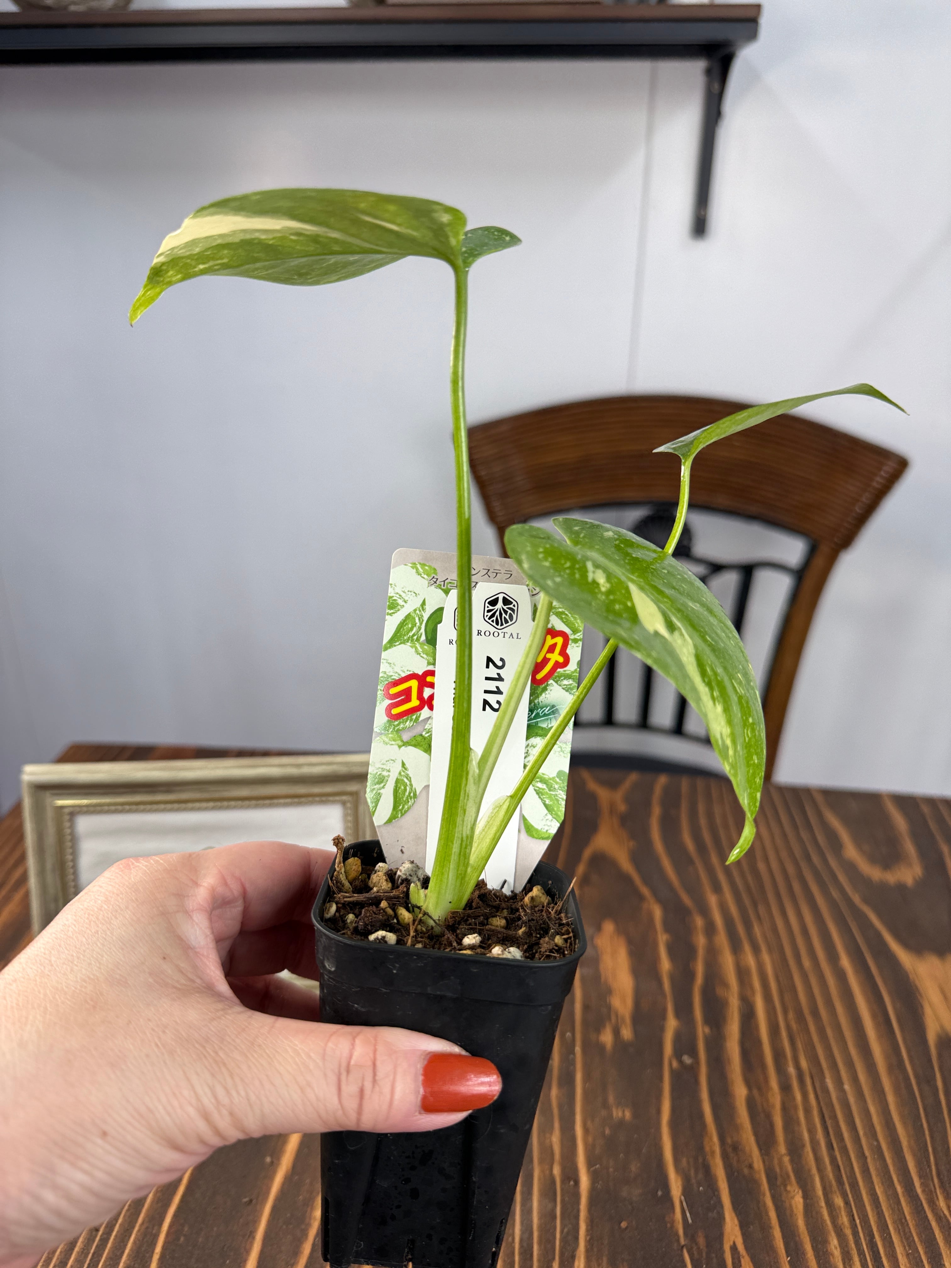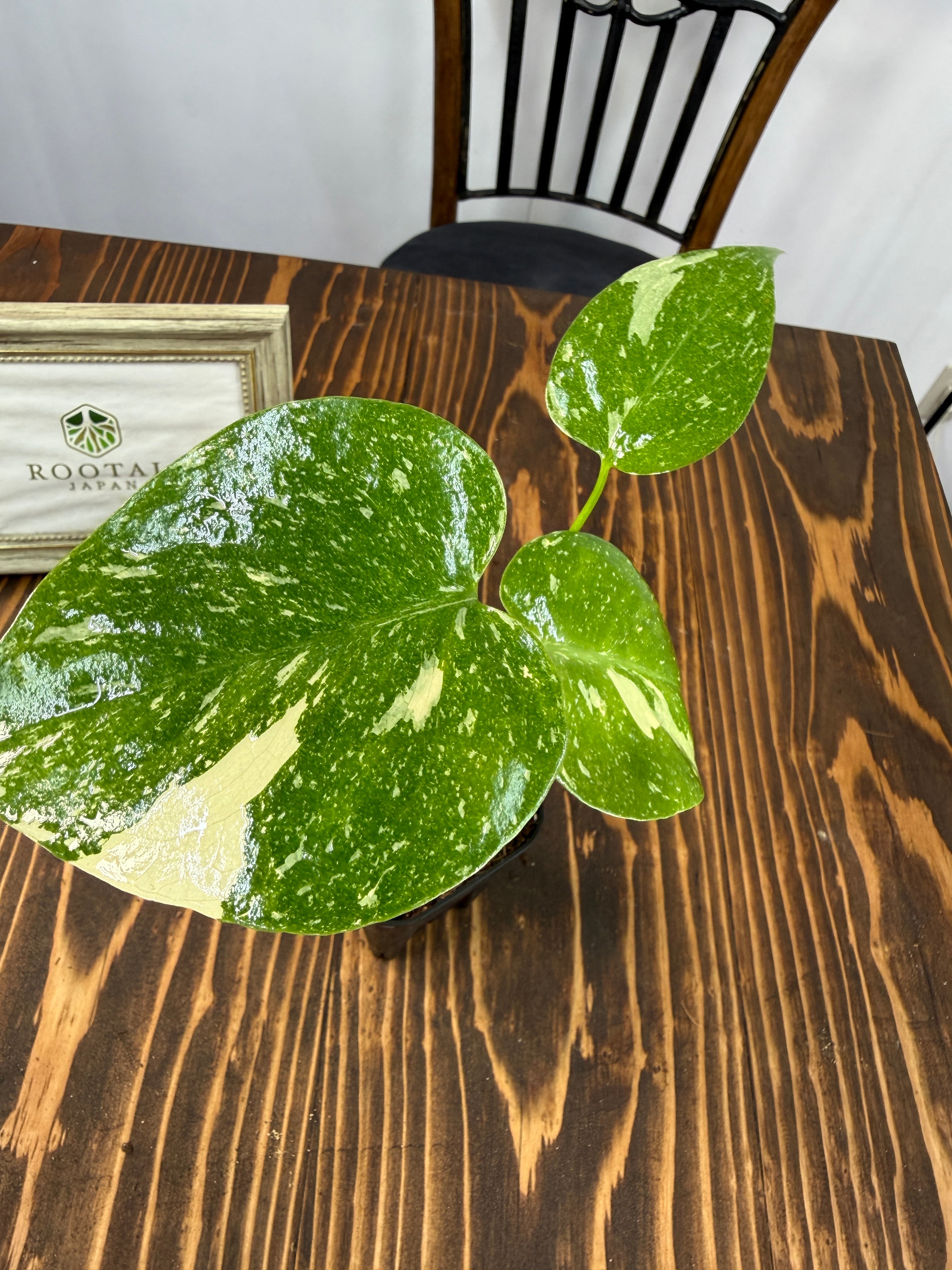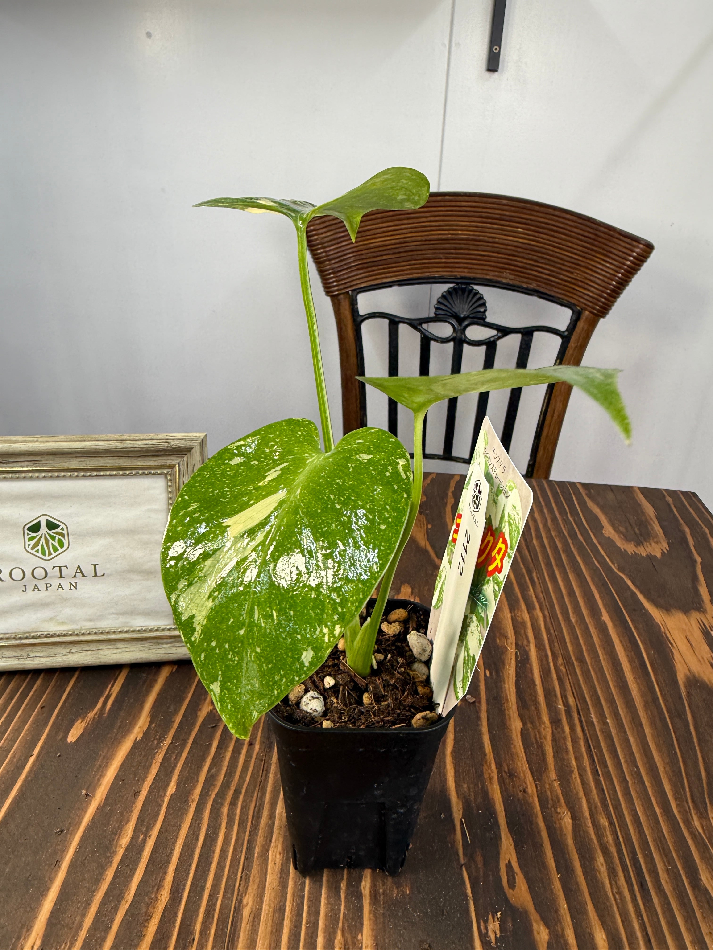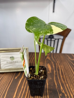 モンステラ タイコンステレーション コンパクタの葉は、ユニークなバリエガータが印象的で、成長段階によってその美しさが変わります。出荷時のサイズはおおよそ20㎝程度で、かわいらしいベビー苗をお届けいたします。