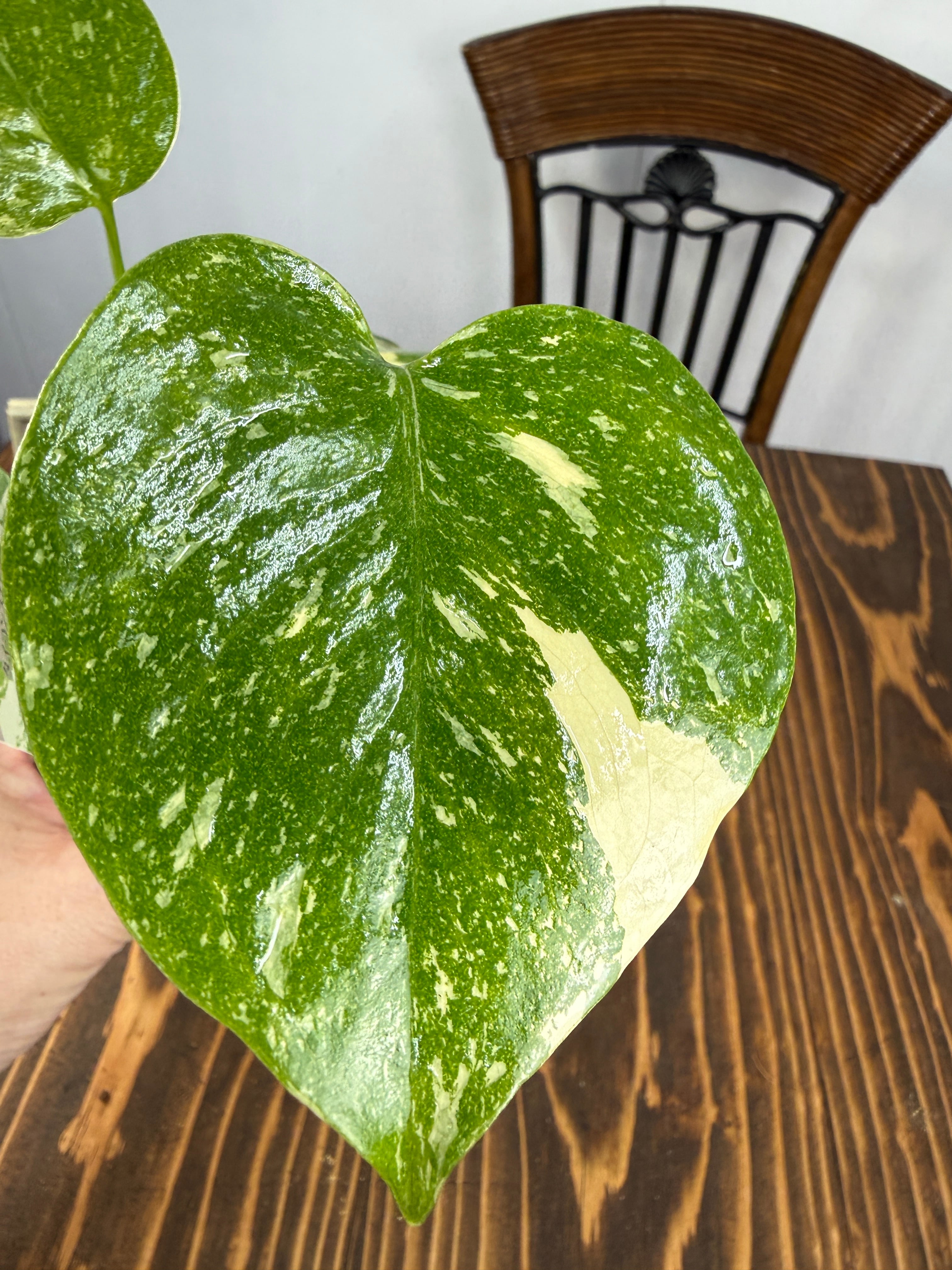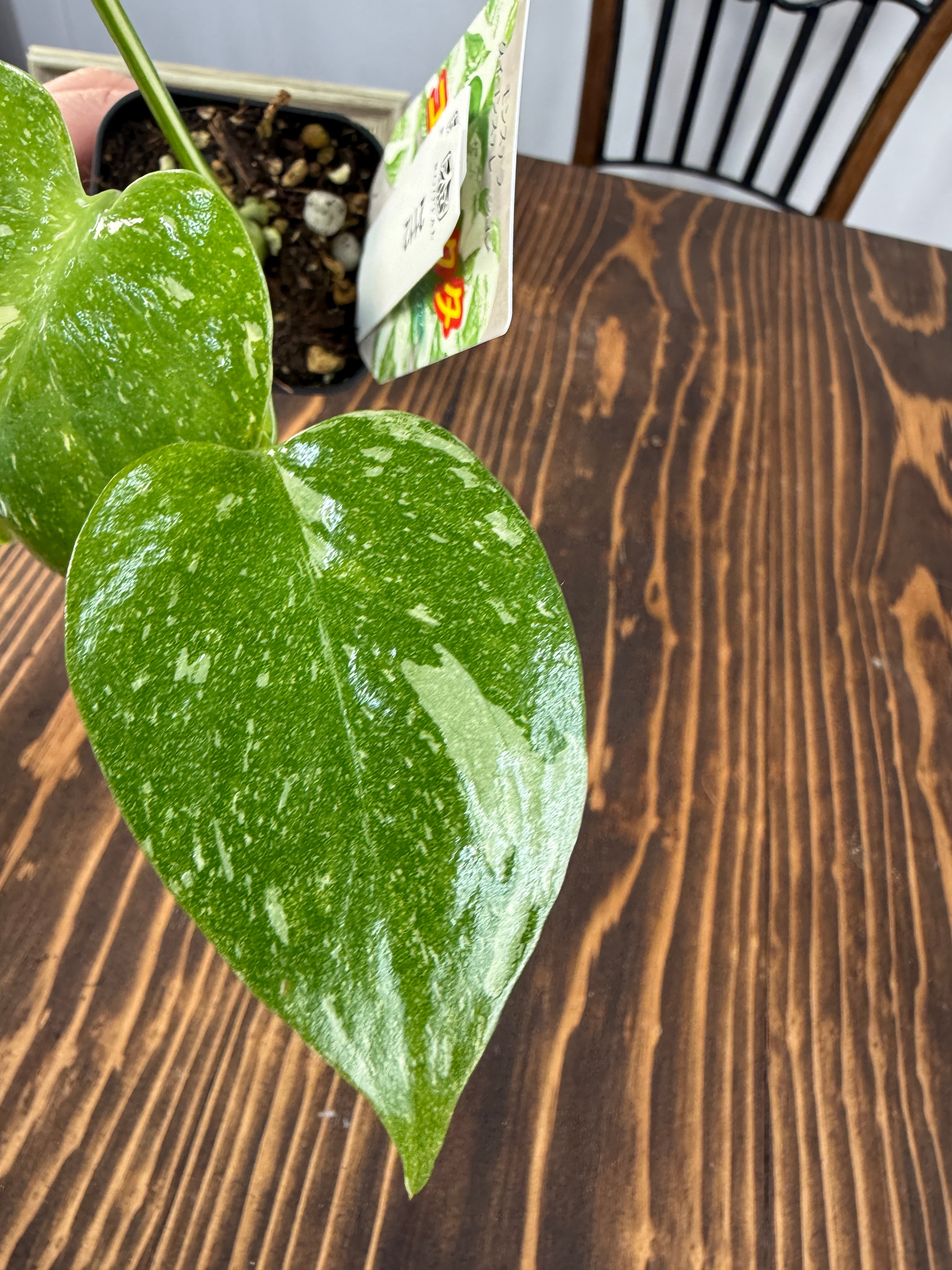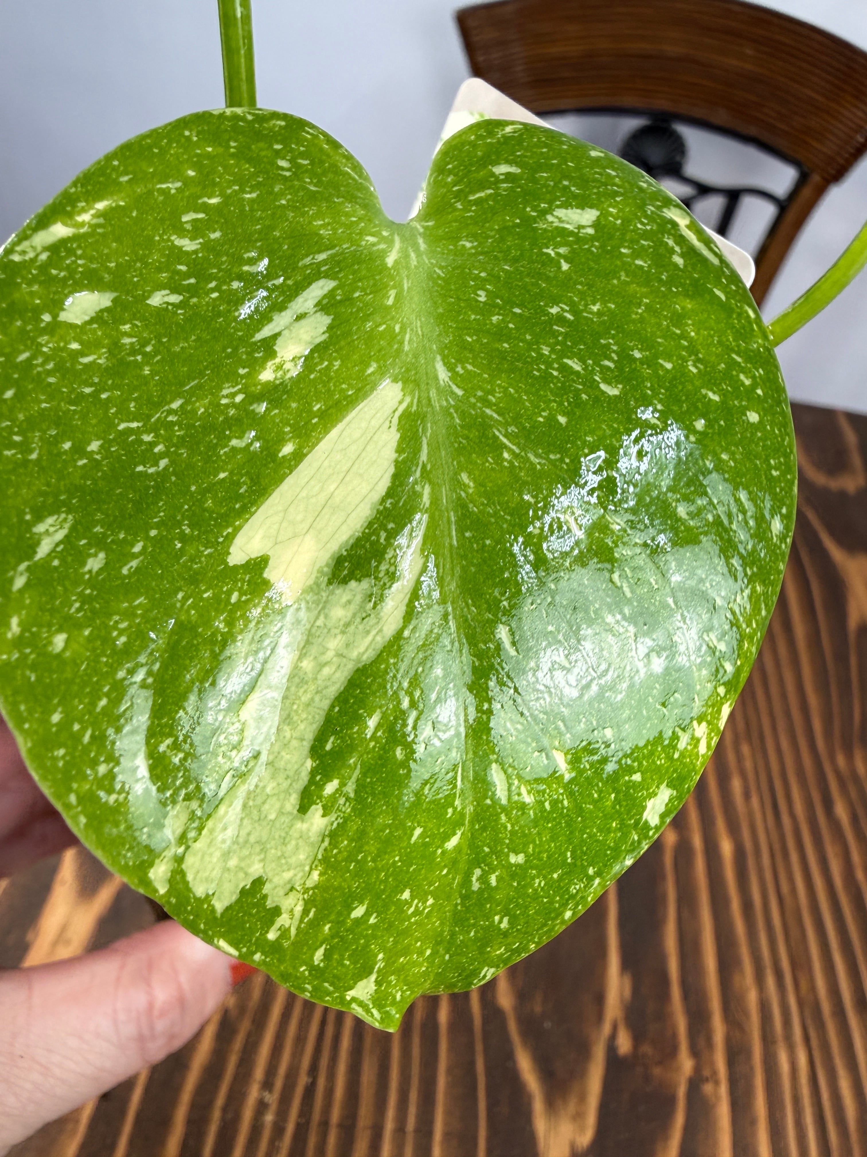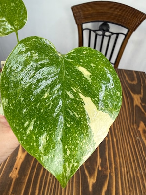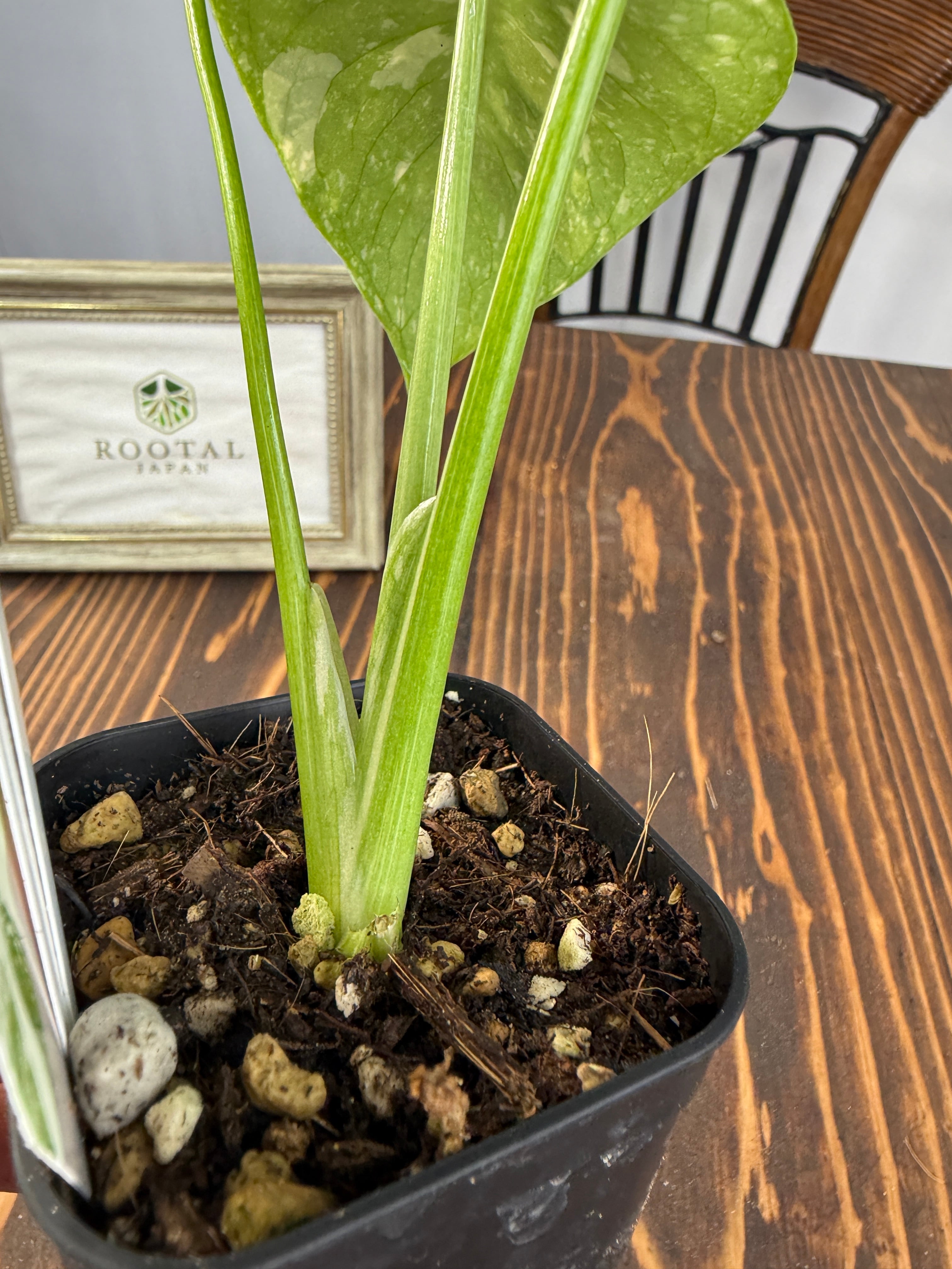 モンステラ タイコンステレーション コンパクタの葉は、ユニークなバリエガータが印象的で、成長段階によってその美しさが変わります。出荷時のサイズはおおよそ20㎝程度で、かわいらしいベビー苗をお届けいたします。