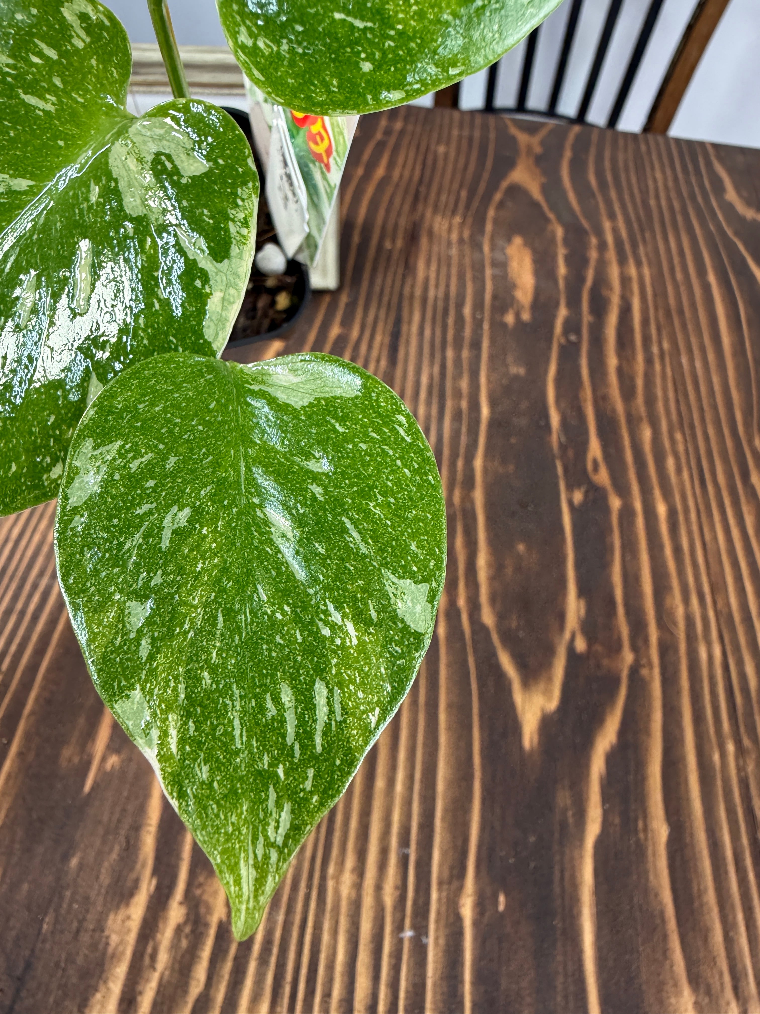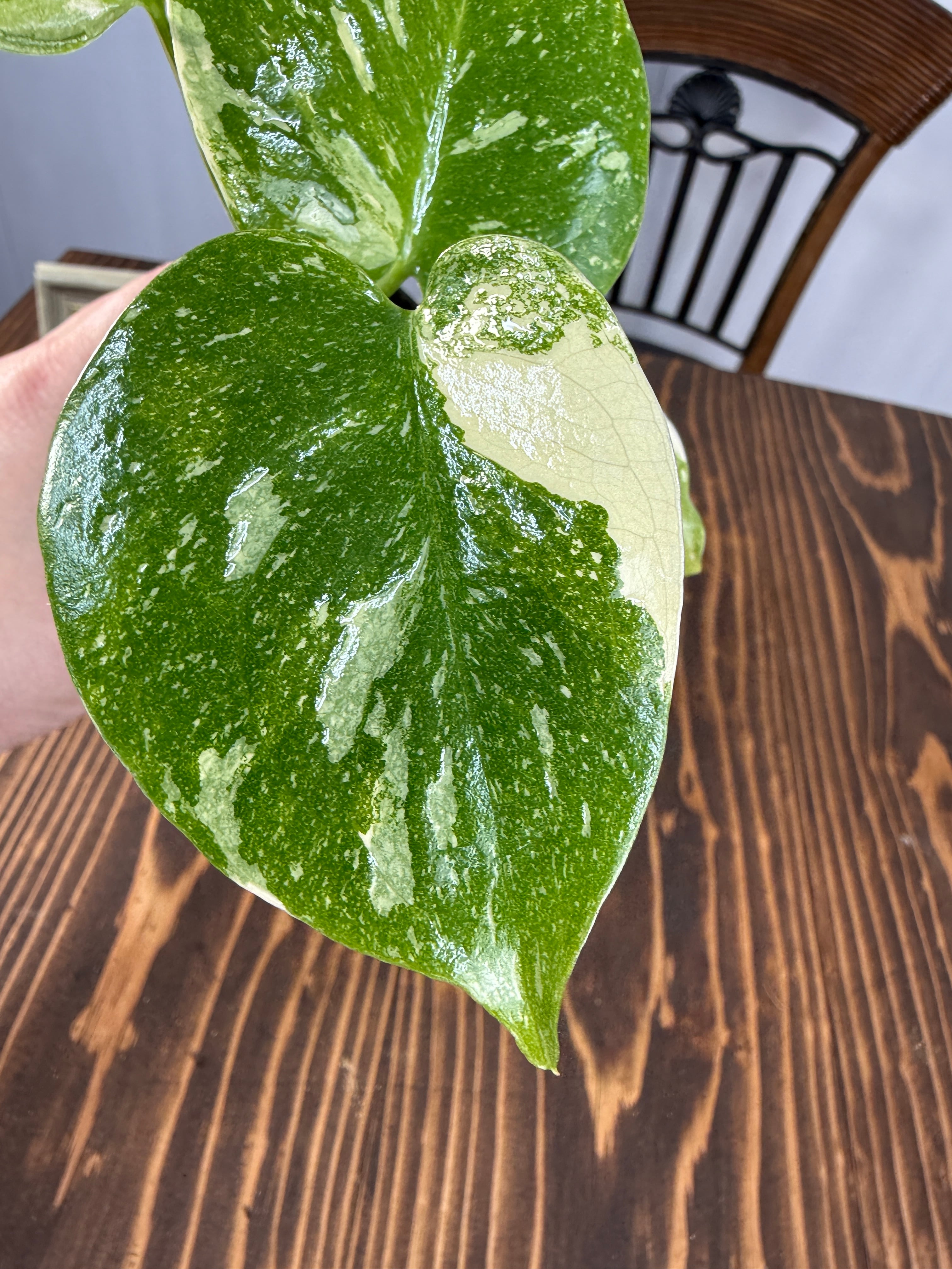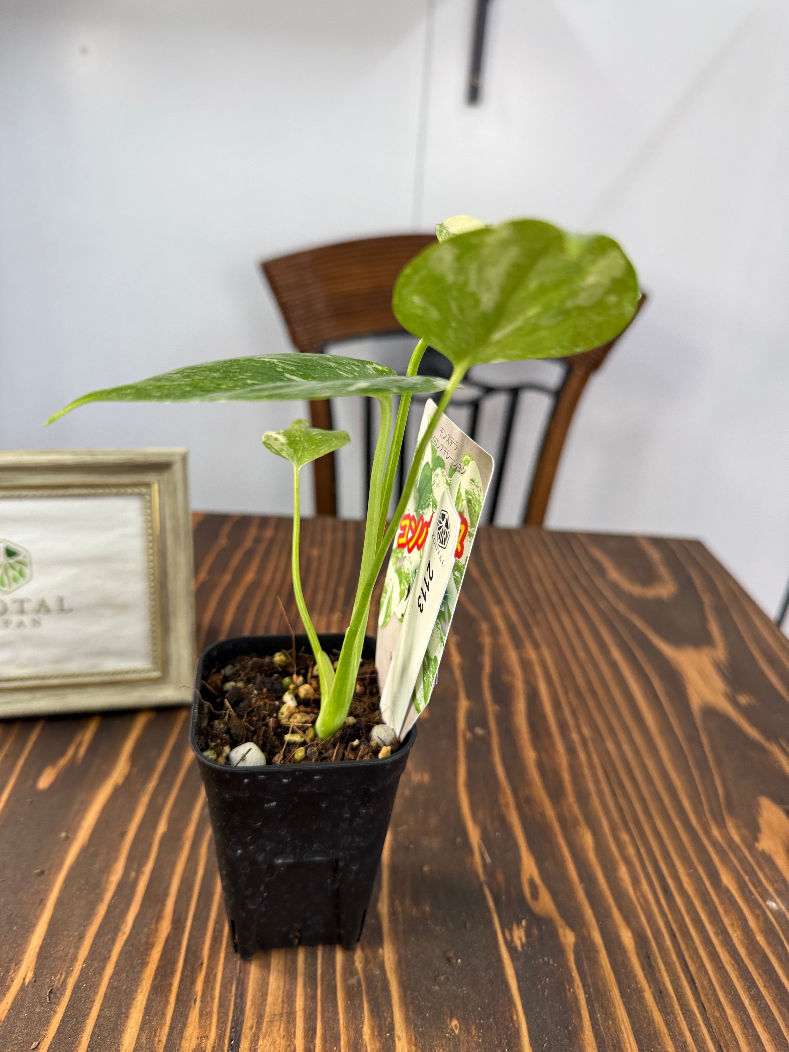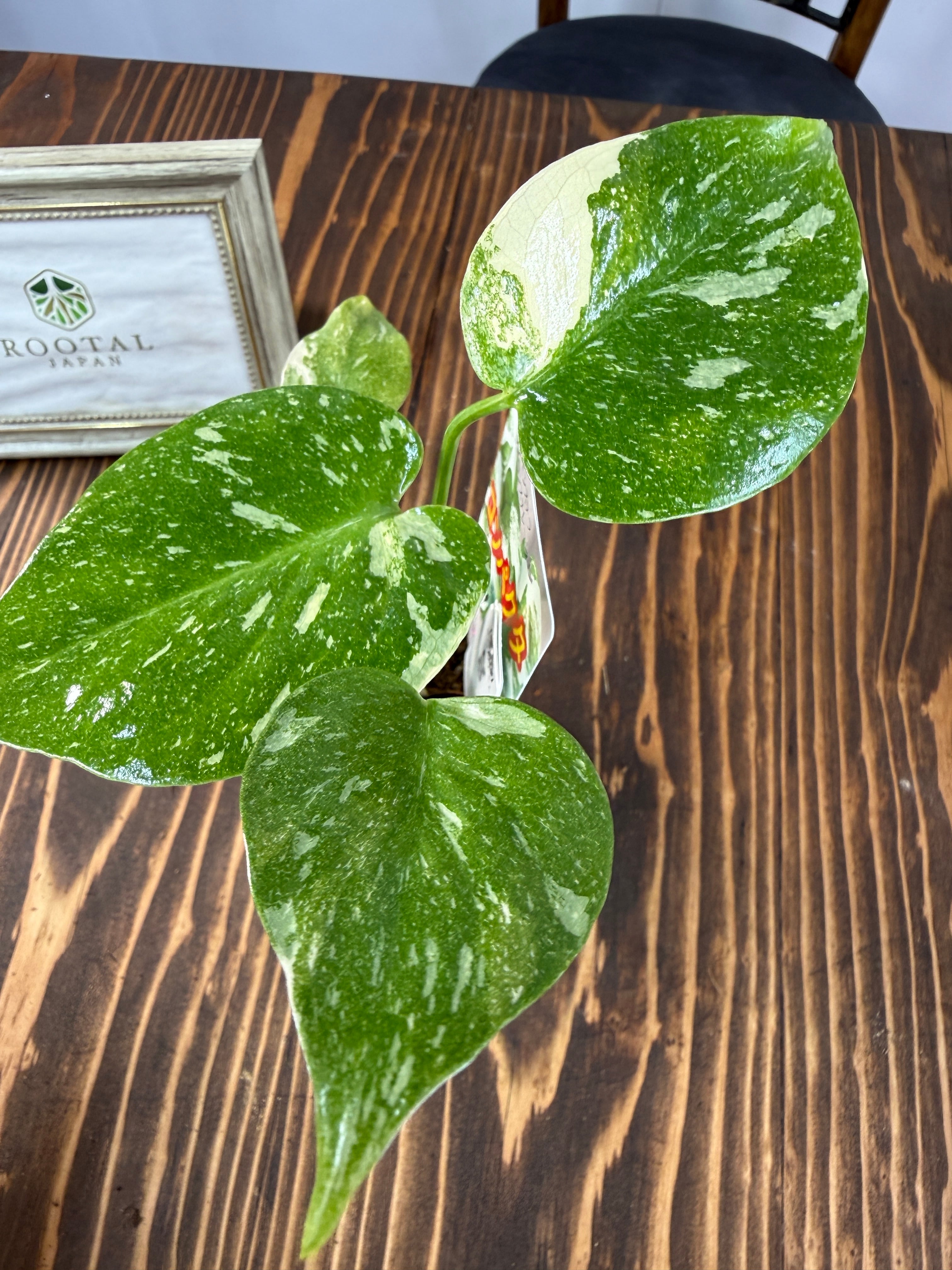 モンステラ タイコンステレーション コンパクタの葉は、ユニークなバリエガータが印象的で、成長段階によってその美しさが変わります。出荷時のサイズはおおよそ20㎝程度で、かわいらしいベビー苗をお届けいたします。