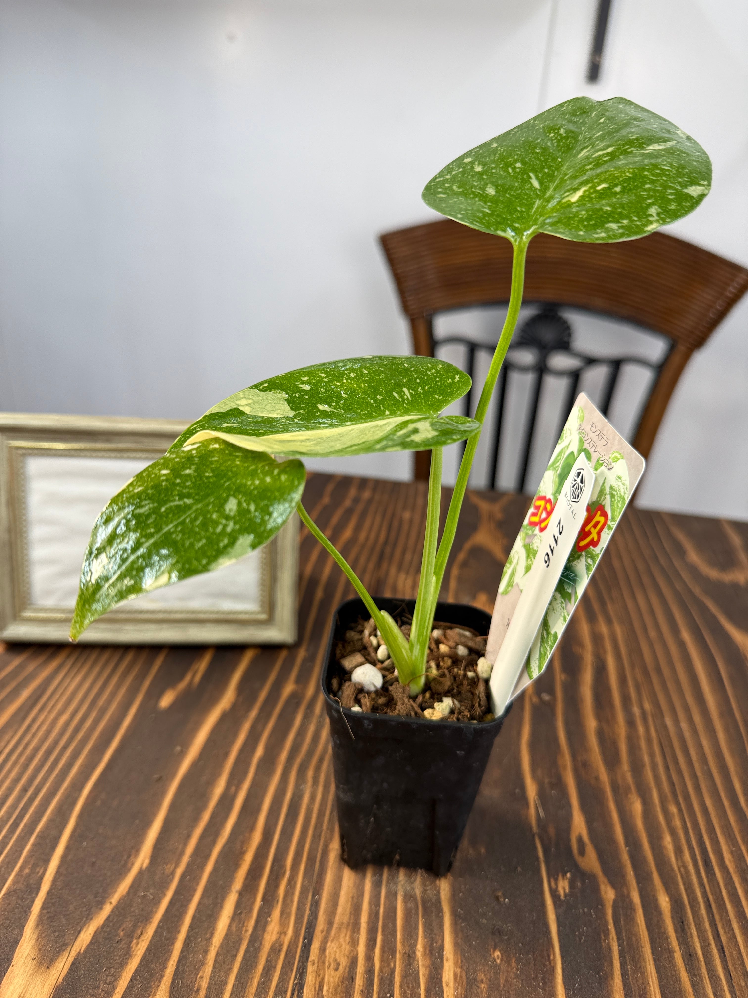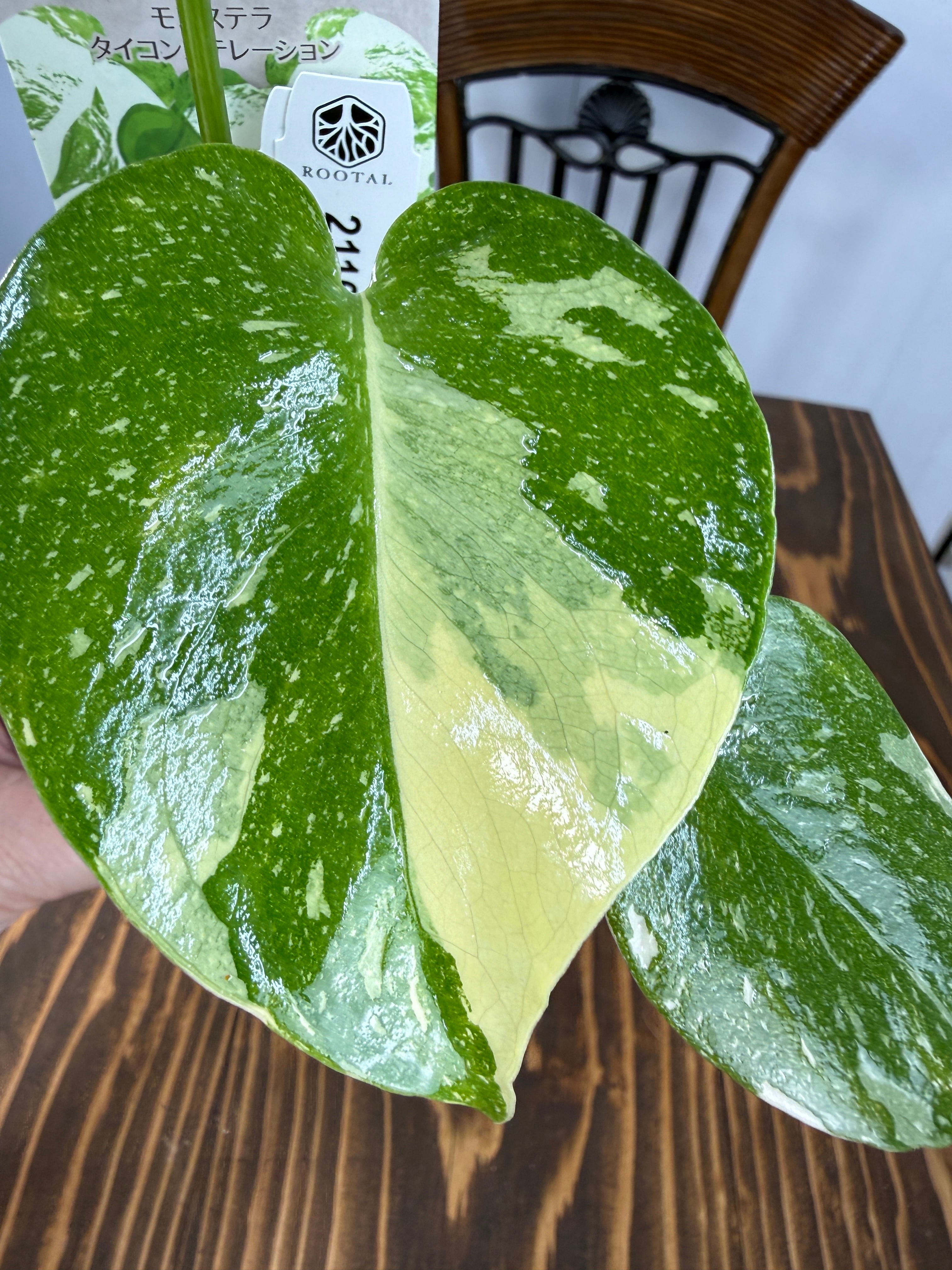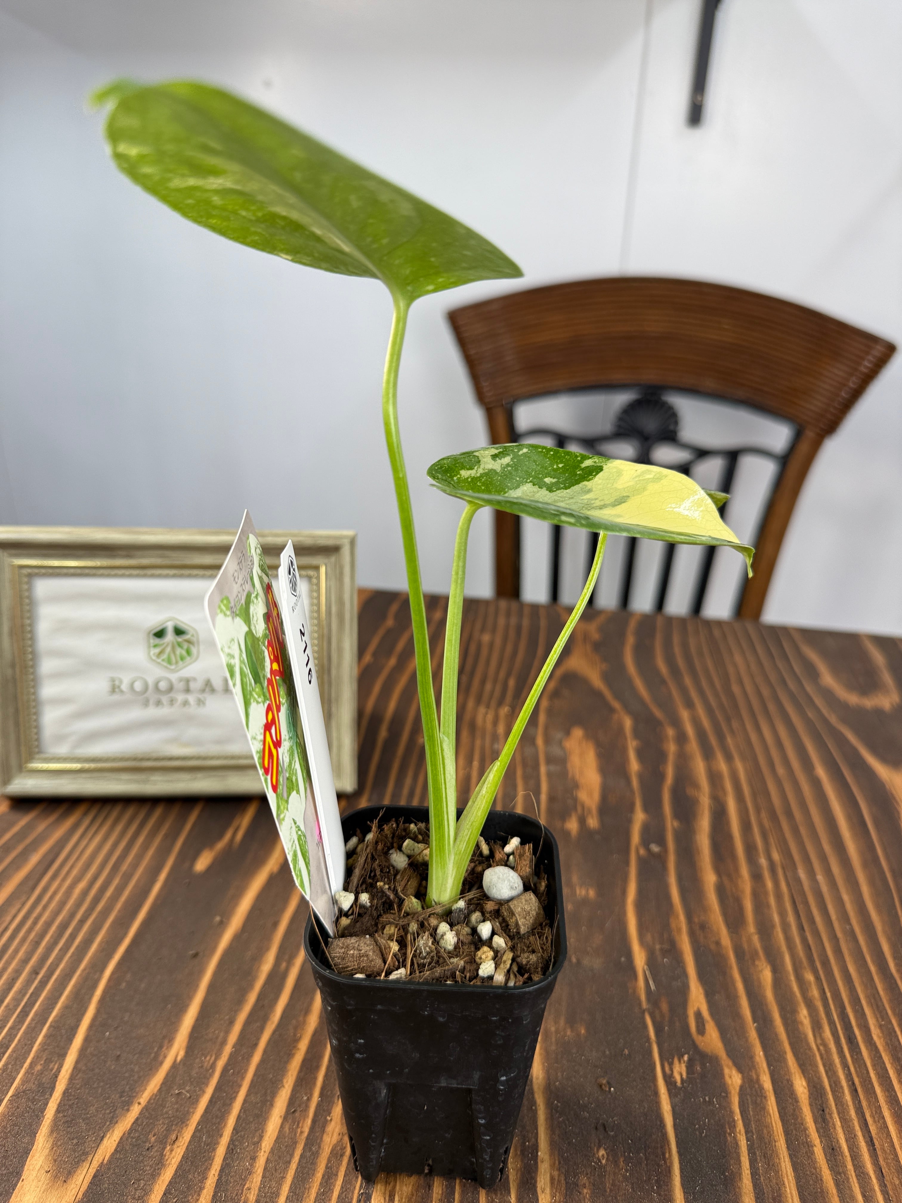 モンステラ タイコンステレーション コンパクタの葉は、ユニークなバリエガータが印象的で、成長段階によってその美しさが変わります。出荷時のサイズはおおよそ20㎝程度で、かわいらしいベビー苗をお届けいたします。