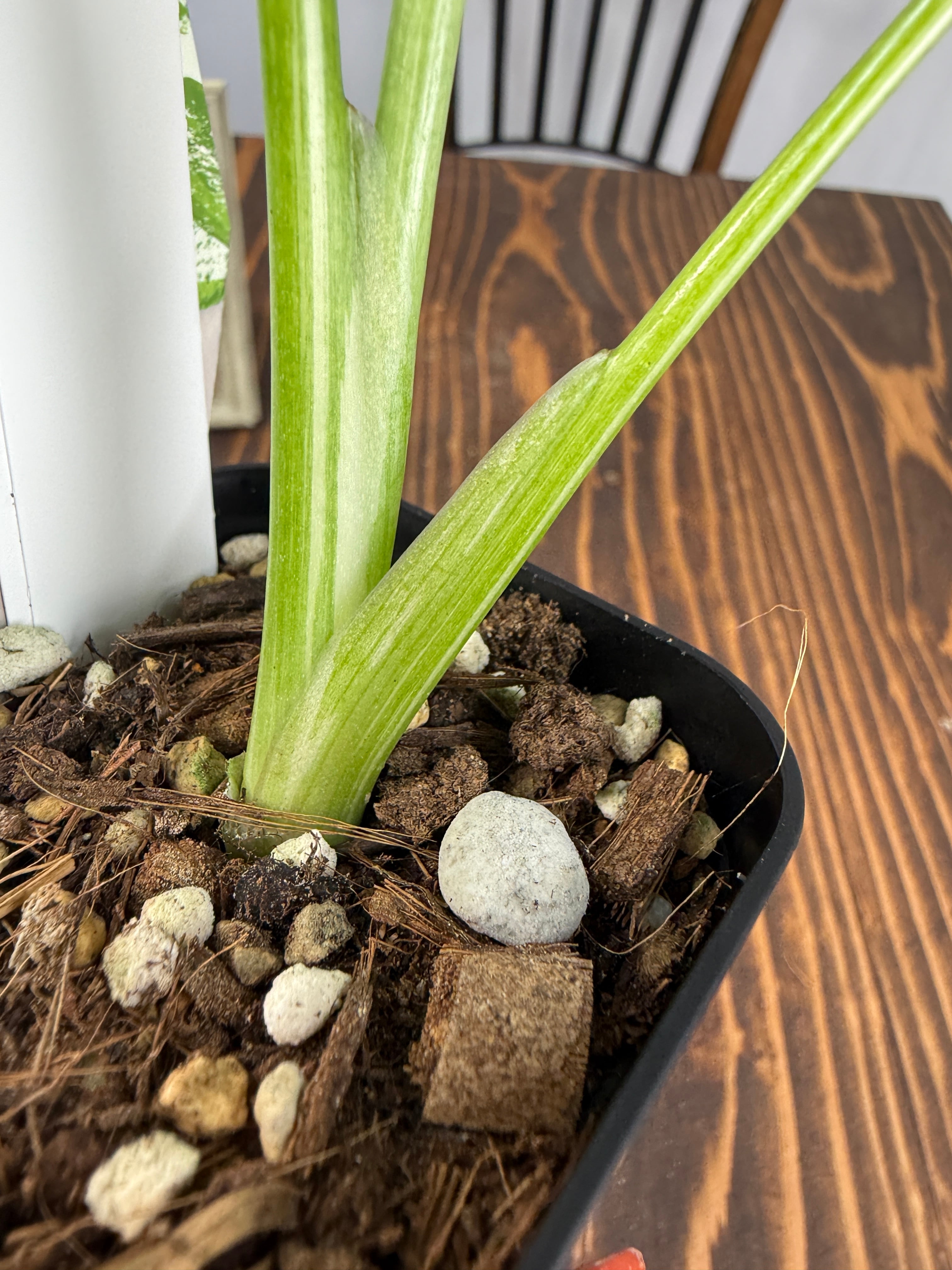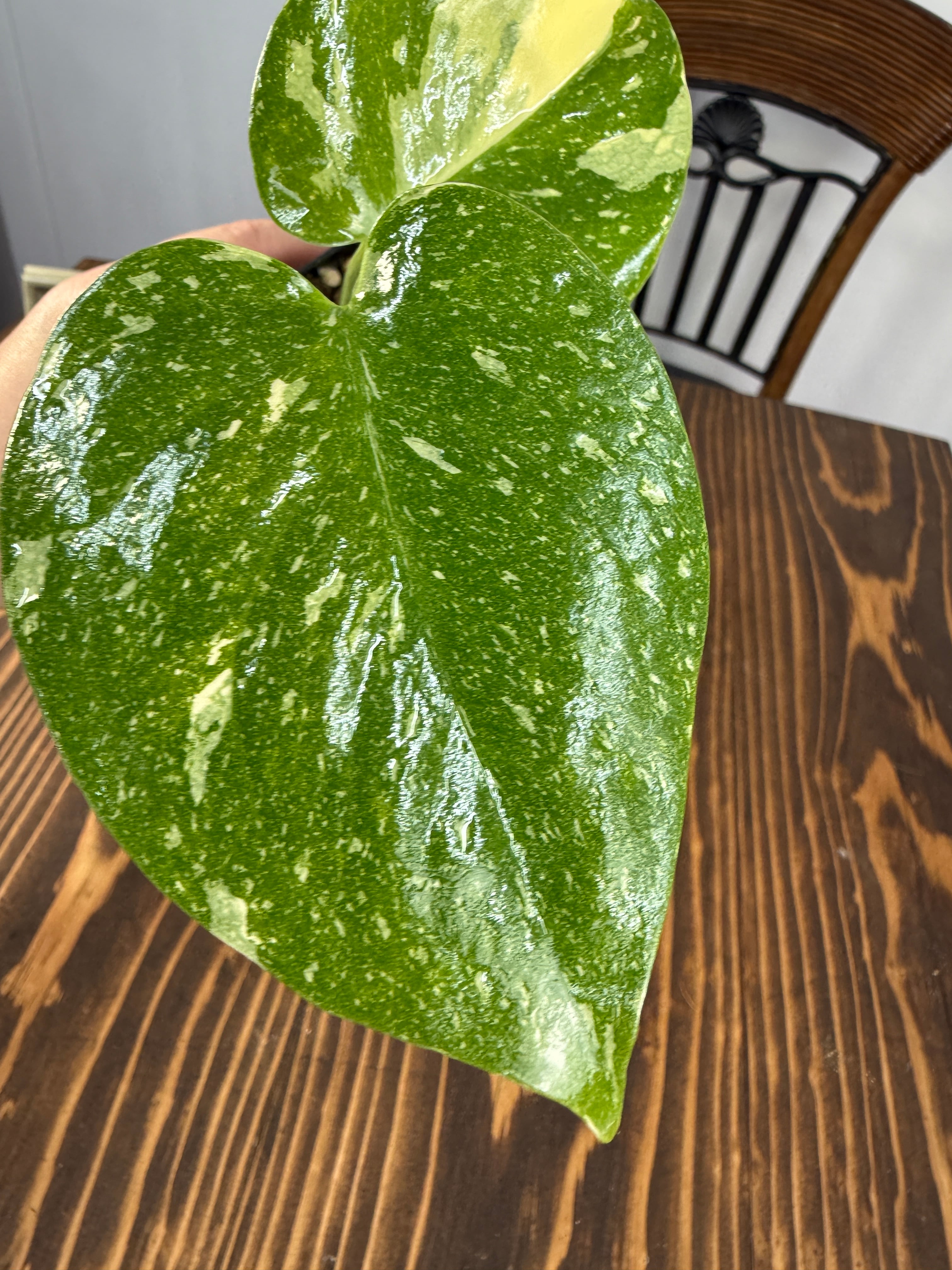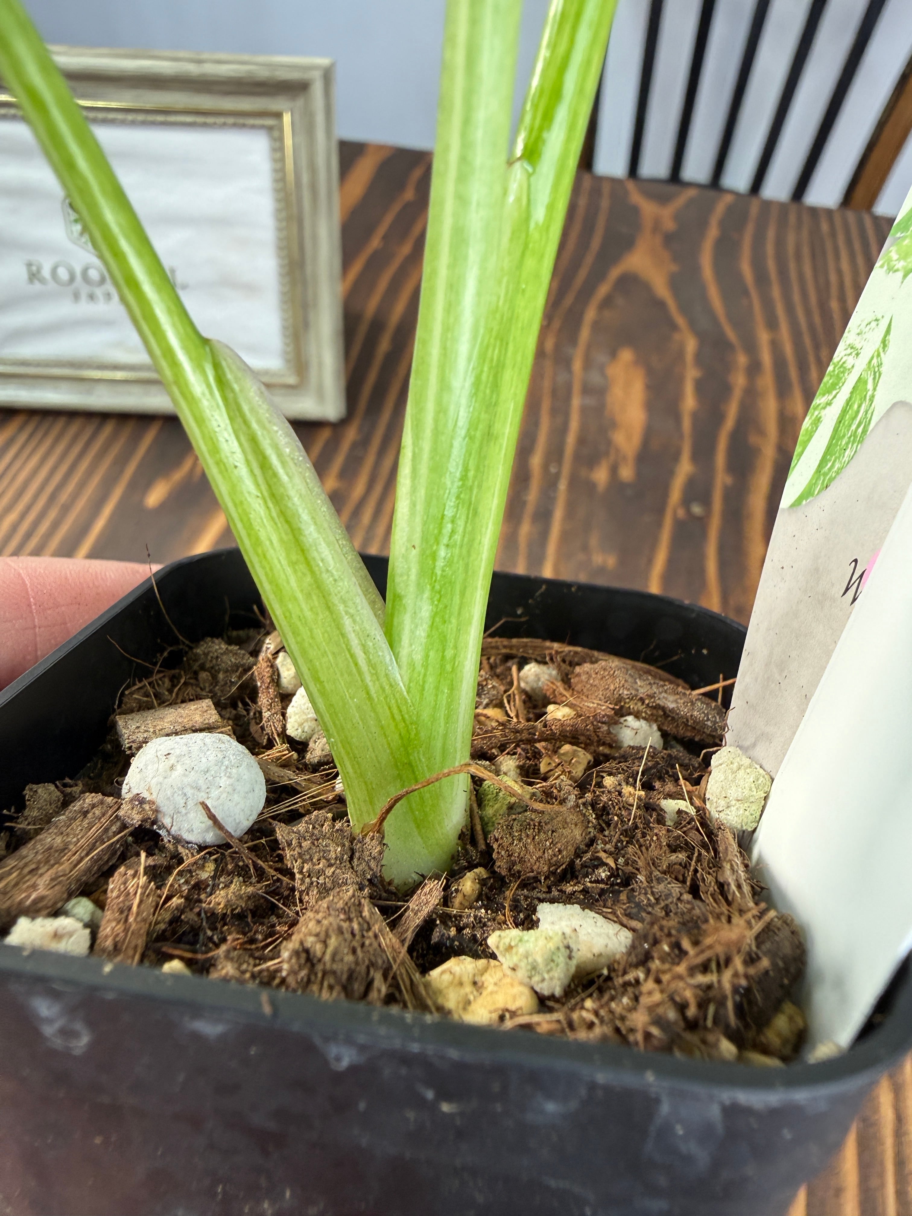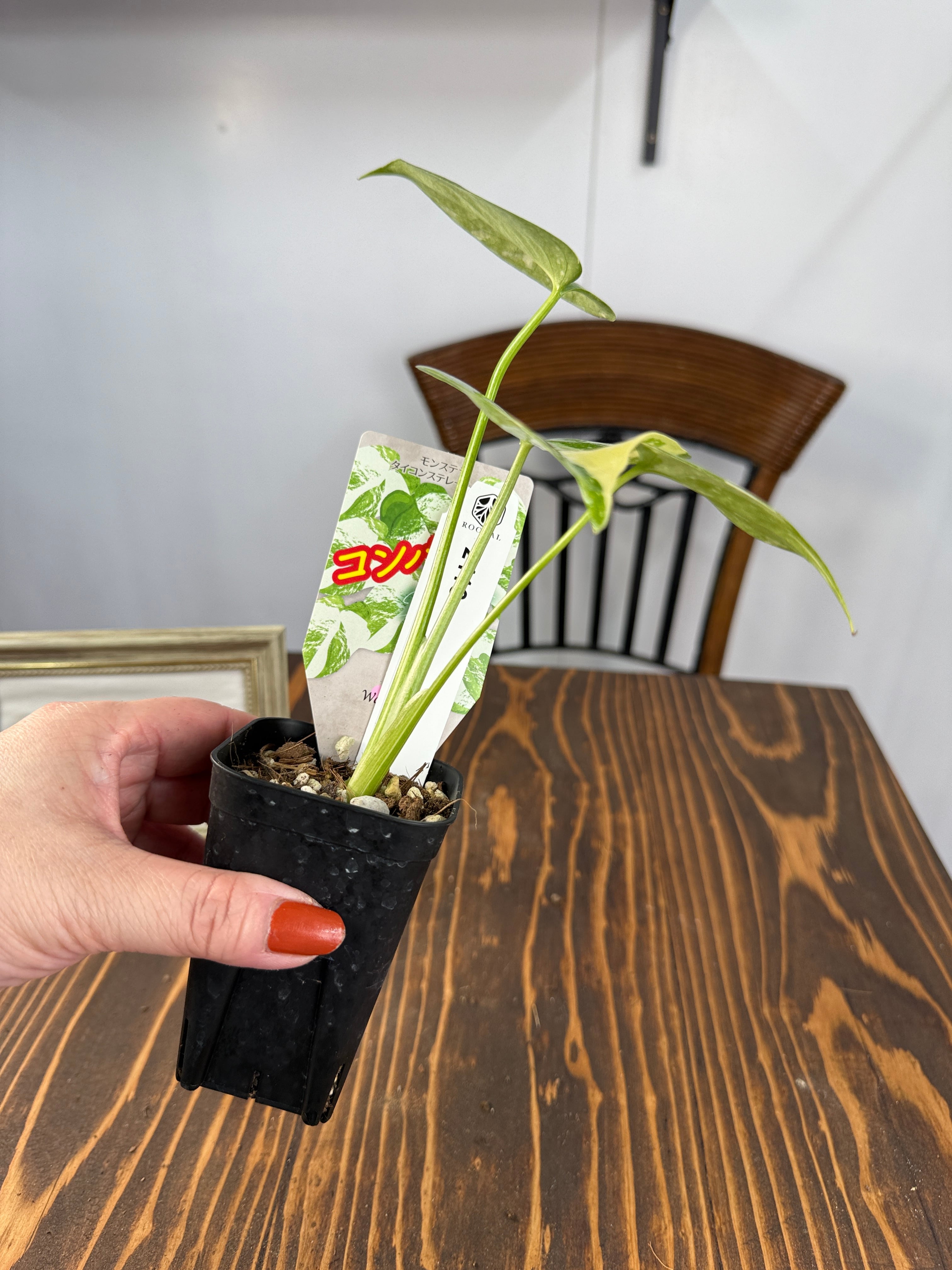 モンステラ タイコンステレーション コンパクタの葉は、ユニークなバリエガータが印象的で、成長段階によってその美しさが変わります。出荷時のサイズはおおよそ20㎝程度で、かわいらしいベビー苗をお届けいたします。